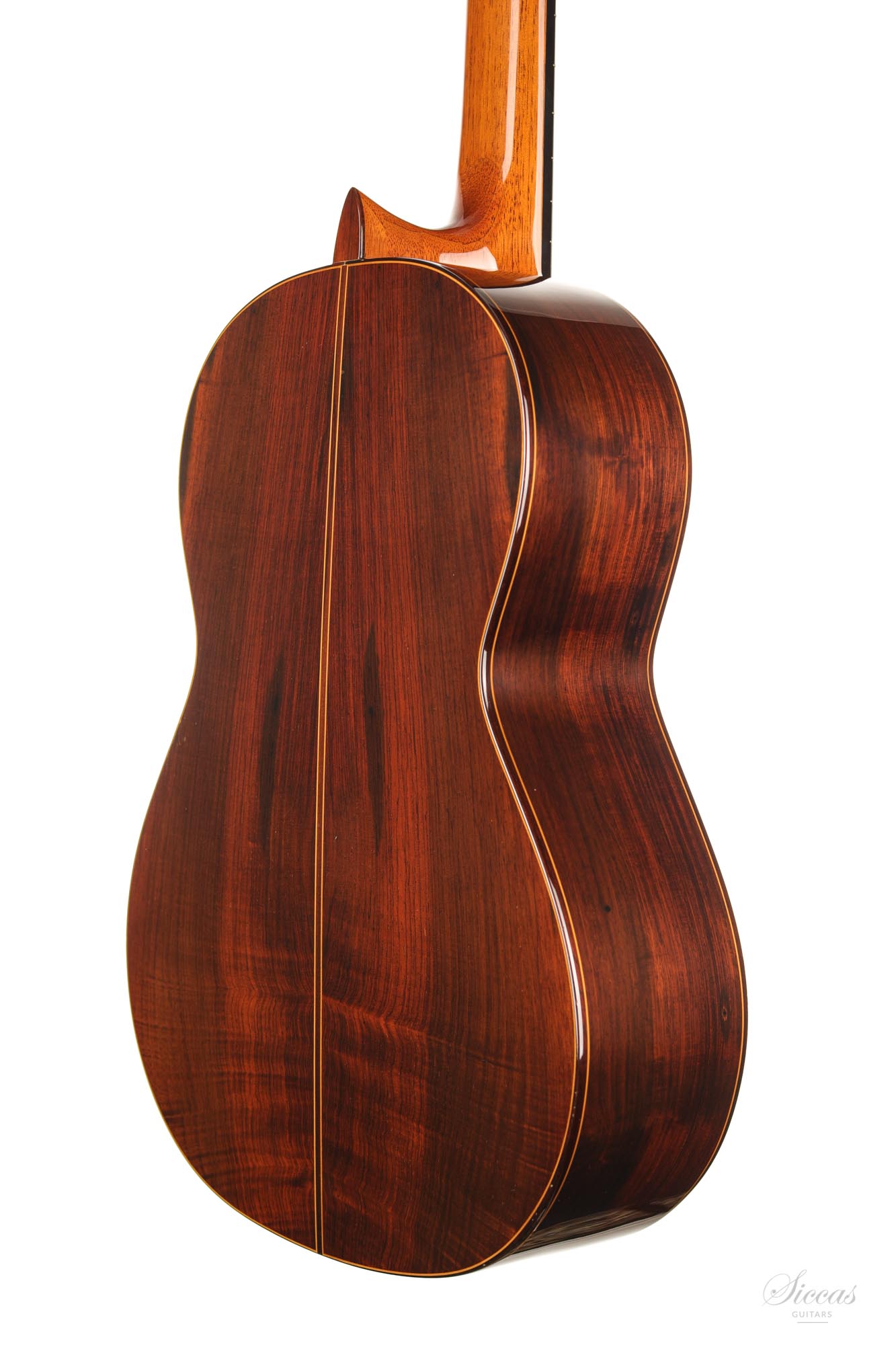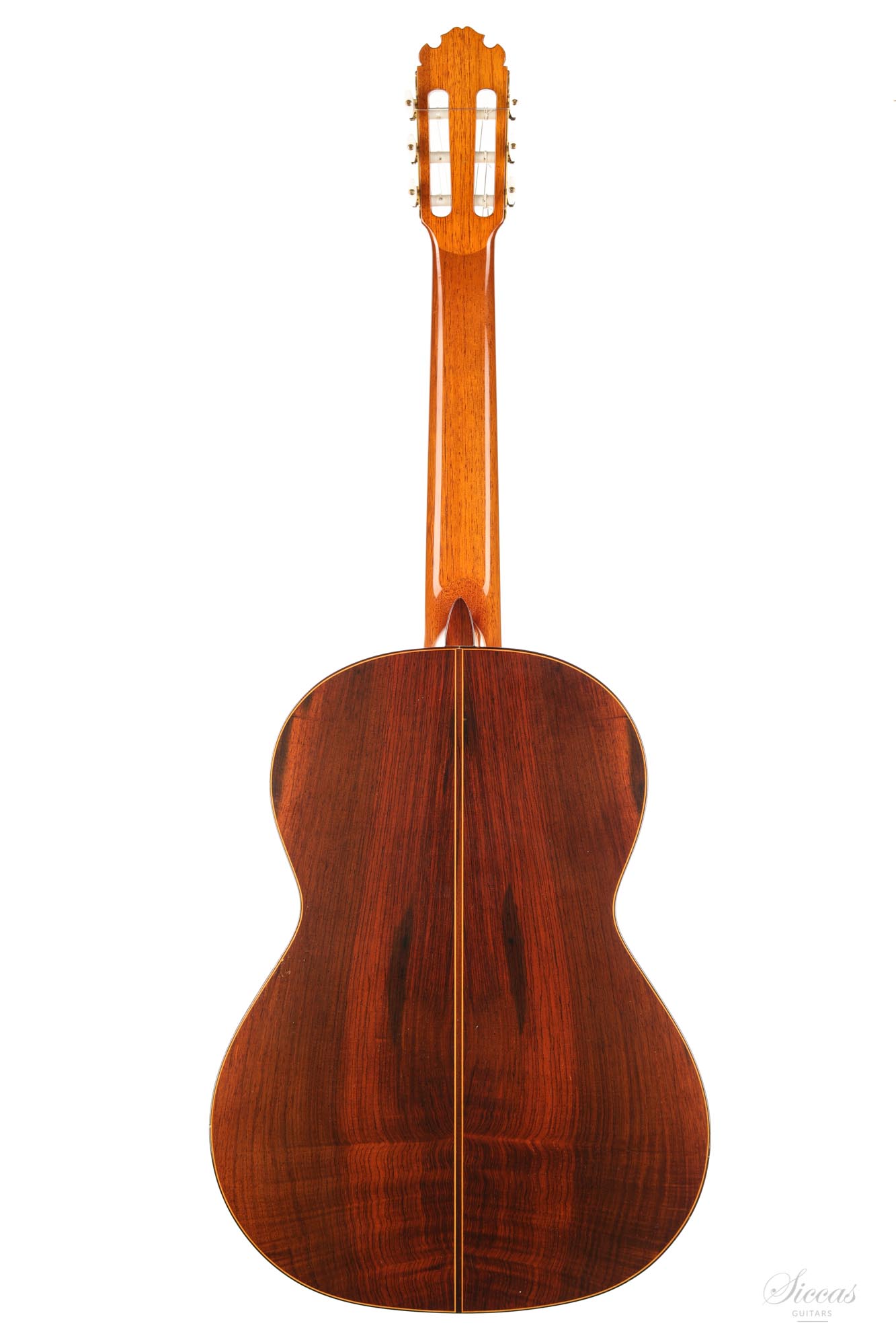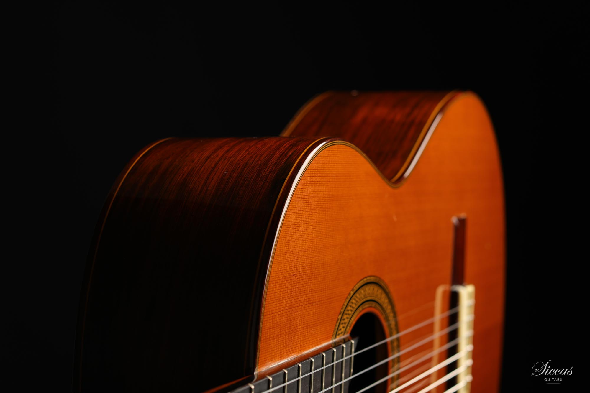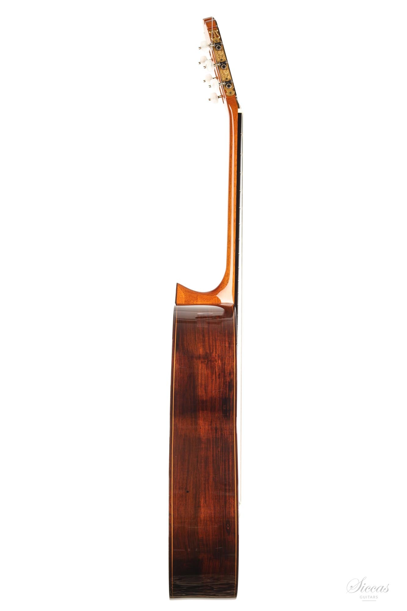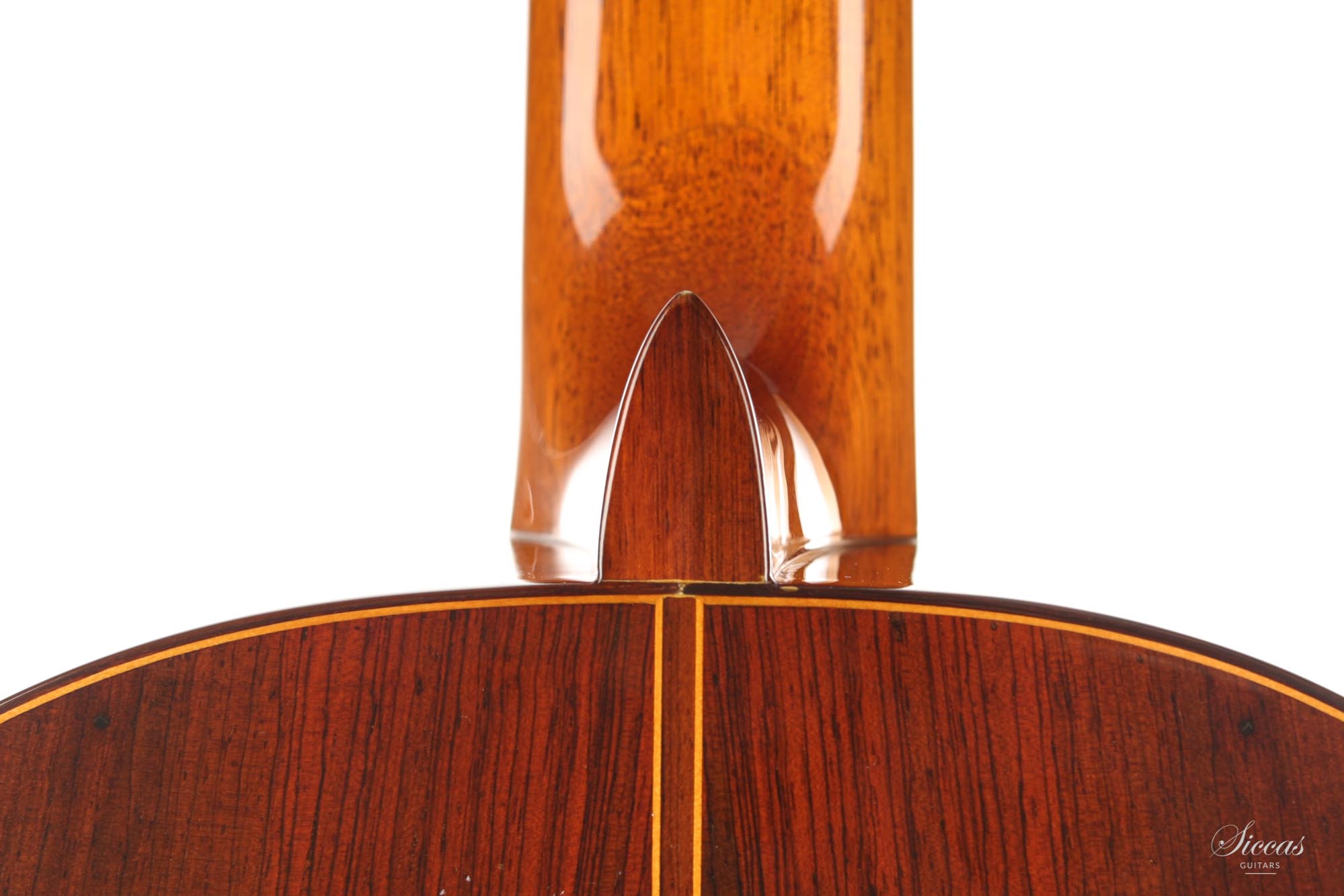 This guitar, built in 1980, is extremely interesting as it contains two of Contreras' great innovations. This "Doble Tapa" model, a highly sought-after and internationally successful model, is characterized by the famous curved bracing and the "Doble Tapa", which in this case means a second coat/layer of cedarwood on the inside of the back. The curved bracing is an exclusive innovation from the Contreras workshop and consists of a fan-shaped bracing with curved beams that following the curvature of the body. This allows the bracing to be stiffened without increasing the weight, thus reducing the number of bracing elements. The top is therefore lighter and swings more freely. The second innovation, the "Doble Tapa", is placed inside to get more sound projection. So the back is a combination of flexible red cedar and stiff Brazilian rosewood (CITES certified). Moreover, the set of Brazilian rosewood chosen for this instrument is simply magnificent, with tight grain and colorful reflections. This guitar is in excellent playing condition, has no cracks and only a few traces of playing.