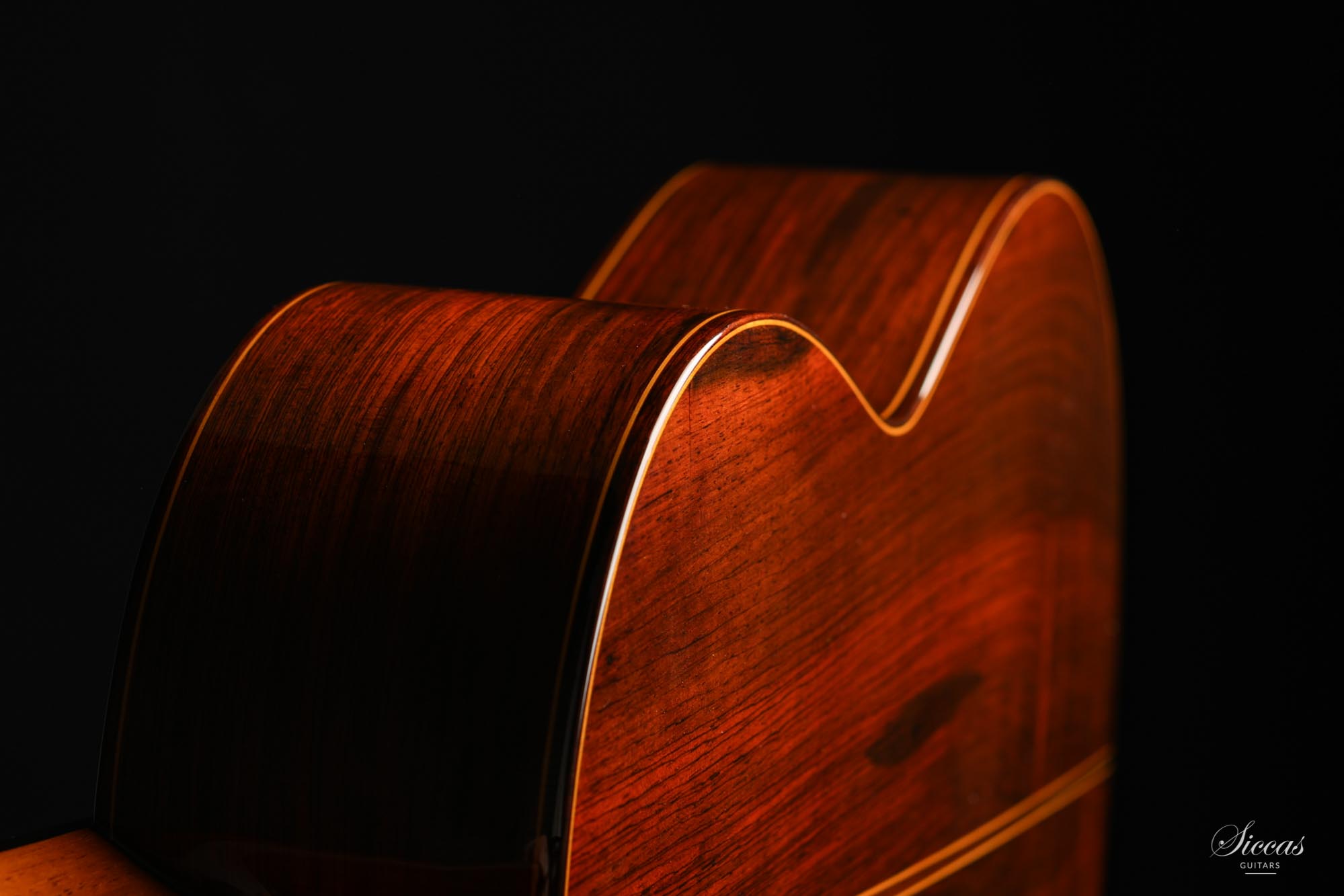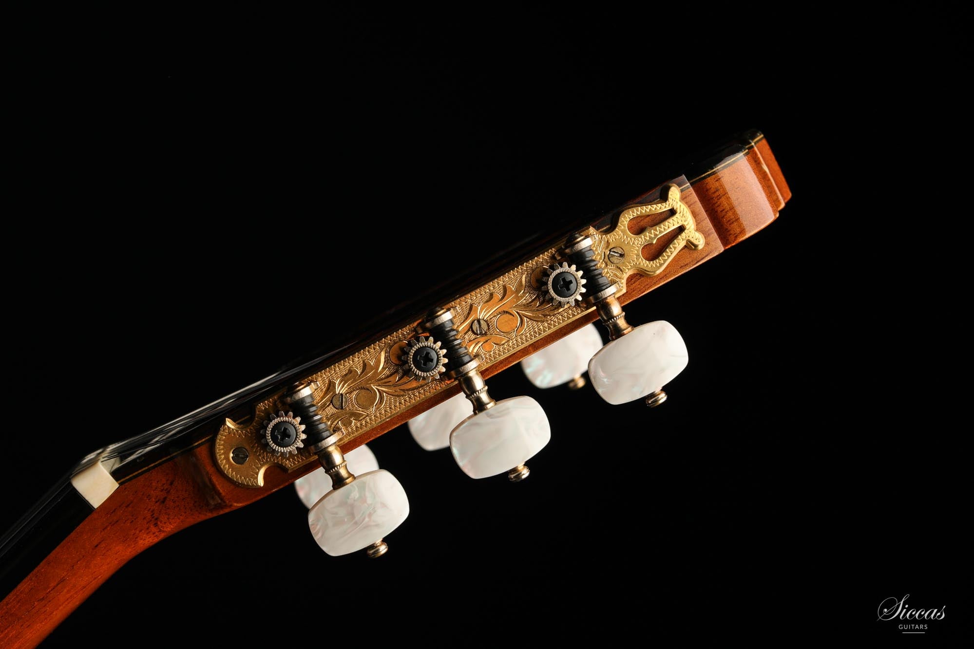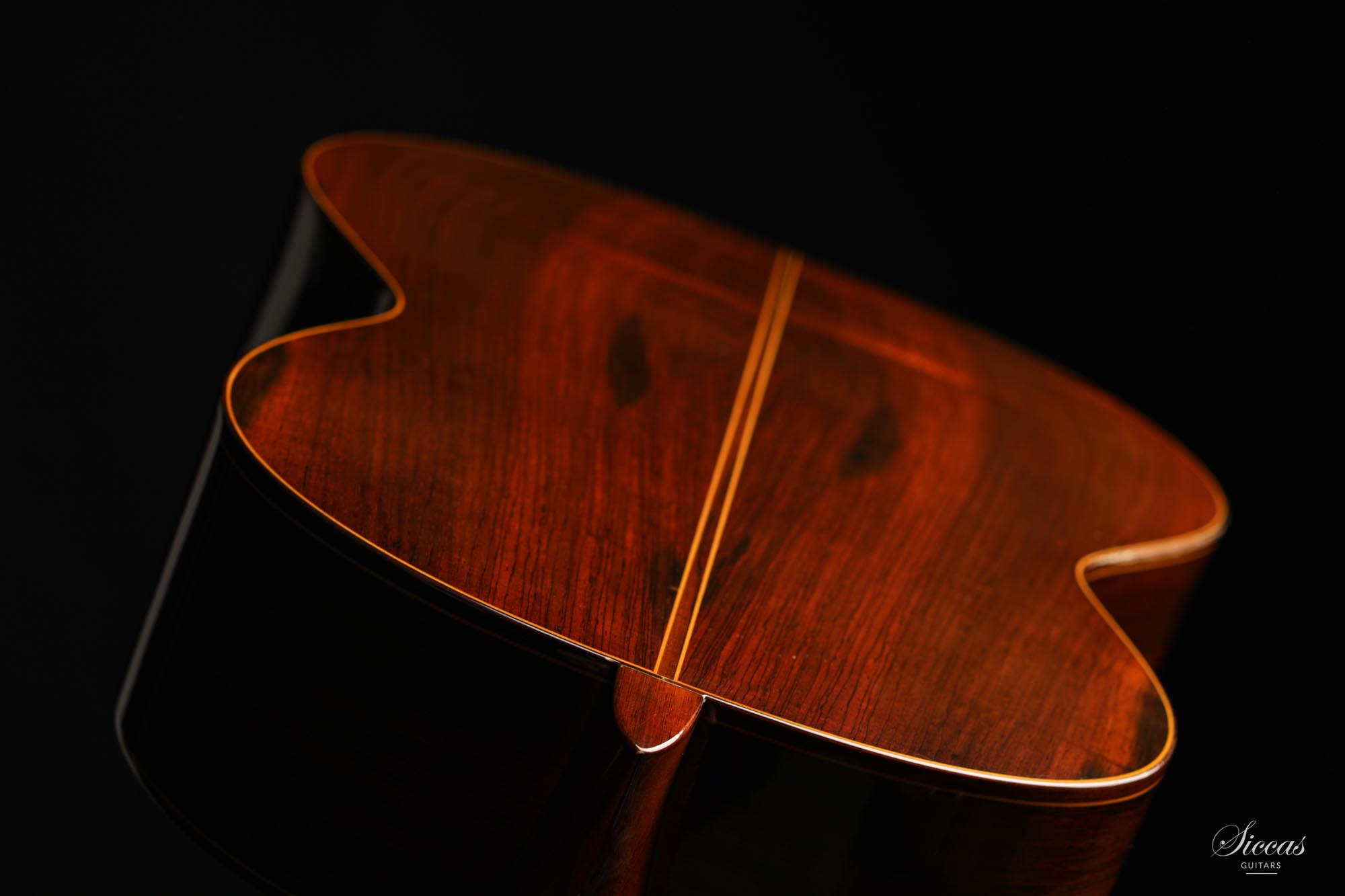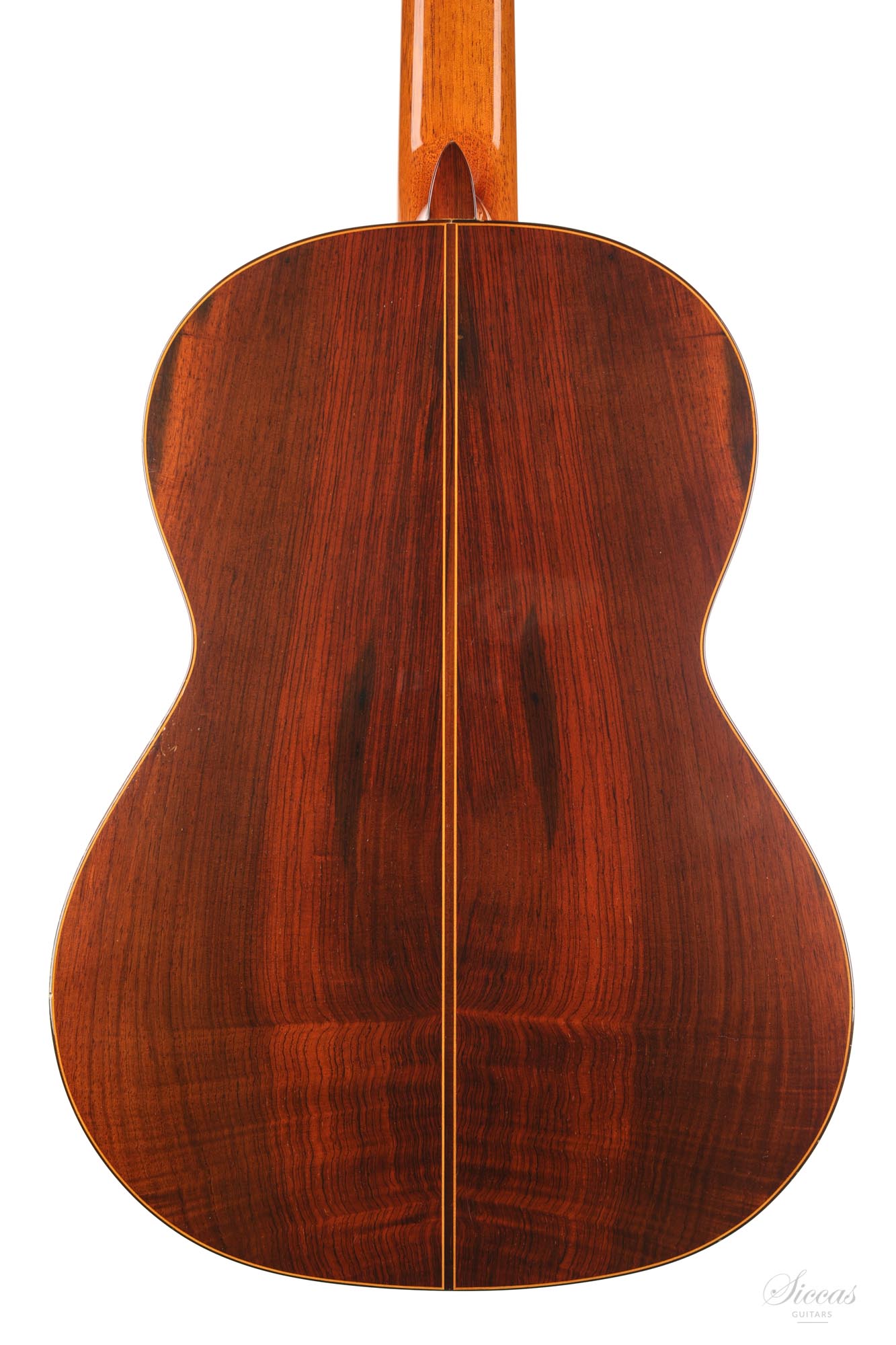 This guitar, built in 1980, is extremely interesting as it contains two of Contreras' great innovations. This "Doble Tapa" model, a highly sought-after and internationally successful model, is characterized by the famous curved bracing and the "Doble Tapa", which in this case means a second coat/layer of cedarwood on the inside of the back. The curved bracing is an exclusive innovation from the Contreras workshop and consists of a fan-shaped bracing with curved beams that following the curvature of the body. This allows the bracing to be stiffened without increasing the weight, thus reducing the number of bracing elements. The top is therefore lighter and swings more freely. The second innovation, the "Doble Tapa", is placed inside to get more sound projection. So the back is a combination of flexible red cedar and stiff Brazilian rosewood (CITES certified). Moreover, the set of Brazilian rosewood chosen for this instrument is simply magnificent, with tight grain and colorful reflections. This guitar is in excellent playing condition, has no cracks and only a few traces of playing.