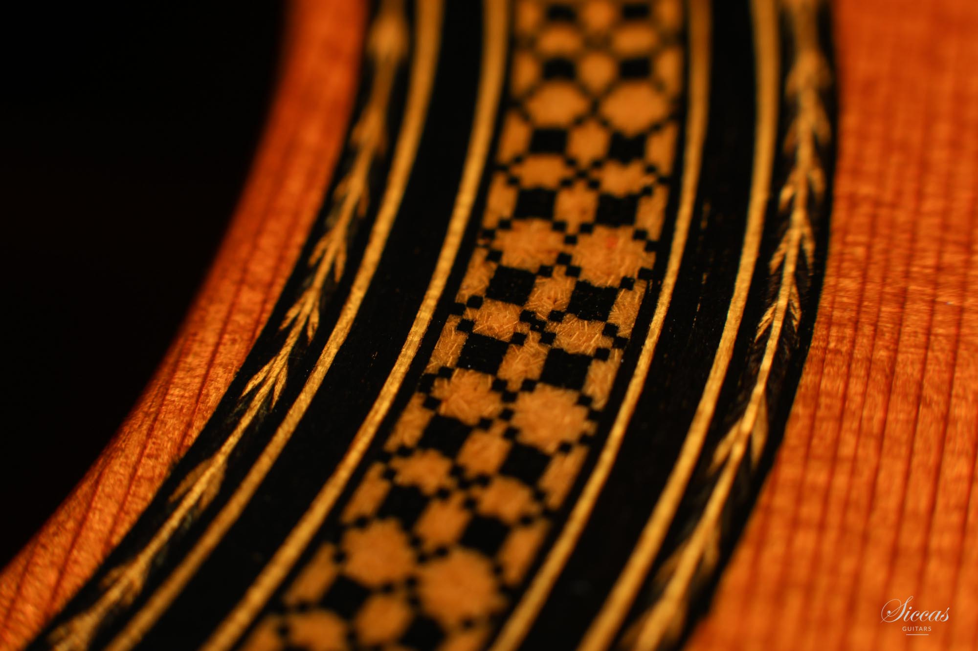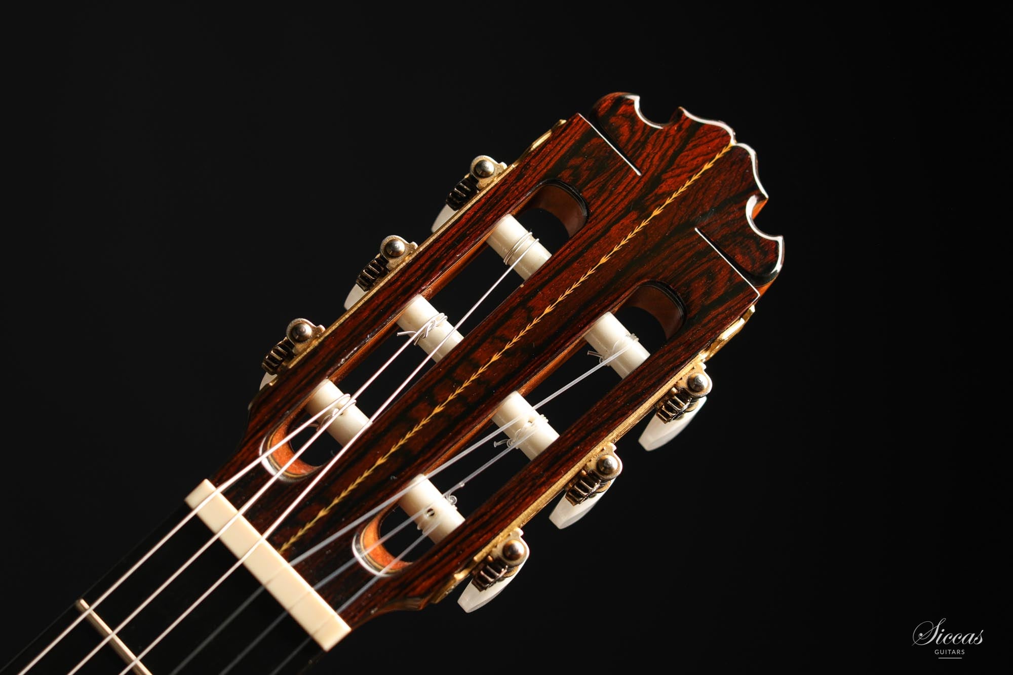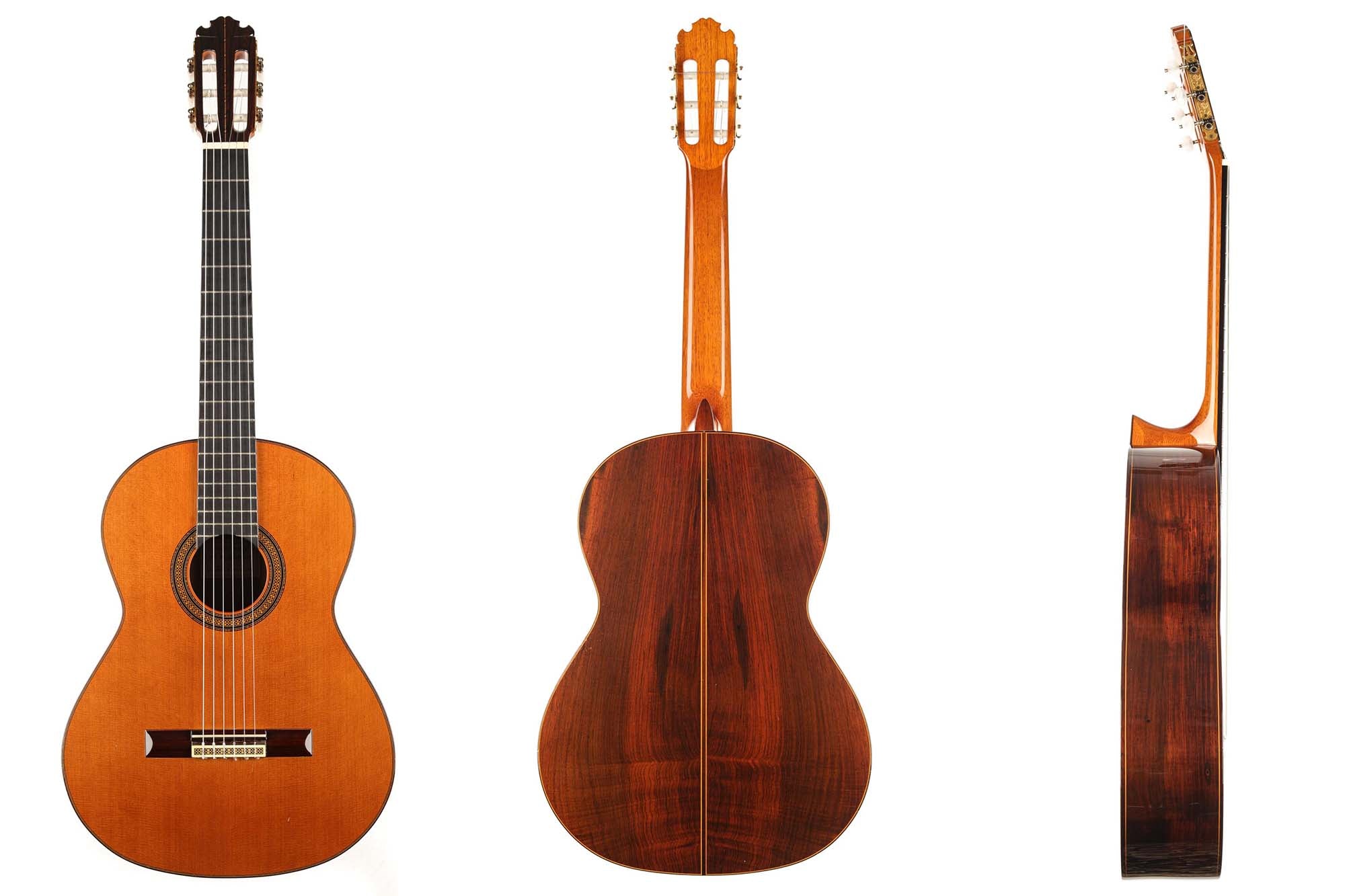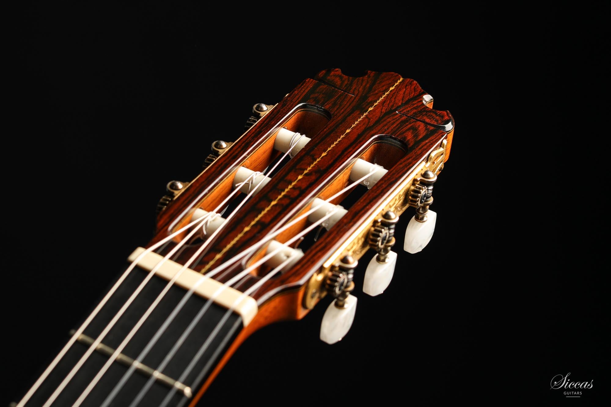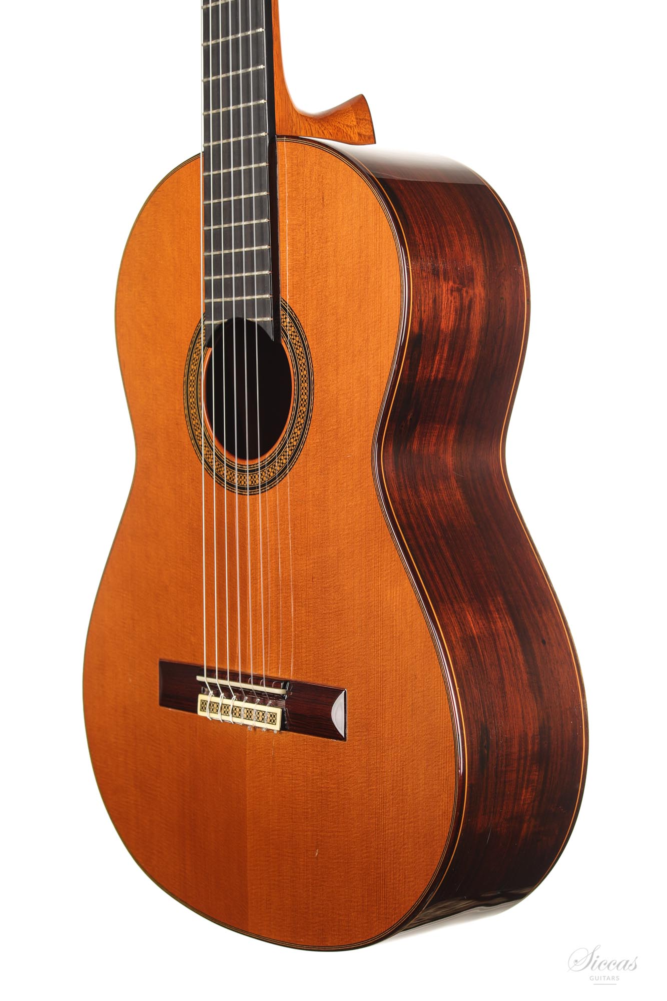 This guitar, built in 1980, is extremely interesting as it contains two of Contreras' great innovations. This "Doble Tapa" model, a highly sought-after and internationally successful model, is characterized by the famous curved bracing and the "Doble Tapa", which in this case means a second coat/layer of cedarwood on the inside of the back. The curved bracing is an exclusive innovation from the Contreras workshop and consists of a fan-shaped bracing with curved beams that following the curvature of the body. This allows the bracing to be stiffened without increasing the weight, thus reducing the number of bracing elements. The top is therefore lighter and swings more freely. The second innovation, the "Doble Tapa", is placed inside to get more sound projection. So the back is a combination of flexible red cedar and stiff Brazilian rosewood (CITES certified). Moreover, the set of Brazilian rosewood chosen for this instrument is simply magnificent, with tight grain and colorful reflections. This guitar is in excellent playing condition, has no cracks and only a few traces of playing.