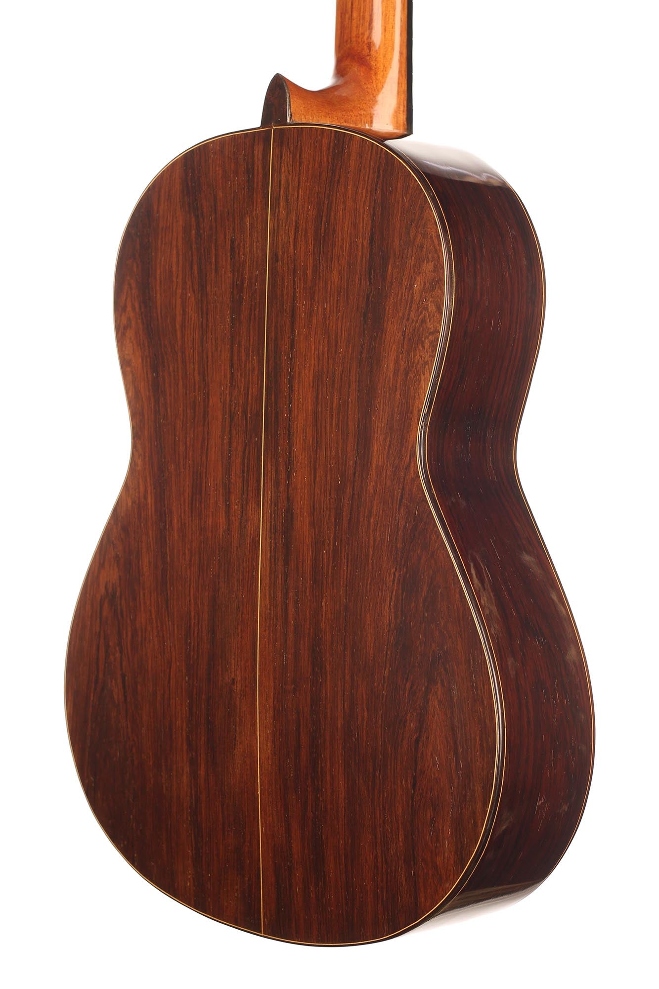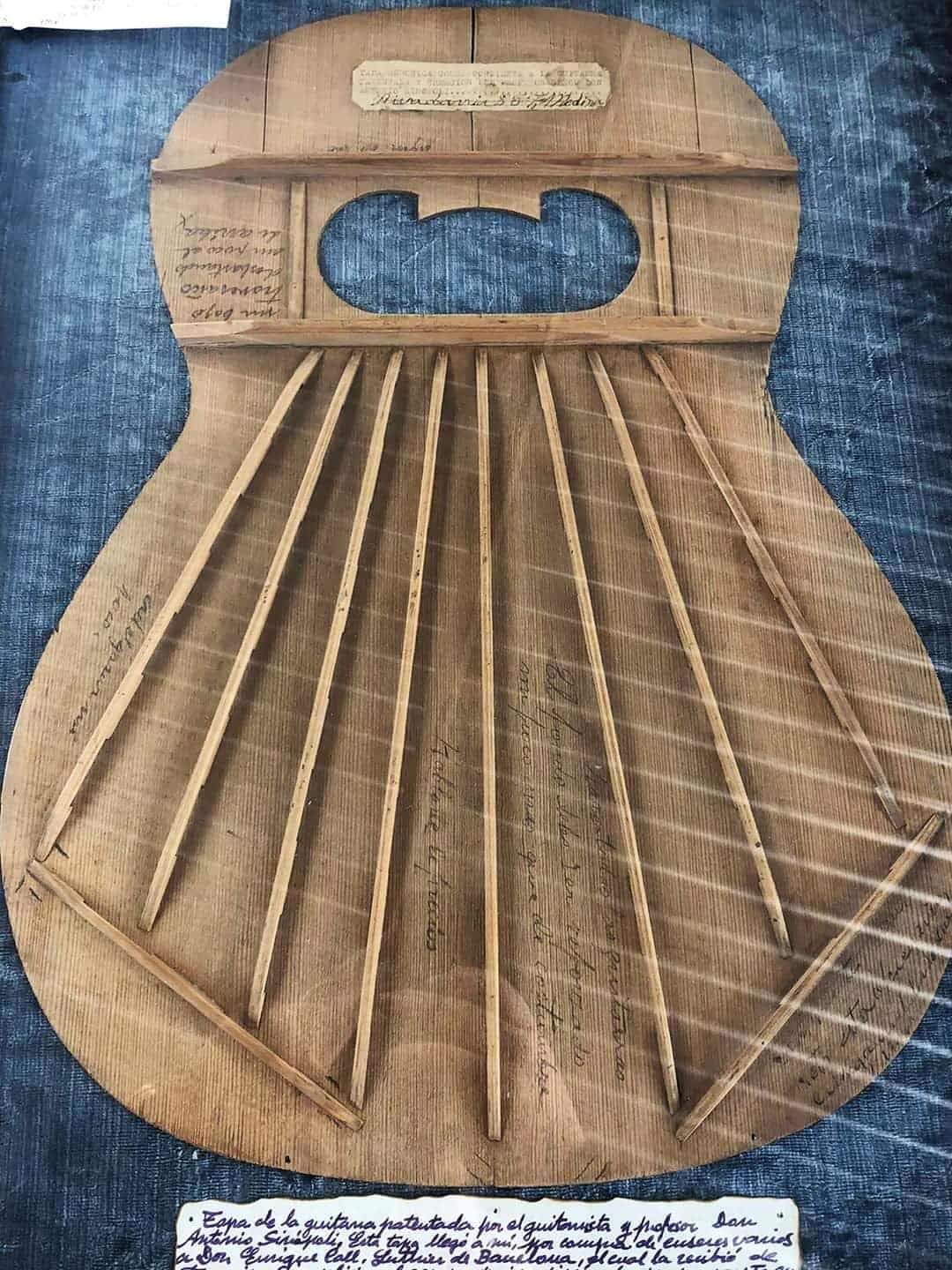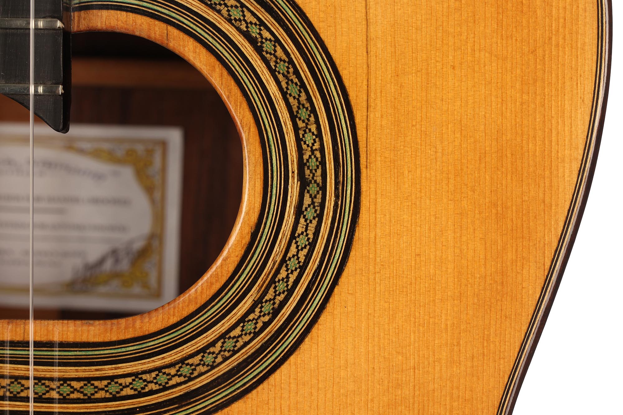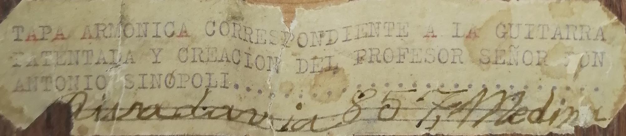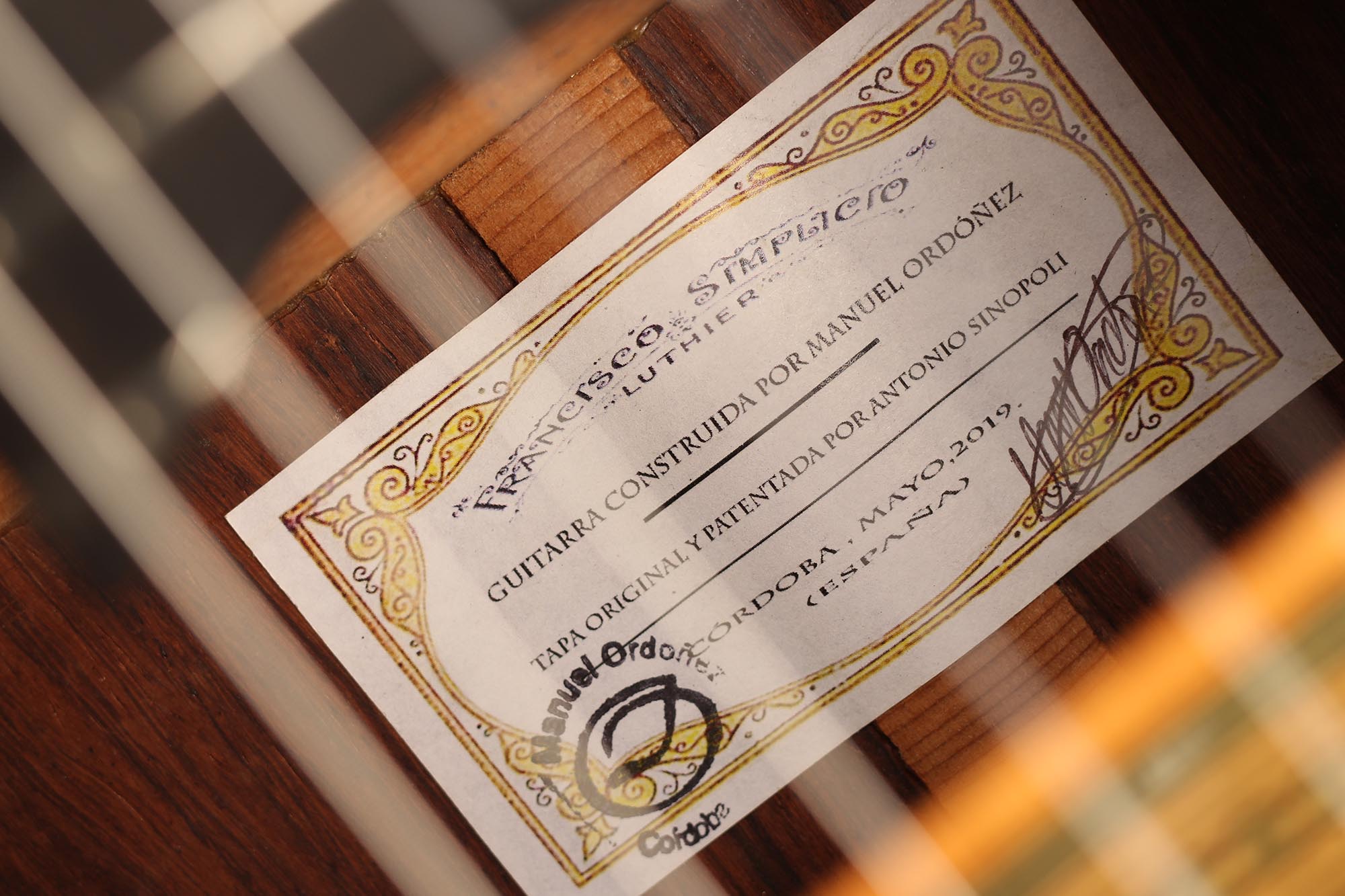 Diese schöne Gitarre hat die Besonderheit, dass sie eine von Francisco Simplicio (1874-1932) gebaute originale Decke hat. Sie ist daher ein Instrument von historischer Bedeutung. Tatsächlich wurde die Decke von Francisco Simplicio nach einem von dem Gitarristen und Professor Antonio Sinopoli (1878-1964) angemeldeten Patent gebaut. Sie hat eine asymmetrische, achtfächrige Verstrebung, wobei die Leisten brückenartig geformt und ausgehöhlt wurden, was die Struktur erheblich leichter macht. Darüber hinaus ist die Geschichte dieser Decke sehr interessant: Sie ging von Francisco Simplicio zu seinem Schüler Enrique Coll (1894-1978) und gelangte dann in die Sammlung von Marcelino Lopez Nieto (1931-2018). Im Jahr 2019 wurde diese einzigartige Decke von dem Gitarrenbauer Manuel Ordonez aus Córdoba zu einer Gitarre verarbeitet. Es handelt sich also um eine Gitarre von großem historischen Wert und ein absolut bezauberndes Konzertinstrument.