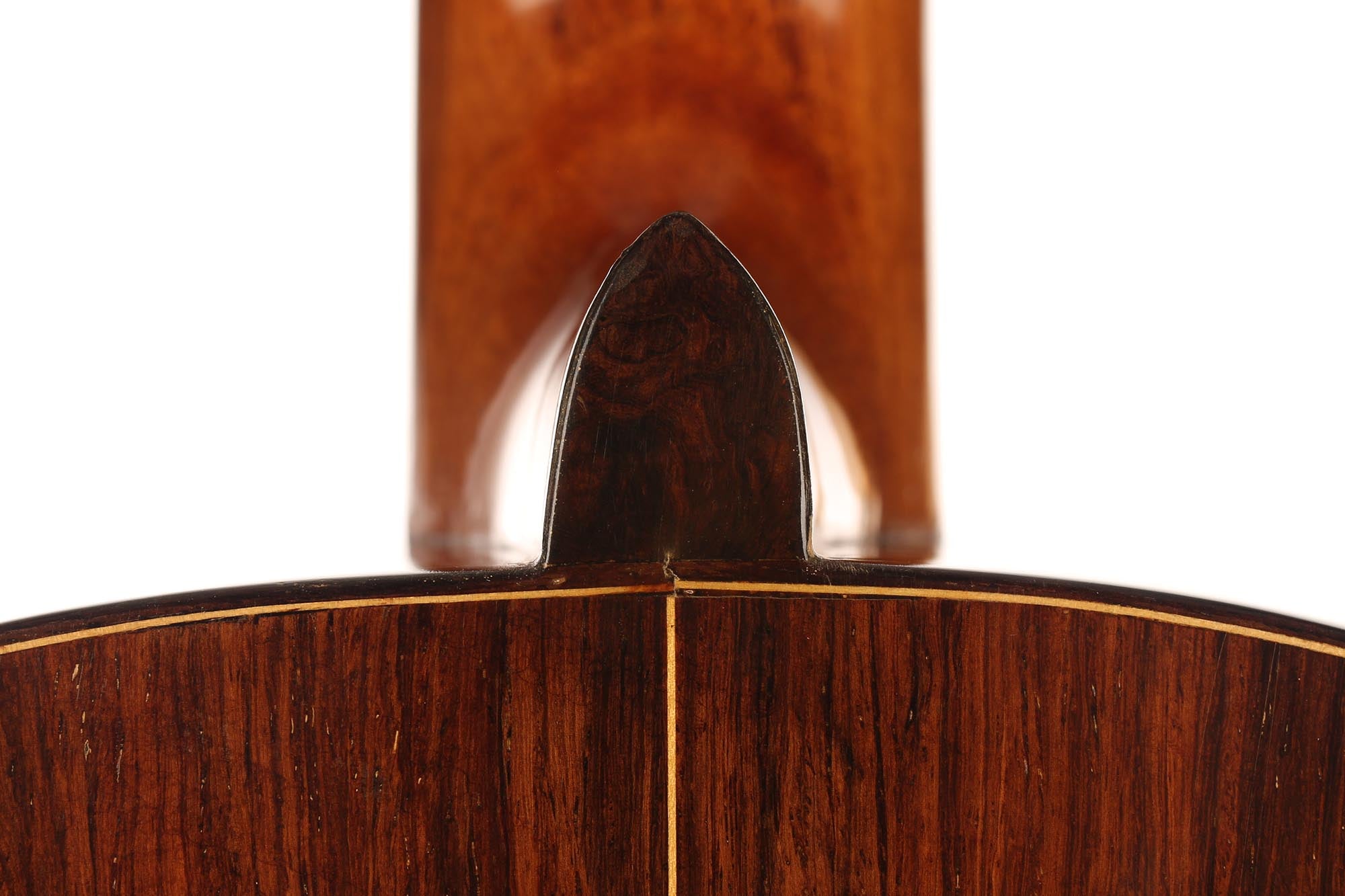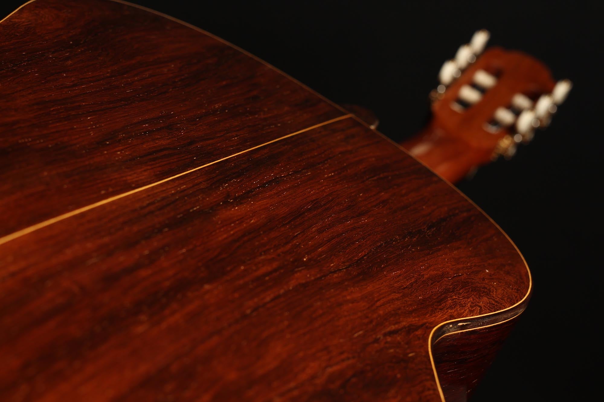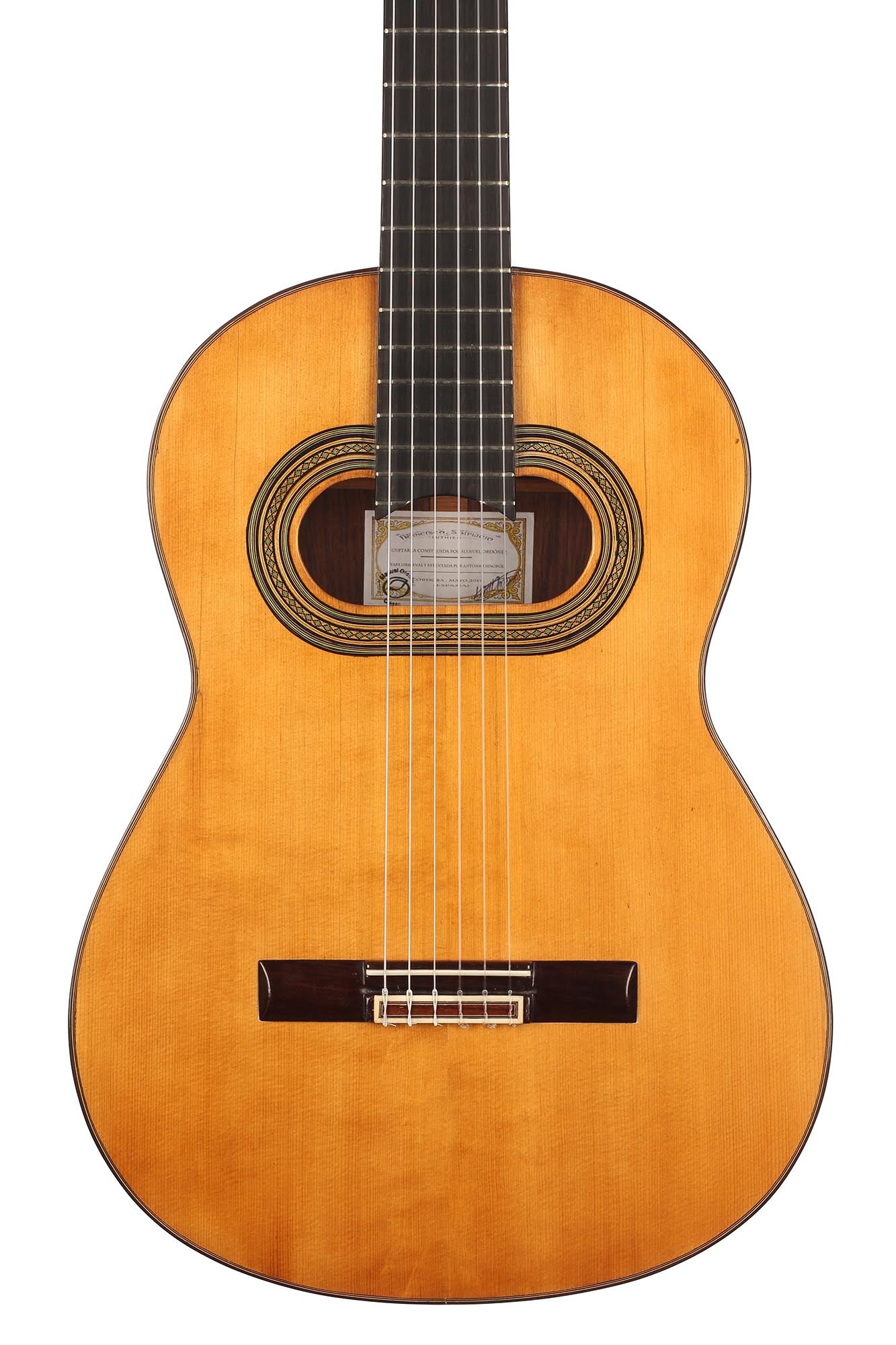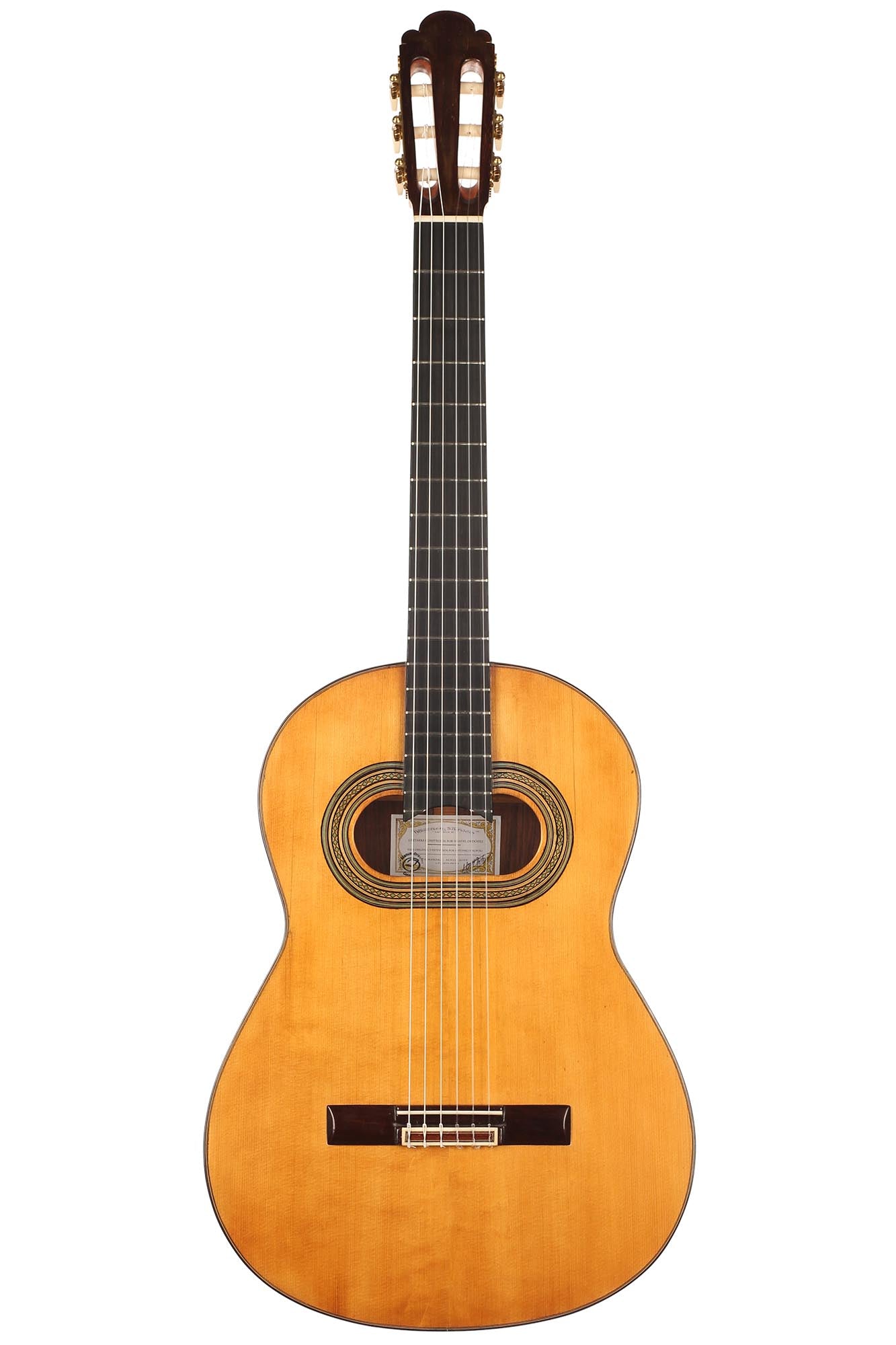 Diese schöne Gitarre hat die Besonderheit, dass sie eine von Francisco Simplicio (1874-1932) gebaute originale Decke hat. Sie ist daher ein Instrument von historischer Bedeutung. Tatsächlich wurde die Decke von Francisco Simplicio nach einem von dem Gitarristen und Professor Antonio Sinopoli (1878-1964) angemeldeten Patent gebaut. Sie hat eine asymmetrische, achtfächrige Verstrebung, wobei die Leisten brückenartig geformt und ausgehöhlt wurden, was die Struktur erheblich leichter macht. Darüber hinaus ist die Geschichte dieser Decke sehr interessant: Sie ging von Francisco Simplicio zu seinem Schüler Enrique Coll (1894-1978) und gelangte dann in die Sammlung von Marcelino Lopez Nieto (1931-2018). Im Jahr 2019 wurde diese einzigartige Decke von dem Gitarrenbauer Manuel Ordonez aus Córdoba zu einer Gitarre verarbeitet. Es handelt sich also um eine Gitarre von großem historischen Wert und ein absolut bezauberndes Konzertinstrument.