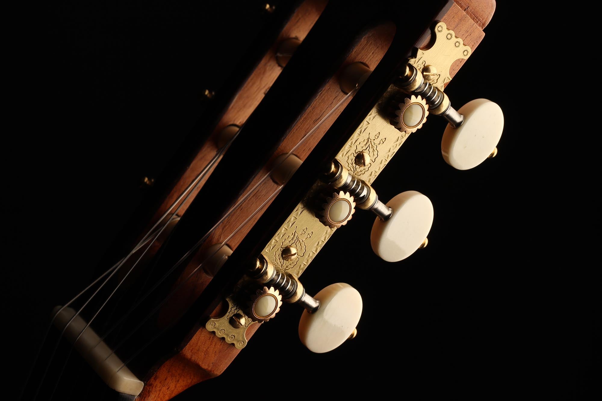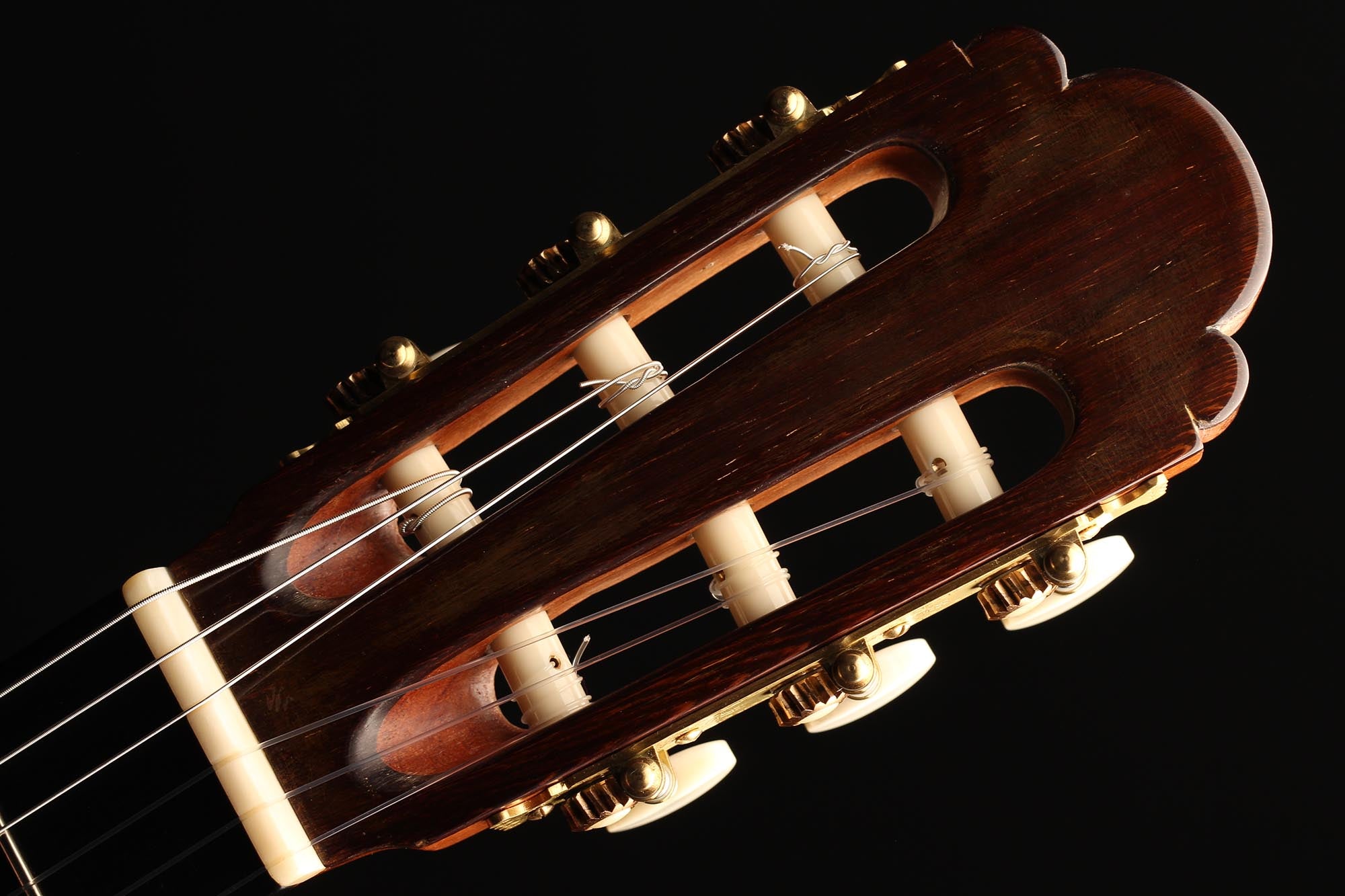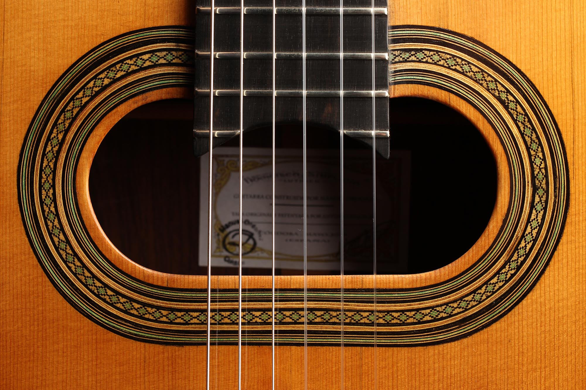 Diese Gitarre, deren Rosette eine besondere Form aufweist und sehr hoch auf der Decke platziert ist, hat nicht nur besonders konzipiert, sondern besitzt auch einzigartige klangliche Qualität. Der Klang liegt in der Tat zwischen dem der Barcelona-Gitarren des frühen 20. Jahrhunderts und der moderneren klassischen Gitarre, wie wir sie heute kennen. Die Spielbarkeit ist fantastisch, besonders für die rechte Hand und die Diskantstimmen singen mit einem sehr runden Klang, der sich perfekt mit den tiefen und umhüllenden Bässen verbindet. Dadurch ist eine unverwechselbare Eleganz der Gitarren von Francisco Simplicio und ihr Charme sind in diesem besonderen Instrument wiederzufinden.