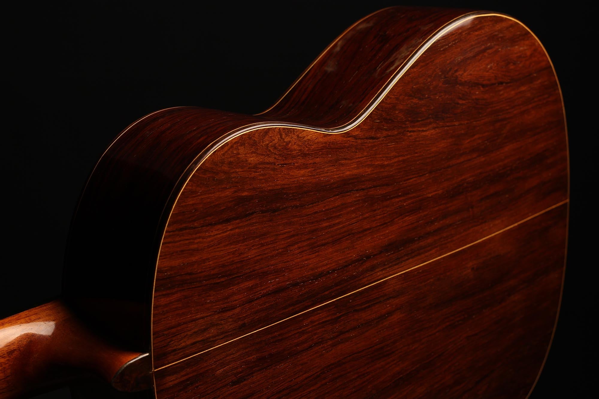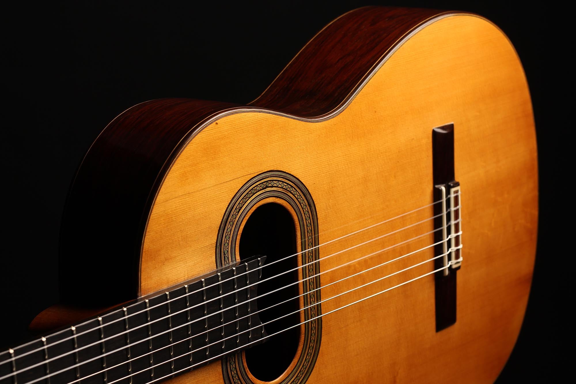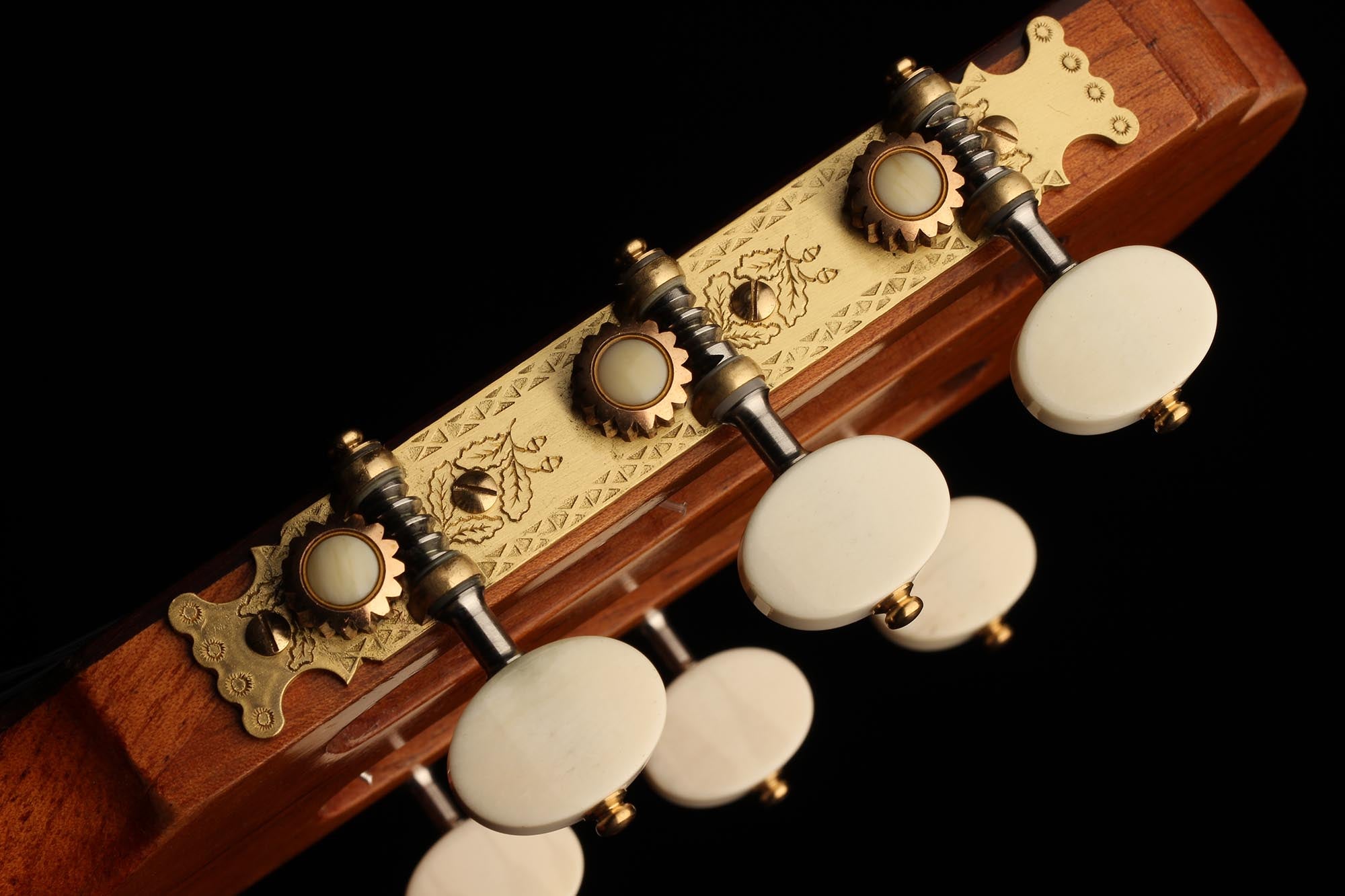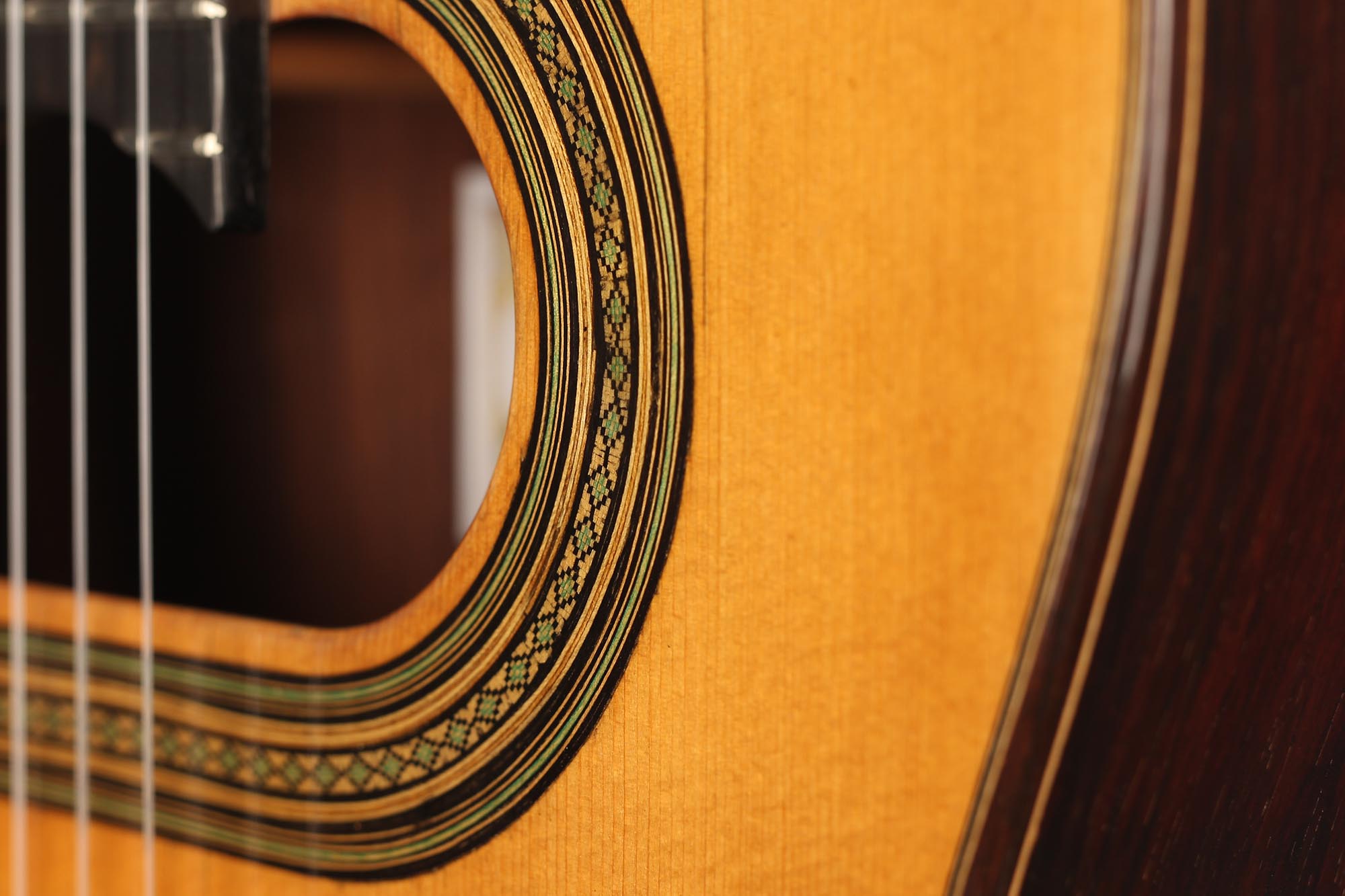 Diese Gitarre, deren Rosette eine besondere Form aufweist und sehr hoch auf der Decke platziert ist, hat nicht nur besonders konzipiert, sondern besitzt auch einzigartige klangliche Qualität. Der Klang liegt in der Tat zwischen dem der Barcelona-Gitarren des frühen 20. Jahrhunderts und der moderneren klassischen Gitarre, wie wir sie heute kennen. Die Spielbarkeit ist fantastisch, besonders für die rechte Hand und die Diskantstimmen singen mit einem sehr runden Klang, der sich perfekt mit den tiefen und umhüllenden Bässen verbindet. Dadurch ist eine unverwechselbare Eleganz der Gitarren von Francisco Simplicio und ihr Charme sind in diesem besonderen Instrument wiederzufinden.