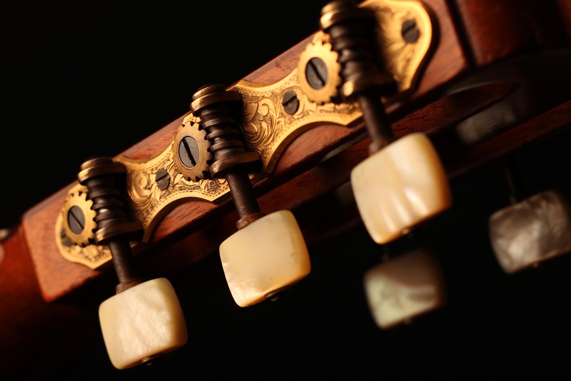 Sie ist ein absolutes Juwel, da weder Risse noch Reparaturen vorhanden sind, nur einige oberflächliche Spielspuren sind nun Teil der Patina der Gitarre. Die Zeit hatte auch einen charmanten Einfluss auf den Lack, der auf der Decke leichte Krakelee aufweist. Die original vergoldeten, handgravierten Landstorfer Mechanike funktionieren noch immer einwandfrei.