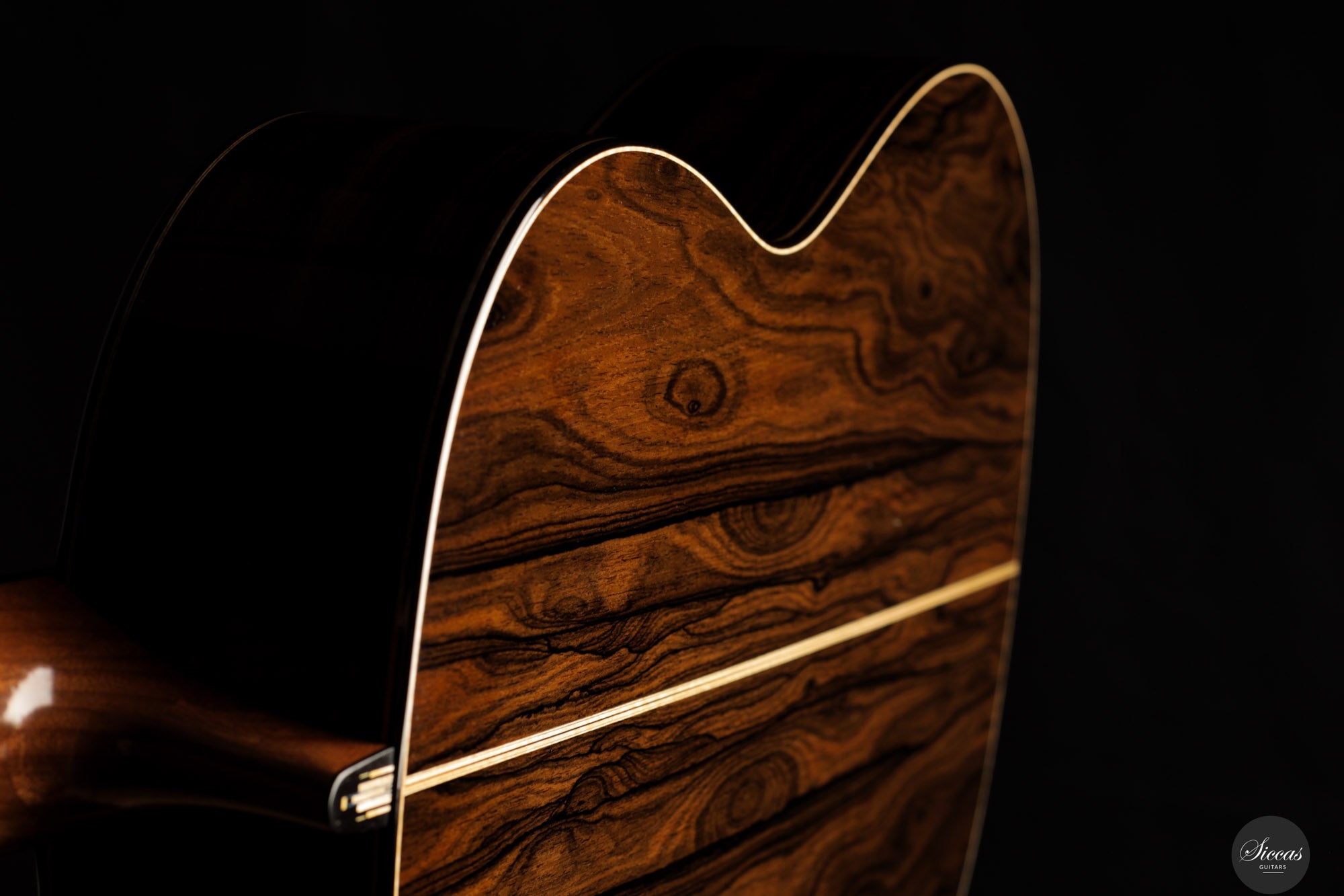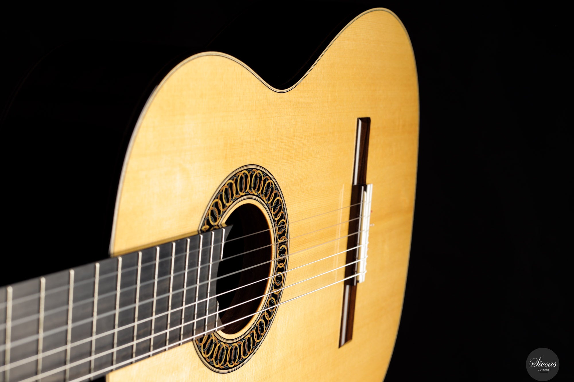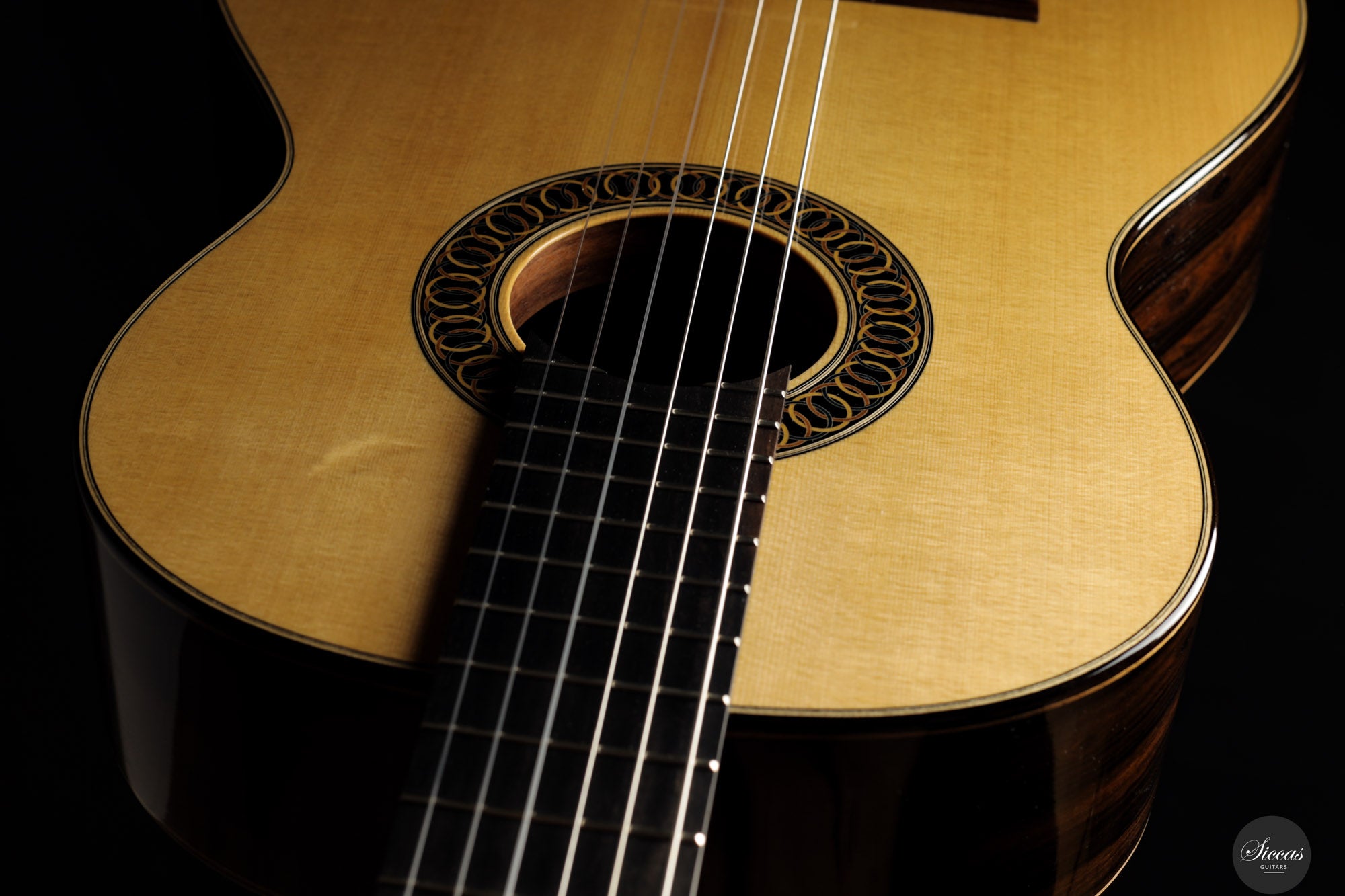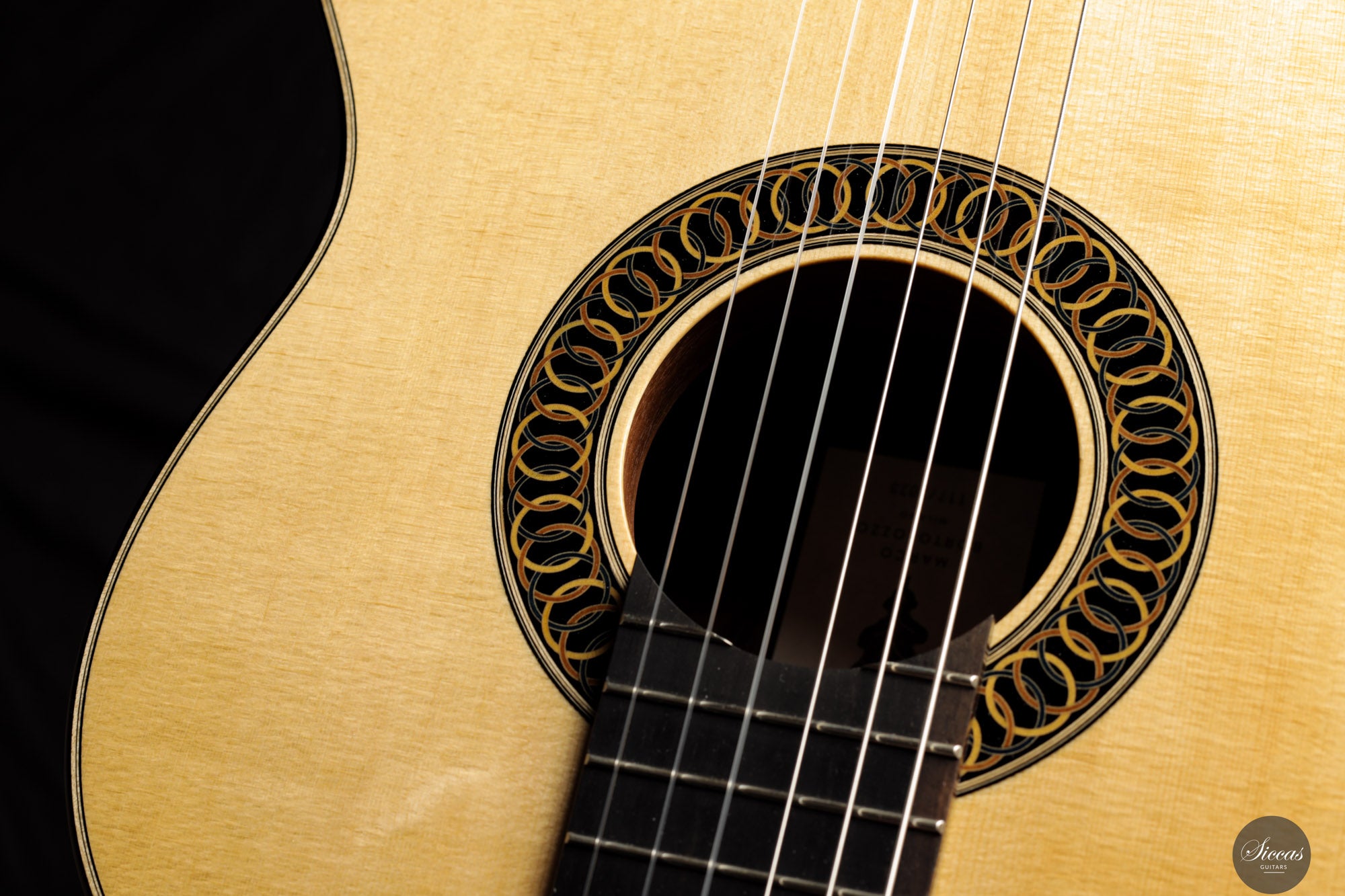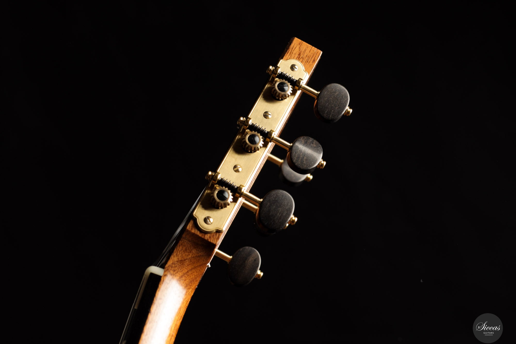 Marco hat die Decke gezielt abgestimmt, um das Sustain zu optimieren und die Obertöne fein zu kontrollieren – so lässt sich das Instrument in verschiedensten Klangfarben und Dynamiken wunderbar formen. Die extrem dünnen Doppelzargen geben der Gitarre zusätzlich Kraft, mehr Tiefe im Bassbereich sowie Glanz und Transparenz in den Höhen.