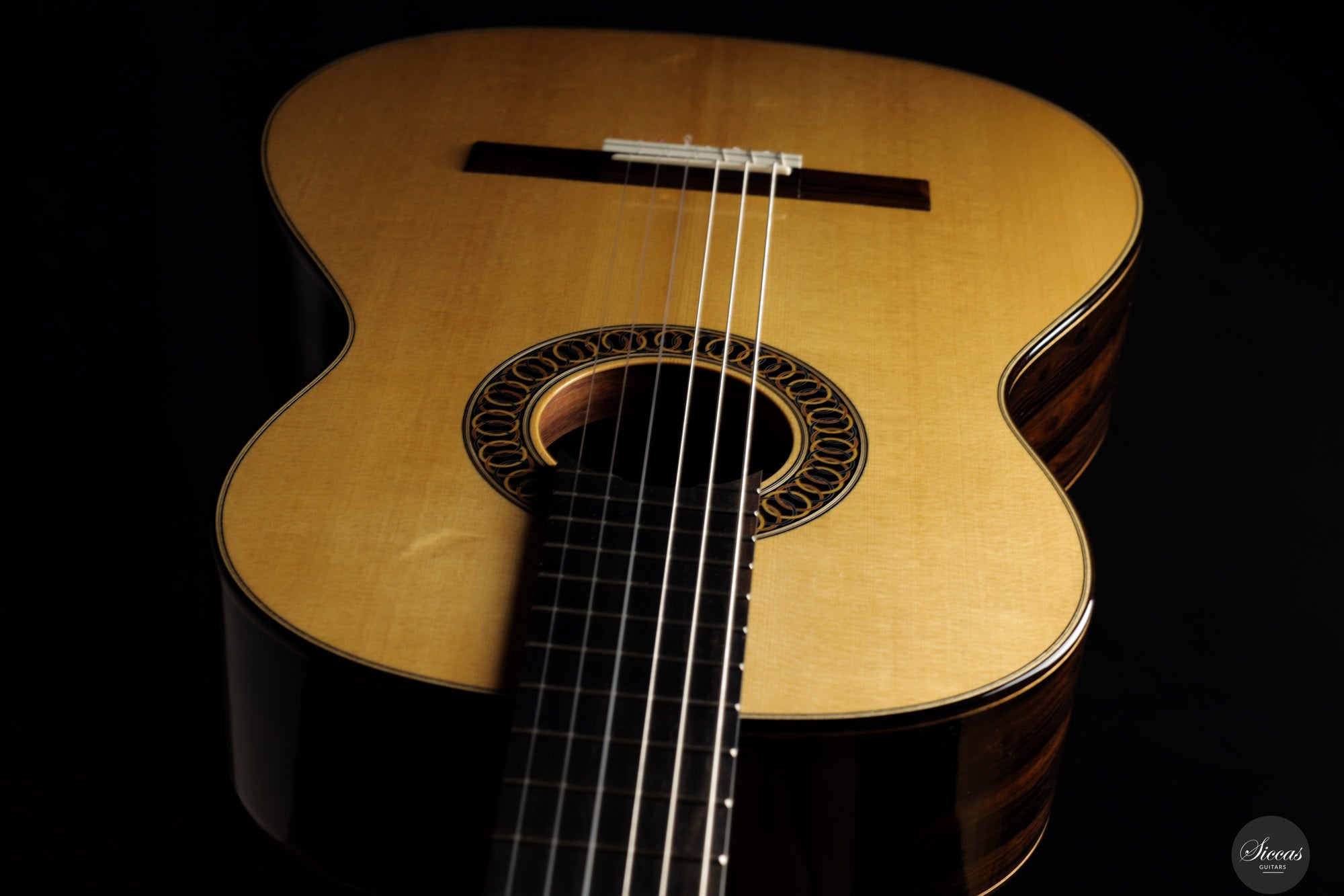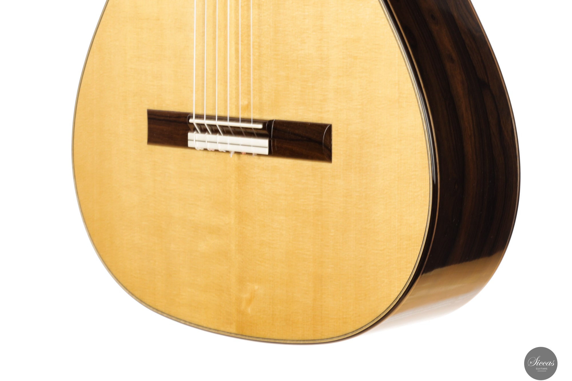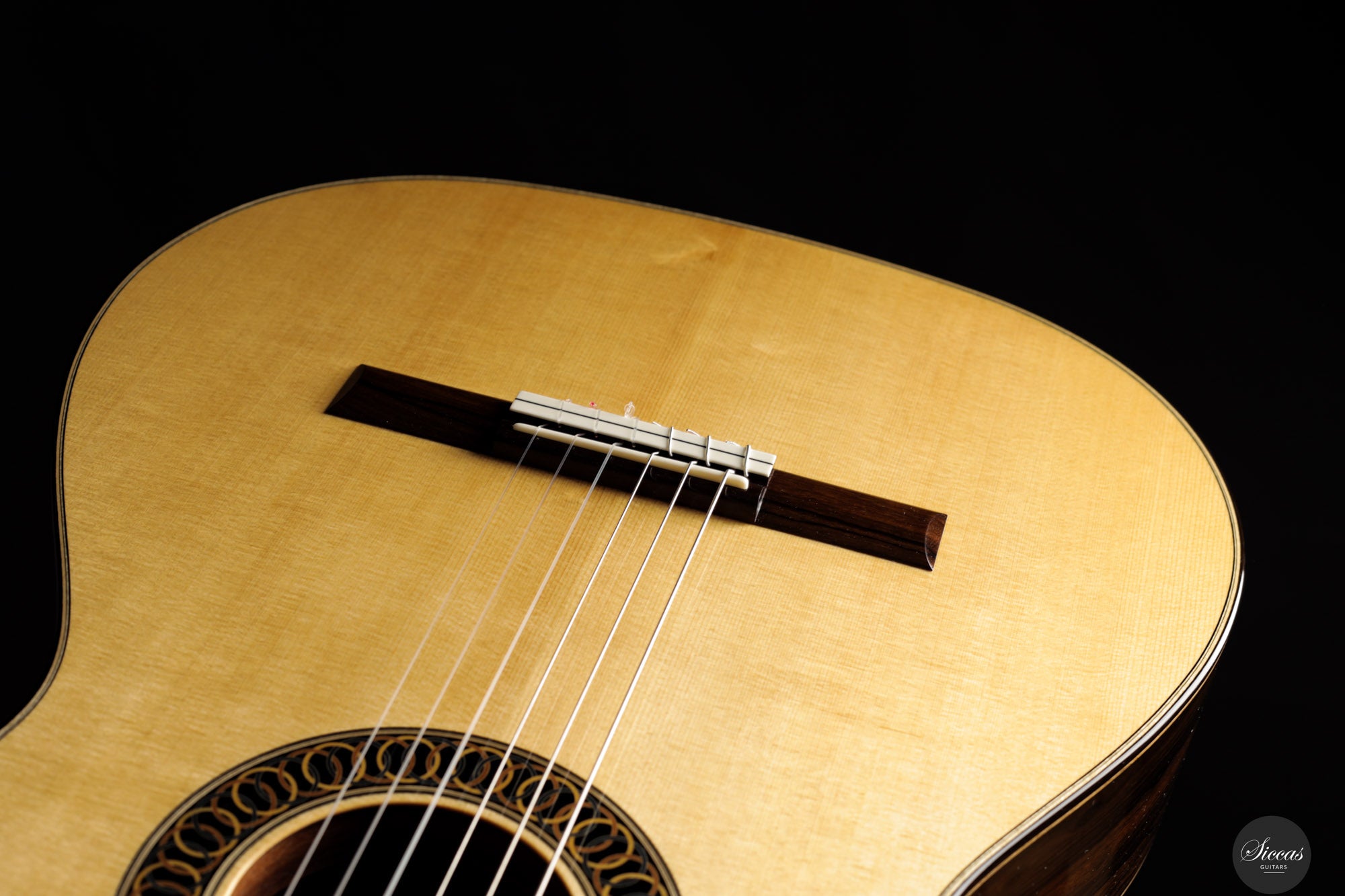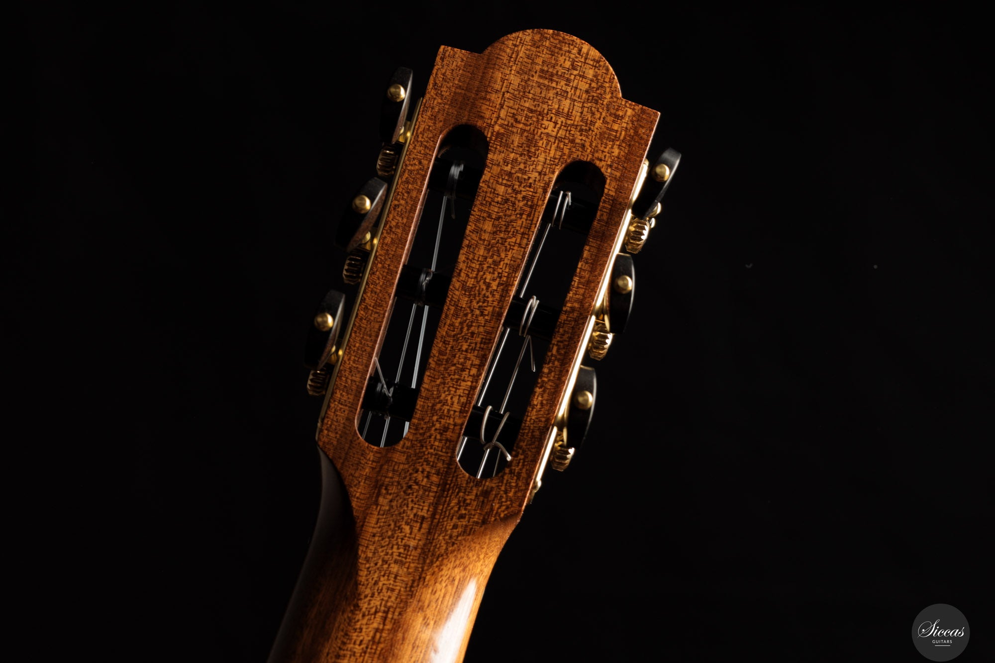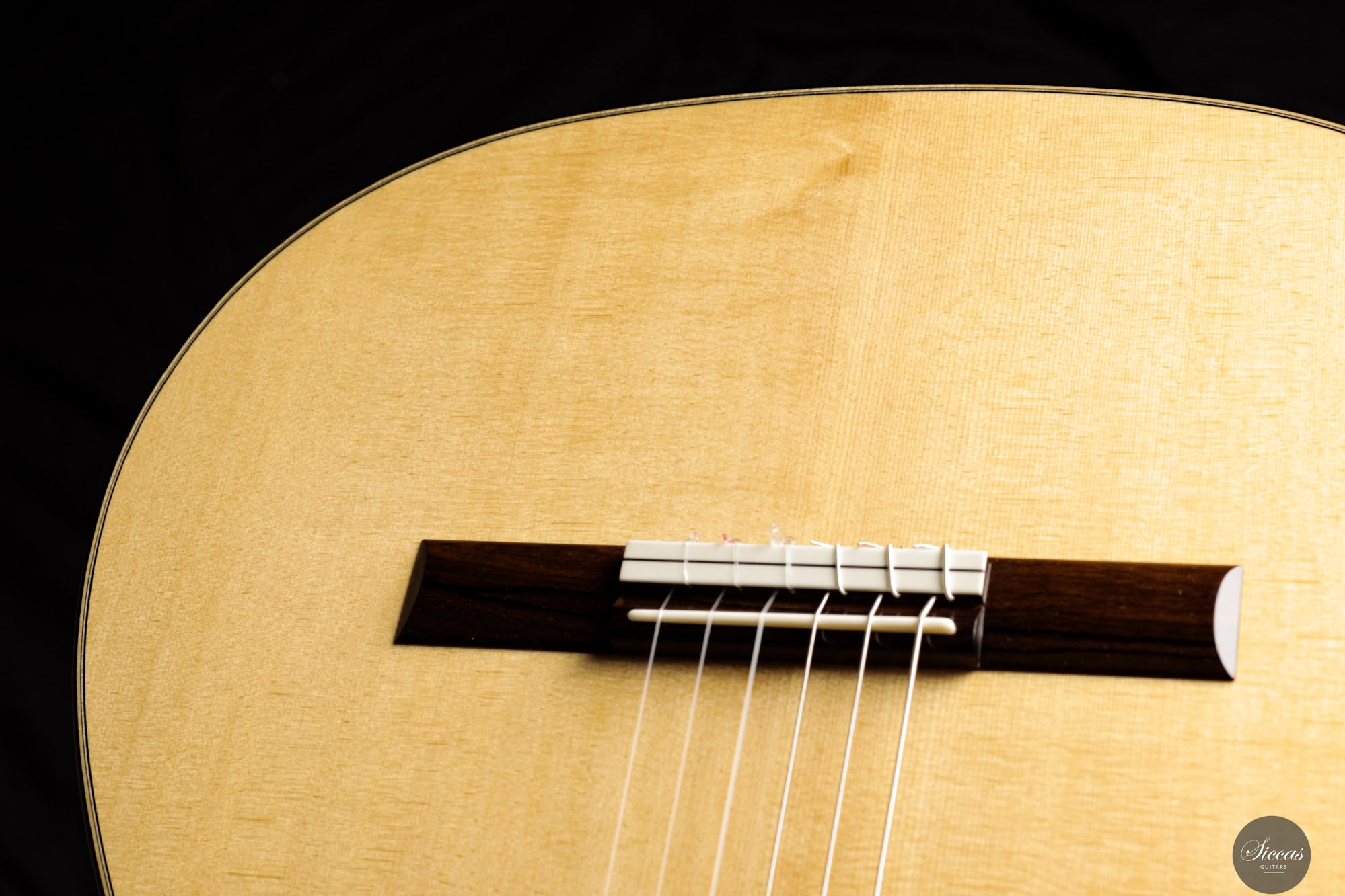 Marco hat die Decke gezielt abgestimmt, um das Sustain zu optimieren und die Obertöne fein zu kontrollieren – so lässt sich das Instrument in verschiedensten Klangfarben und Dynamiken wunderbar formen. Die extrem dünnen Doppelzargen geben der Gitarre zusätzlich Kraft, mehr Tiefe im Bassbereich sowie Glanz und Transparenz in den Höhen.
