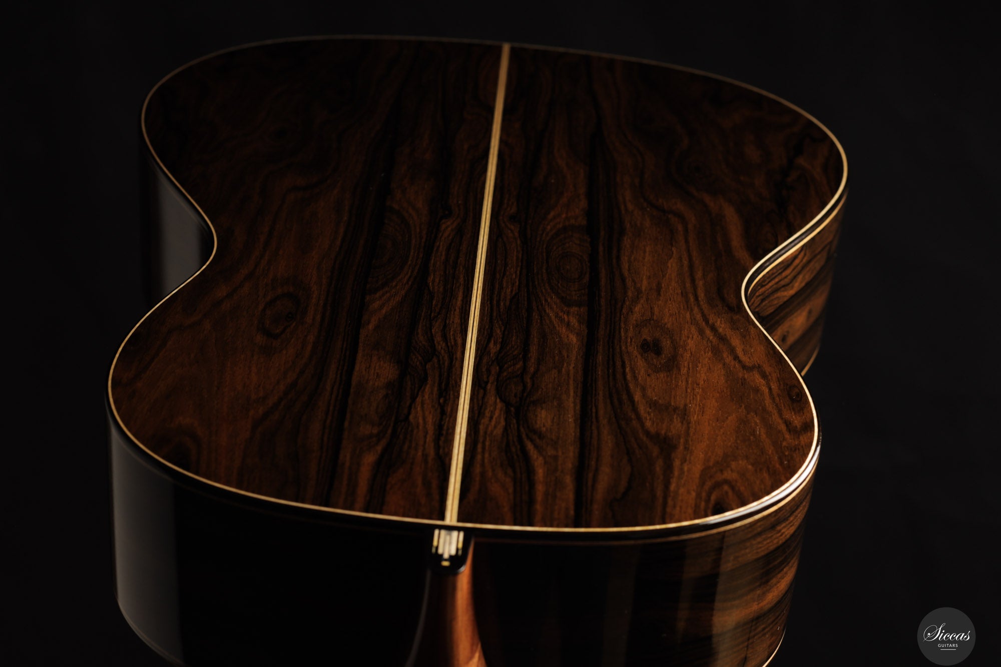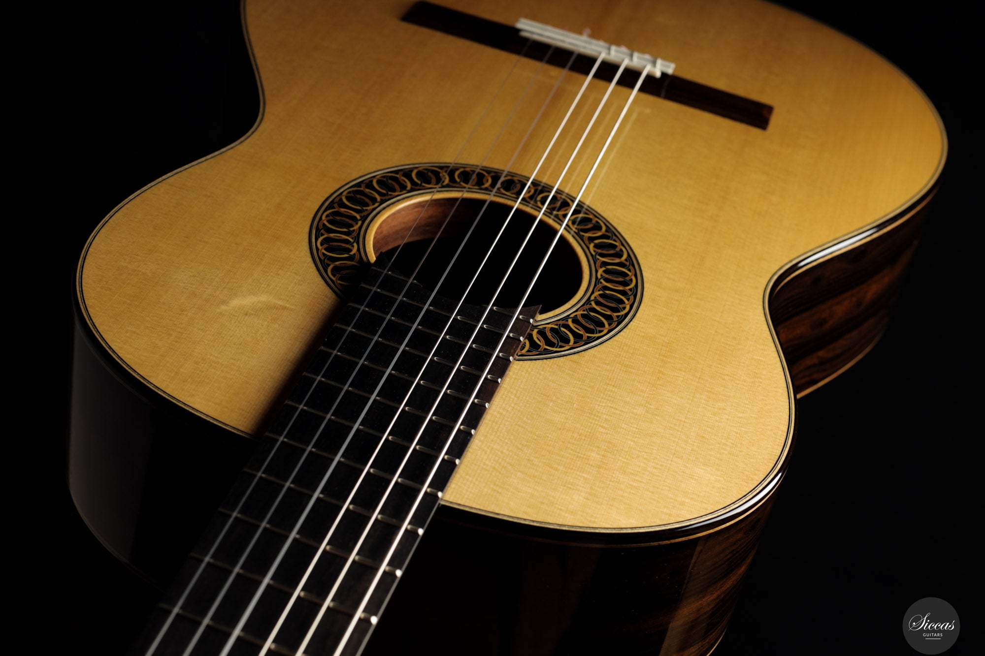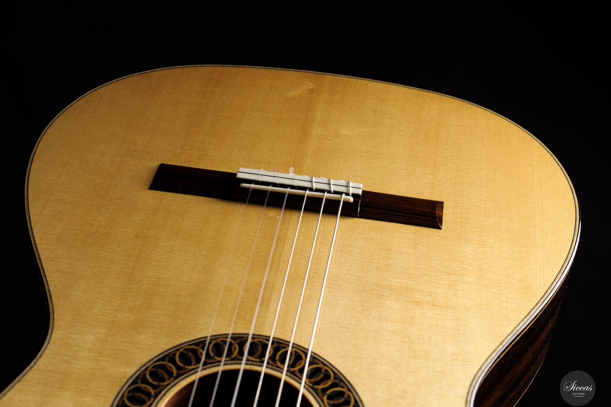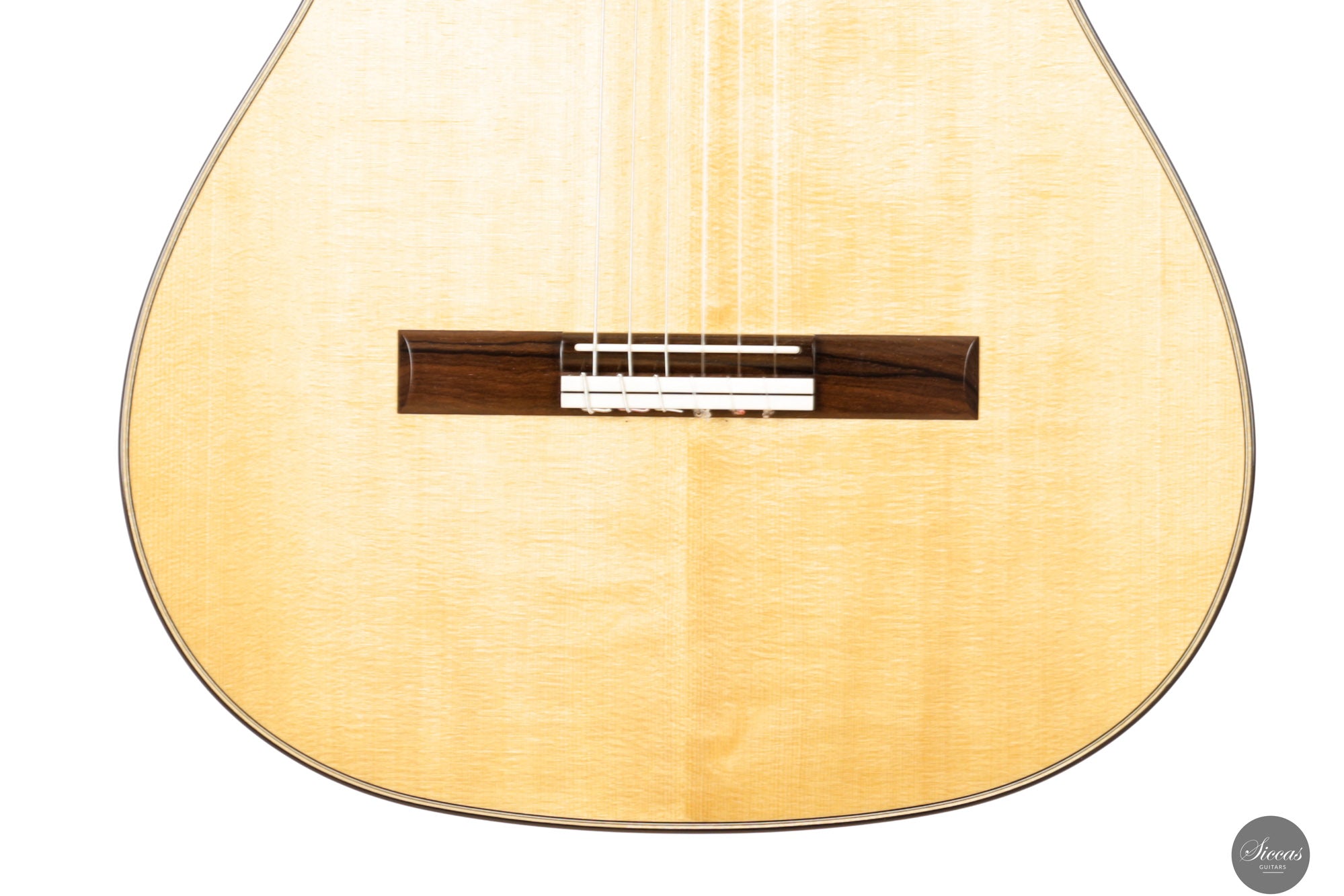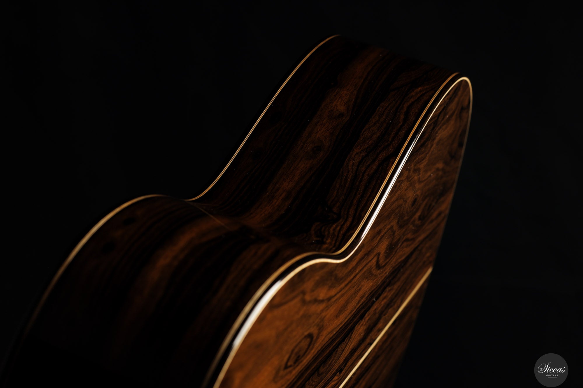 Marco hat die Decke gezielt abgestimmt, um das Sustain zu optimieren und die Obertöne fein zu kontrollieren – so lässt sich das Instrument in verschiedensten Klangfarben und Dynamiken wunderbar formen. Die extrem dünnen Doppelzargen geben der Gitarre zusätzlich Kraft, mehr Tiefe im Bassbereich sowie Glanz und Transparenz in den Höhen.