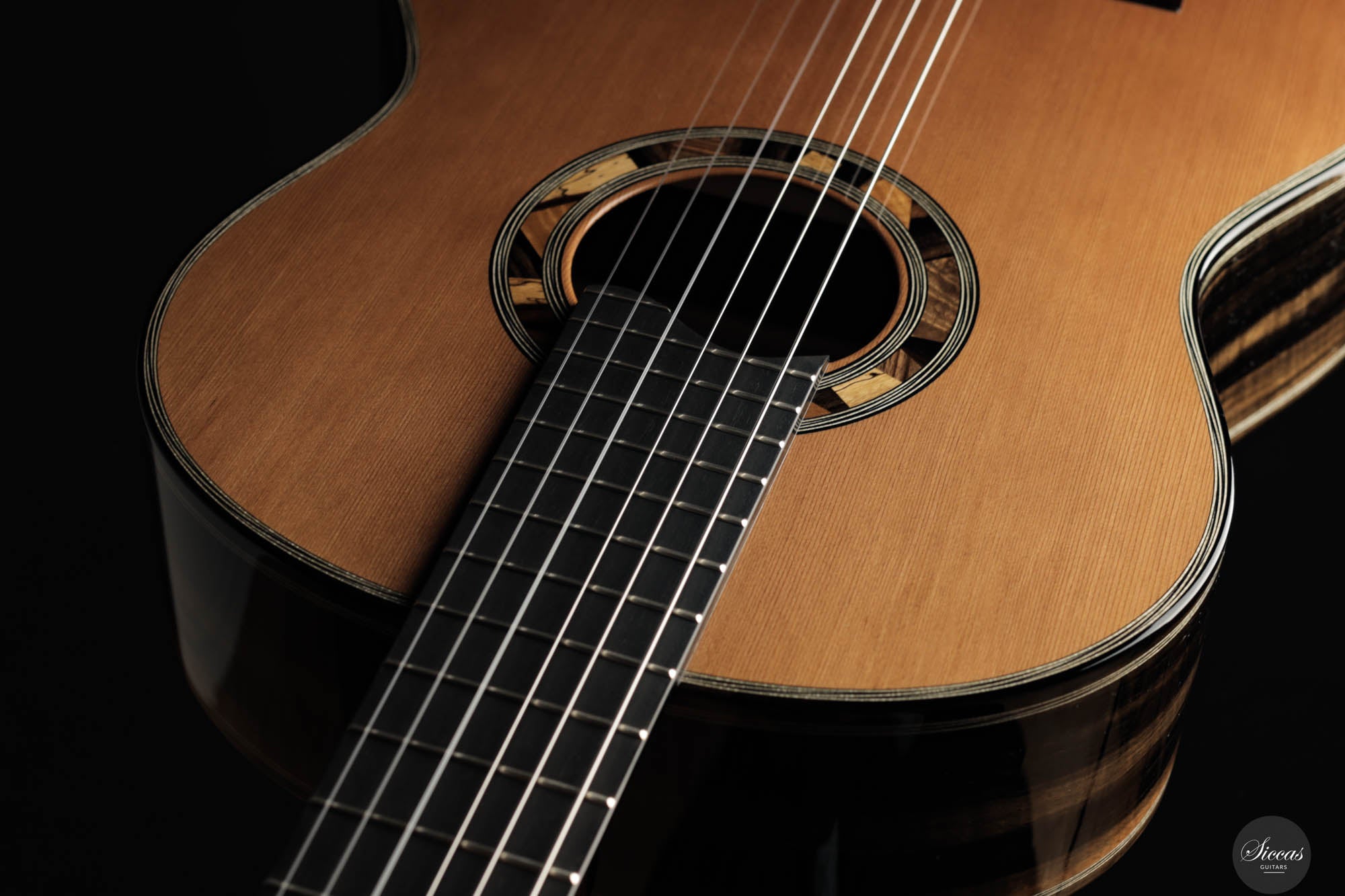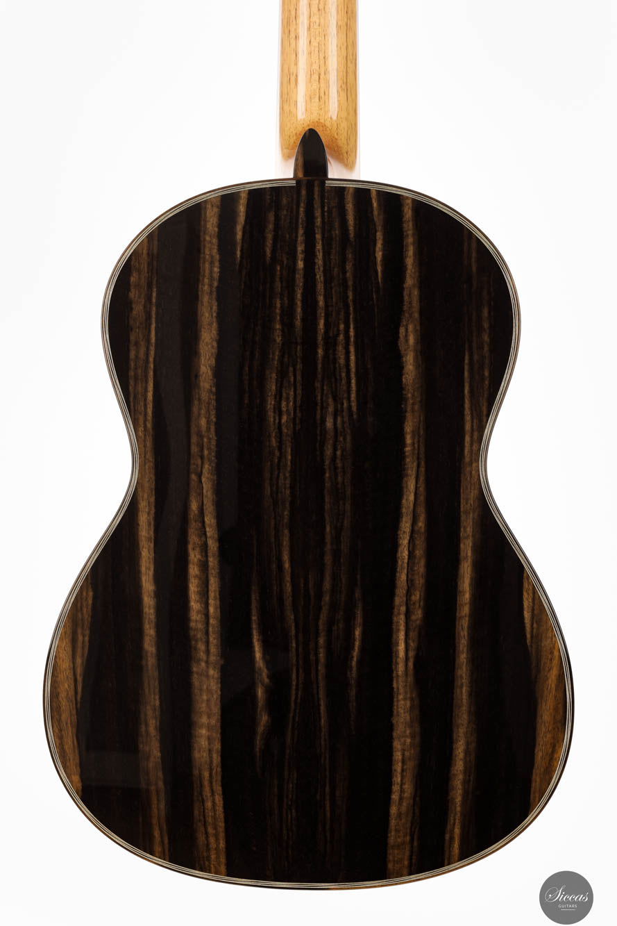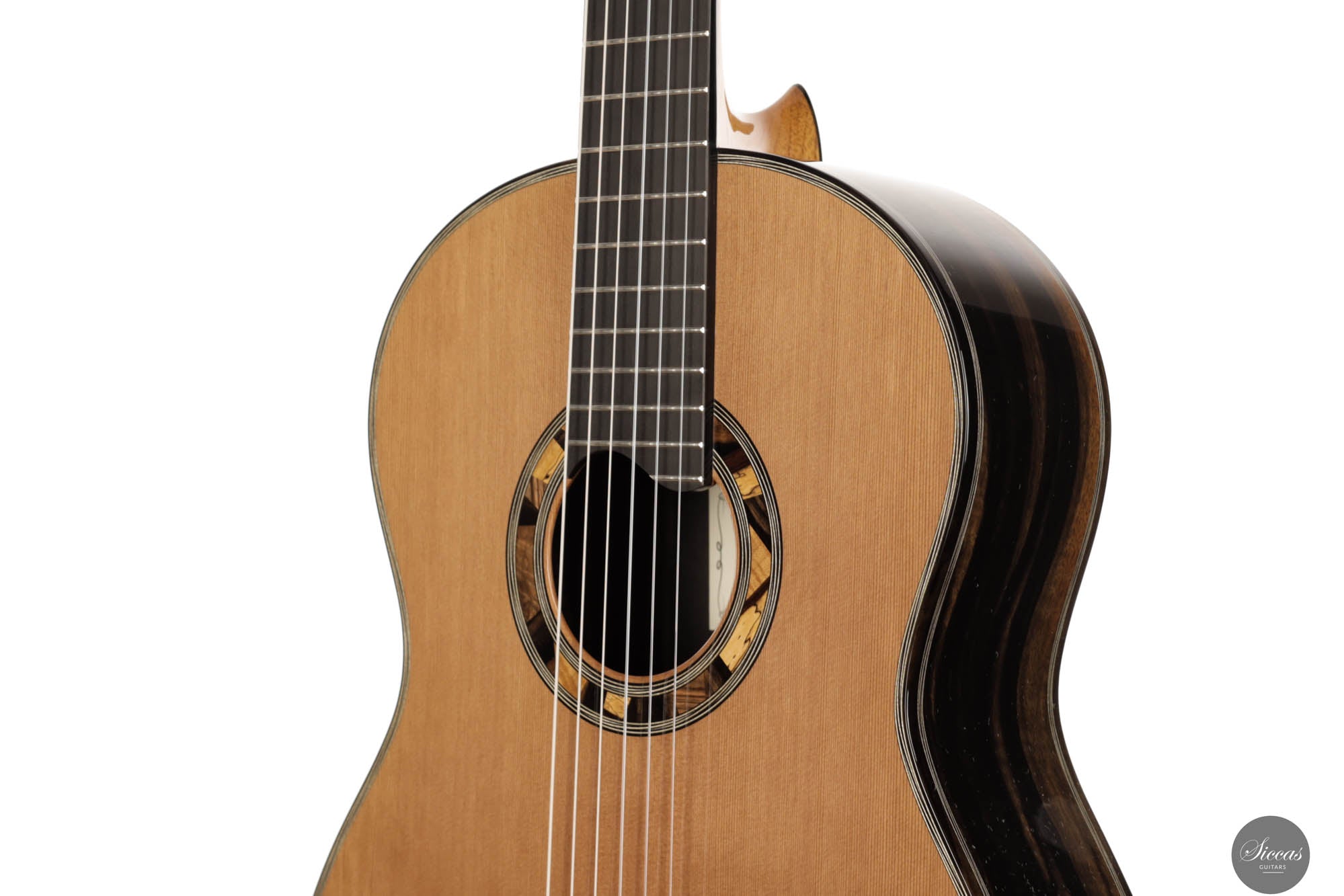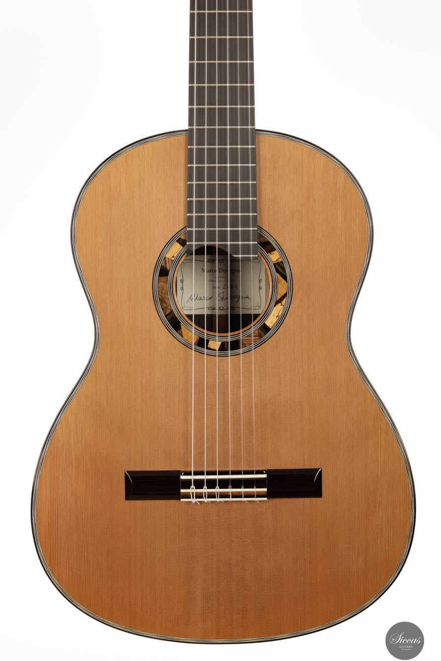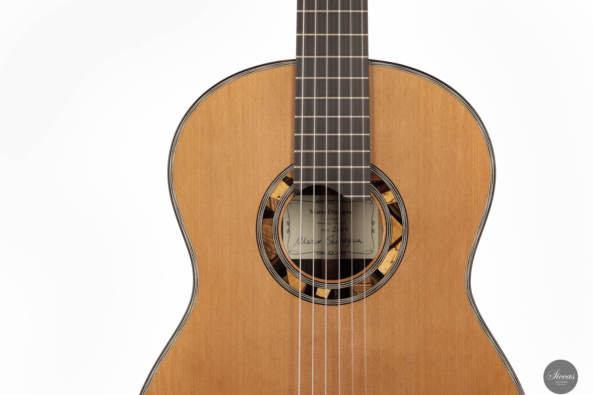 Die Limited Edition REG 2024 Gitarre von Marco Dissegna vereint traditionellen Gitarrenbau mit modernen Anforderungen und eignet sich daher hervorragend für zeitgenössische Musiker. Das Instrument verfügt über eine Decke aus Rotzeder, die aufgrund ihrer ansprechenden Eigenschaften über ein breites Frequenzspektrum ausgewählt wurde, ergänzt durch geflammtes Ebenholz für Rücken und Seiten, um Steifigkeit und Klangprojektion zu verbessern. Der Aufbau umfasst ein 7-Fächer-Verstrebungsmuster, das entwickelt wurde, um ein dynamisches Spielerlebnis zu unterstützen und eine leichte Bespielbarkeit für nuancierte Aufführungen zu gewährleisten. In Bezug auf das Design hat Marco individuelle Zierleisten hinzugefügt, die die Konturen von Rücken und Seiten hervorheben, zusammen mit fein gearbeiteten Alessi-Stimmmechaniken und einem Schellack-Finish, die seinen akribischen Ansatz beim Gitarrenbau unterstreichen.