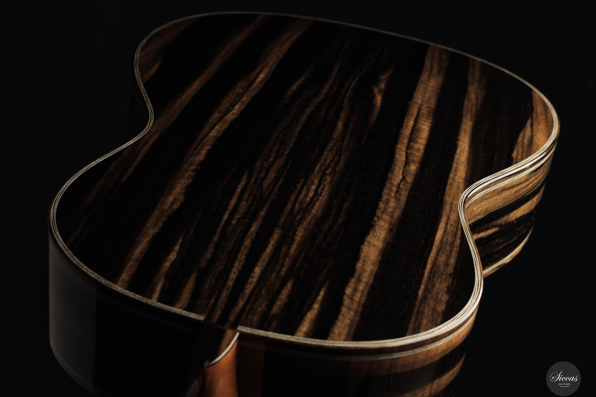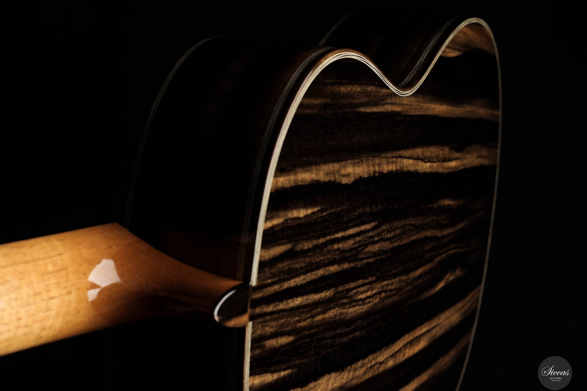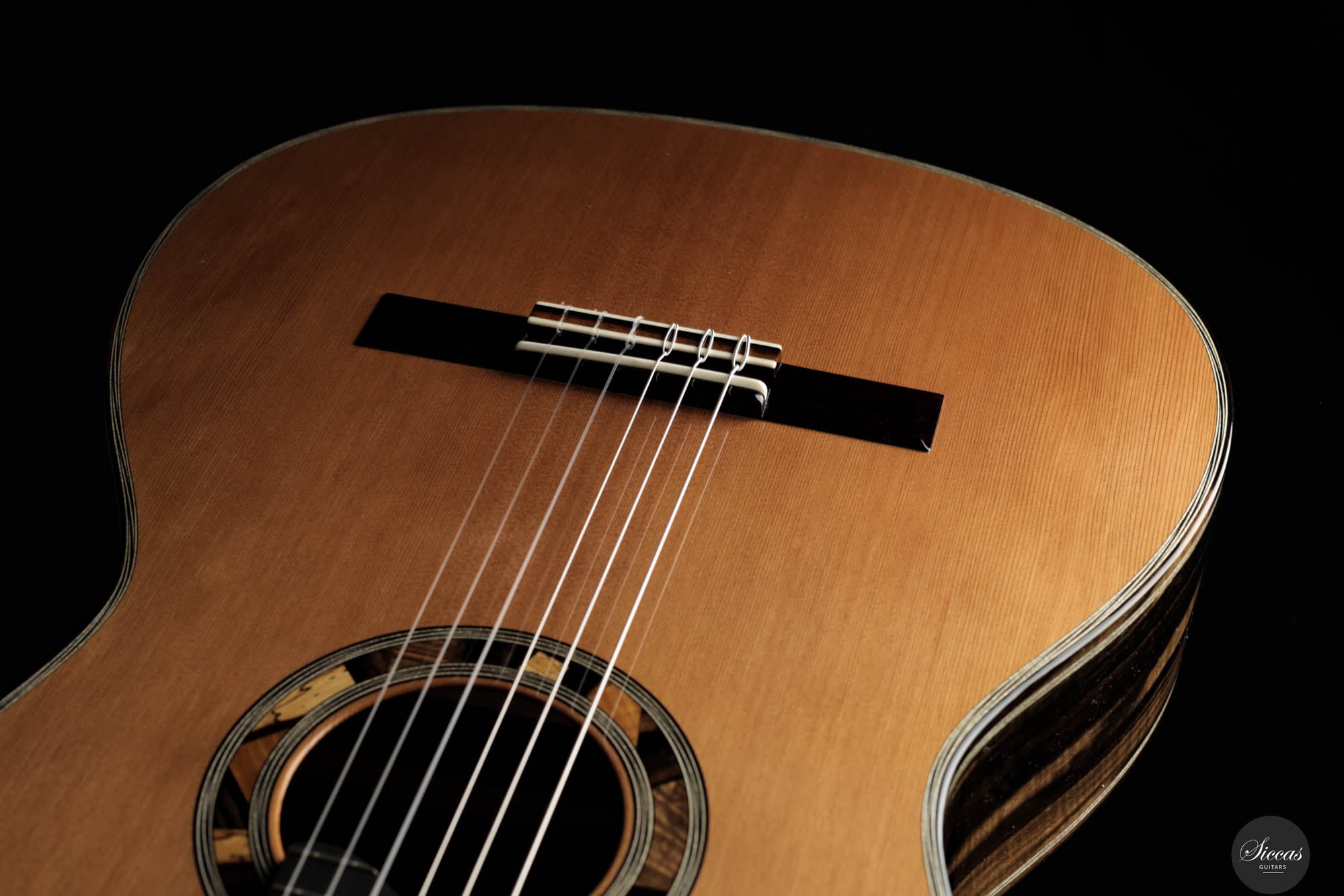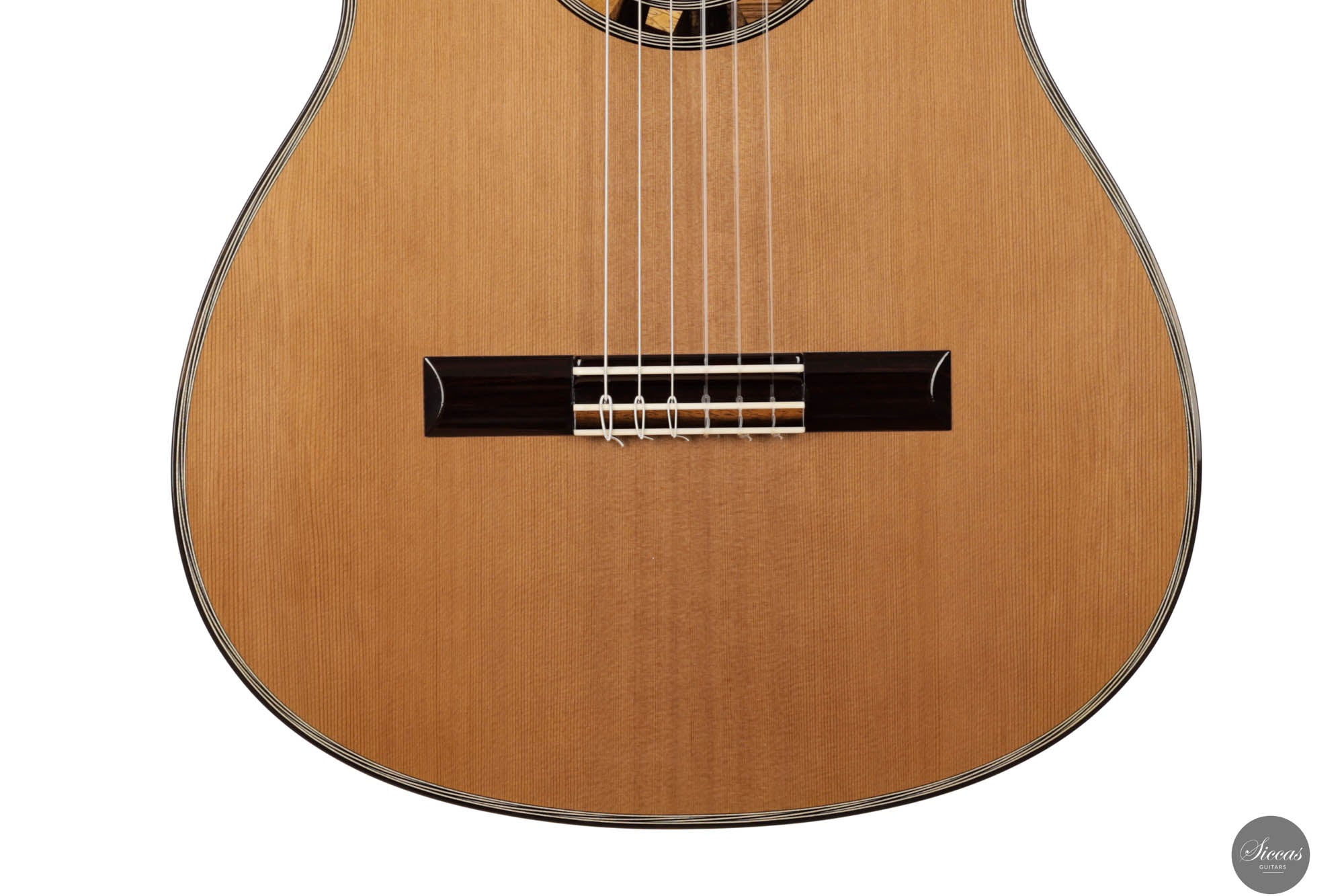 Die Limited Edition REG 2024 Gitarre von Marco Dissegna vereint traditionellen Gitarrenbau mit modernen Anforderungen und eignet sich daher hervorragend für zeitgenössische Musiker. Das Instrument verfügt über eine Decke aus Rotzeder, die aufgrund ihrer ansprechenden Eigenschaften über ein breites Frequenzspektrum ausgewählt wurde, ergänzt durch geflammtes Ebenholz für Rücken und Seiten, um Steifigkeit und Klangprojektion zu verbessern. Der Aufbau umfasst ein 7-Fächer-Verstrebungsmuster, das entwickelt wurde, um ein dynamisches Spielerlebnis zu unterstützen und eine leichte Bespielbarkeit für nuancierte Aufführungen zu gewährleisten. In Bezug auf das Design hat Marco individuelle Zierleisten hinzugefügt, die die Konturen von Rücken und Seiten hervorheben, zusammen mit fein gearbeiteten Alessi-Stimmmechaniken und einem Schellack-Finish, die seinen akribischen Ansatz beim Gitarrenbau unterstreichen.
