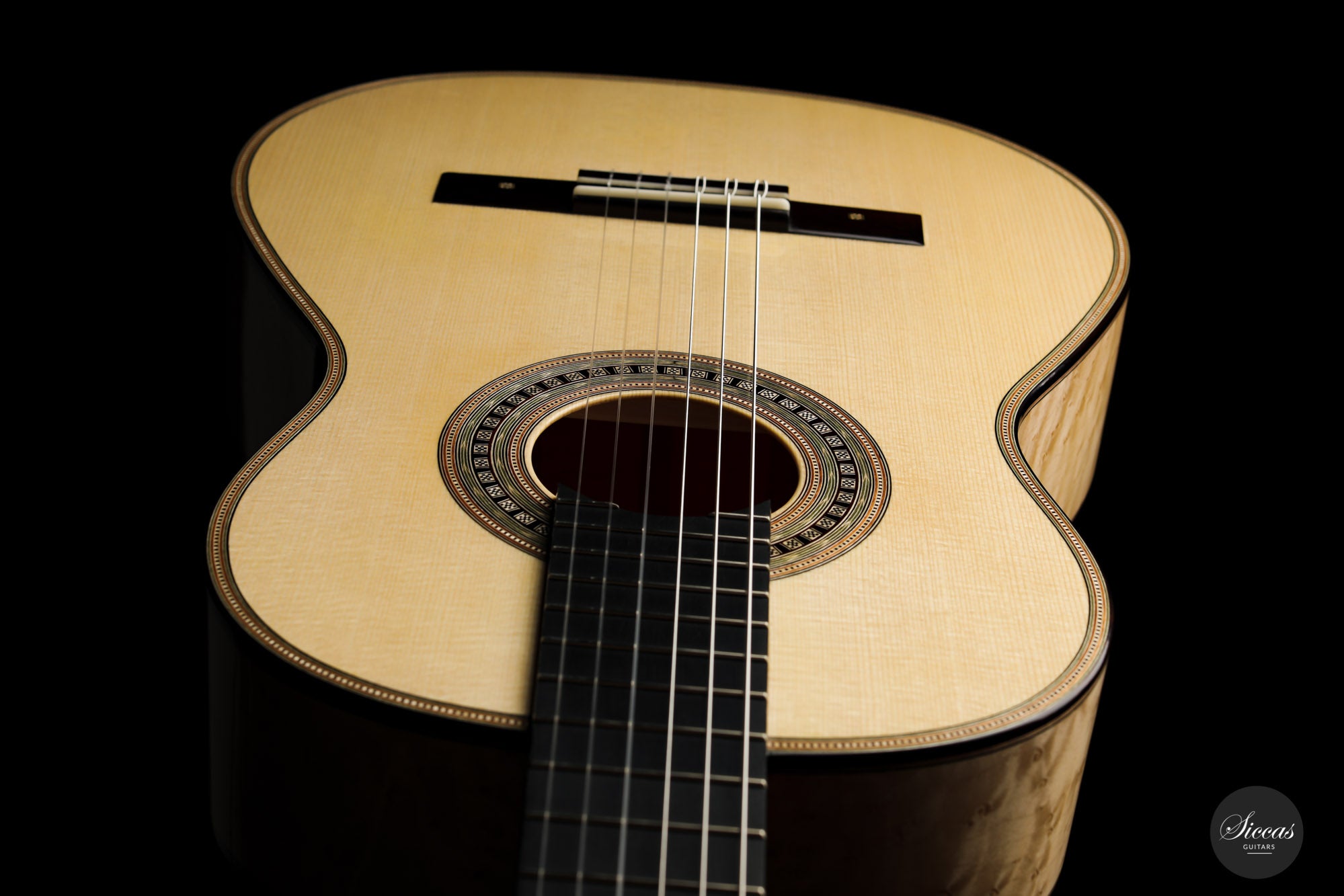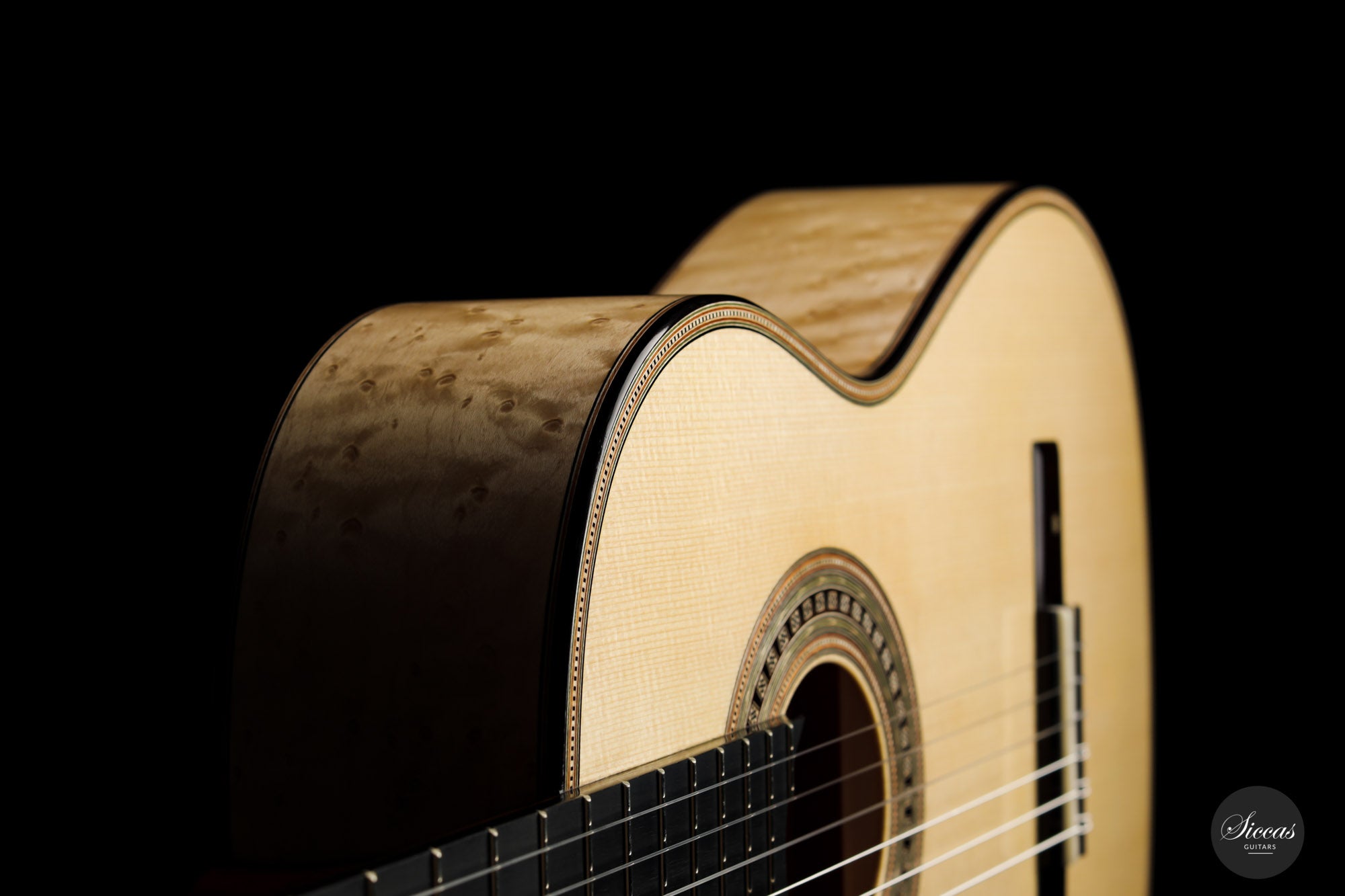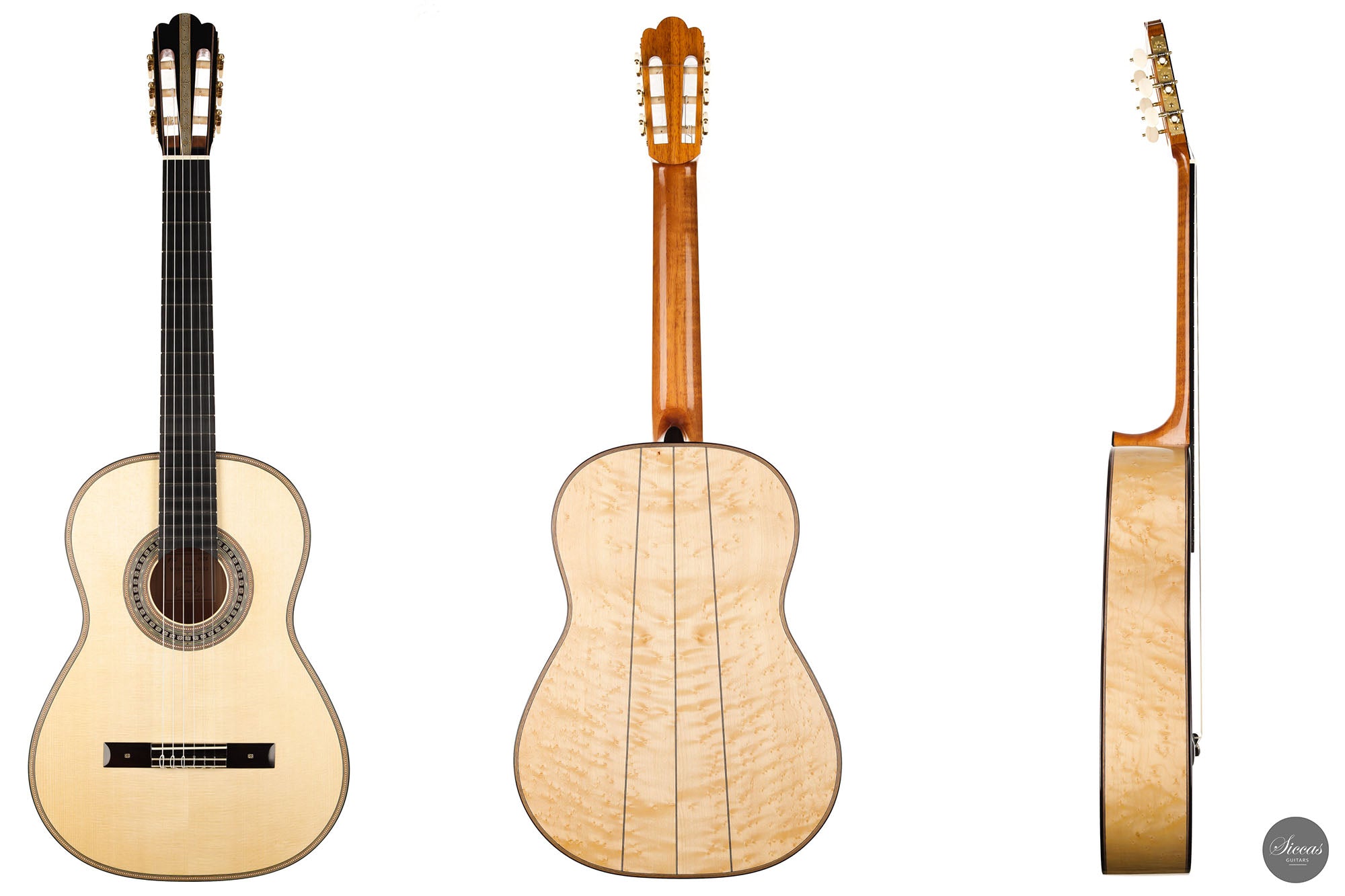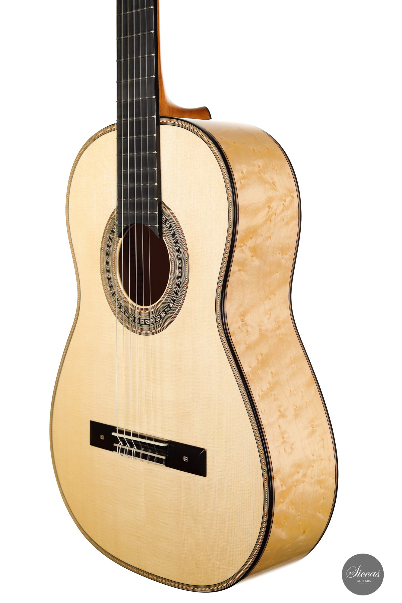 This guitar is the first Torres model that we receive from Marco, and it is truly magnificent. It was made as a tribute to Antonio de Torres, the father of the modern guitar, and is a beautifully decorated replica of an 1867 Antonio de Torres. A mesmerizing Birdseye maple has been used for the back and sides, and the overall decoration is rich and detailed. The air resonance of the body is very low, like that of the original, giving it a deep and authentic old-world sound.