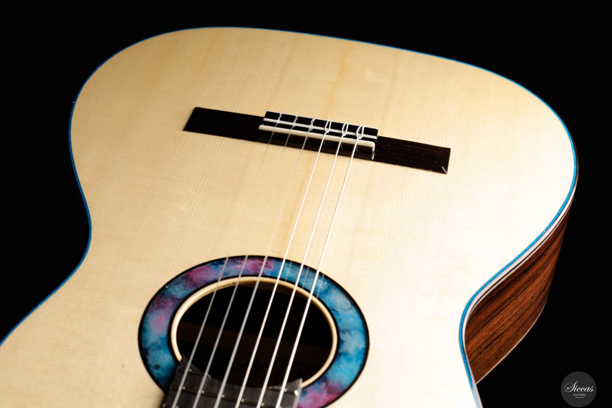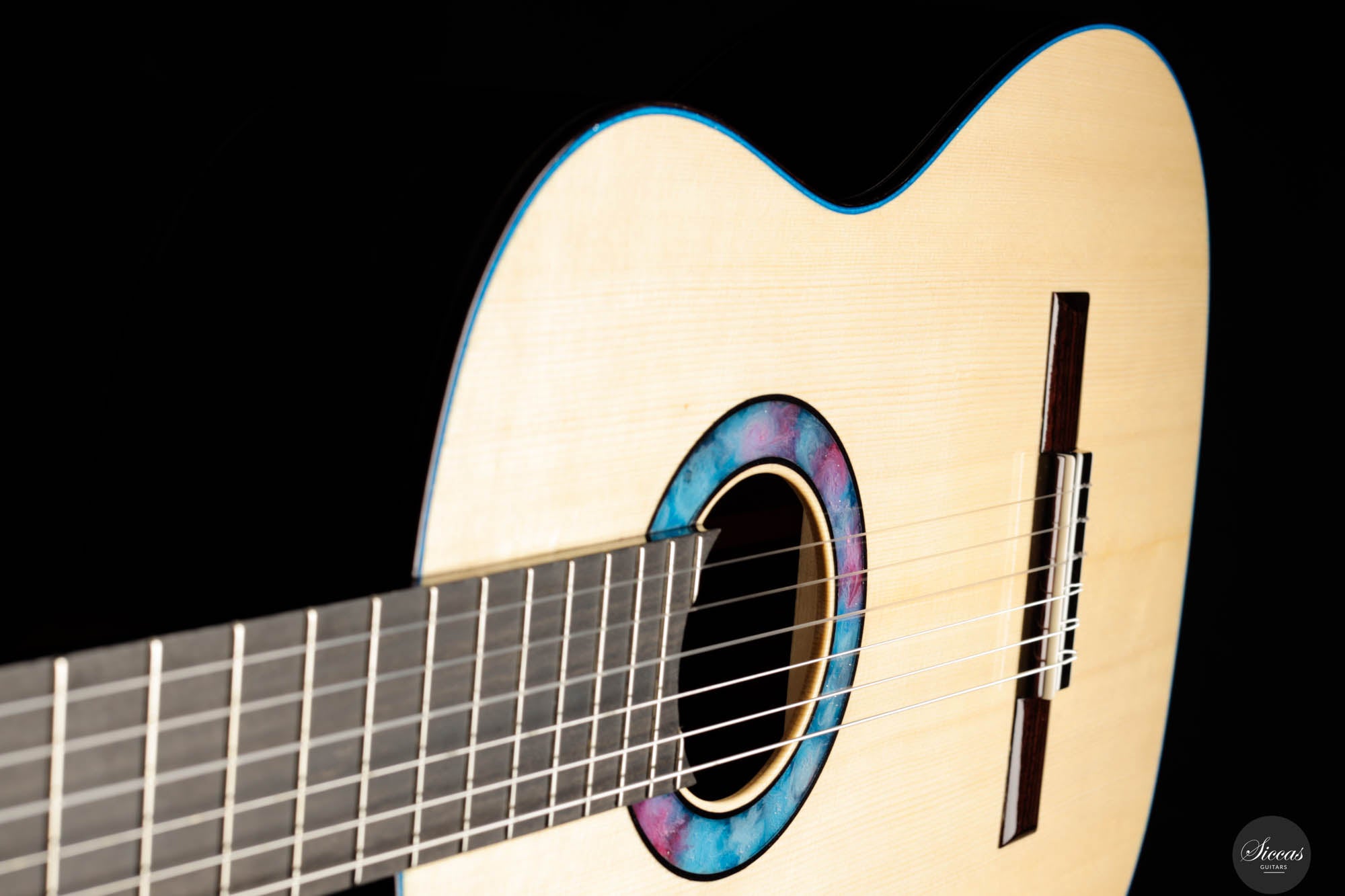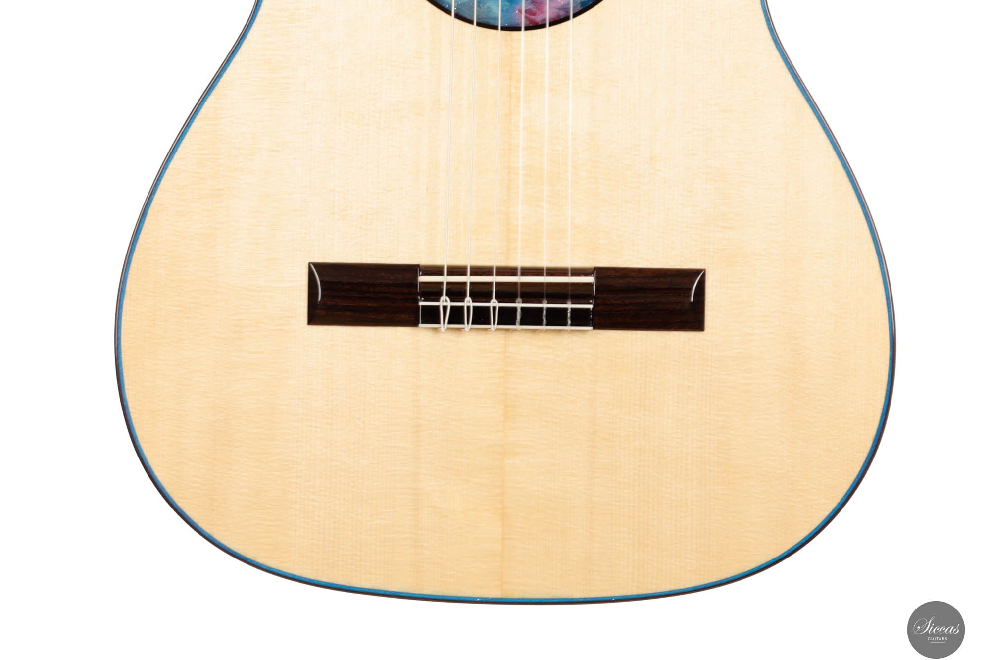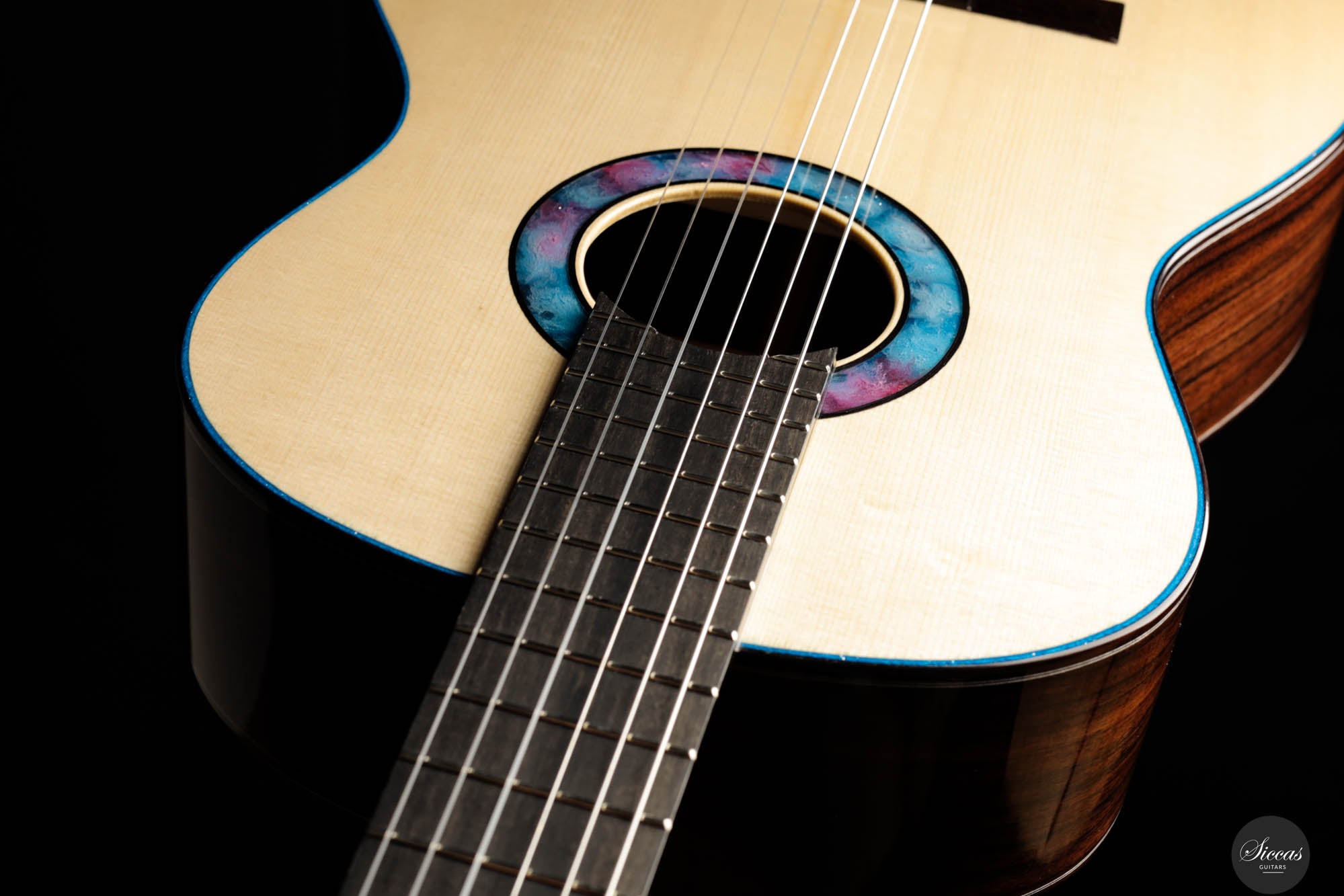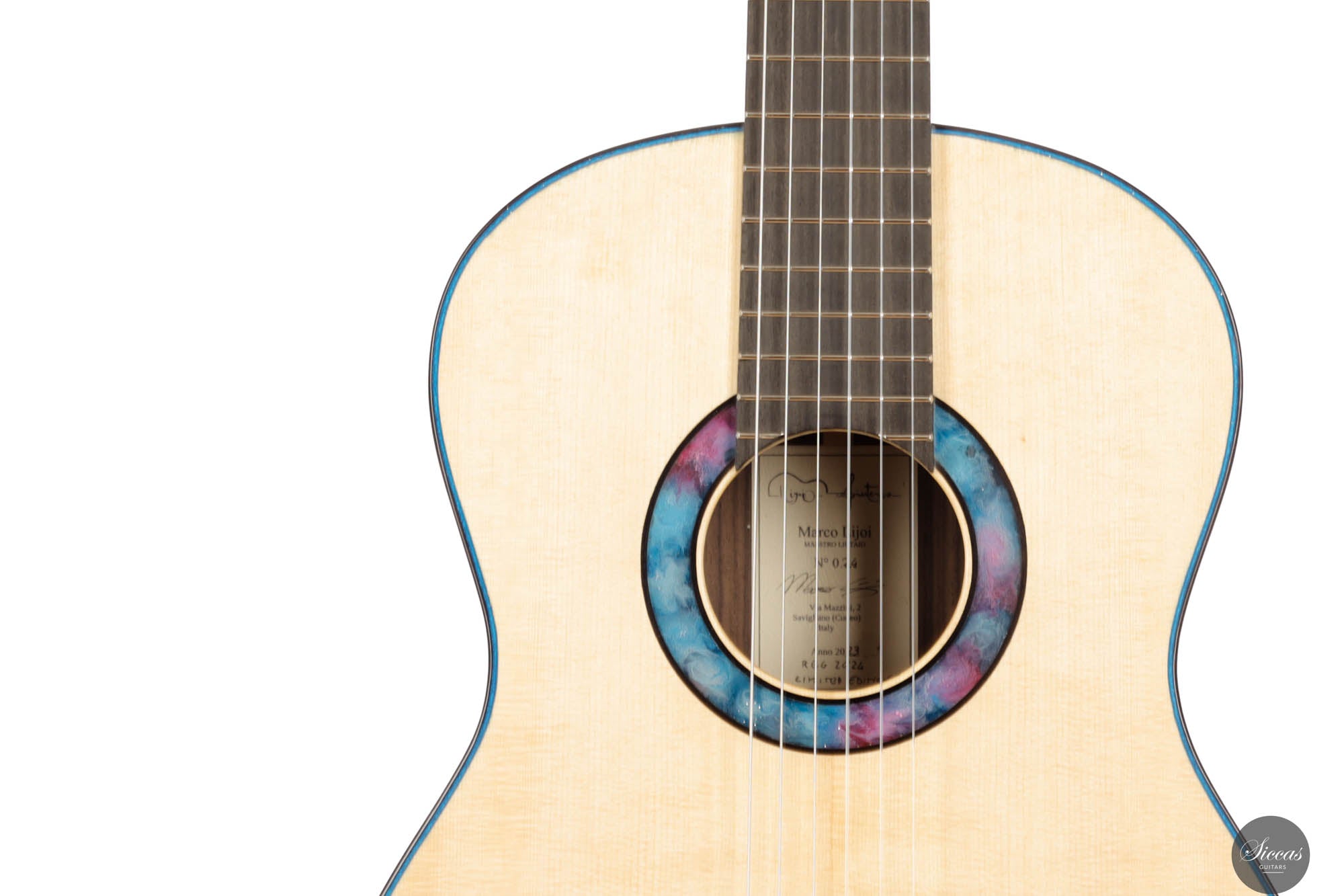Der Bau der Gitarre ist in traditionellen Techniken verwurzelt und verfügt über eine Decke mit einem Siebenfächer-Verstrebungssystem, ergänzt durch eine kleine unter dem Steg verlaufende Kette von Seite zu Seite und abgeschlossen mit zwei Schnurrhaaren. Die Rosette ist so gestaltet, dass sie das Himmelsgewölbe darstellt, gefertigt aus Epoxidharz, das mit alkoholbasierten Farben verbessert und mit Gold- und Silberstaub gesprenkelt ist, was ein Gefühl des Nachthimmels hervorruft. Zusätzlich spiegelt die Tischkantendekoration dieses astronomische Thema wider. Um sicherzustellen, dass der Hals stabil und langlebig bleibt, wurden zwei Kohlenstoffstäbe in seine Struktur integriert. Die Gitarre ist auf einen Ton von G/G# gestimmt, und Marco hat sich für eine einfache, doch elegante ästhetische Linie für diese Gitarre entschieden, wobei funktionale Merkmale gegenüber ornamentalen bevorzugt werden. Das Finish ist ein traditionelles Schellack, das direkt in Marcos Werkstatt aufgetragen wird, von dem er glaubt, dass es der Gitarre helfen wird, wirklich mit den Emotionen und Ausdrücken der Musiker, die sie spielen, zu resonieren.