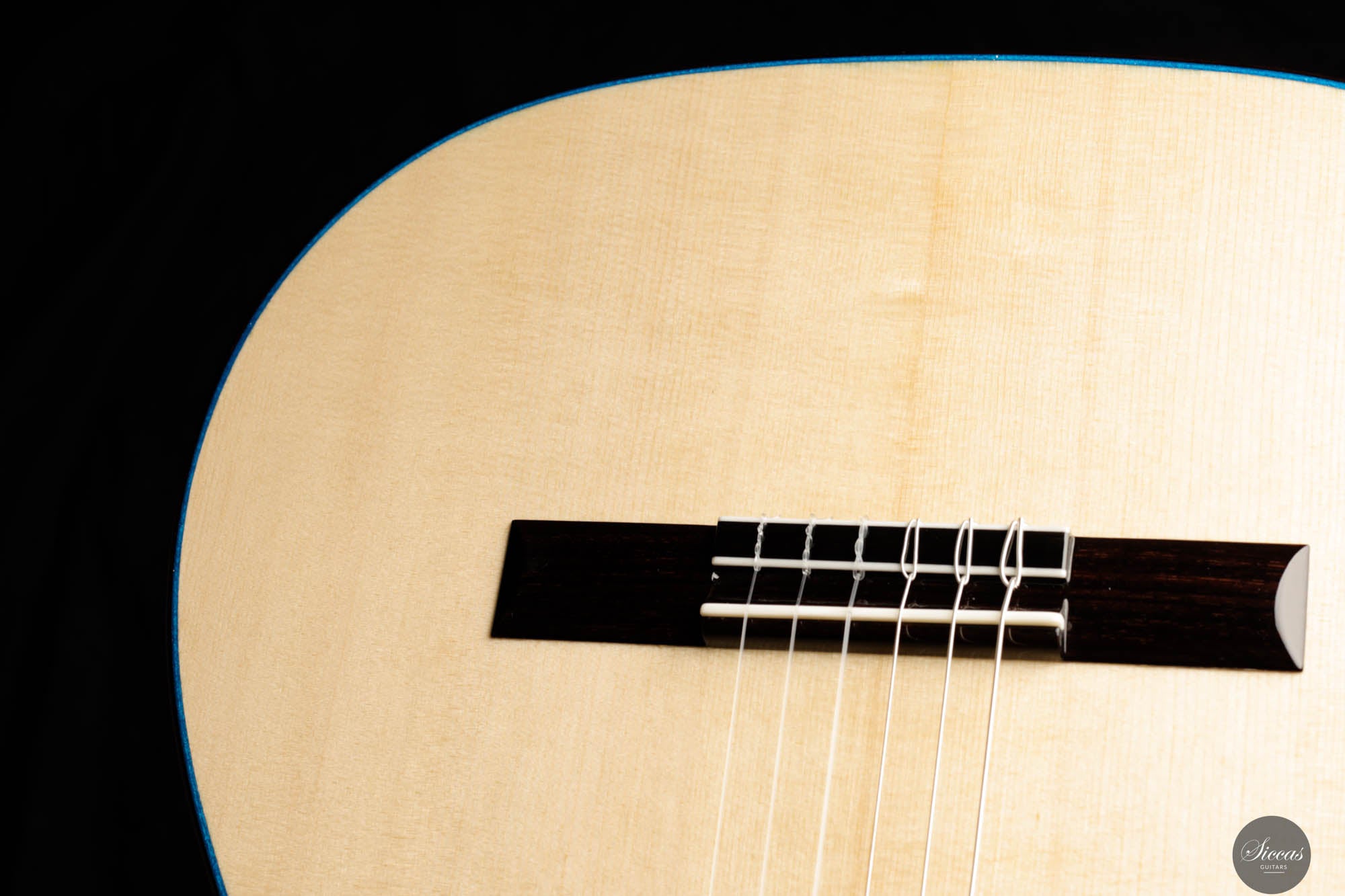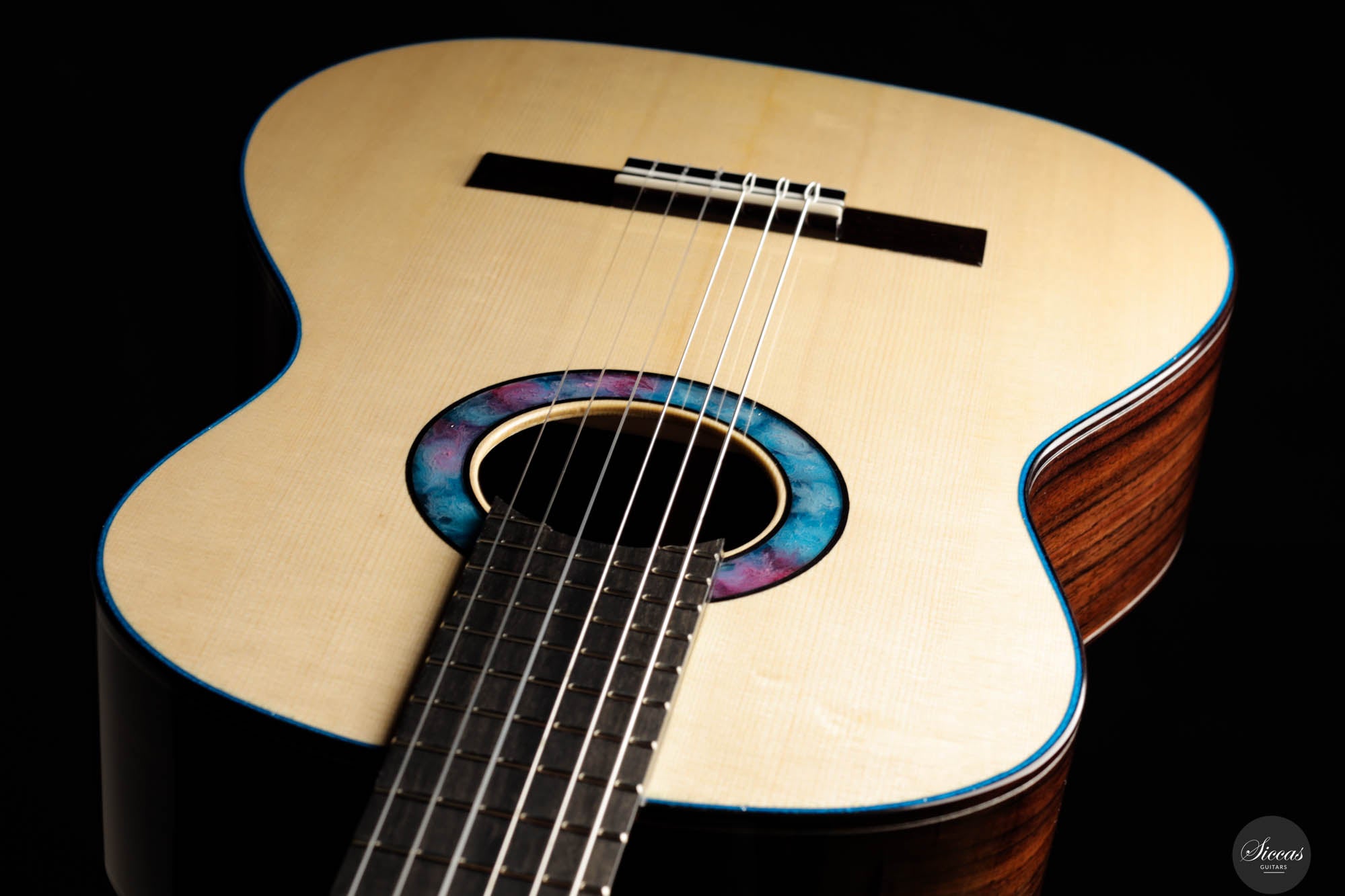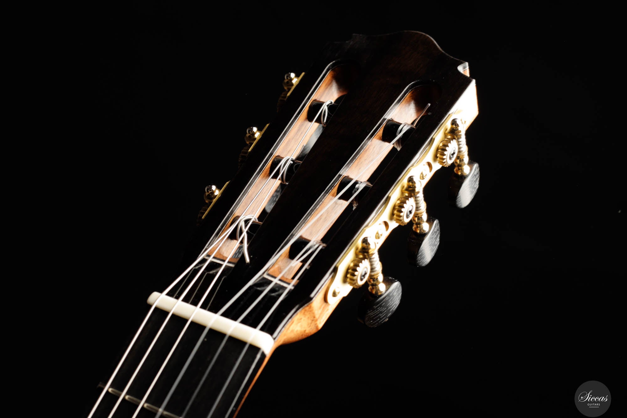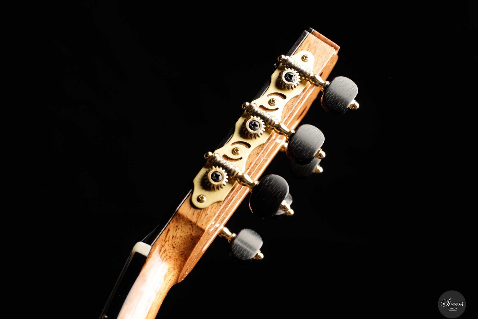 Der Bau der Gitarre ist in traditionellen Techniken verwurzelt und verfügt über eine Decke mit einem Siebenfächer-Verstrebungssystem, ergänzt durch eine kleine unter dem Steg verlaufende Kette von Seite zu Seite und abgeschlossen mit zwei Schnurrhaaren. Die Rosette ist so gestaltet, dass sie das Himmelsgewölbe darstellt, gefertigt aus Epoxidharz, das mit alkoholbasierten Farben verbessert und mit Gold- und Silberstaub gesprenkelt ist, was ein Gefühl des Nachthimmels hervorruft. Zusätzlich spiegelt die Tischkantendekoration dieses astronomische Thema wider. Um sicherzustellen, dass der Hals stabil und langlebig bleibt, wurden zwei Kohlenstoffstäbe in seine Struktur integriert. Die Gitarre ist auf einen Ton von G/G# gestimmt, und Marco hat sich für eine einfache, doch elegante ästhetische Linie für diese Gitarre entschieden, wobei funktionale Merkmale gegenüber ornamentalen bevorzugt werden. Das Finish ist ein traditionelles Schellack, das direkt in Marcos Werkstatt aufgetragen wird, von dem er glaubt, dass es der Gitarre helfen wird, wirklich mit den Emotionen und Ausdrücken der Musiker, die sie spielen, zu resonieren.