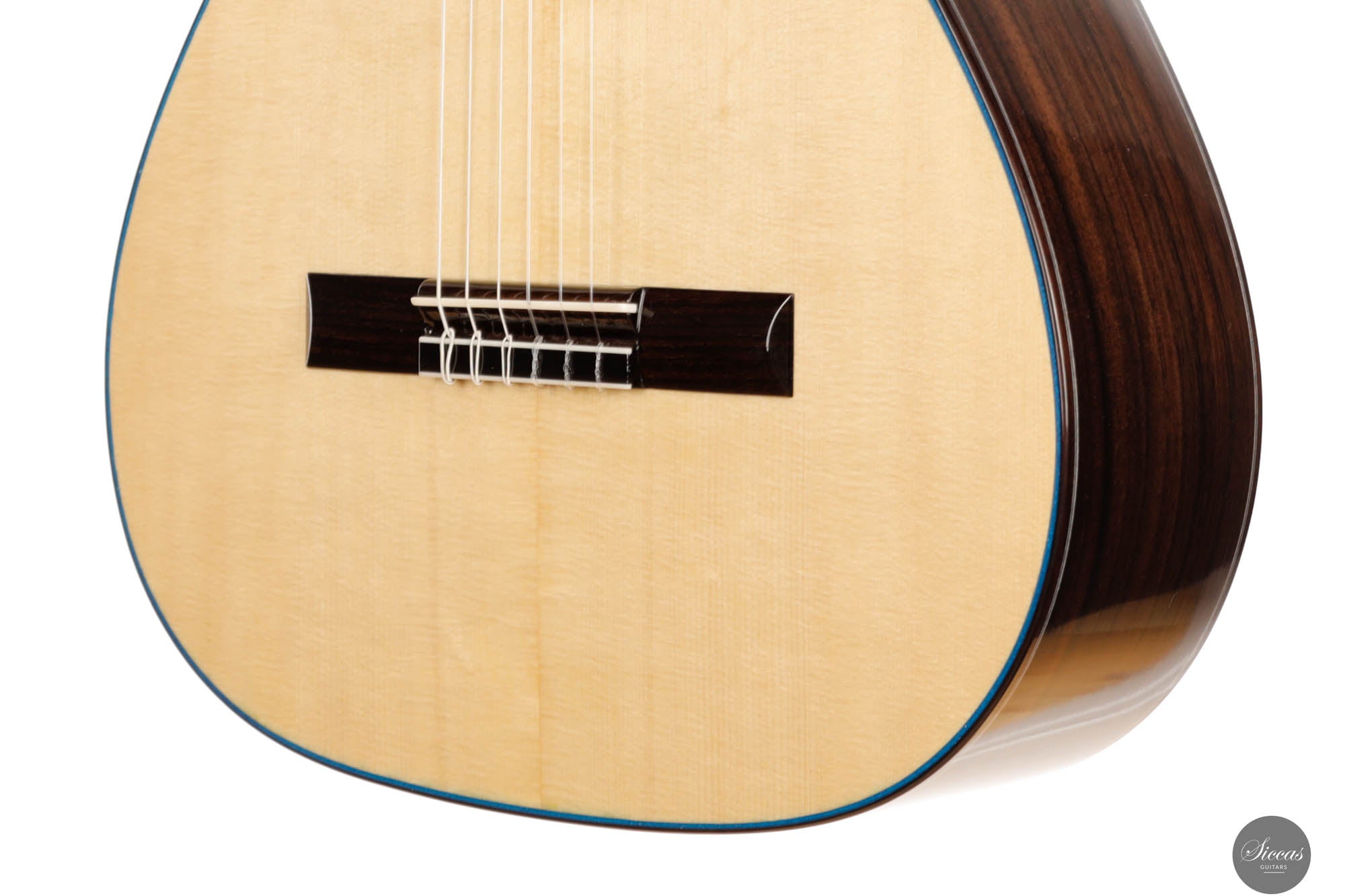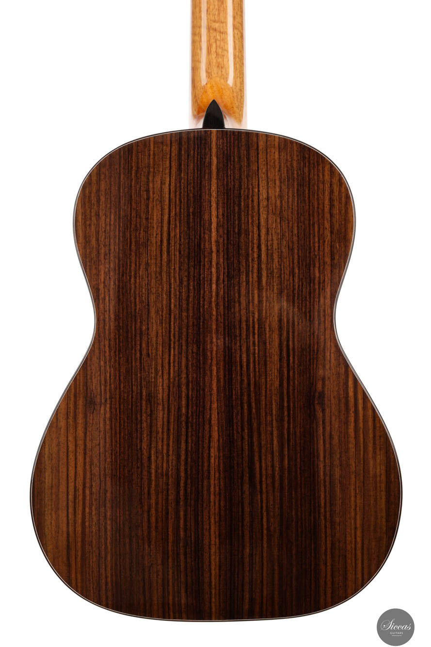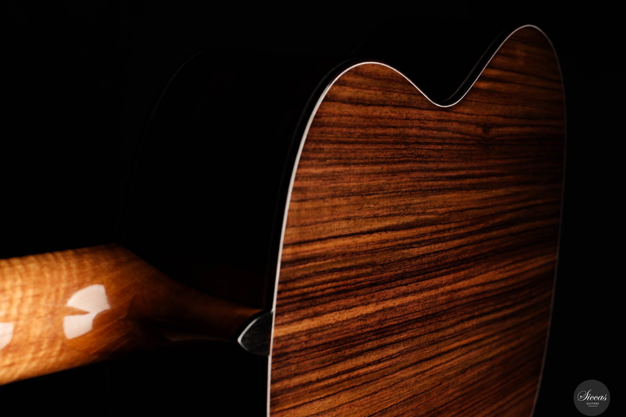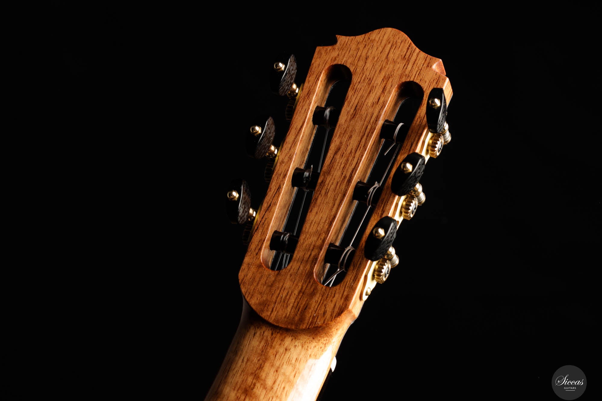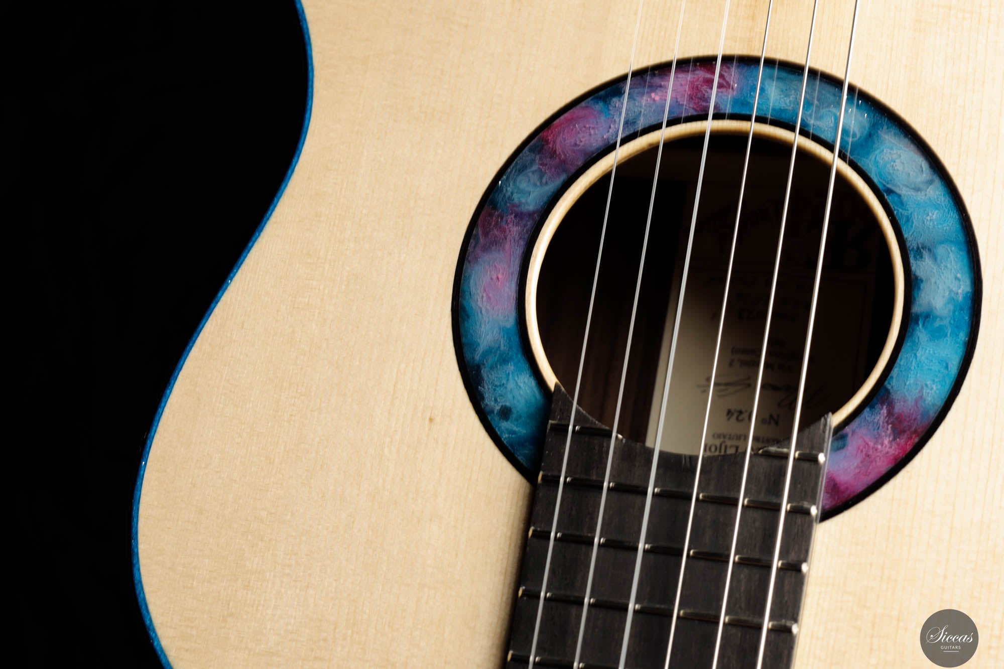 Der Bau der Gitarre ist in traditionellen Techniken verwurzelt und verfügt über eine Decke mit einem Siebenfächer-Verstrebungssystem, ergänzt durch eine kleine unter dem Steg verlaufende Kette von Seite zu Seite und abgeschlossen mit zwei Schnurrhaaren. Die Rosette ist so gestaltet, dass sie das Himmelsgewölbe darstellt, gefertigt aus Epoxidharz, das mit alkoholbasierten Farben verbessert und mit Gold- und Silberstaub gesprenkelt ist, was ein Gefühl des Nachthimmels hervorruft. Zusätzlich spiegelt die Tischkantendekoration dieses astronomische Thema wider. Um sicherzustellen, dass der Hals stabil und langlebig bleibt, wurden zwei Kohlenstoffstäbe in seine Struktur integriert. Die Gitarre ist auf einen Ton von G/G# gestimmt, und Marco hat sich für eine einfache, doch elegante ästhetische Linie für diese Gitarre entschieden, wobei funktionale Merkmale gegenüber ornamentalen bevorzugt werden. Das Finish ist ein traditionelles Schellack, das direkt in Marcos Werkstatt aufgetragen wird, von dem er glaubt, dass es der Gitarre helfen wird, wirklich mit den Emotionen und Ausdrücken der Musiker, die sie spielen, zu resonieren.