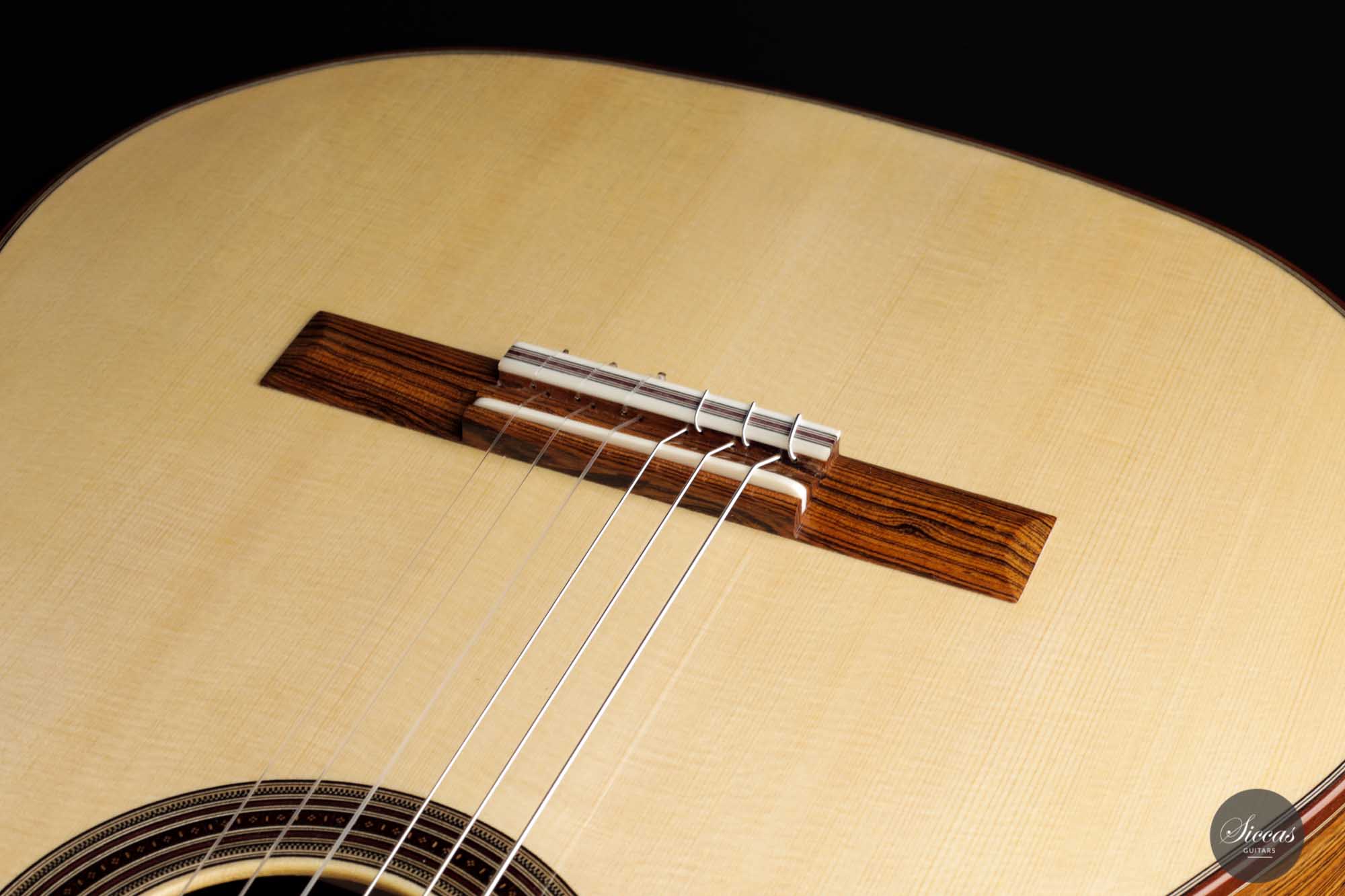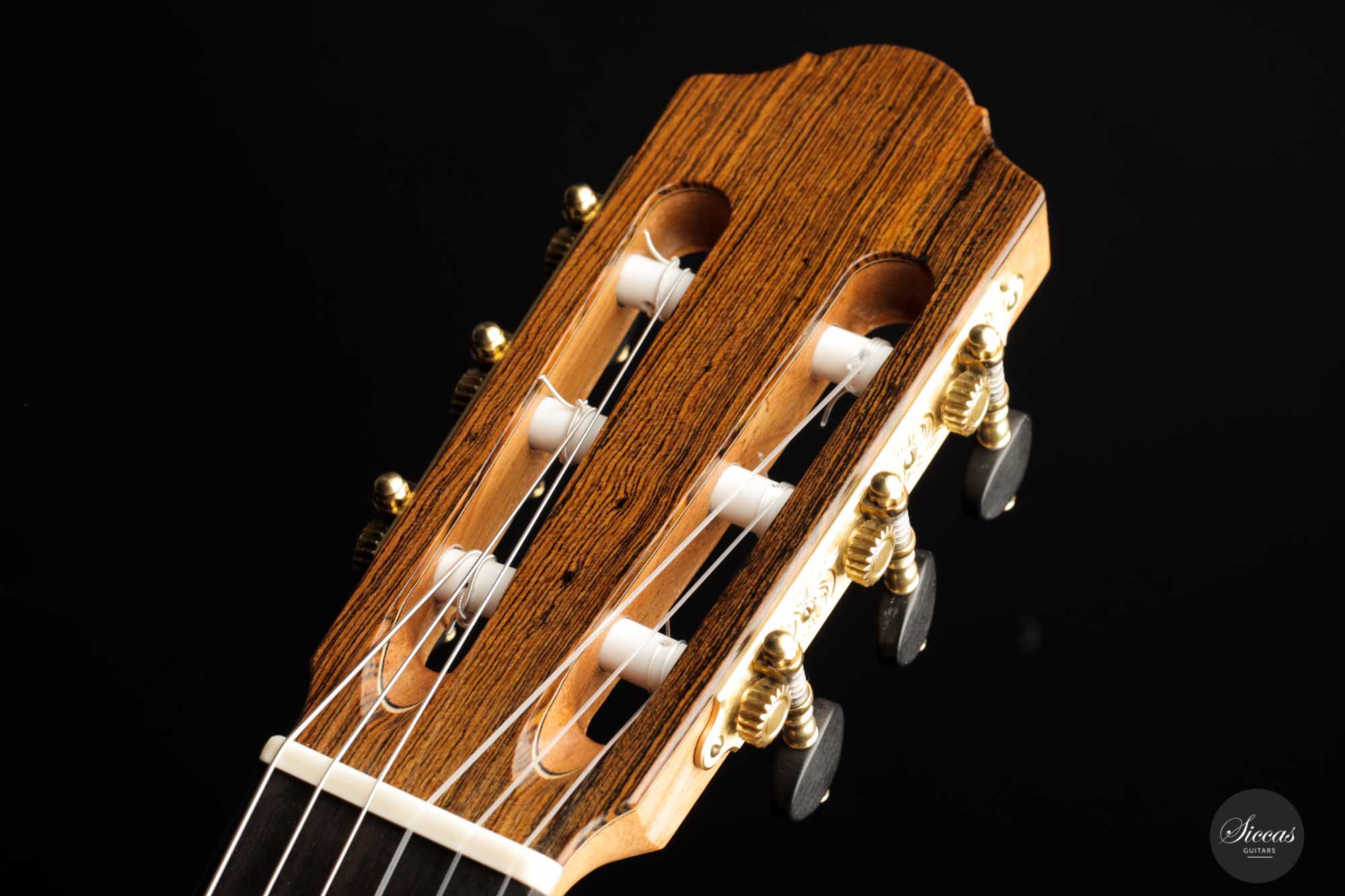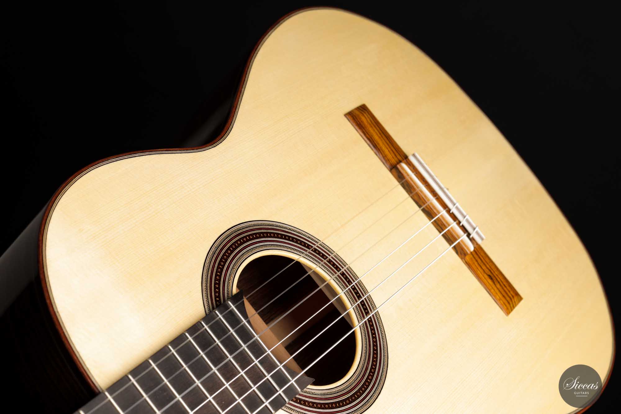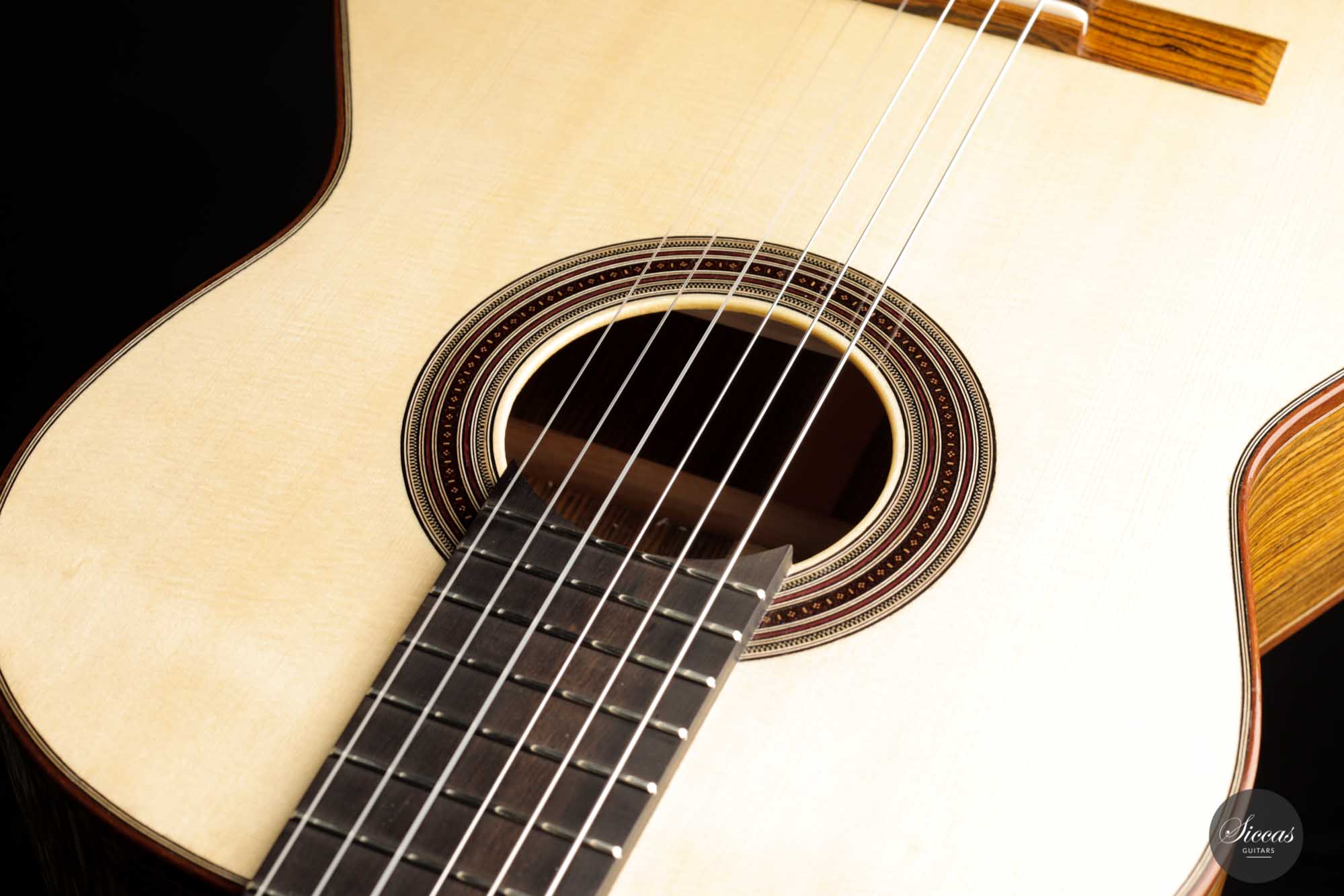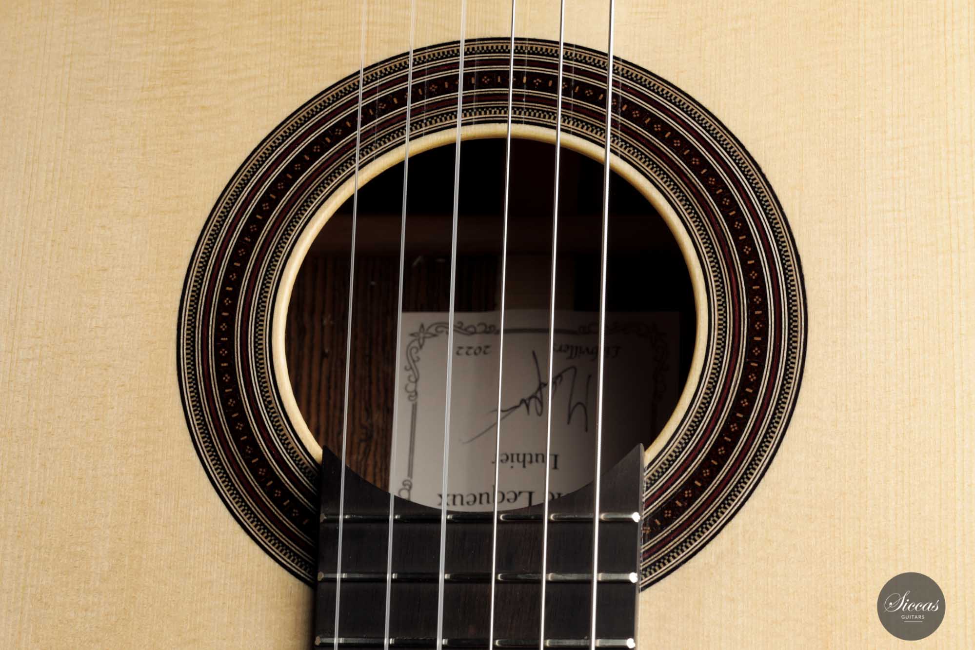 "Over time, I have refined my visual and acoustic perception. I build each guitar one by one in order to work on them as a whole. I use traditional construction methods inspired by the great masters such as Fleta, Friederich, and Bouchet. The combination of the soundboard with the back and sides, according to the different densities, is carefully thought out. I also pay a lot of attention to aesthetic research in the marriage of colors or the composition of the rosettes.