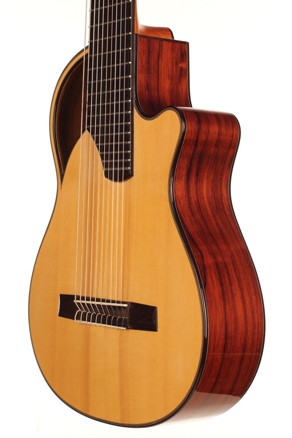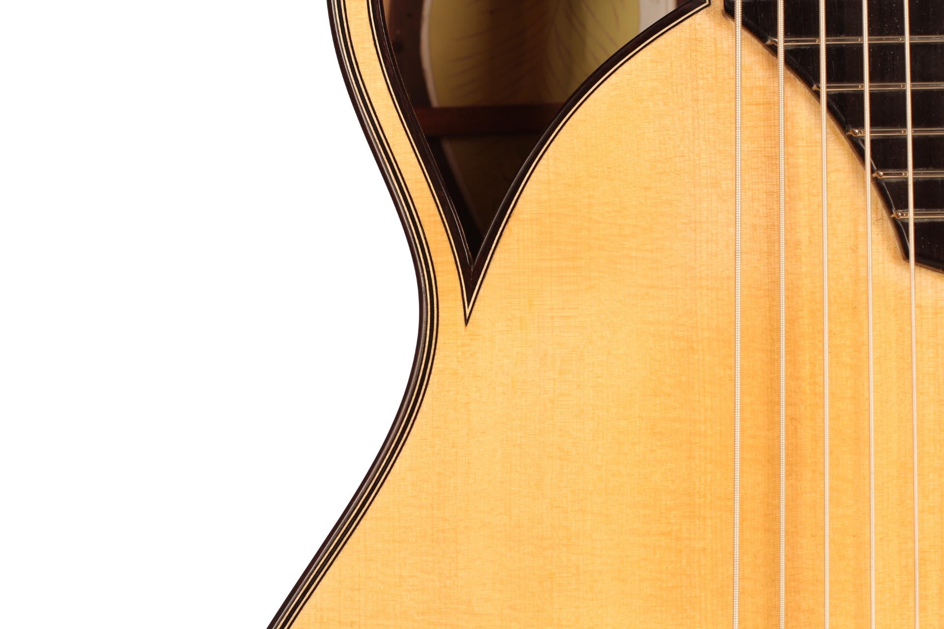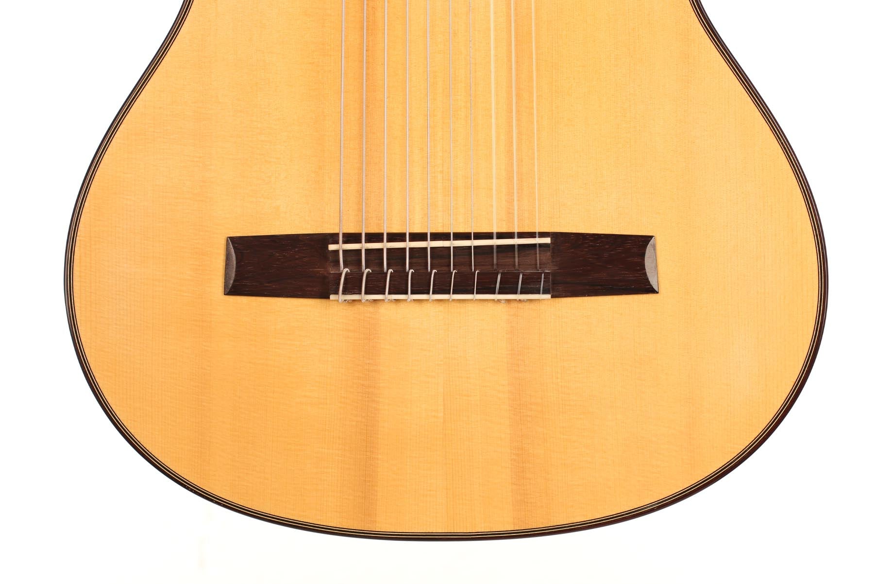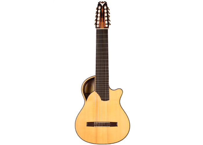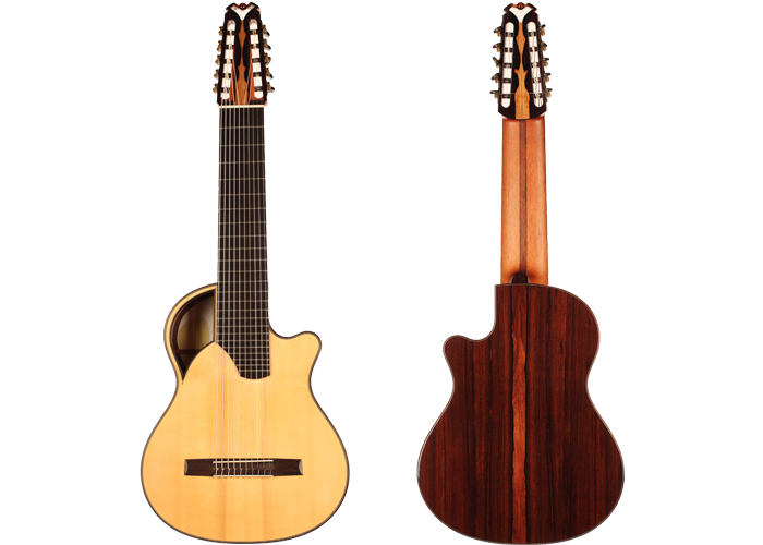 It has a fine spruce top with a reinforced fan bracing, designed to handle the 10 strings’ tension and to simultaneously allow a great freedom in the top’s vibration. The trebles are brilliant and crystal-clear, perfectly contrasting with the massive, voluminous basses. It is a very interesting instrument for an adventurous six strings player in need for challenge or an accomplished 10-strings player looking for a top-quality instrument. A hard-shell case is included.