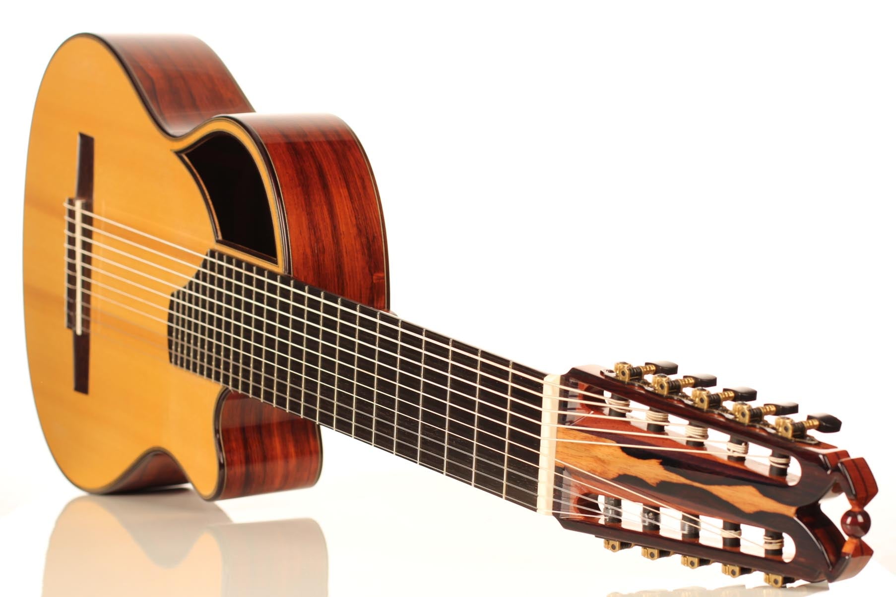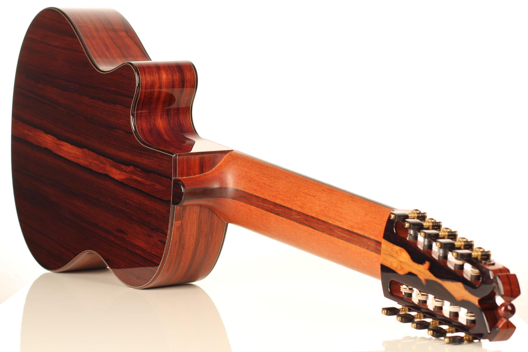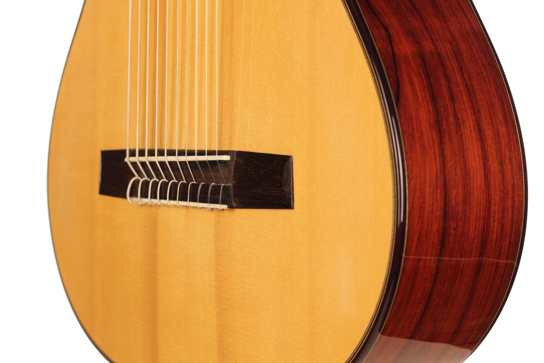 It has a fine spruce top with a reinforced fan bracing, designed to handle the 10 strings’ tension and to simultaneously allow a great freedom in the top’s vibration. The trebles are brilliant and crystal-clear, perfectly contrasting with the massive, voluminous basses. It is a very interesting instrument for an adventurous six strings player in need for challenge or an accomplished 10-strings player looking for a top-quality instrument. A hard-shell case is included.