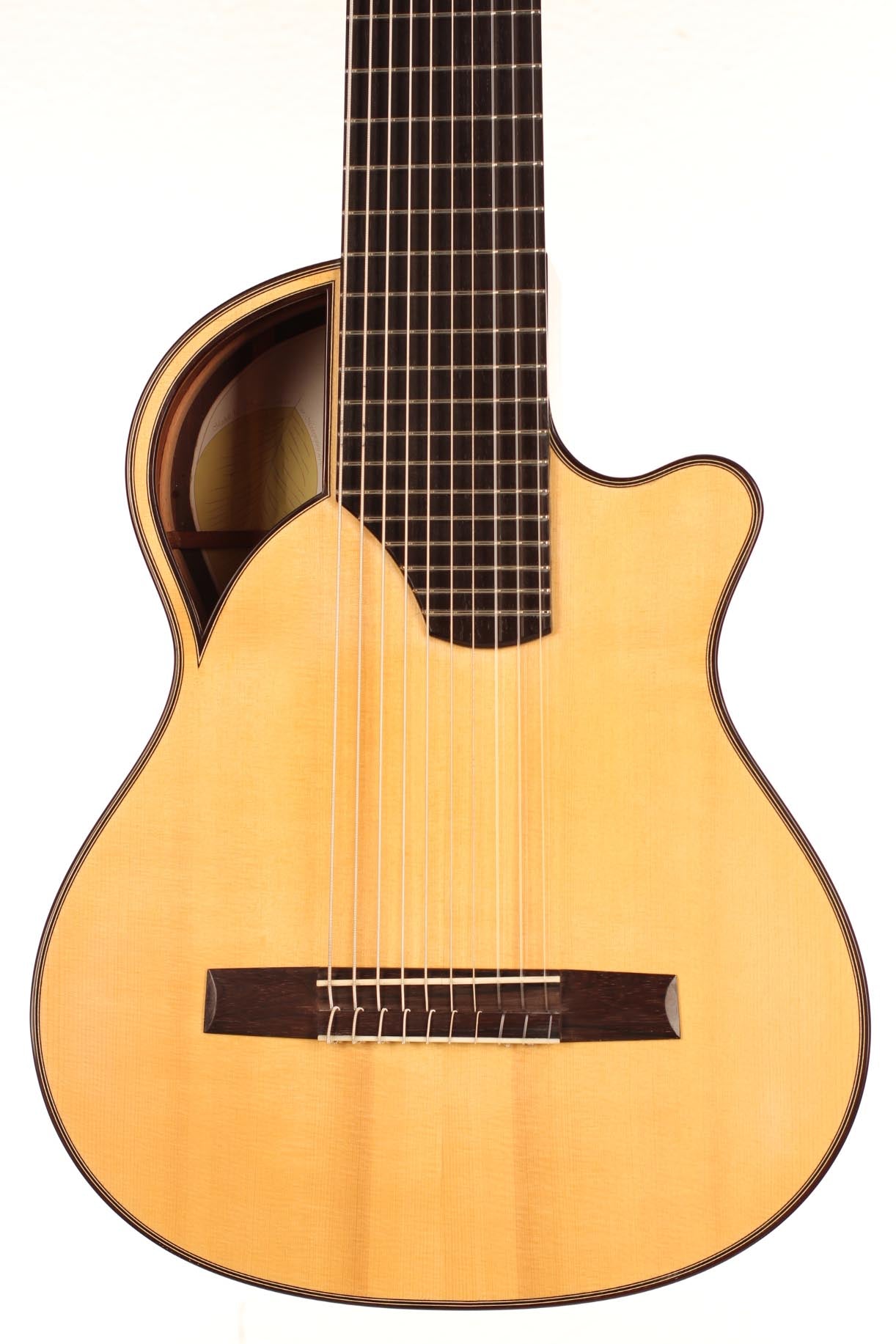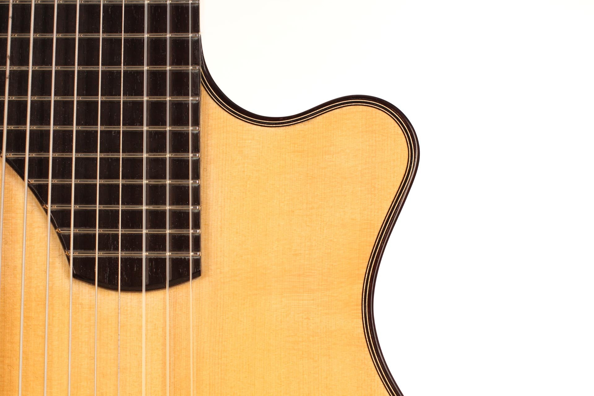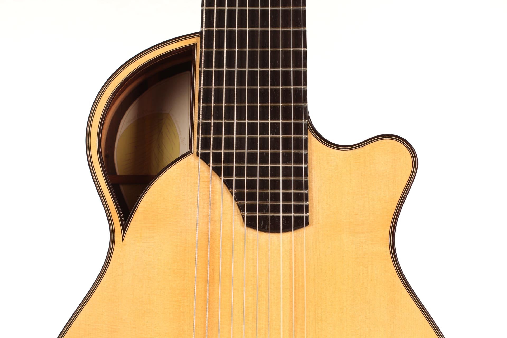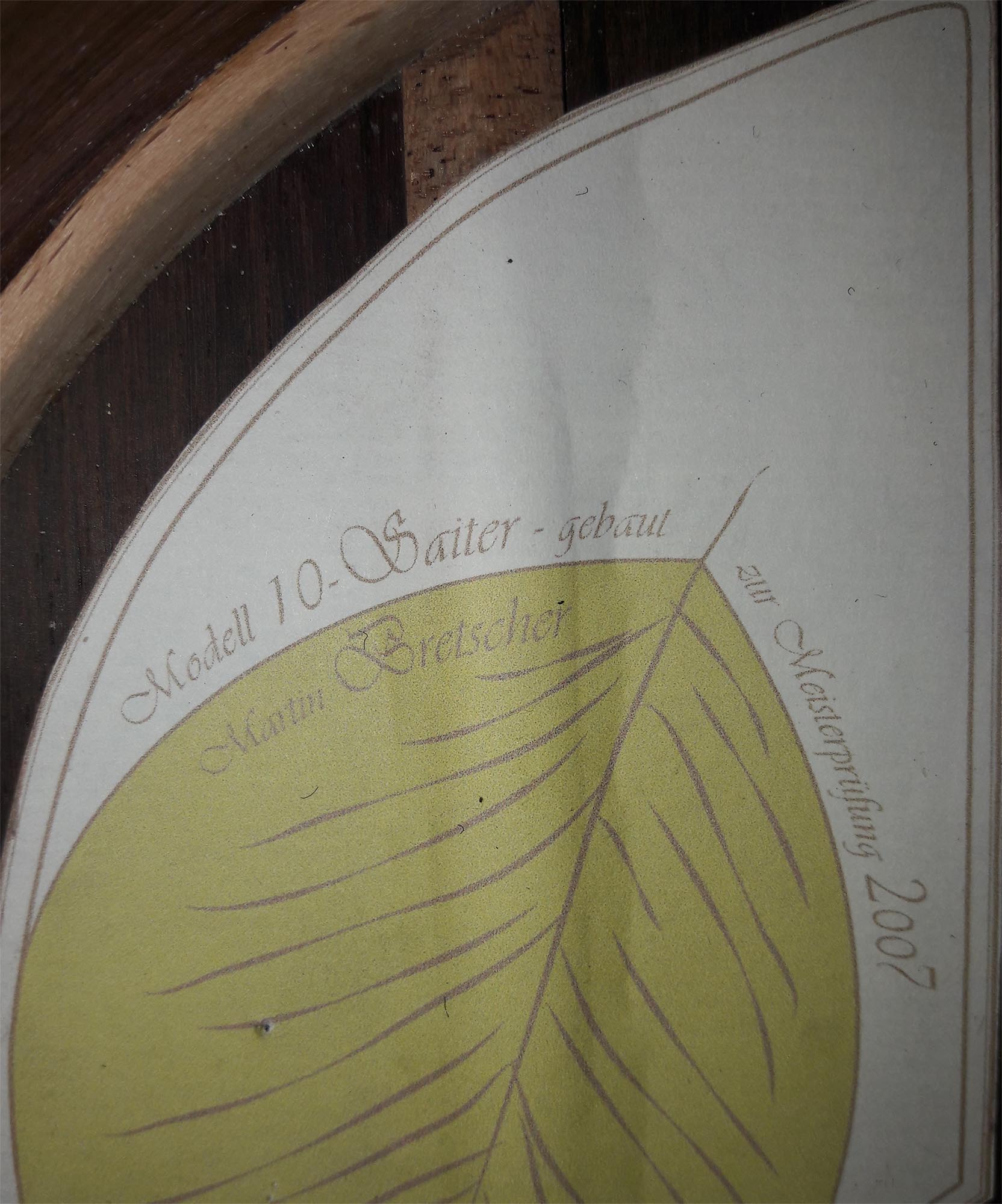 This guitar was built by Martin Bretscher in 2007 on the occasion of his Master examination. The Master examination, “Meister” in German, is a very important step in a luthier’s career and a real achievement. This ten-string guitar is showing incredible technical, aesthetic and acoustic qualities.