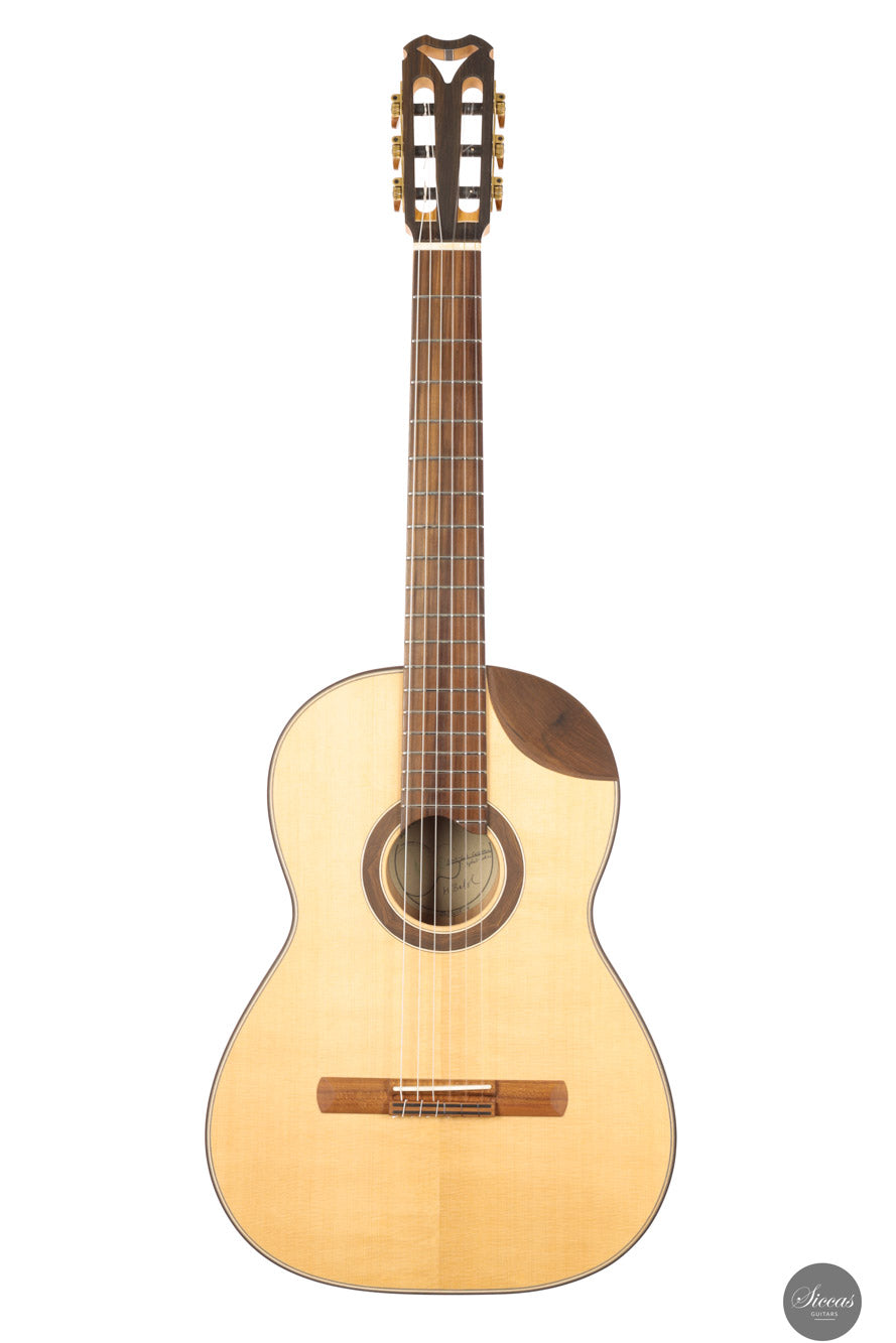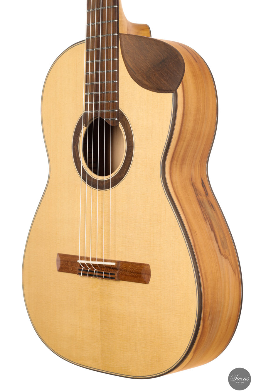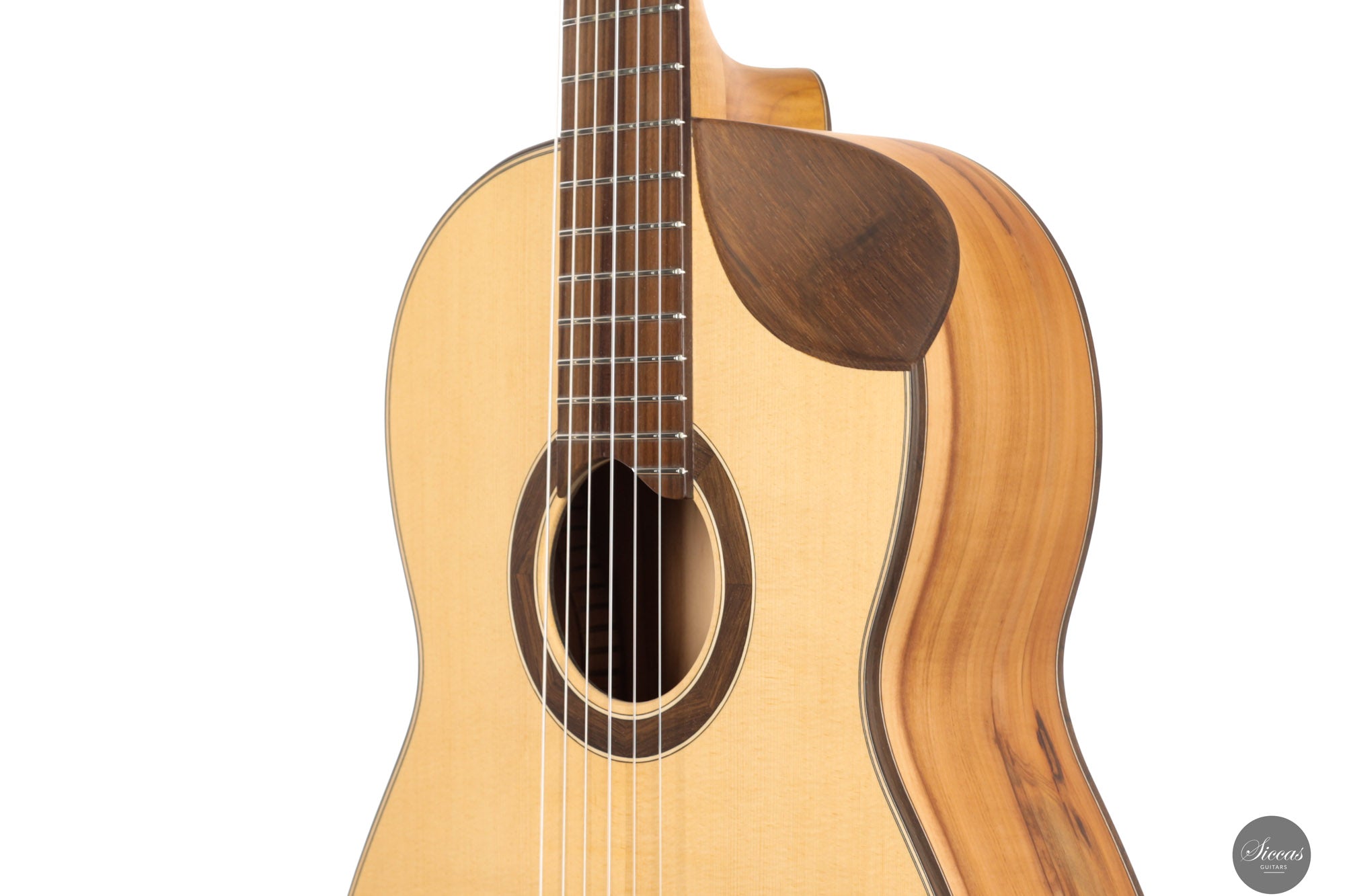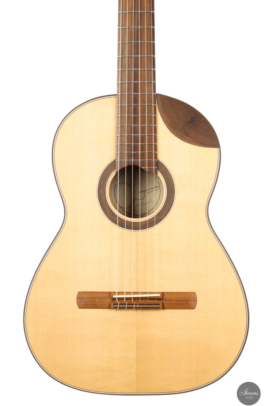 Das Modell Small Soul Lattice aus dem Jahr 2025 ist eine kompakte Konzertgitarre, die speziell für Gitarristinnen und Gitarristen entwickelt wurde, die besonderen Wert auf Komfort beim Spiel legen. Gefertigt in traditioneller spanischer Bauweise, verfügt sie über eine Fichtendecke und Boden sowie Zargen aus Apfelholz. Die Lattice-Beleistung mit einer besonders dünnen Decke (1,4 mm im Schwingungsfeld unter dem Steg) sorgt für eine schnelle Ansprache, präzise Tonentwicklung und eine sehr gute Trennschärfe – ideal für virtuose Passagen und klare Artikulation.