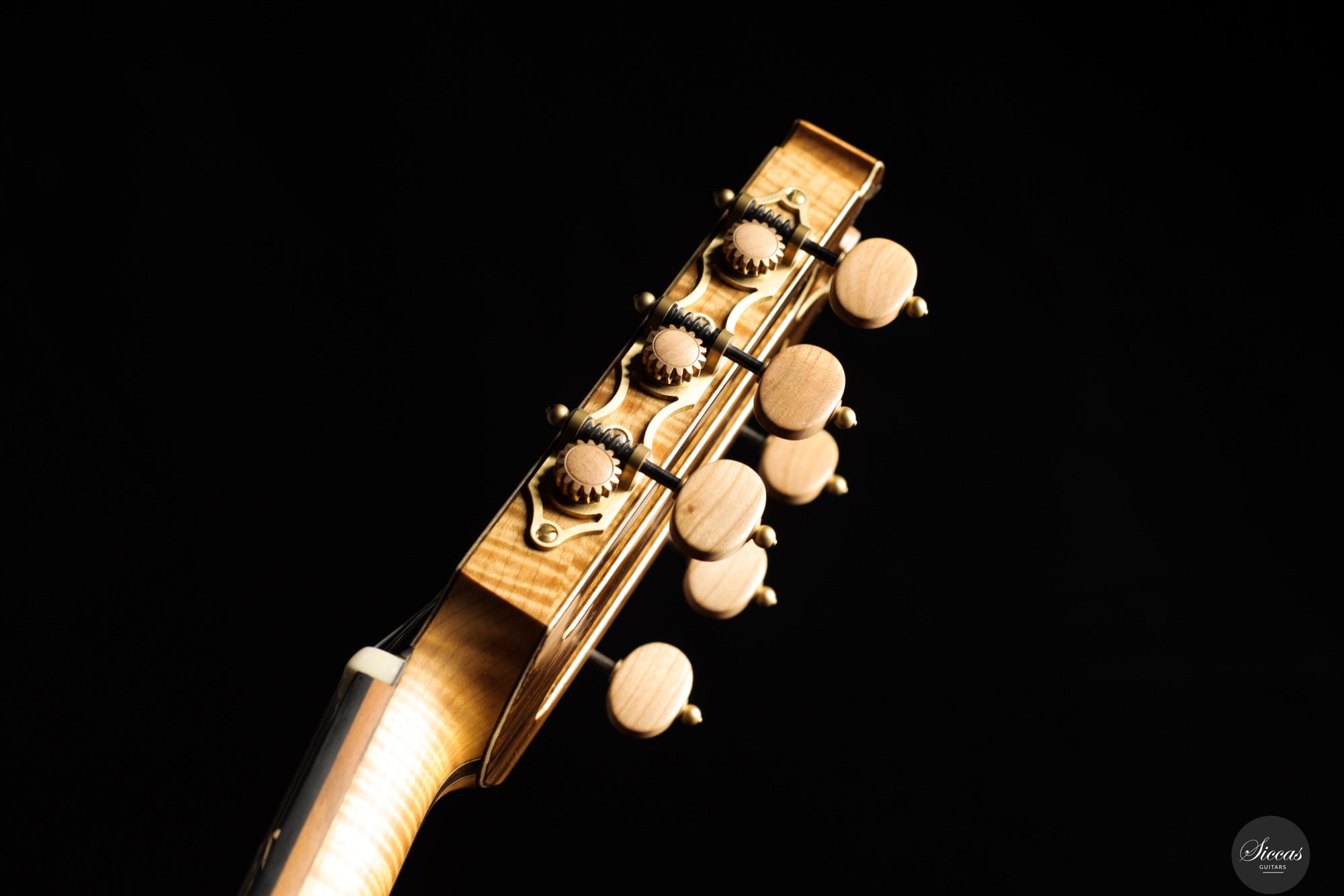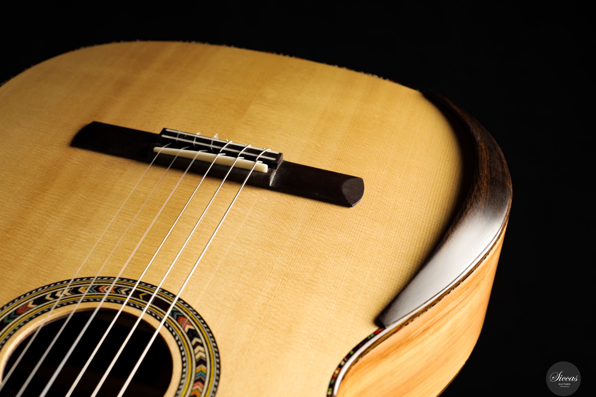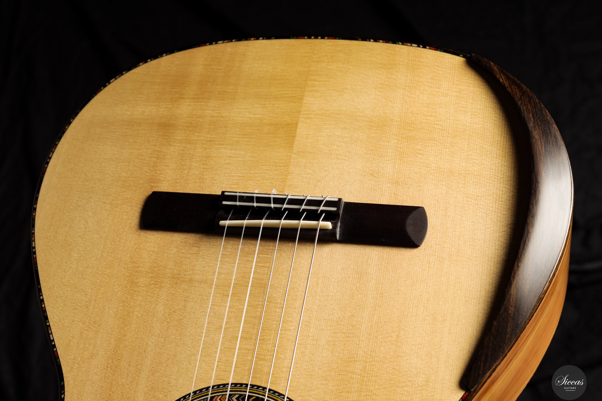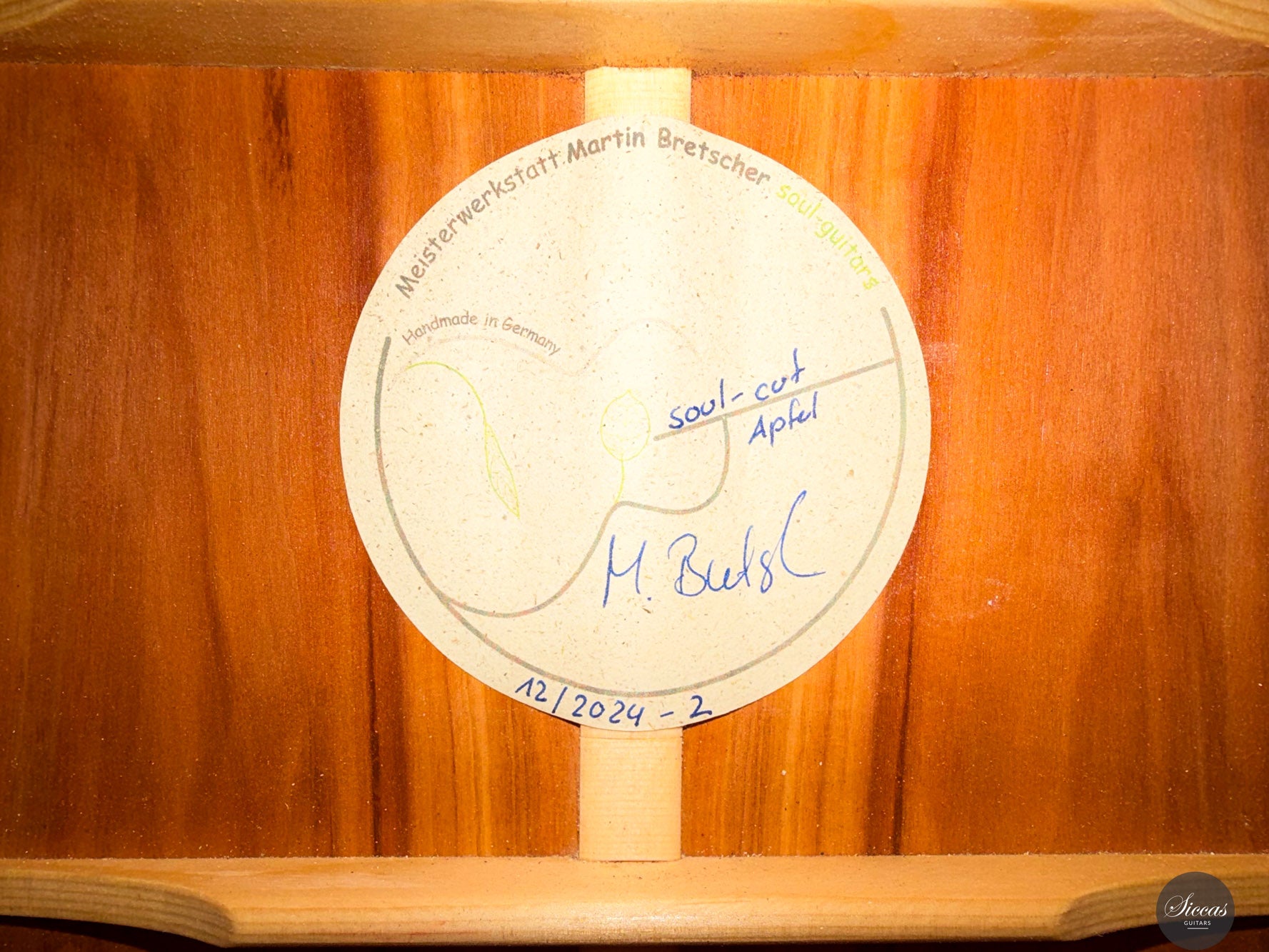 Dieses Soul Cut Modell aus dem Jahr 2025 ist eine Konzertgitarre mit Lattice Bracing und spiegelt Martin Bretschers zeitgemäßen Zugang zu Klang und Spielbarkeit wider. Die Fichtendecke wird mit Boden und Zargen aus Apfelholz kombiniert und vollständig in Schellack poliert. Das Ergebnis ist ein leichtes, strukturell effizientes Instrument, dessen Decke frei schwingen kann und dennoch kontrolliert geführt wird.