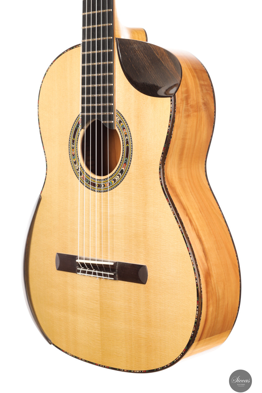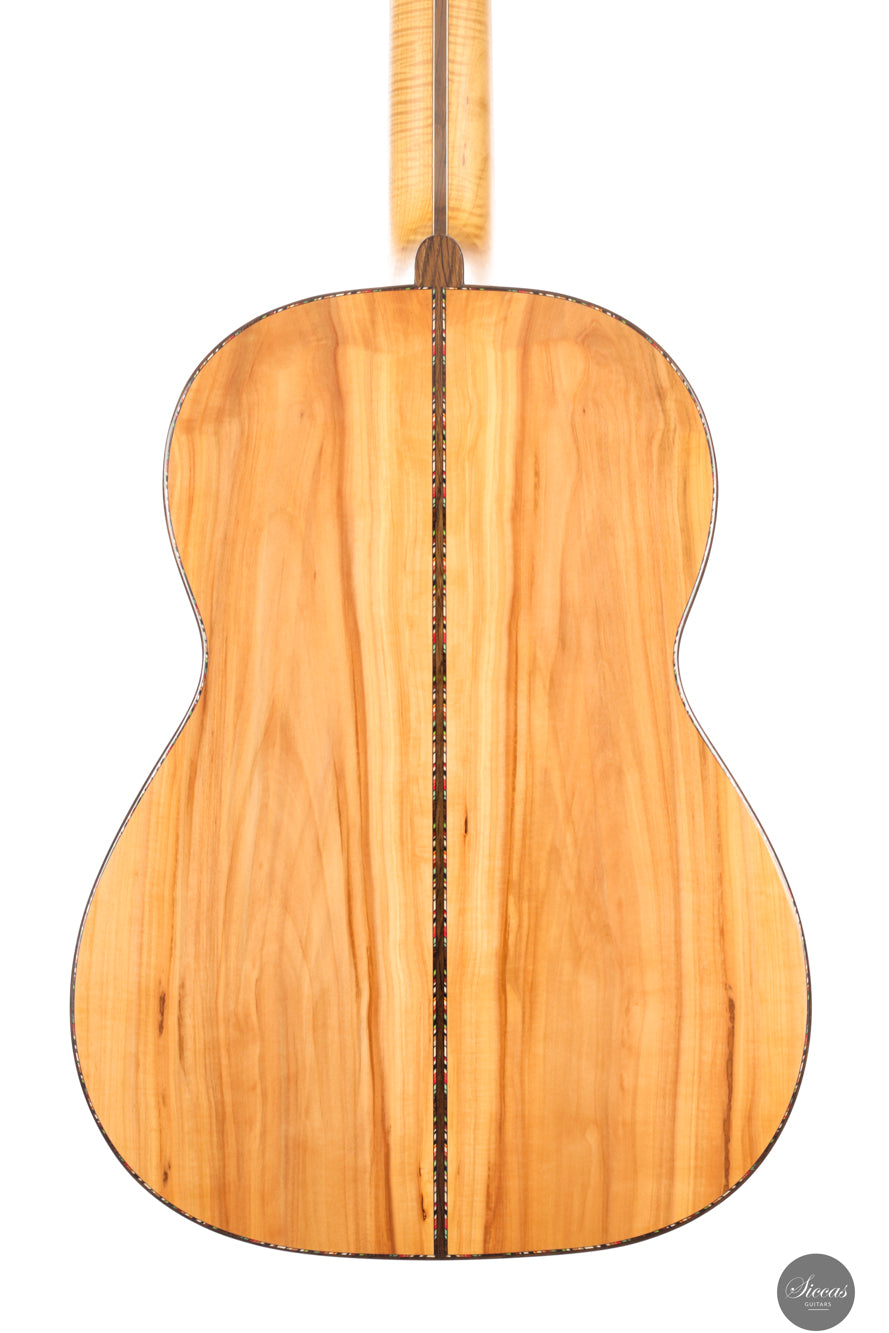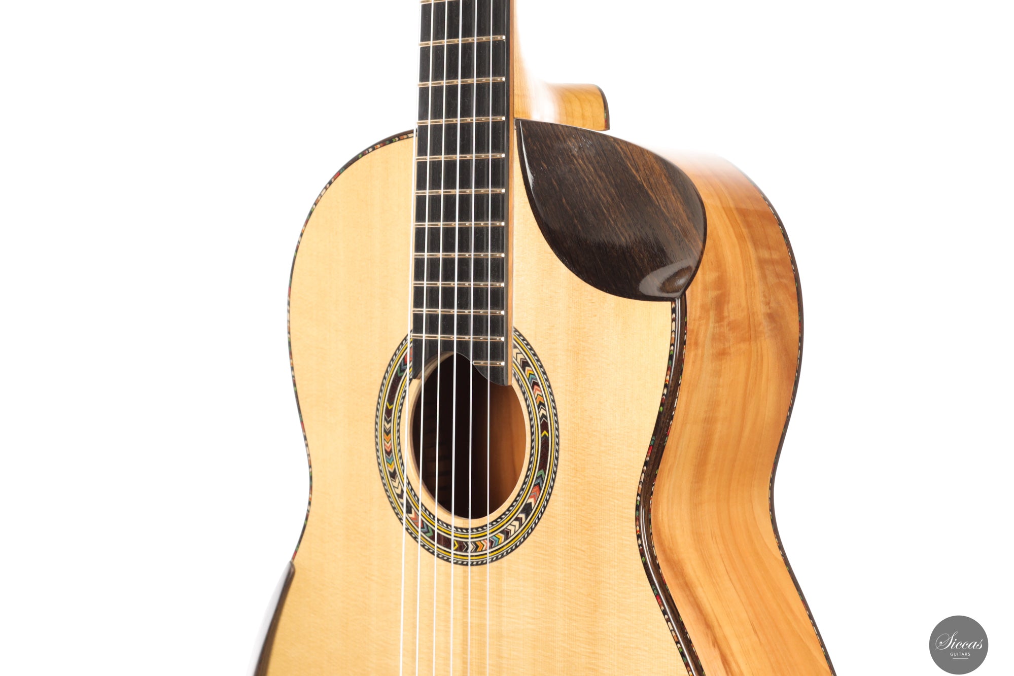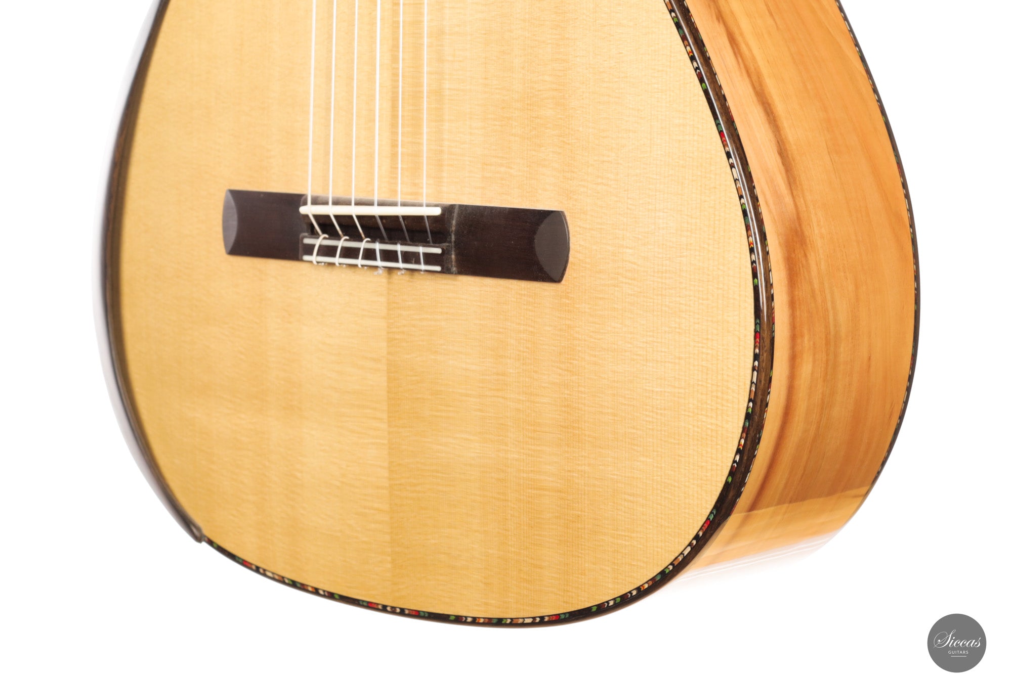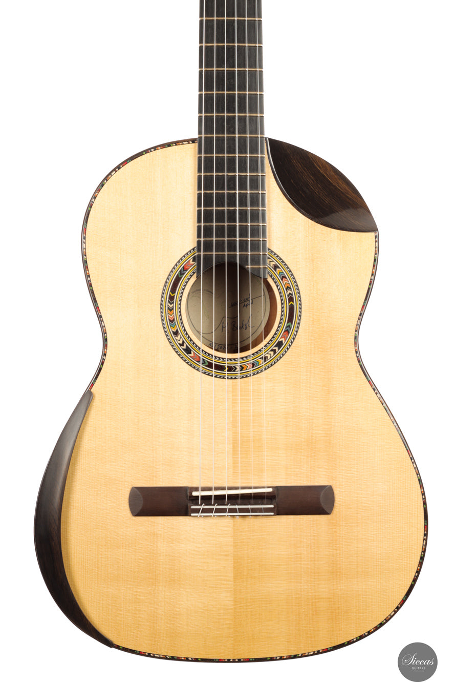 Dieses Soul Cut Modell aus dem Jahr 2025 ist eine Konzertgitarre mit Lattice Bracing und spiegelt Martin Bretschers zeitgemäßen Zugang zu Klang und Spielbarkeit wider. Die Fichtendecke wird mit Boden und Zargen aus Apfelholz kombiniert und vollständig in Schellack poliert. Das Ergebnis ist ein leichtes, strukturell effizientes Instrument, dessen Decke frei schwingen kann und dennoch kontrolliert geführt wird.