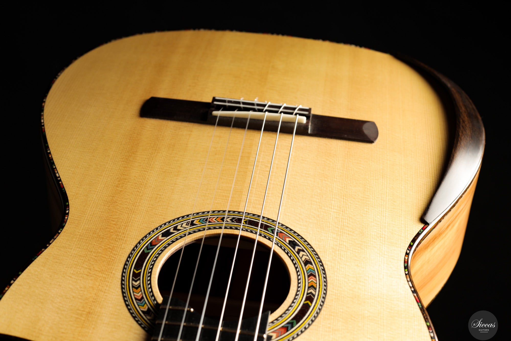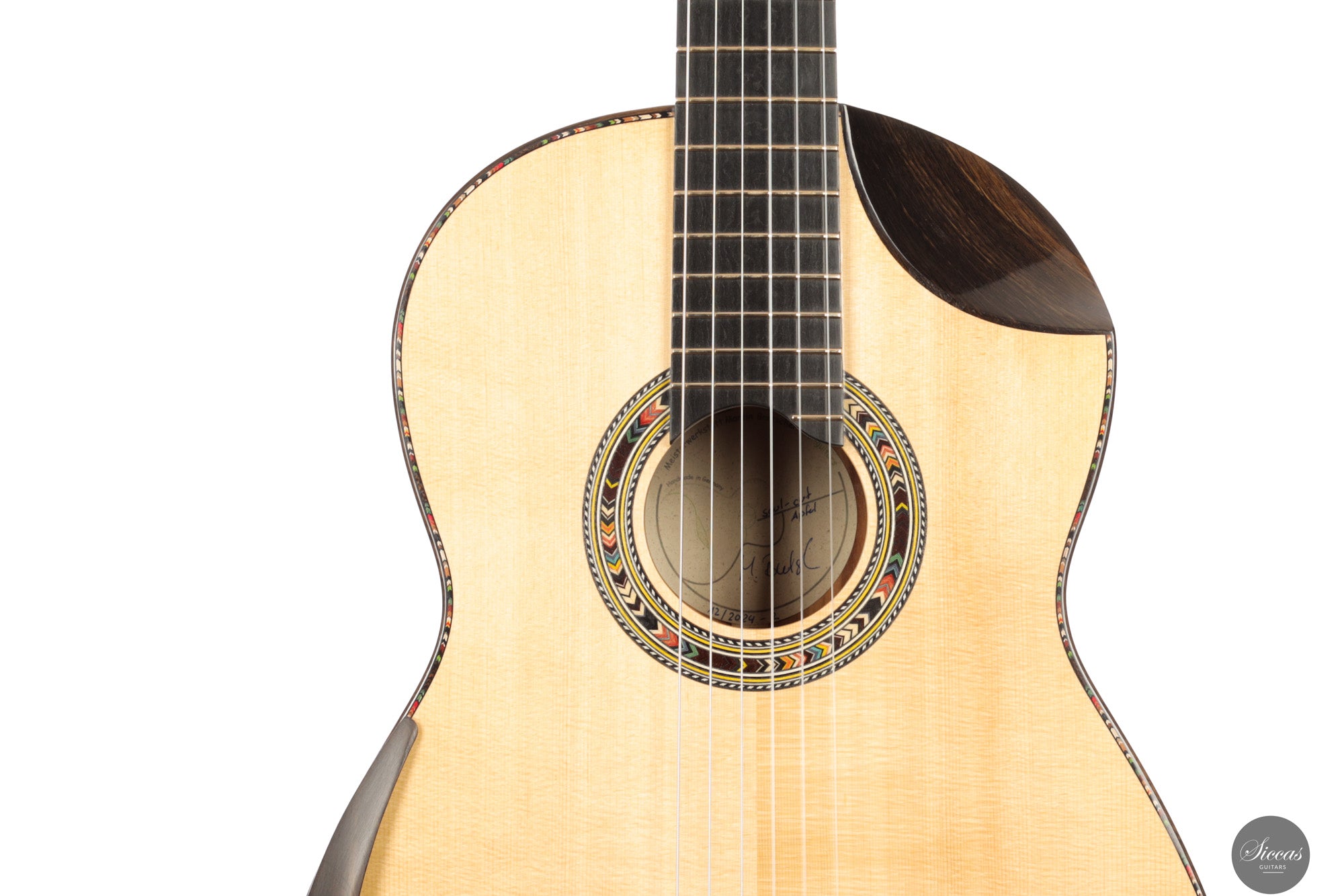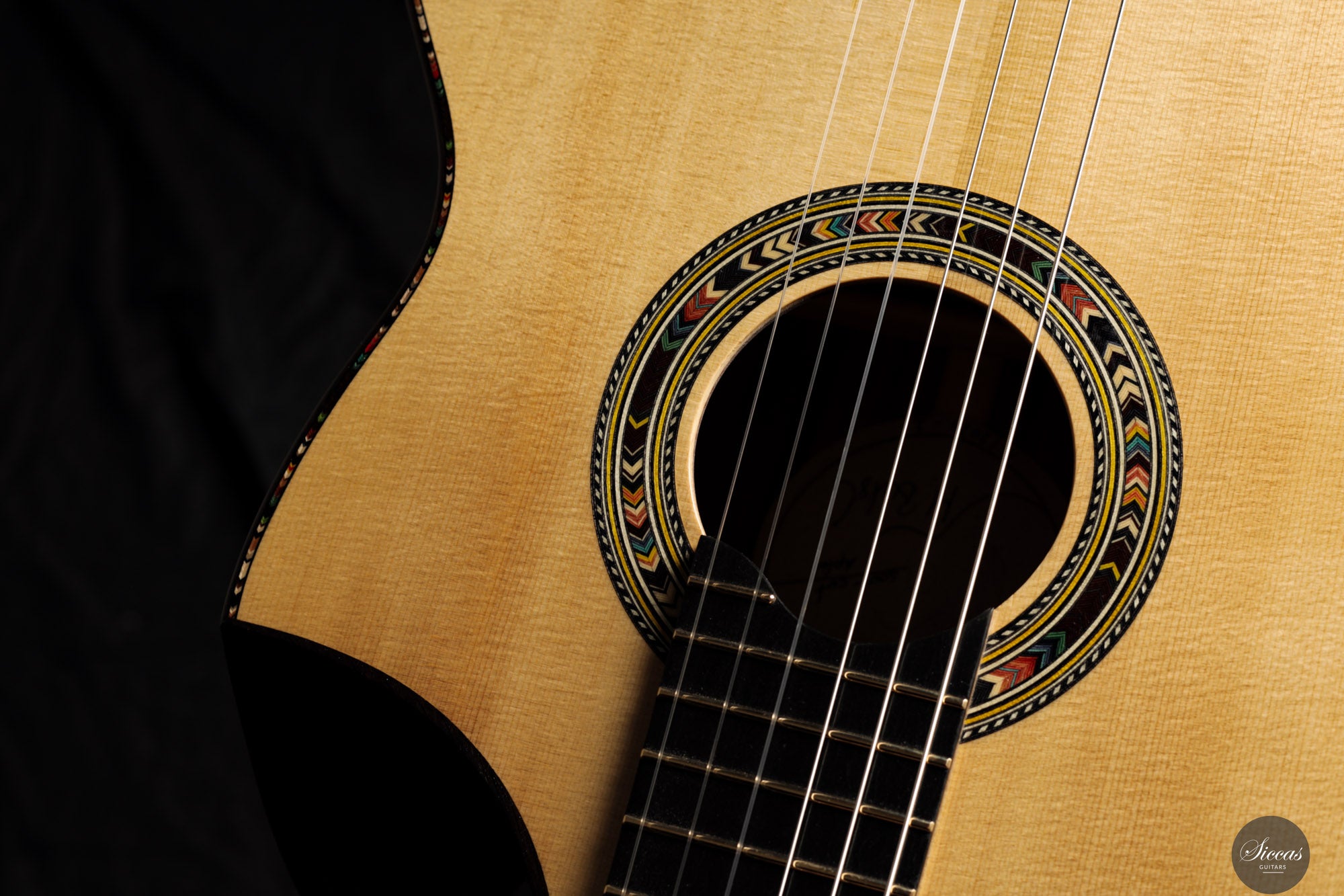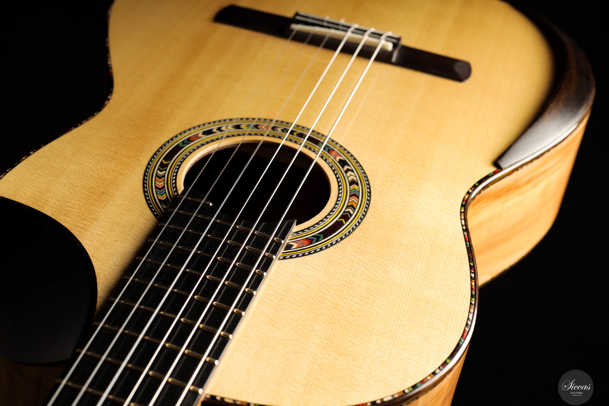Klanglich zeigt sich die Gitarre weich, rund und sehr angenehm, mit einer gleichmäßigen Ansprache über alle Register hinweg. Die Balance ist ausgesprochen stabil, sodass jede Saite mit gleicher Präsenz und Intensität wahrgenommen wird. Die Töne sprechen mühelos an und werden von einem klaren, gleichmäßigen Nachklang getragen. Die Gitarre reagiert schnell und offen, was dynamische Abstufungen und flüssige Passagen besonders leicht zugänglich macht. Trotz der modernen Bauweise bleibt der Klang geschlossen und ruhig und lädt zu differenzierter klanglicher Gestaltung ein.