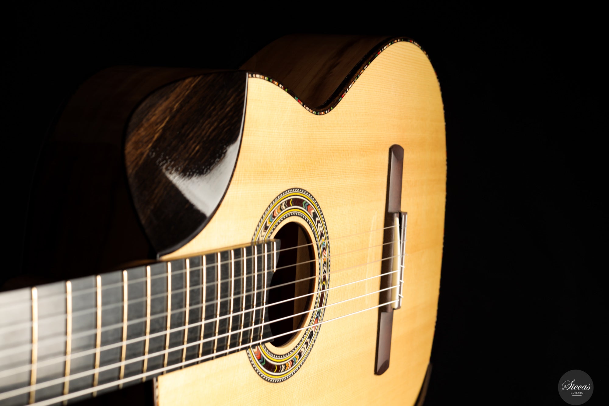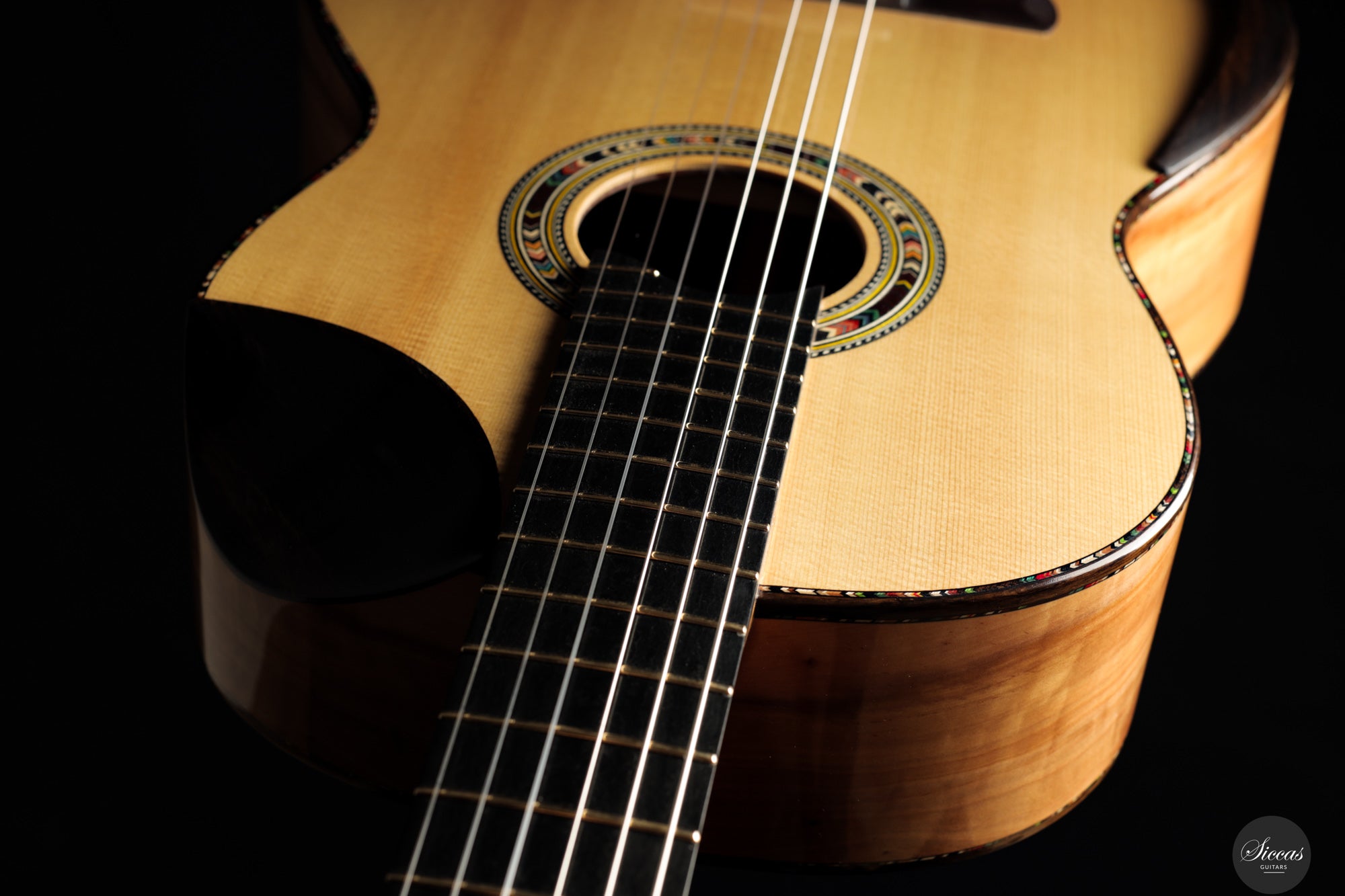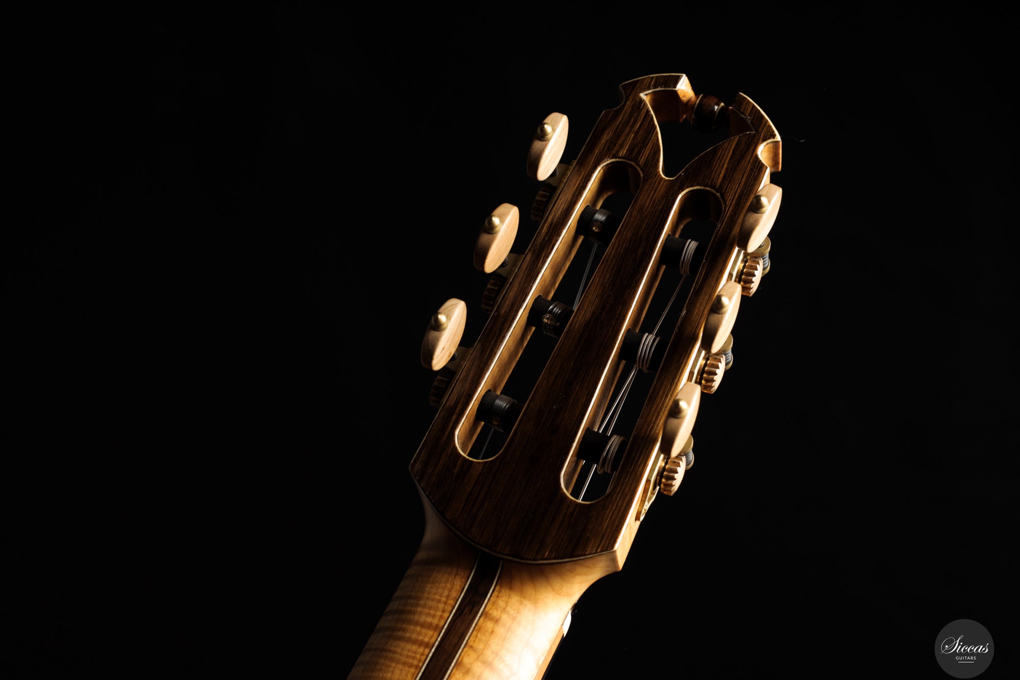 Klanglich zeigt sich die Gitarre weich, rund und sehr angenehm, mit einer gleichmäßigen Ansprache über alle Register hinweg. Die Balance ist ausgesprochen stabil, sodass jede Saite mit gleicher Präsenz und Intensität wahrgenommen wird. Die Töne sprechen mühelos an und werden von einem klaren, gleichmäßigen Nachklang getragen. Die Gitarre reagiert schnell und offen, was dynamische Abstufungen und flüssige Passagen besonders leicht zugänglich macht. Trotz der modernen Bauweise bleibt der Klang geschlossen und ruhig und lädt zu differenzierter klanglicher Gestaltung ein.