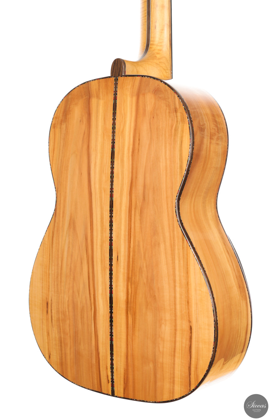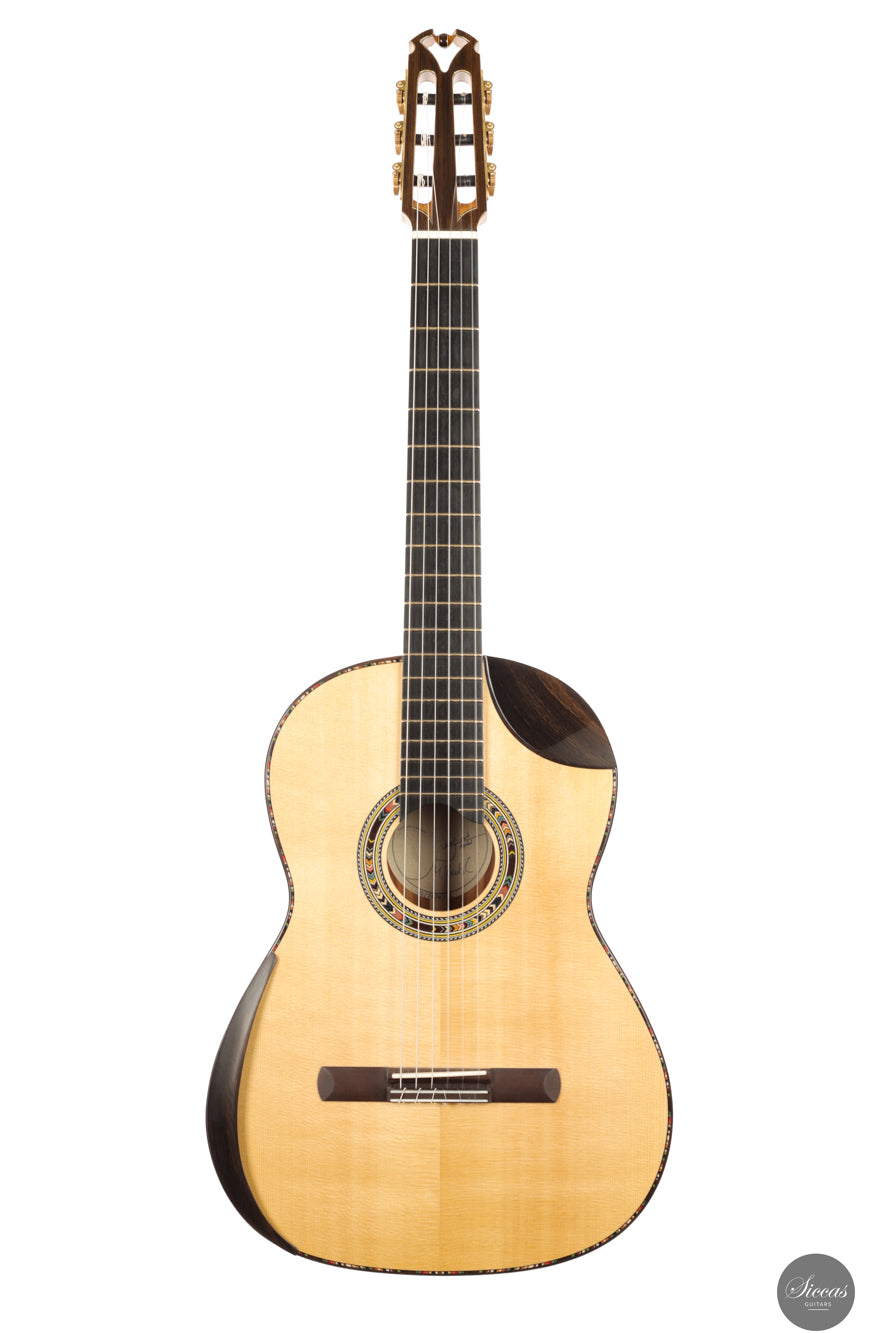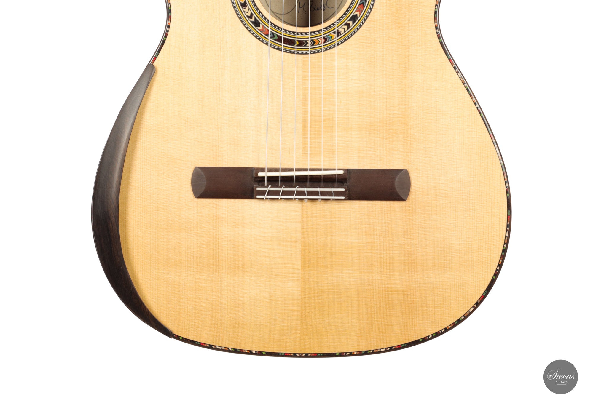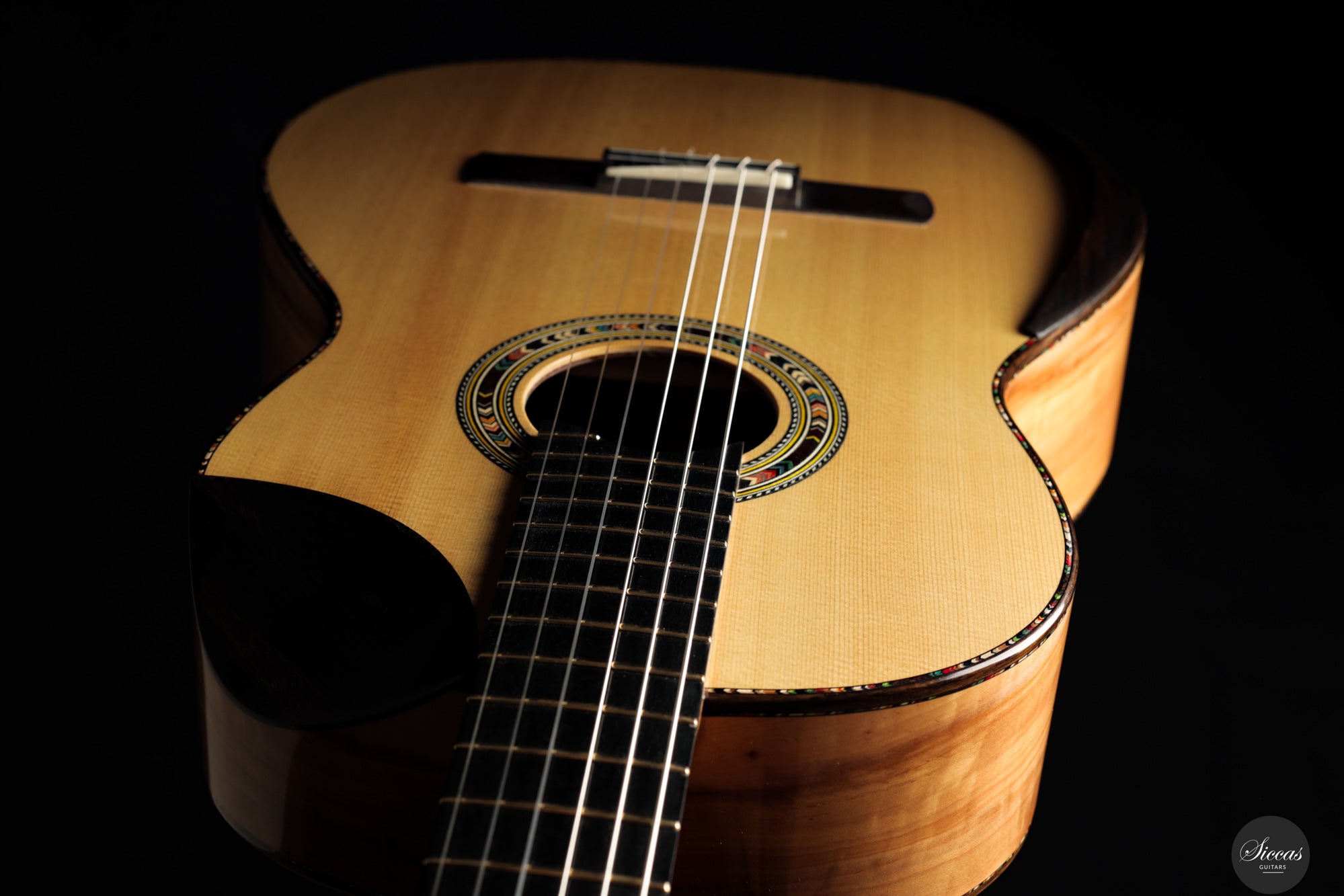 Klanglich zeigt sich die Gitarre weich, rund und sehr angenehm, mit einer gleichmäßigen Ansprache über alle Register hinweg. Die Balance ist ausgesprochen stabil, sodass jede Saite mit gleicher Präsenz und Intensität wahrgenommen wird. Die Töne sprechen mühelos an und werden von einem klaren, gleichmäßigen Nachklang getragen. Die Gitarre reagiert schnell und offen, was dynamische Abstufungen und flüssige Passagen besonders leicht zugänglich macht. Trotz der modernen Bauweise bleibt der Klang geschlossen und ruhig und lädt zu differenzierter klanglicher Gestaltung ein.