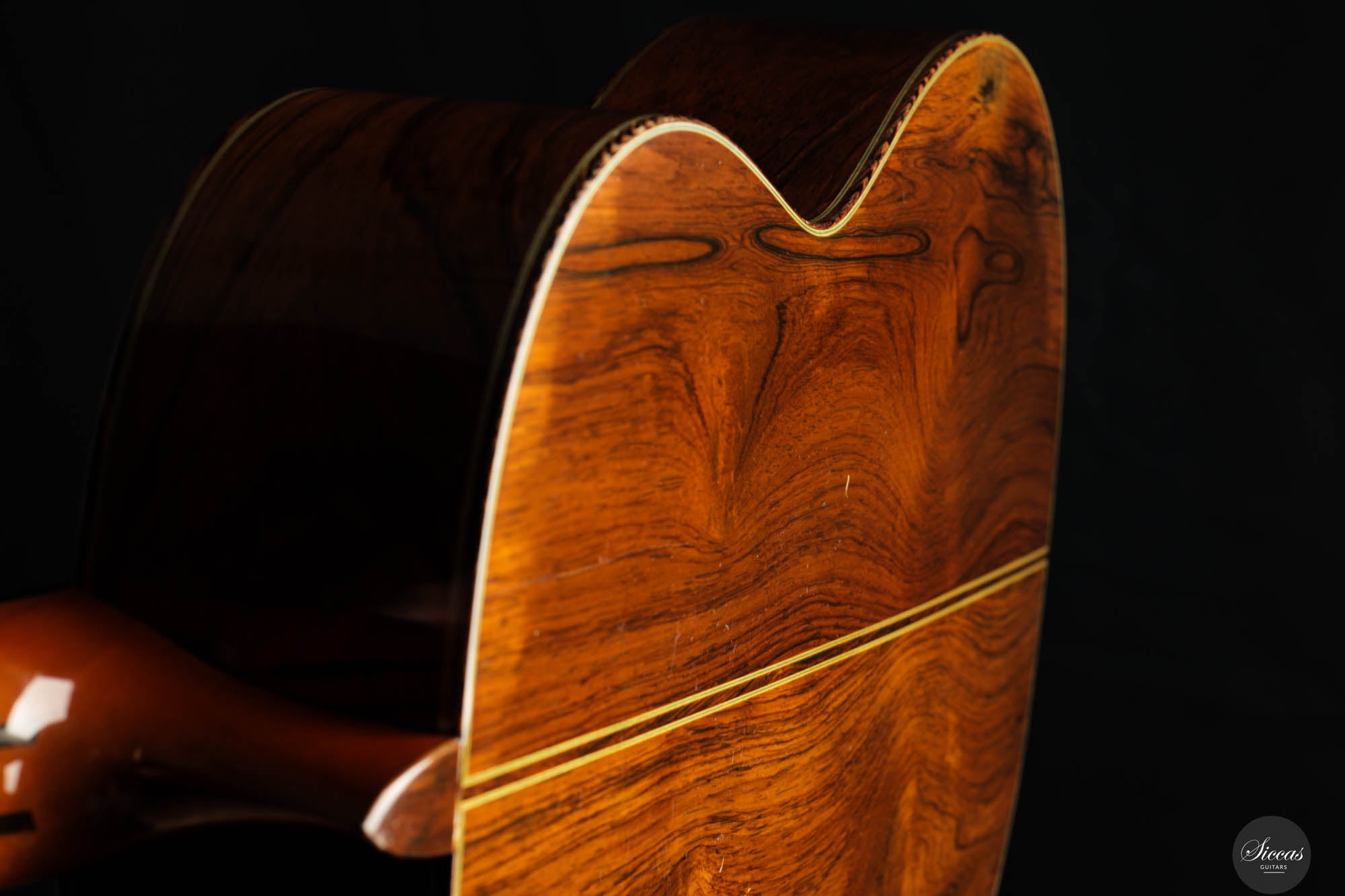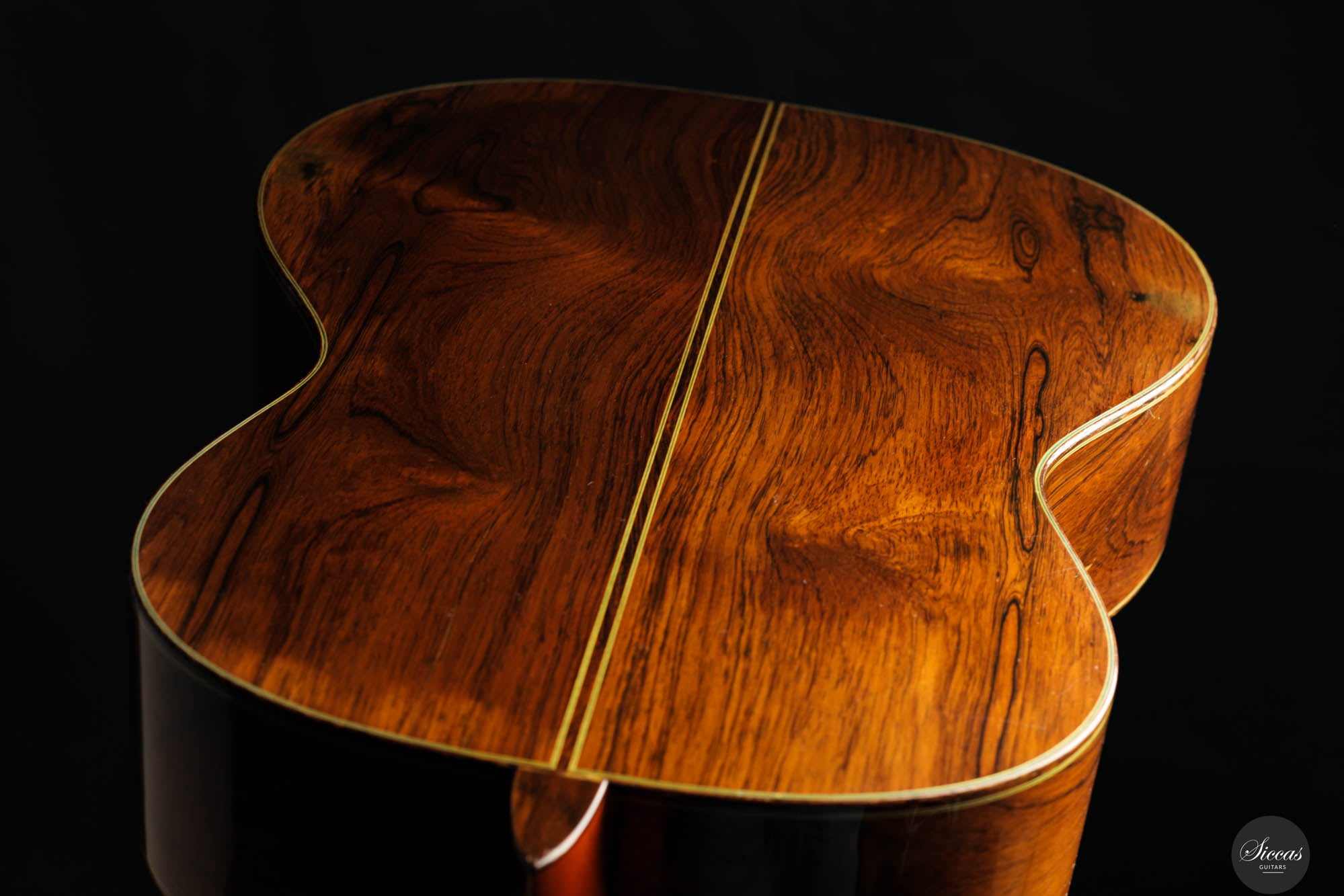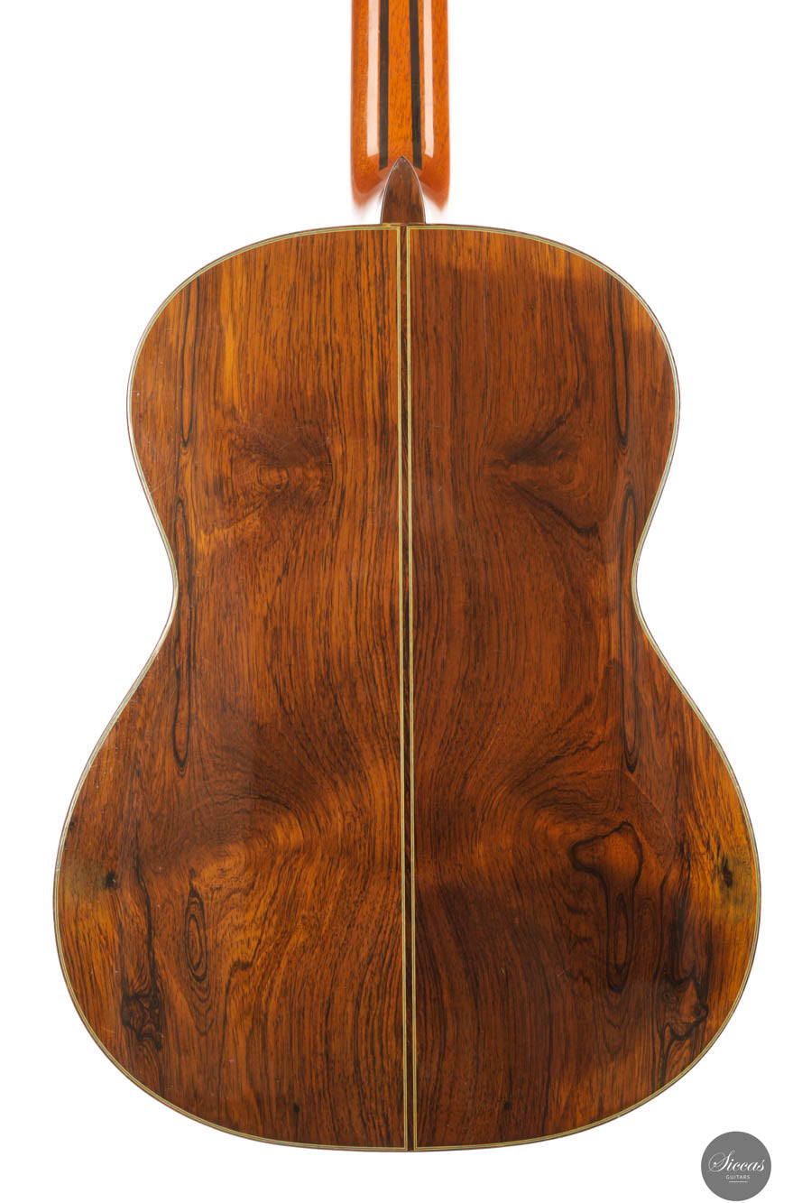 Diese Gitarre von Masaru Kohno aus dem Jahr 1976 ist ein außergewöhnliches Instrument. Es handelt sich um das Modell 15, das damals zweithöchste Modell, dessen Name sich an dem damaligen Listenpreis von 150.000 Yen orientiert. Sie verfügt über wunderschönes Rio-Palisanderholz (CITES-zertifiziert) mit einer besonders attraktiven Maserung, hochwertige Gotoh-Mechaniken aus den 1970er Jahren und eine schnell ansprechende Fichtendecke. Der Zustand ist sehr gut, mit gut erhaltenen oberflächlichen Spielspuren und einem honigfarbenen Cashew-Finish. Der Klang ist warm, offen und klavierähnlich, mit einem wundervollen Vintage-Touch und einer texturreichen Qualität, die unverwechselbar für japanische Gitarren dieser Epoche ist.