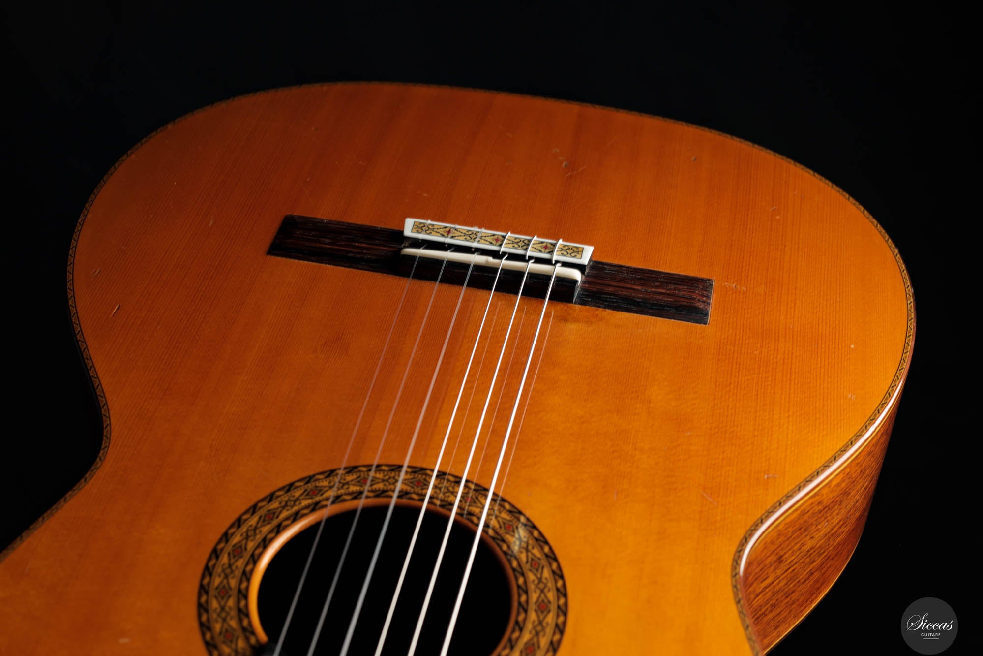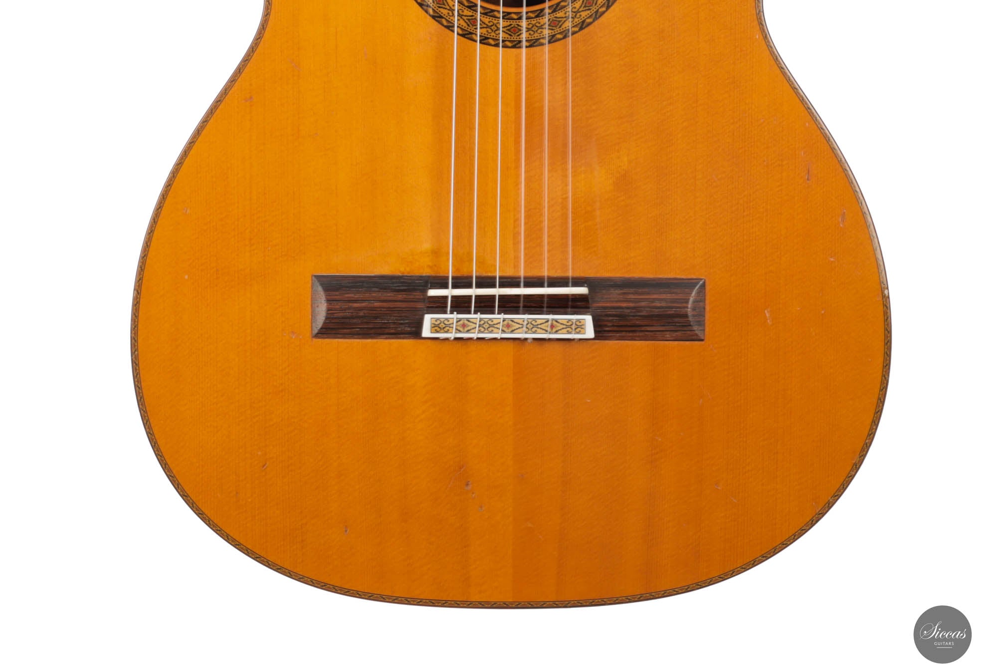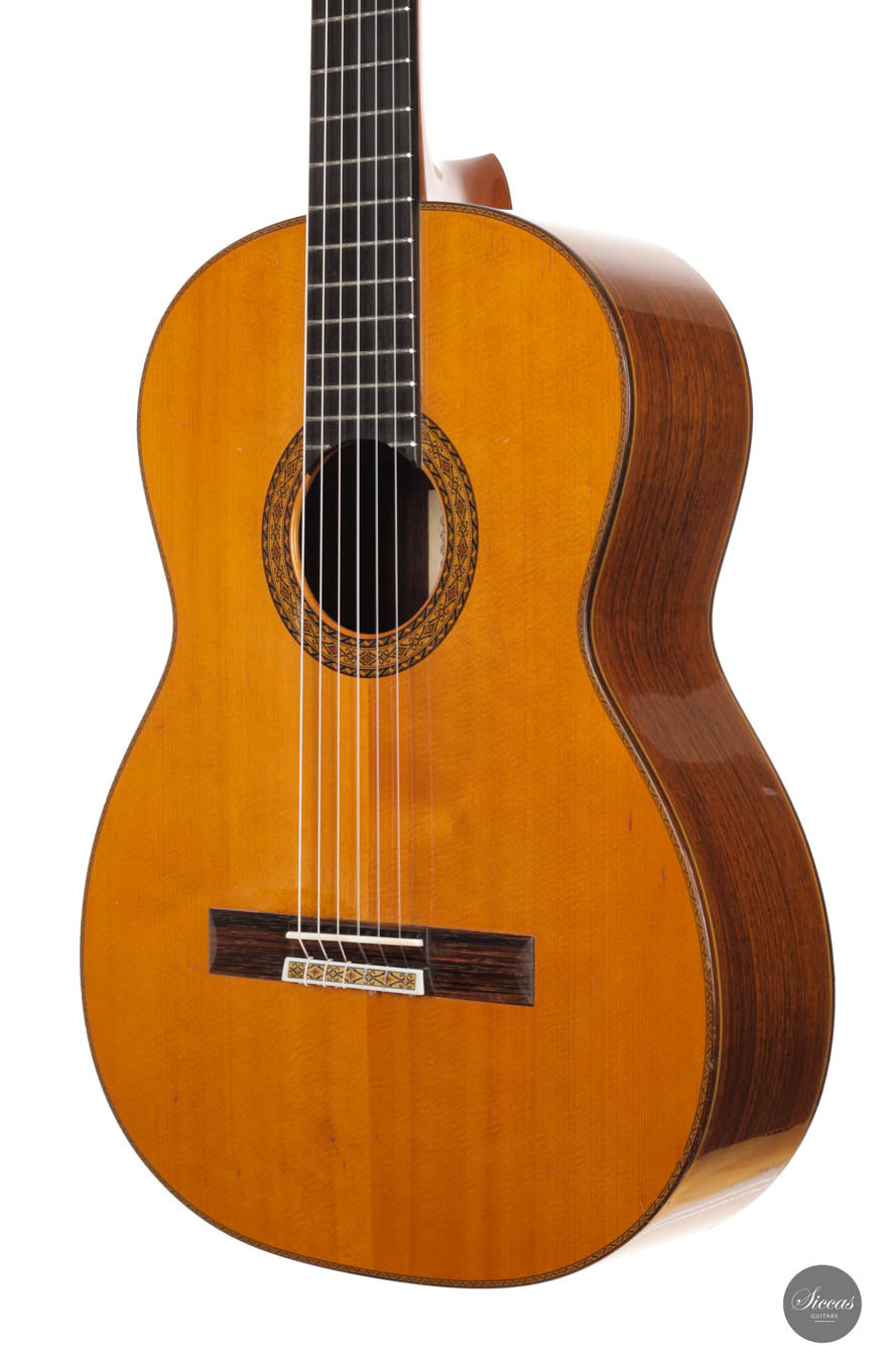 Nummerierungssystem für seine Modelle, das ursprünglich die Einzelhandelspreise in Japan widerspiegelte; zum Beispiel wurde eine Nr. 20 für 200.000 japanische Yen verkauft. Dieses System wurde jedoch aufgrund des Wirtschaftswachstums und der Inflation obsolet, was im Laufe der Jahre zu Unstimmigkeiten bei der Bezeichnung der Qualität der Modelle führte. Ab 1982 wurde die Bezeichnung Kohno ausschließlich den hochwertigsten Konzertgitarren zugeordnet, was dieses Instrument zu einem der ersten in dieser Reihe macht. Das Instrument ist mit Boden und Zargen aus indischem Palisander und einer Fichtendecke ausgestattet und verfügt über feine Details, hochwertige Mechaniken und eindrucksvolle handgearbeitete Randeinlagen um das Schallloch und die Zargen. Trotz einiger Gebrauchsspuren befindet sich die Gitarre in einem sehr guten Zustand und weist keinerlei Risse oder strukturelle Probleme auf. Außerdem wurde der Sechs-Loch-Steg auf zwölf Löcher erweitert, um den Saitenwechsel zu erleichtern. Der typische Kohno-Klang - klar, holzig und etwas dunkel für ein Fichtenmodell - macht die Gitarre zu einer erstklassigen Wahl für anspruchsvolle Gitarristen.