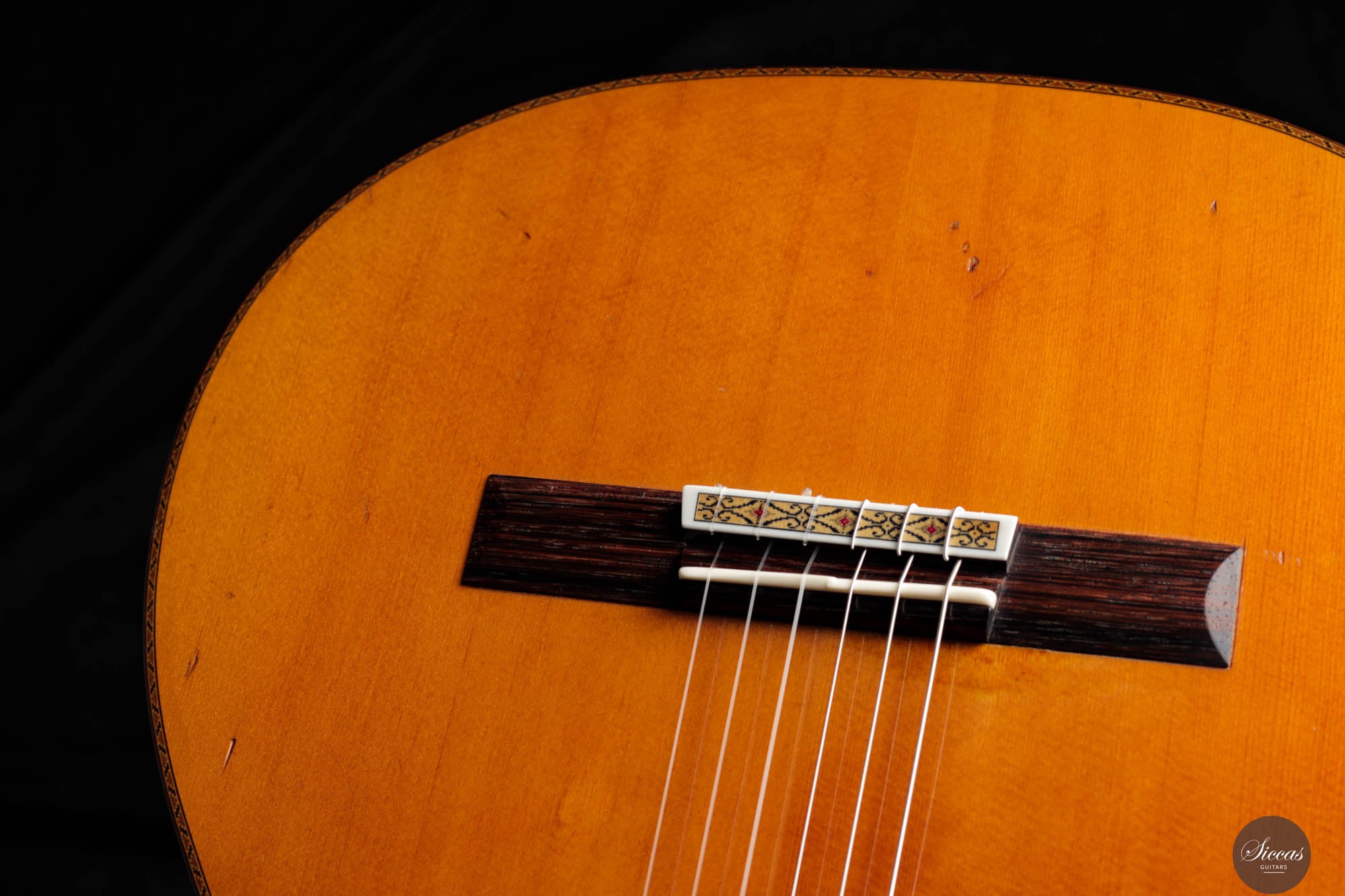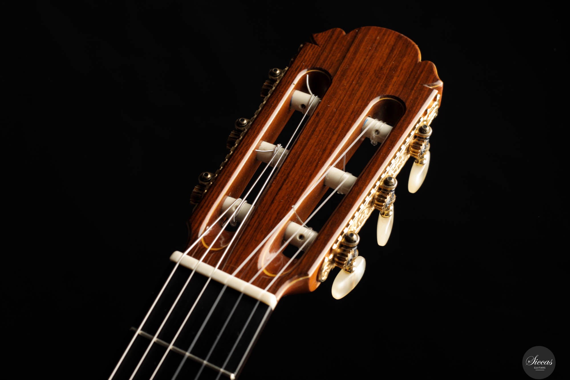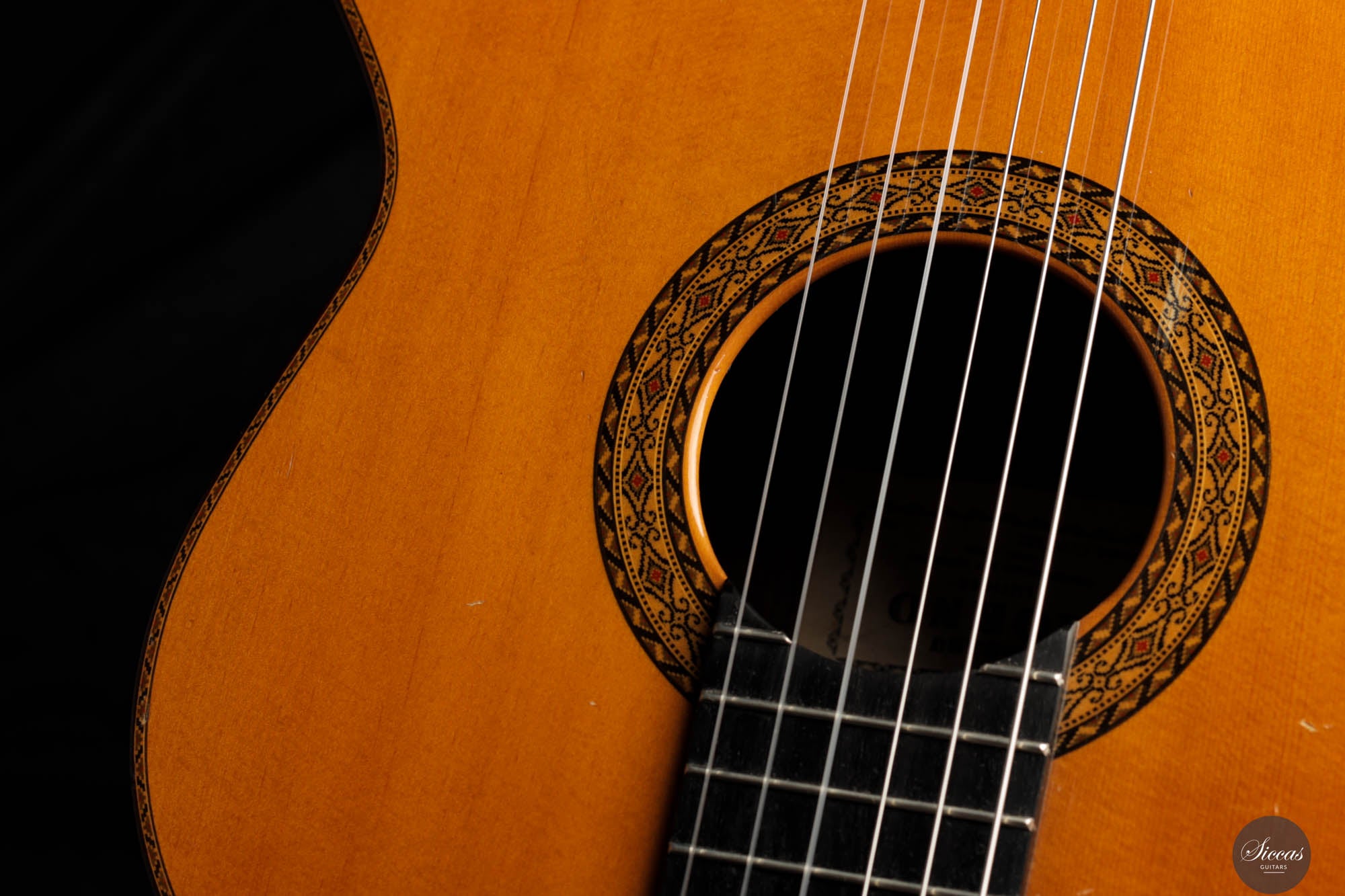 Nummerierungssystem für seine Modelle, das ursprünglich die Einzelhandelspreise in Japan widerspiegelte; zum Beispiel wurde eine Nr. 20 für 200.000 japanische Yen verkauft. Dieses System wurde jedoch aufgrund des Wirtschaftswachstums und der Inflation obsolet, was im Laufe der Jahre zu Unstimmigkeiten bei der Bezeichnung der Qualität der Modelle führte. Ab 1982 wurde die Bezeichnung Kohno ausschließlich den hochwertigsten Konzertgitarren zugeordnet, was dieses Instrument zu einem der ersten in dieser Reihe macht. Das Instrument ist mit Boden und Zargen aus indischem Palisander und einer Fichtendecke ausgestattet und verfügt über feine Details, hochwertige Mechaniken und eindrucksvolle handgearbeitete Randeinlagen um das Schallloch und die Zargen. Trotz einiger Gebrauchsspuren befindet sich die Gitarre in einem sehr guten Zustand und weist keinerlei Risse oder strukturelle Probleme auf. Außerdem wurde der Sechs-Loch-Steg auf zwölf Löcher erweitert, um den Saitenwechsel zu erleichtern. Der typische Kohno-Klang - klar, holzig und etwas dunkel für ein Fichtenmodell - macht die Gitarre zu einer erstklassigen Wahl für anspruchsvolle Gitarristen.