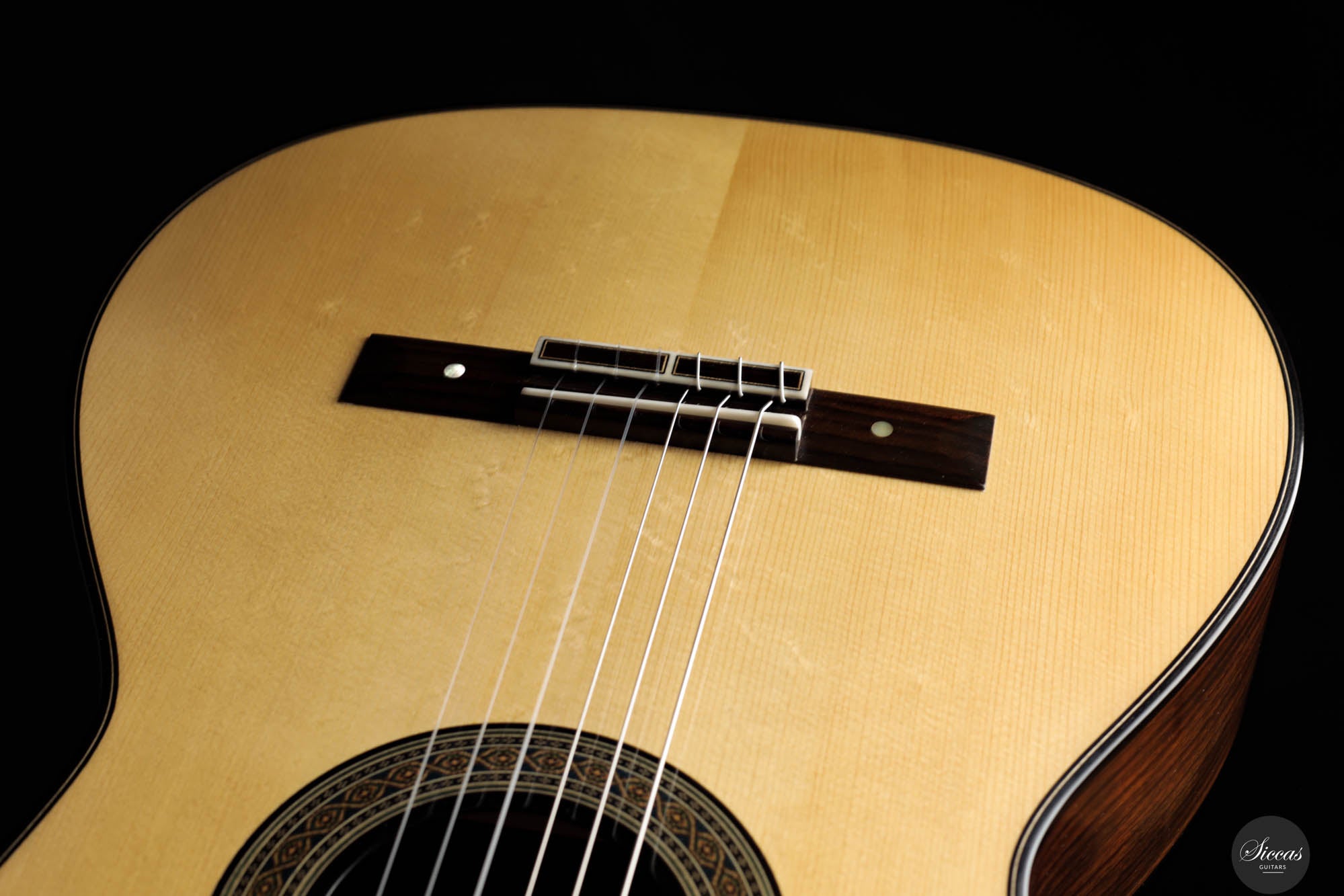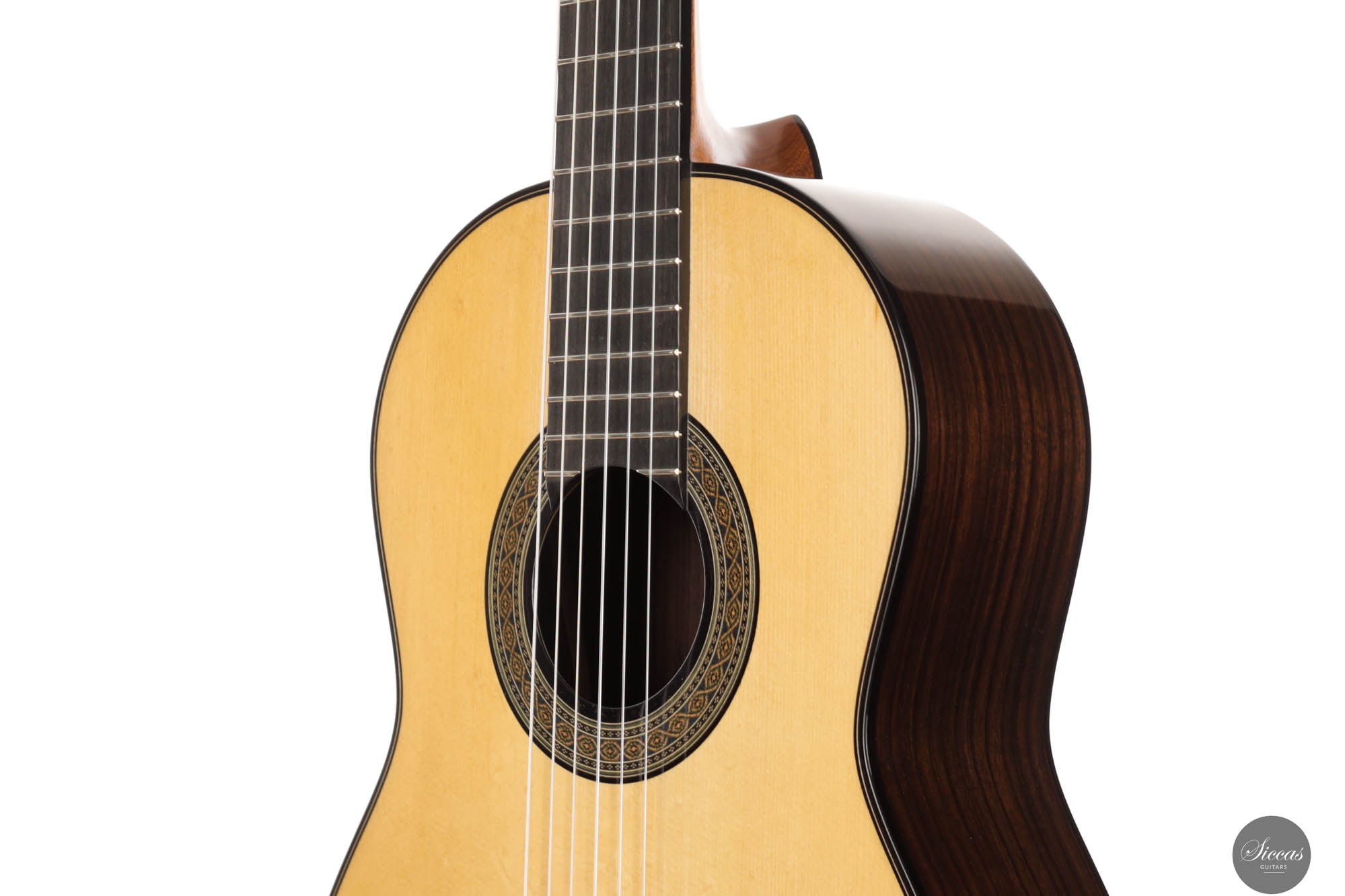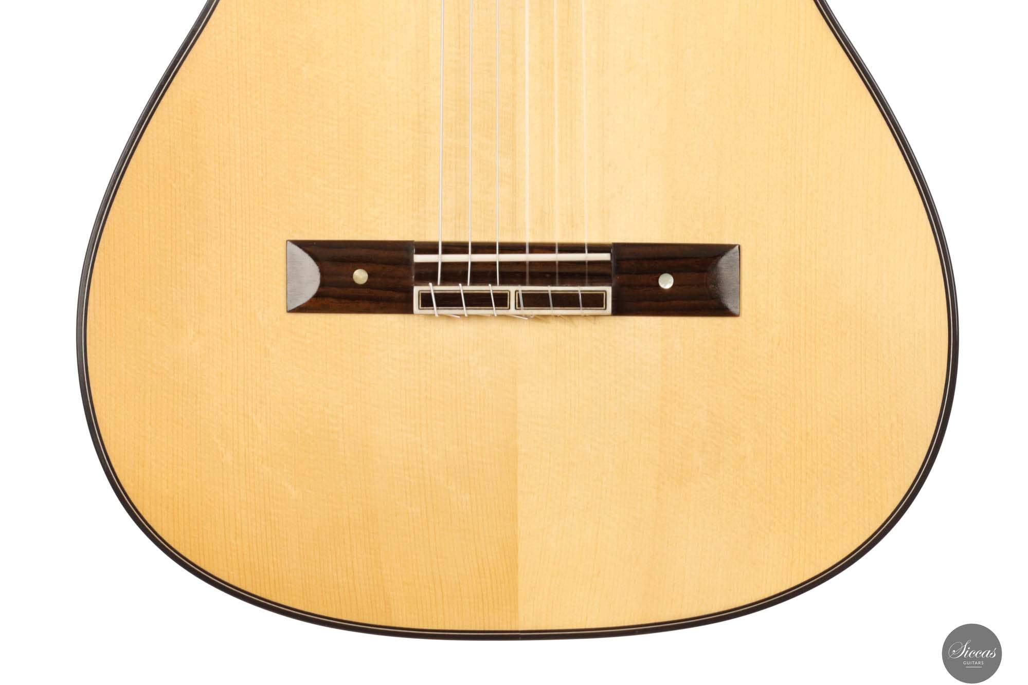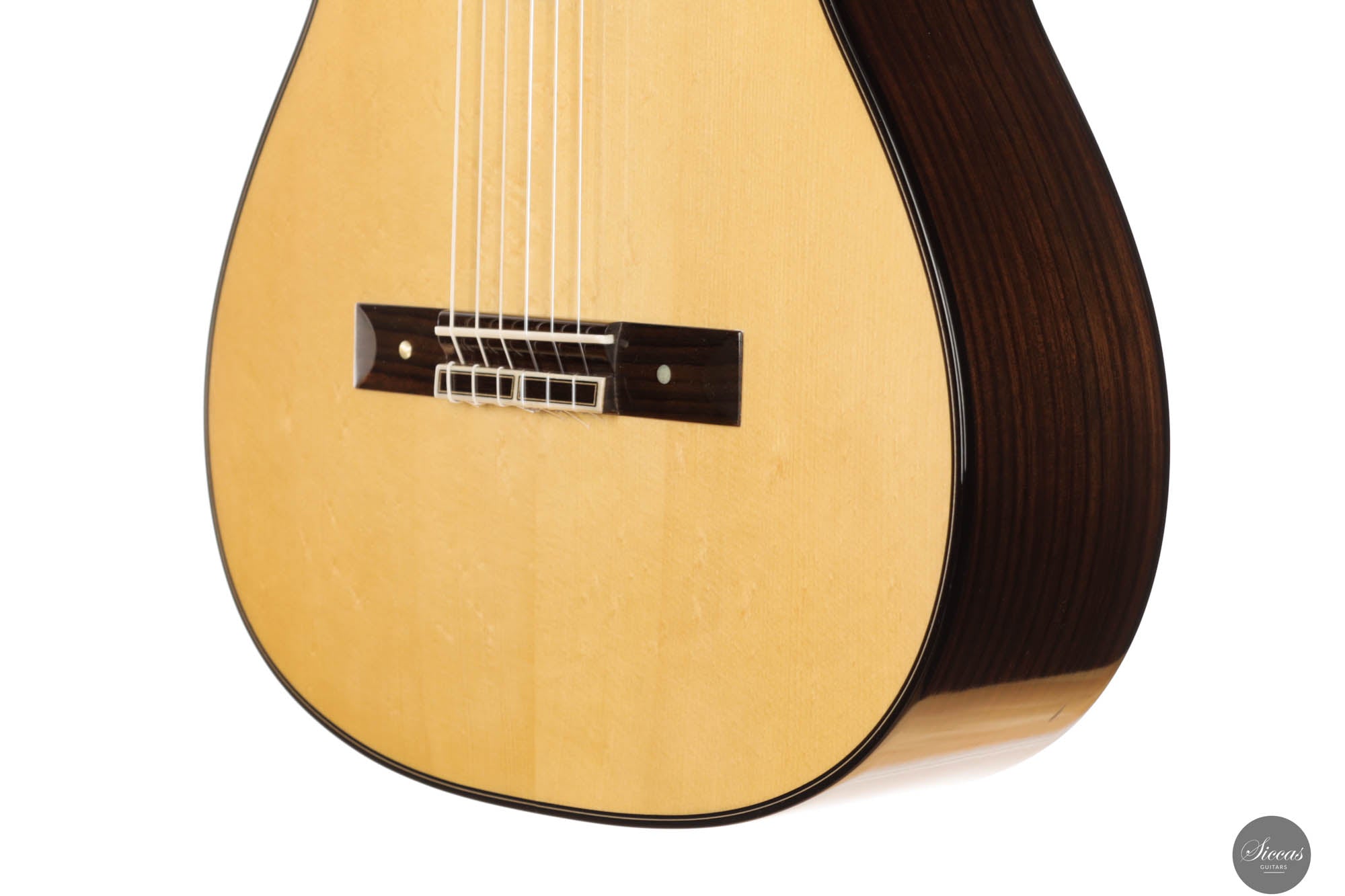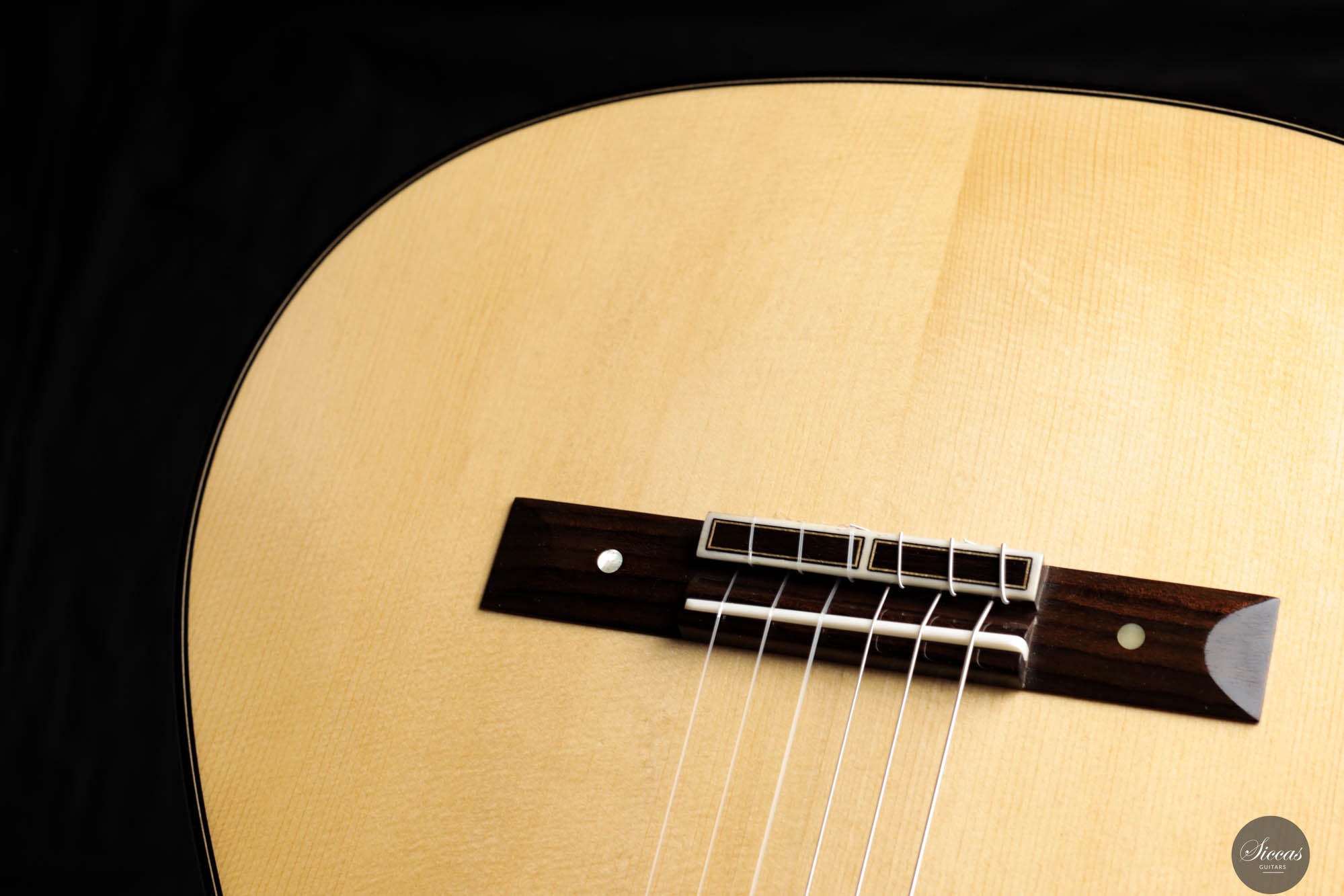 The Matthias Hartig 2024 No. 84 classical guitar is a masterpiece of traditional craftsmanship, displaying a simple yet elegant design that draws its influence from the iconic Antonio de Torres. Constructed with exquisite Indian rosewood for the back and sides, this guitar not only captures the eye with its aesthetic appeal but also enchants the ear with the richness and warmth of its tone. One of its most compelling features is its beautiful lyricism in voicing, which makes playing this guitar a truly delightful experience. Each note is captured with nuanced expressiveness, bringing any musical piece to life with captivating clarity. Overall, the Matthias Hartig 2024 No. 84 combines the essence of simplicity and traditional influence in its design while offering exceptional performance and playability, making it a standout choice for both aspiring and seasoned musicians.