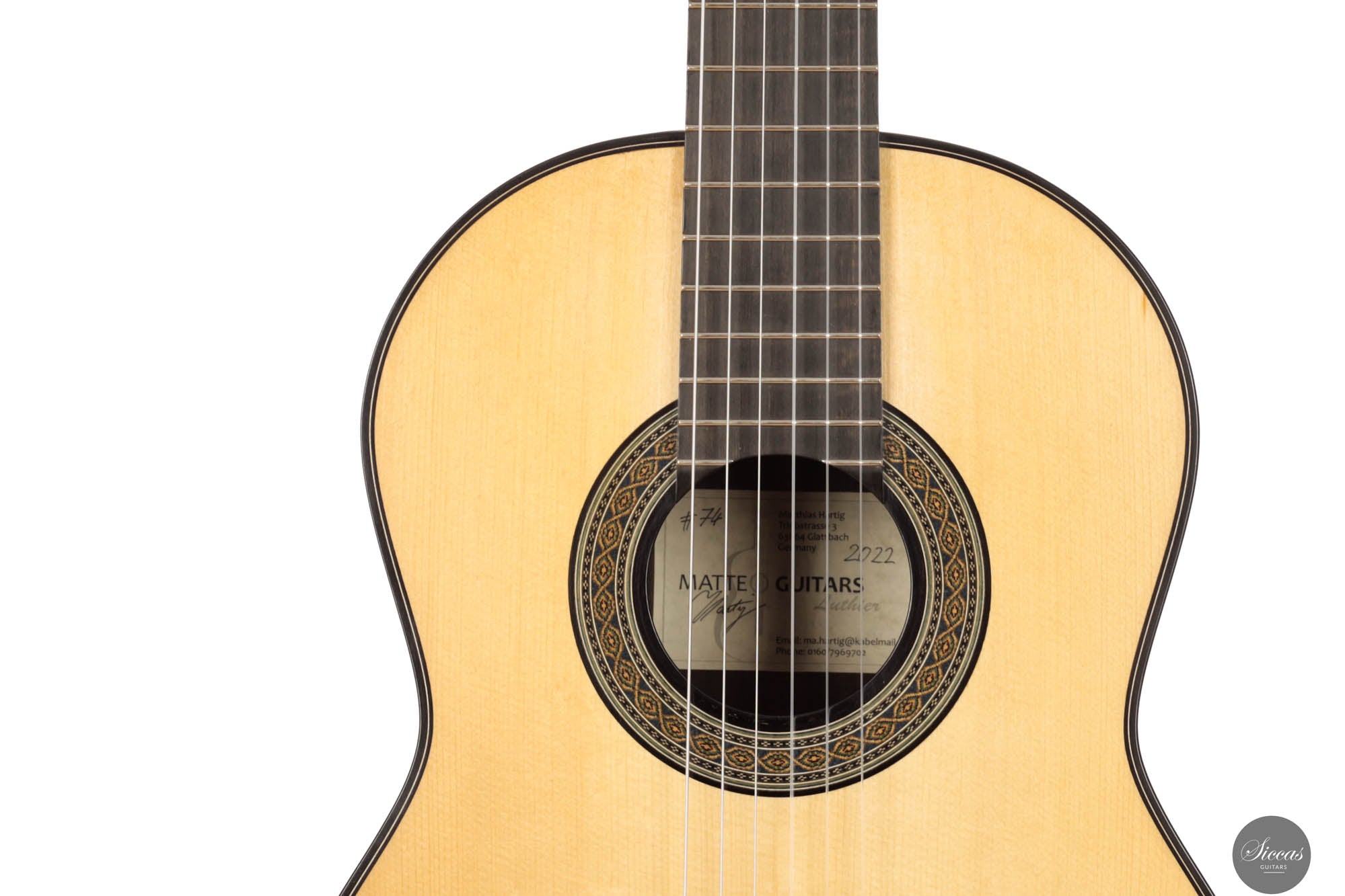 Matthias “Matteo” Hartig is a German luthier from Glattbach, Bavaria. Just like the famous Robert Bouchet, it was only in his forties that he discovered his true vocation in guitar making. His inspiration is the sound of the instruments of the old masters. Especially Torres, Enrique Garcia, Antonio Emilio Pascual and Richard Jacob “Weißgerber”. Matteo is dedicated to traditional building methods, using almost exclusively hide glue for his construction and shellac for the finish.