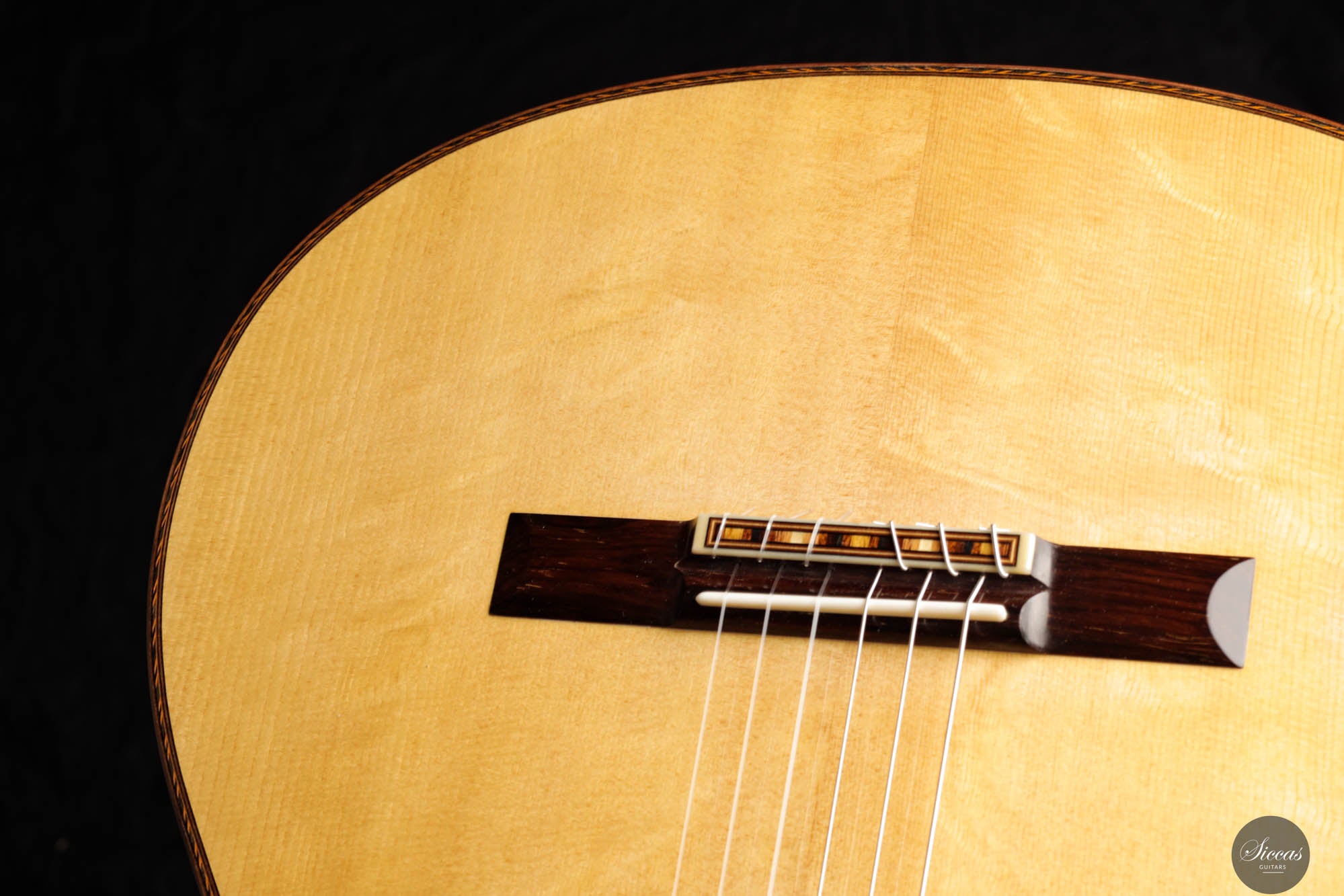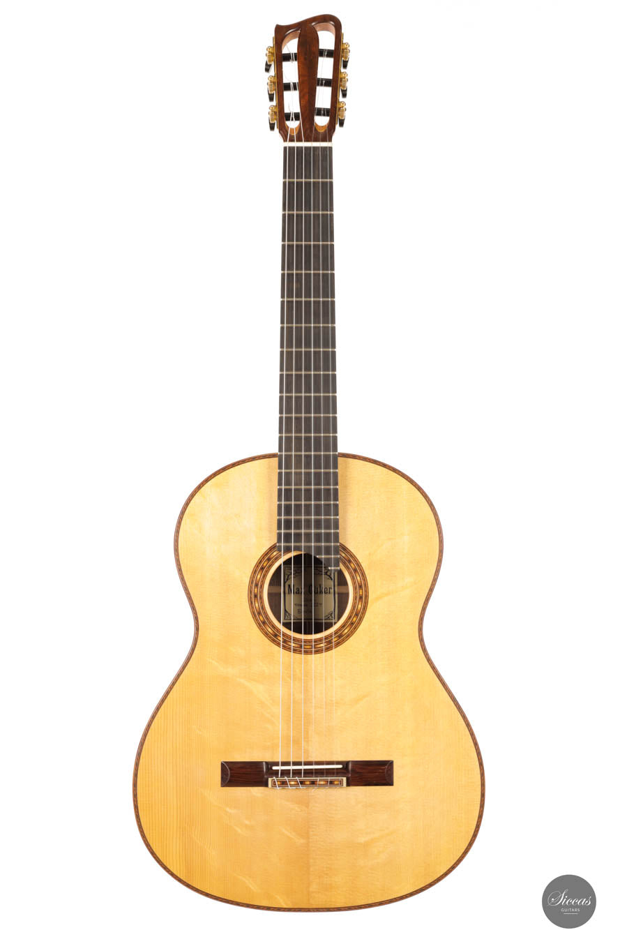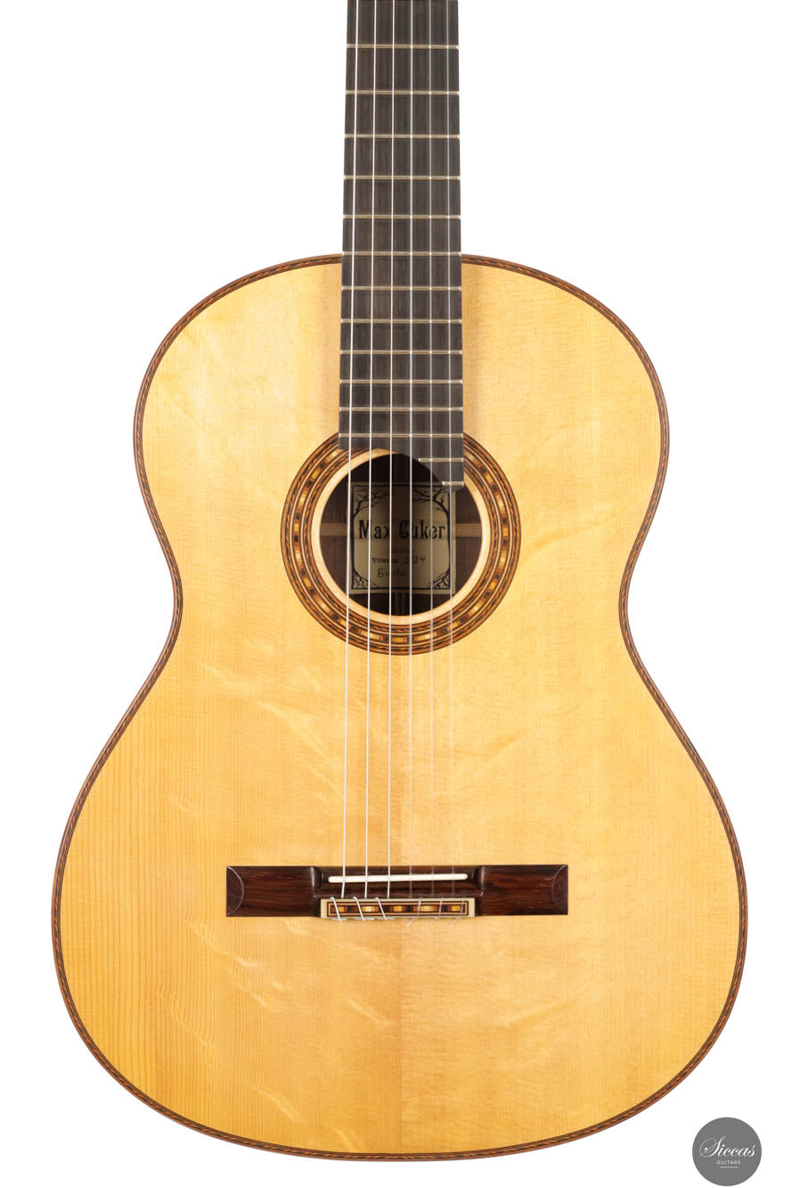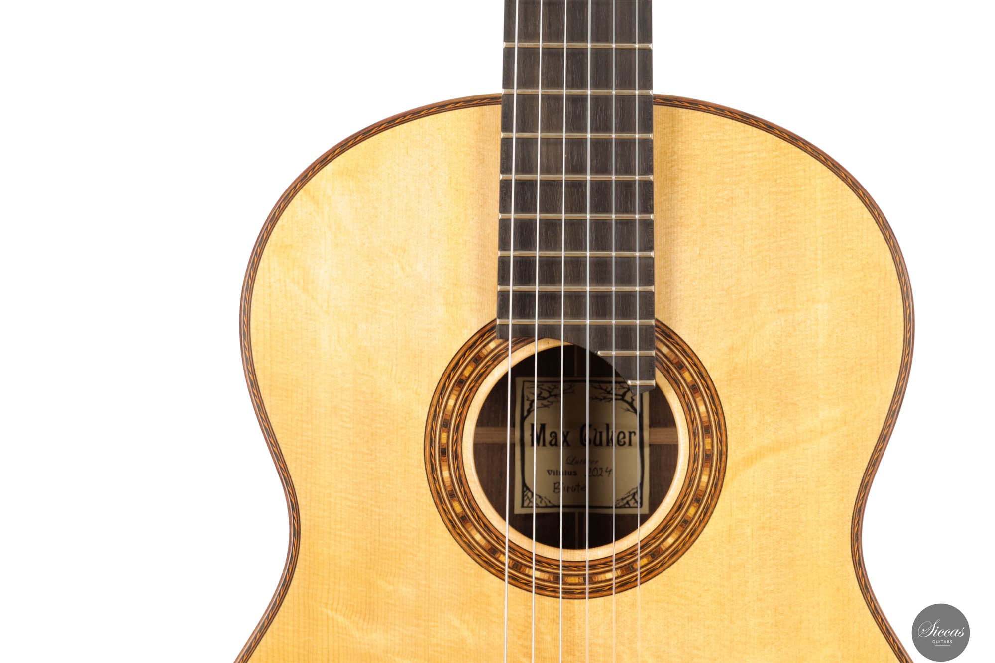 Diese exquisite Gitarre von Max Cuker repräsentiert ästhetische Schönheit gepaart mit außergewöhnlicher musikalischer Leistung. Die Wahl einer Fichtendecke verbessert die hellen und lebendigen klanglichen Eigenschaften der Gitarre, während das für Rücken und Seiten verwendete Madagaskar-Rosenholz nicht nur zur atemberaubenden Erscheinung des Instruments beiträgt, sondern auch seinen reichen und resonanten Klang fördert. Das erhöhte Griffbrett ist eine durchdachte Ergänzung, die Spielern mühelosen Zugang zu den höheren Noten bietet und komplexe Fingerarbeit mit Leichtigkeit ermöglicht. Dieses Designmerkmal, zusammen mit den verwendeten Premium-Materialien, zeigt Cukers Engagement sowohl für Spielbarkeit als auch für visuelle Eleganz, was diese Gitarre zu einem wahren Kunstwerk macht.