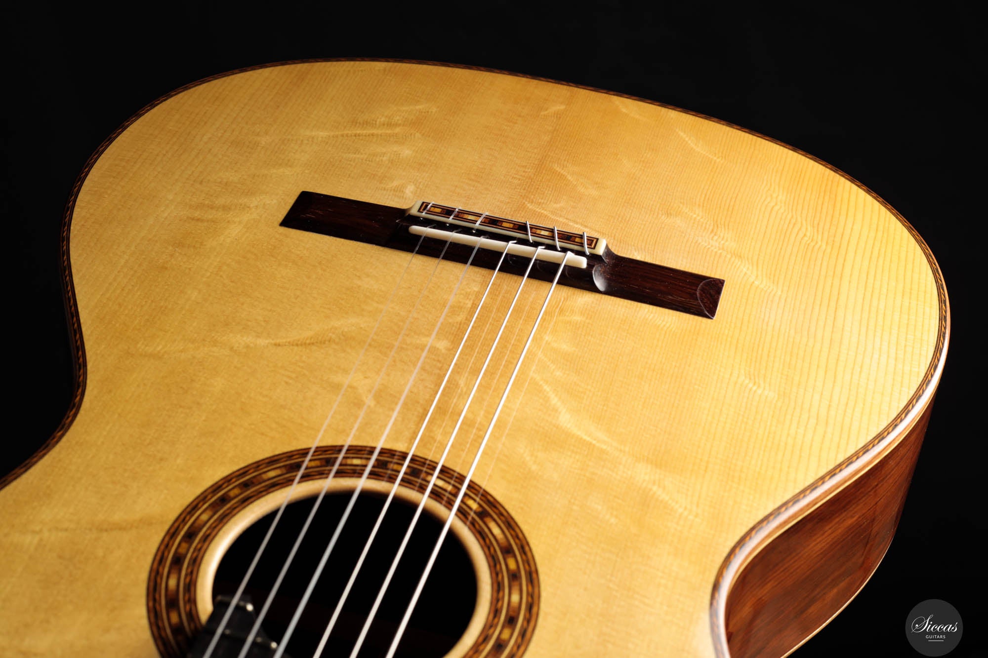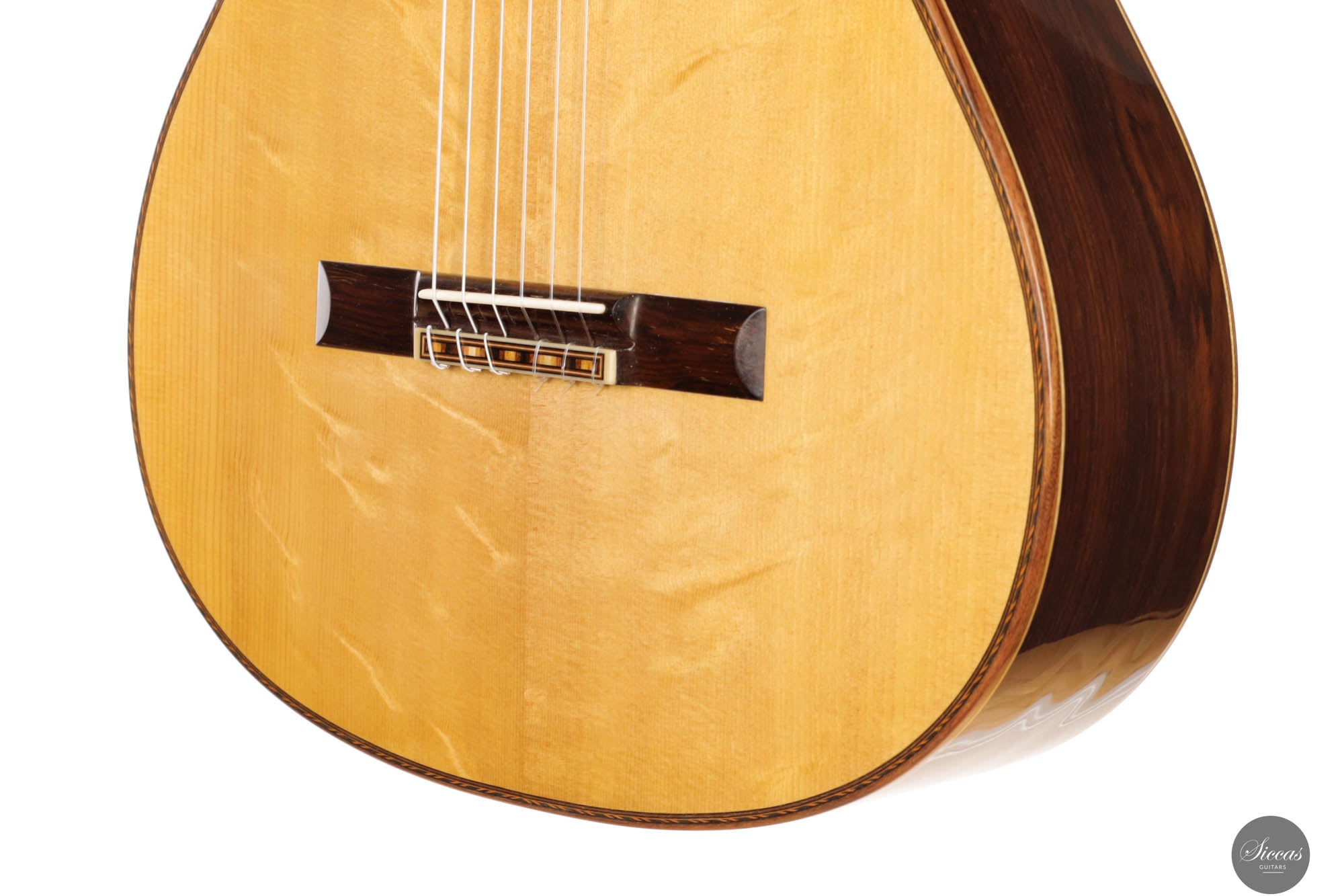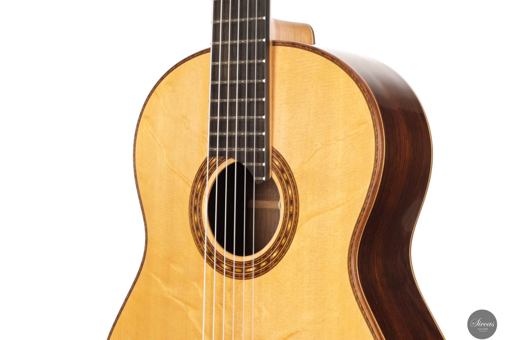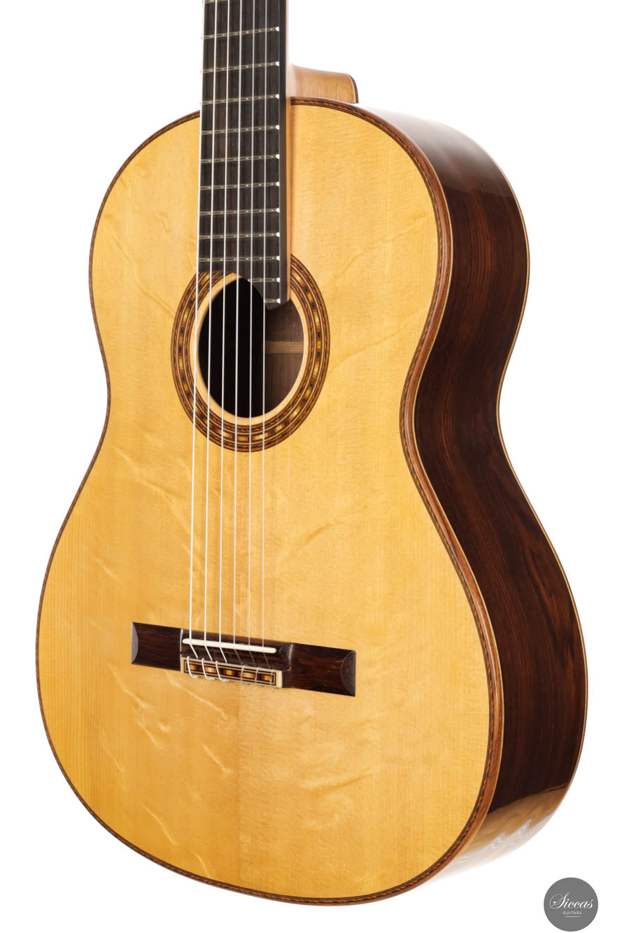 Diese exquisite Gitarre von Max Cuker repräsentiert ästhetische Schönheit gepaart mit außergewöhnlicher musikalischer Leistung. Die Wahl einer Fichtendecke verbessert die hellen und lebendigen klanglichen Eigenschaften der Gitarre, während das für Rücken und Seiten verwendete Madagaskar-Rosenholz nicht nur zur atemberaubenden Erscheinung des Instruments beiträgt, sondern auch seinen reichen und resonanten Klang fördert. Das erhöhte Griffbrett ist eine durchdachte Ergänzung, die Spielern mühelosen Zugang zu den höheren Noten bietet und komplexe Fingerarbeit mit Leichtigkeit ermöglicht. Dieses Designmerkmal, zusammen mit den verwendeten Premium-Materialien, zeigt Cukers Engagement sowohl für Spielbarkeit als auch für visuelle Eleganz, was diese Gitarre zu einem wahren Kunstwerk macht.