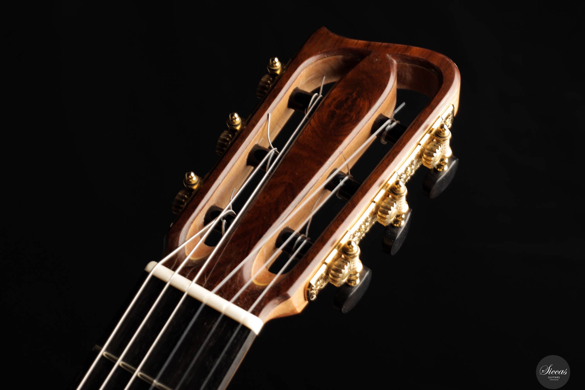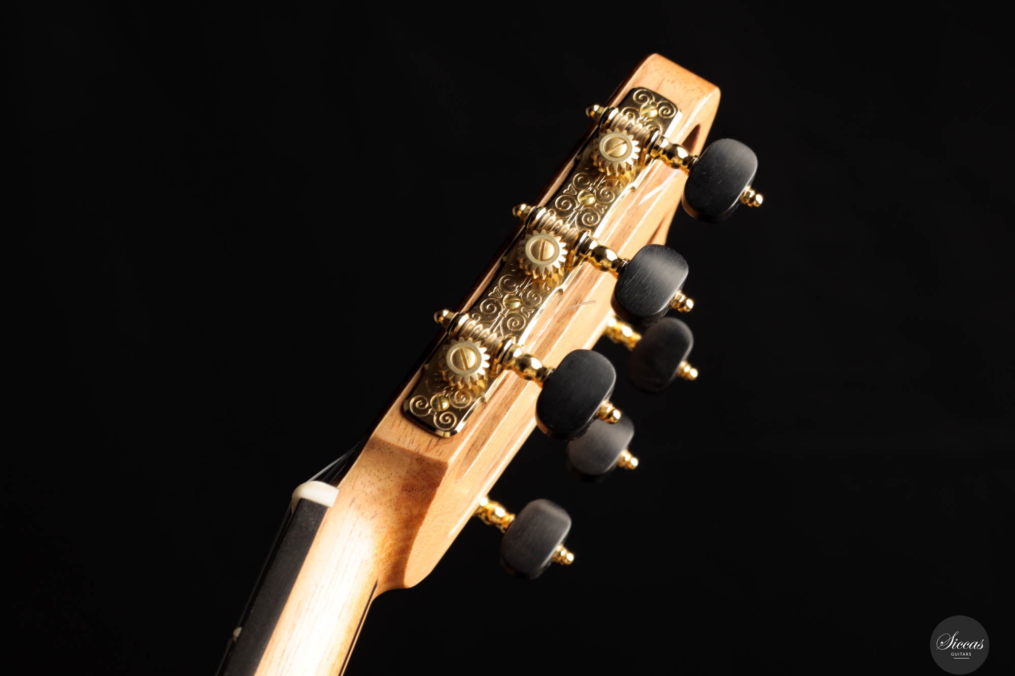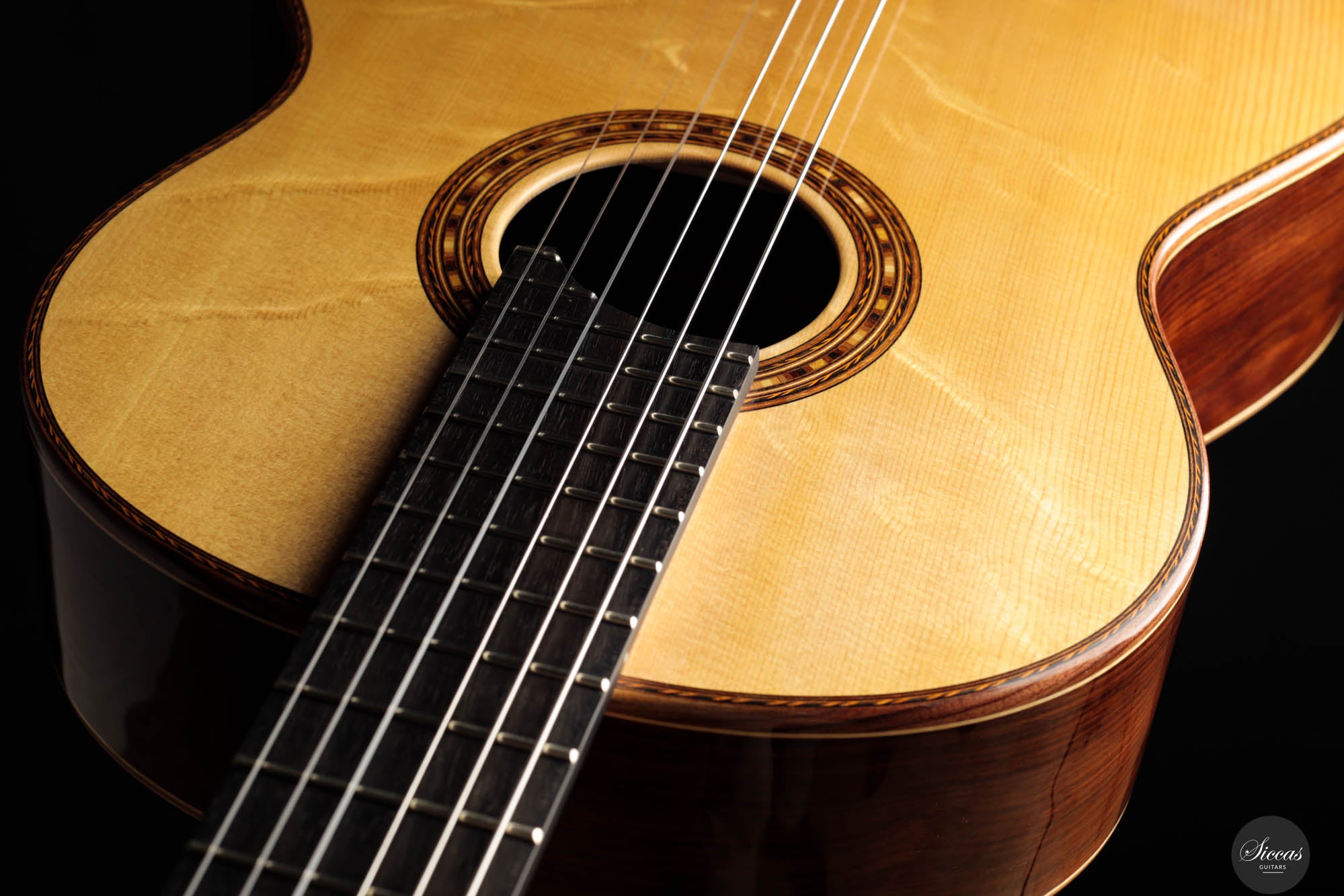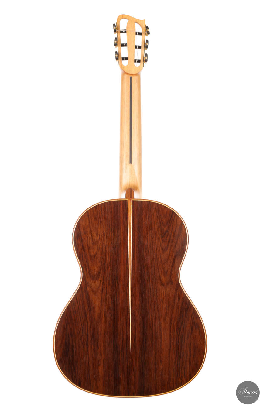 Diese exquisite Gitarre von Max Cuker repräsentiert ästhetische Schönheit gepaart mit außergewöhnlicher musikalischer Leistung. Die Wahl einer Fichtendecke verbessert die hellen und lebendigen klanglichen Eigenschaften der Gitarre, während das für Rücken und Seiten verwendete Madagaskar-Rosenholz nicht nur zur atemberaubenden Erscheinung des Instruments beiträgt, sondern auch seinen reichen und resonanten Klang fördert. Das erhöhte Griffbrett ist eine durchdachte Ergänzung, die Spielern mühelosen Zugang zu den höheren Noten bietet und komplexe Fingerarbeit mit Leichtigkeit ermöglicht. Dieses Designmerkmal, zusammen mit den verwendeten Premium-Materialien, zeigt Cukers Engagement sowohl für Spielbarkeit als auch für visuelle Eleganz, was diese Gitarre zu einem wahren Kunstwerk macht.