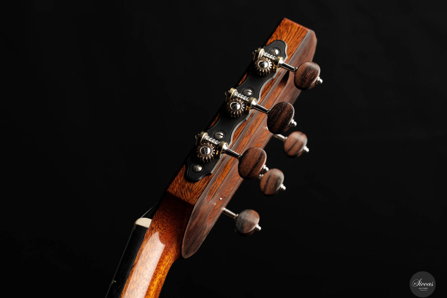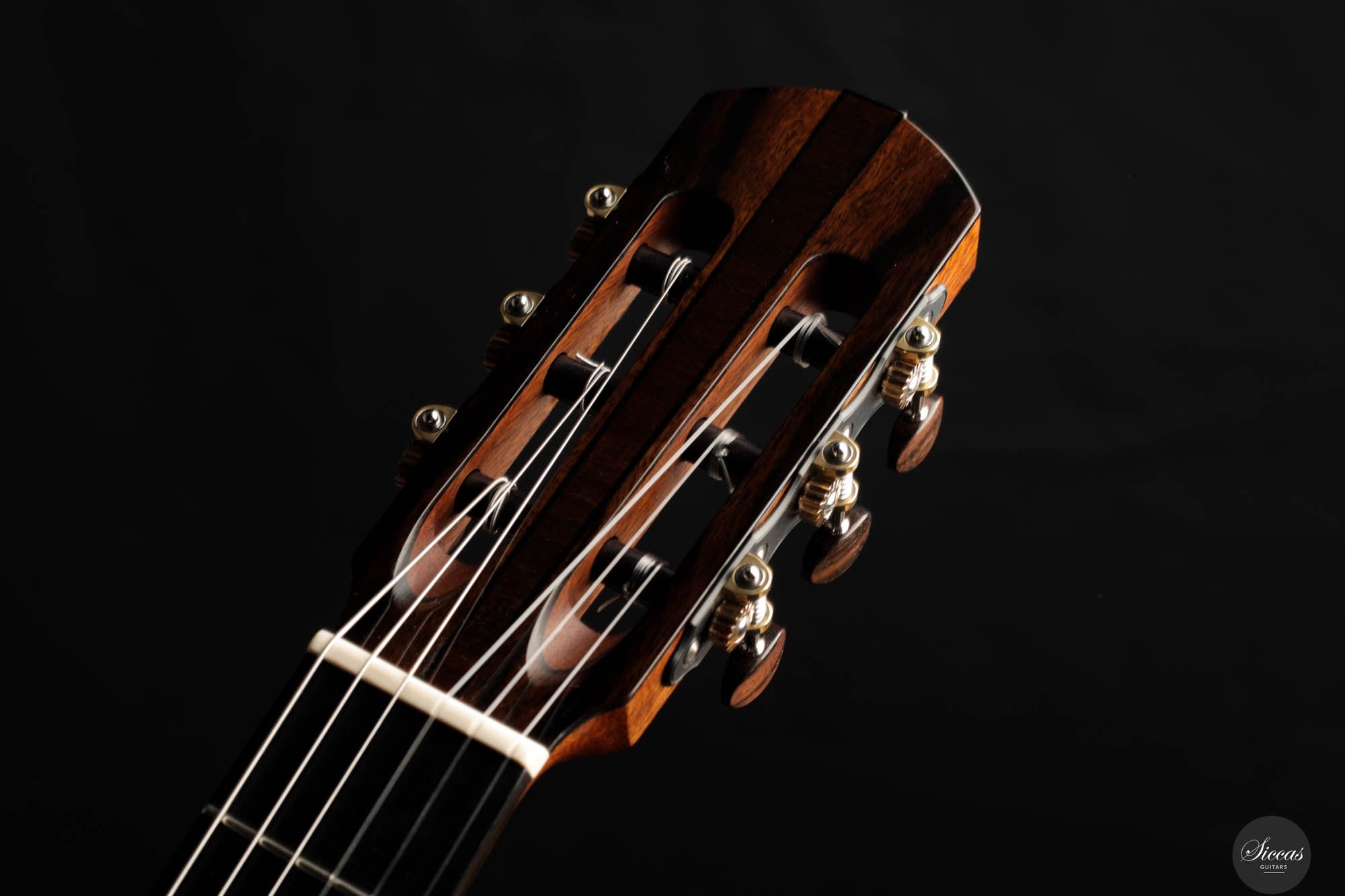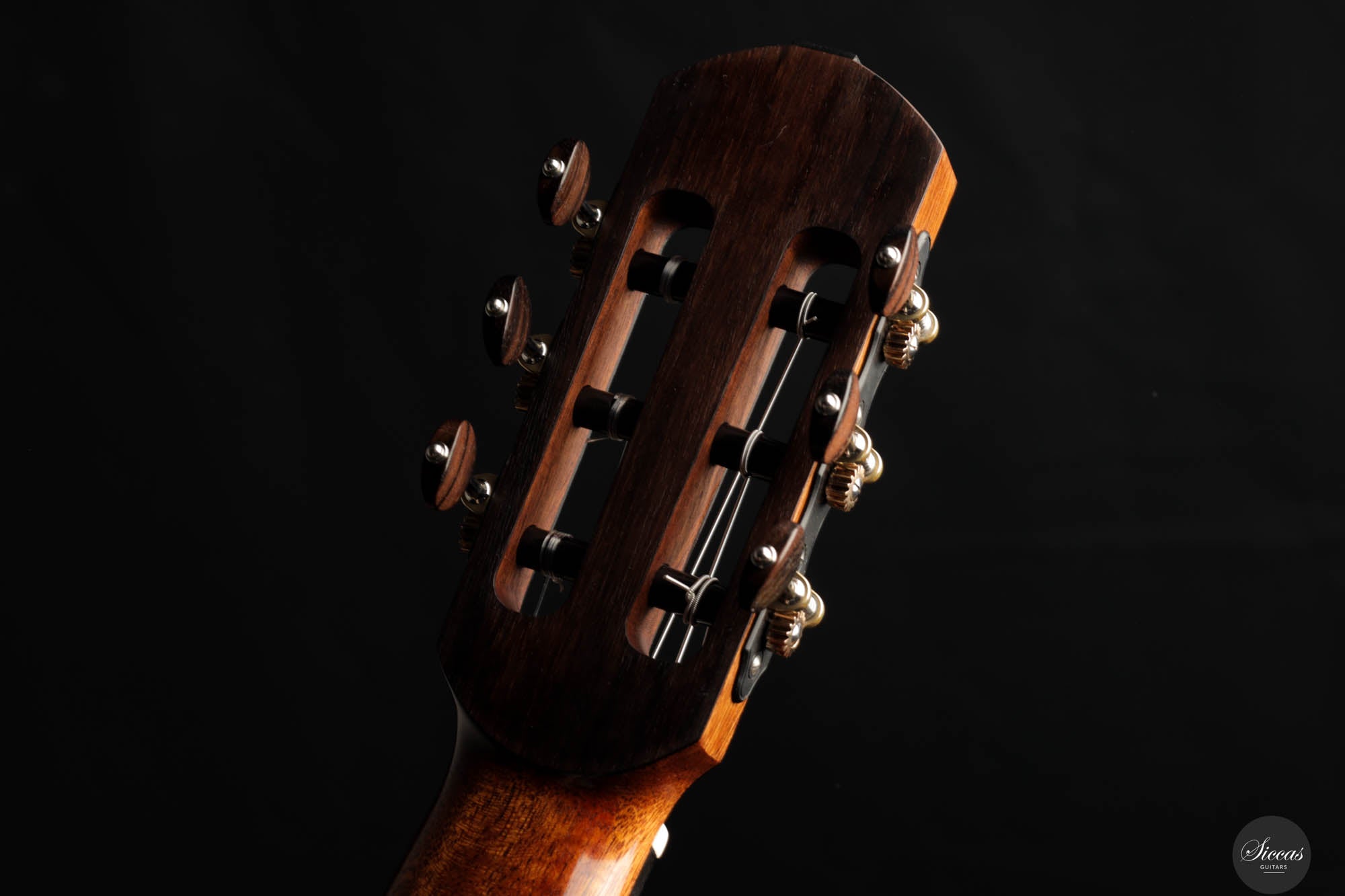 Das Skalen-/Sattelverhältnis von 644/51, eine Spezifikation, die zunehmend von Gitarristen gesucht und persönlich von Della Giustina befürwortet wird, signalisiert eine Verschiebung hin zu verbesserter Spielbarkeit ohne Kompromisse bei den akustischen Eigenschaften der Gitarre. Dieses Verhältnis ist ein Indiz für den zukunftsorientierten Designansatz des Luthiers, der darauf abzielt, die sich entwickelnden Präferenzen zeitgenössischer Musiker zu erfüllen. Die Double-Top-Technik, frei von einem traditionellen Kern, ermöglicht eine außergewöhnlich reaktionsfähige und flexible Decke, die einen frei fließenden und nuancenreichen Klang erleichtert. Diese Kreation von Michele Della Giustina ist nicht nur ein Instrument, sondern ein Spiegelbild der innovativen Vision des Luthiers, der traditionelle Techniken mit modernen Anforderungen verbindet, um Gitarristen ein Werkzeug zu bieten, das sowohl in der Leistung als auch in der Klangqualität hervorragt.