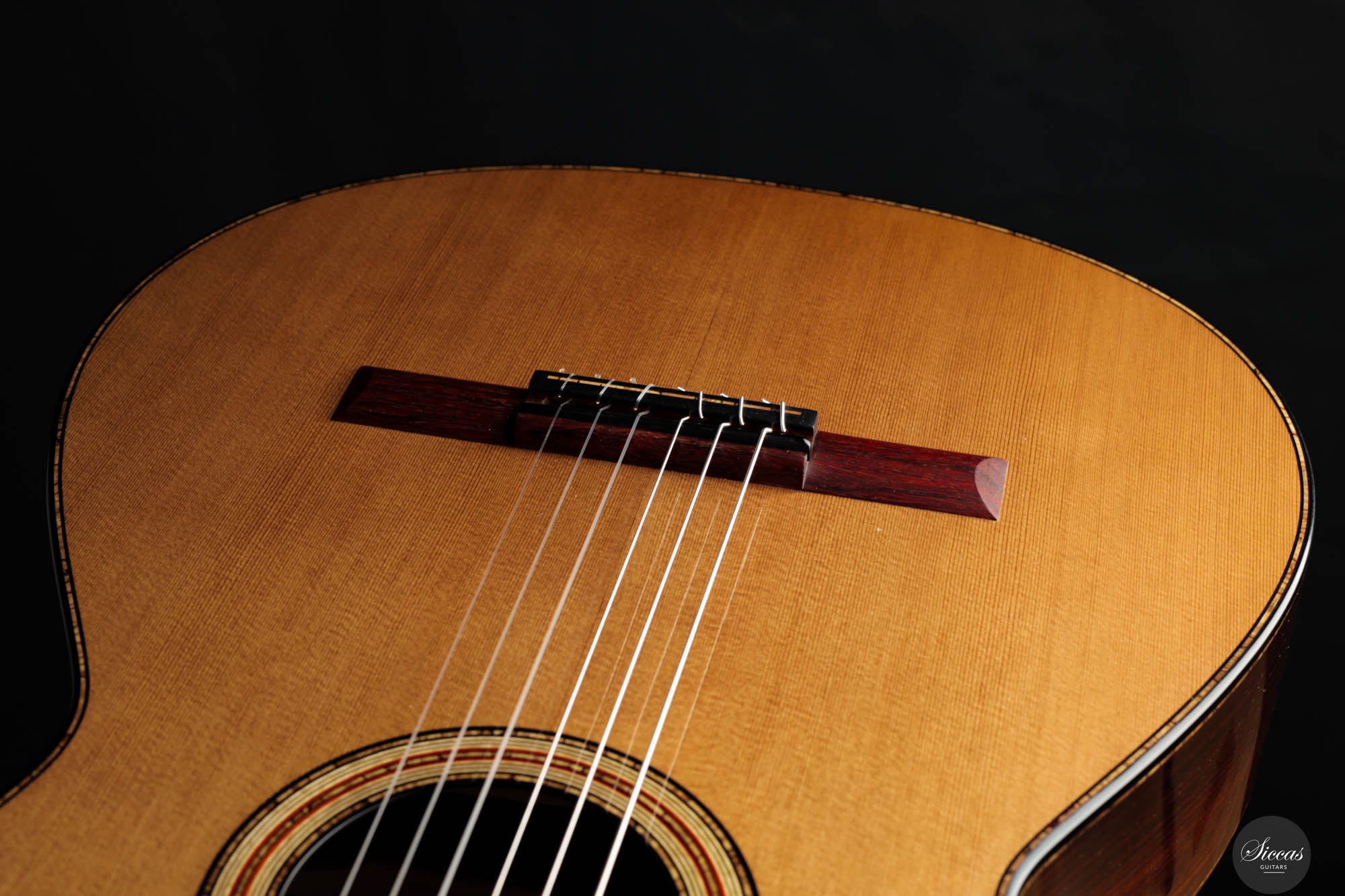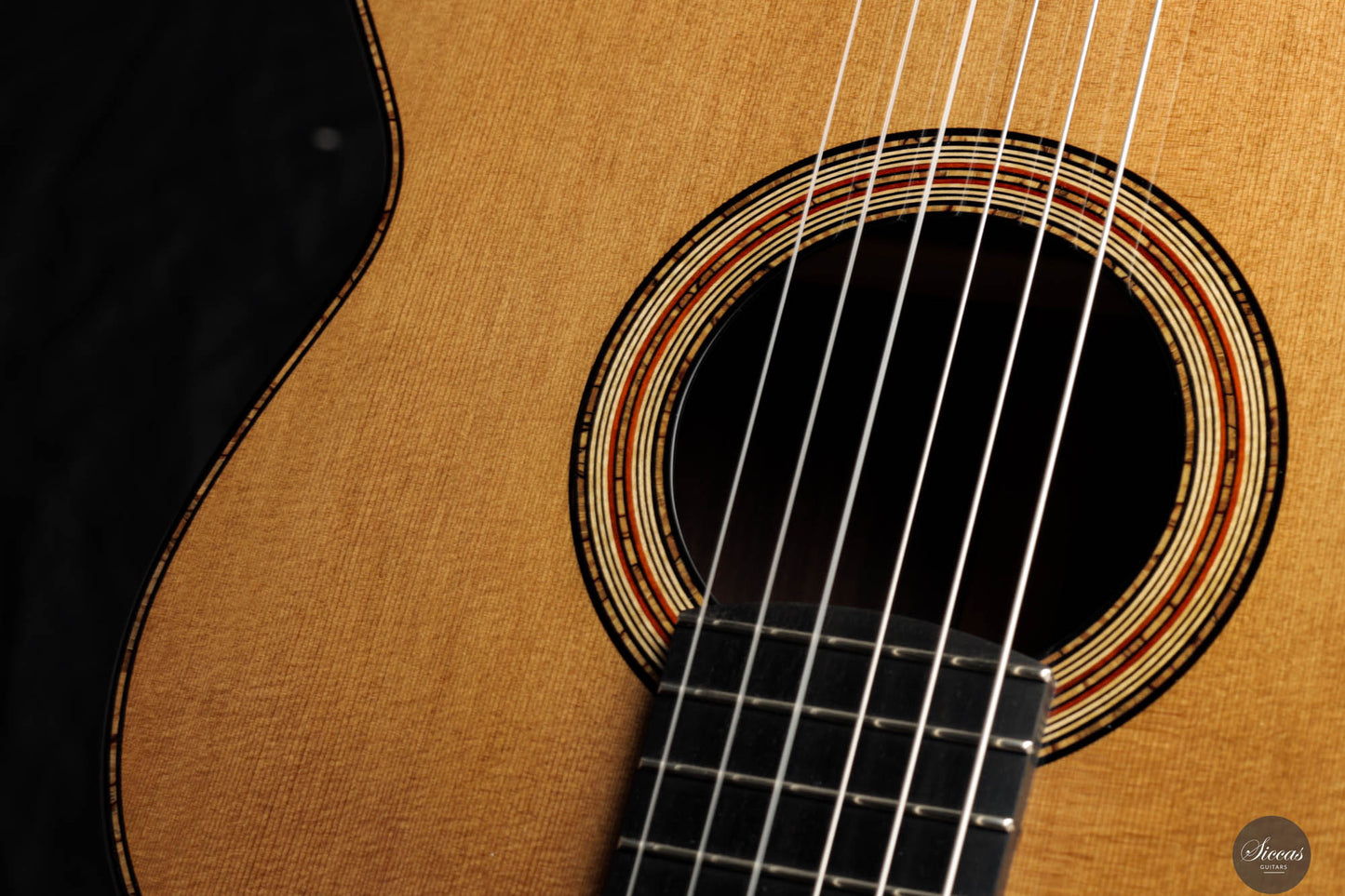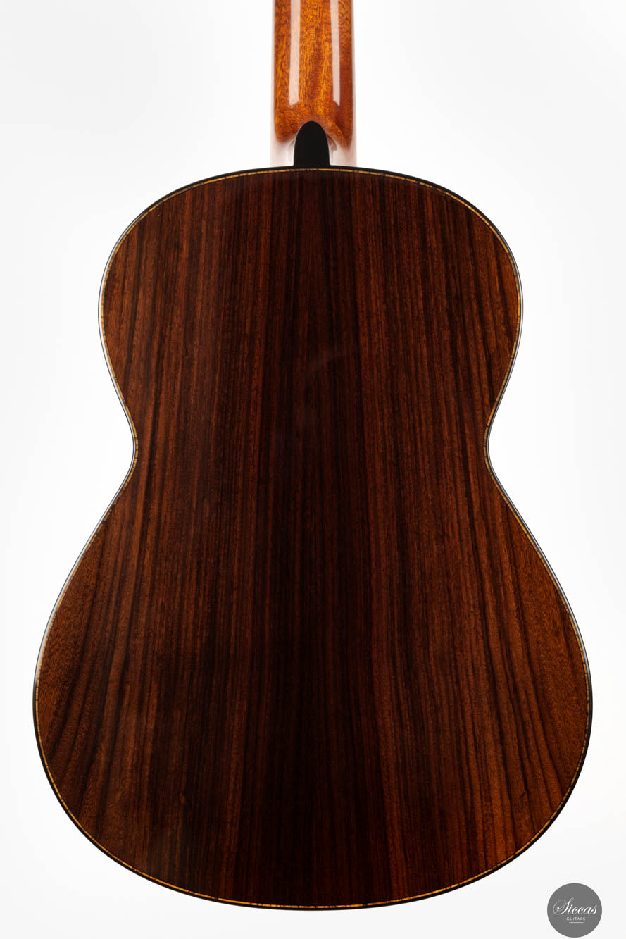 Die Michele Della Giustina Gitarre, gebaut im Jahr 2024 mit der Seriennummer 420, zeigt das Engagement des Luthiers für innovative Handwerkskunst und akustische Exzellenz. Dieses Instrument verfügt über ein einzigartiges Double-Top-Design ohne Kern, das Zeder und Fichte kombiniert, um eine leichte, aber mechanisch widerstandsfähige Struktur zu schaffen. Die Wahl von wildem indischen Palisander für Rücken und Seiten, kombiniert mit einem Hals aus Khaya-Mahagoni, trägt weiterhin zu seiner herausragenden Klangqualität und ästhetischen Anziehungskraft bei. Die Verwendung von Pagos schwarzen Aluminiumstimmern und Knobloch Erithacus CX edc 34.0 Saiten ergänzt den überlegenen Bau der Gitarre, was eine präzise Stimmung und eine lebendige Klangpalette sicherstellt. Verpackt in einem Eastman-Koffer, ist diese Gitarre im berühmt von Uros Baric in vielen seiner anerkannten Videos verwendeten Stil gebaut, entworfen, um einen Klang zu liefern, der sowohl natürlich als auch befreiend ist, reich an Farbe und fähig zu einem breiten dynamischen Bereich.