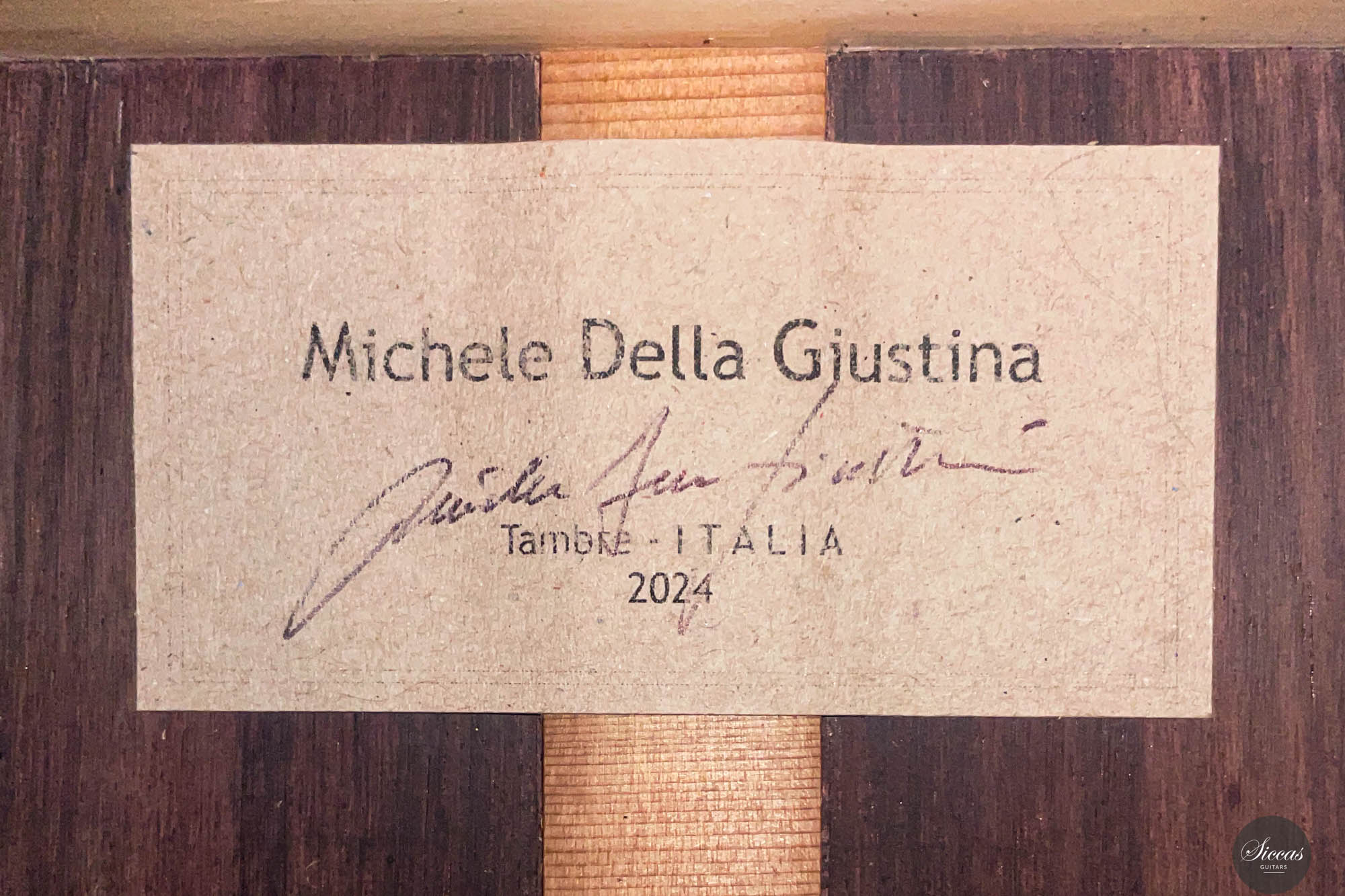 Michele Della Giustina, ein Meistergeigenbauer, geboren 1962 in Vittorio Veneto, hat sich seit seinem Abschluss am Konservatorium in Udine im Jahr 1990 eine ausgezeichnete Nische im Bereich des klassischen Gitarrenbaus erarbeitet. Seine Reise in die Geigenbaukunst begann unter der Anleitung von Maestro Carlo Raspagni, von dem er die grundlegenden Fähigkeiten und Philosophien erlernte, die seine Karriere leiten sollten. Della Giustinas Handwerk nahm eine bedeutende Wendung, als er Kazuo Sato traf, einen japanischen Geigenbauer, dessen Einfluss eine erfolgreiche Zusammenarbeit mit der Niibori Guitar Music Academy in Japan anregte und zu einer bemerkenswerten Konferenz über Geigenbau in deren Tokioter Hauptquartier im Jahr 2003 führte. Das Jahr 2004 markierte einen Wendepunkt in Della Giustinas Karriere, als er Hiroyuki Arai, einen jungen Geigenbaustudenten aus Japan, für zwei Monate beherbergte. Diese Mentorenschaft bereicherte nicht nur Arais Handwerk, sondern stärkte auch Della Giustinas internationale Verbindungen. Seine Teilnahme an den Konventionen der Guitar Foundation of America (GFA) in Montreal (2004) und Columbus - Atlanta (2006) öffnete die Türen zum amerikanischen Markt, was durch eine Einladung nach New York durch den NBC-Journalisten Ramon Zayas, der ihn in die Gitarrenszene der Ostküste einführte, weiter verstärkt wurde.