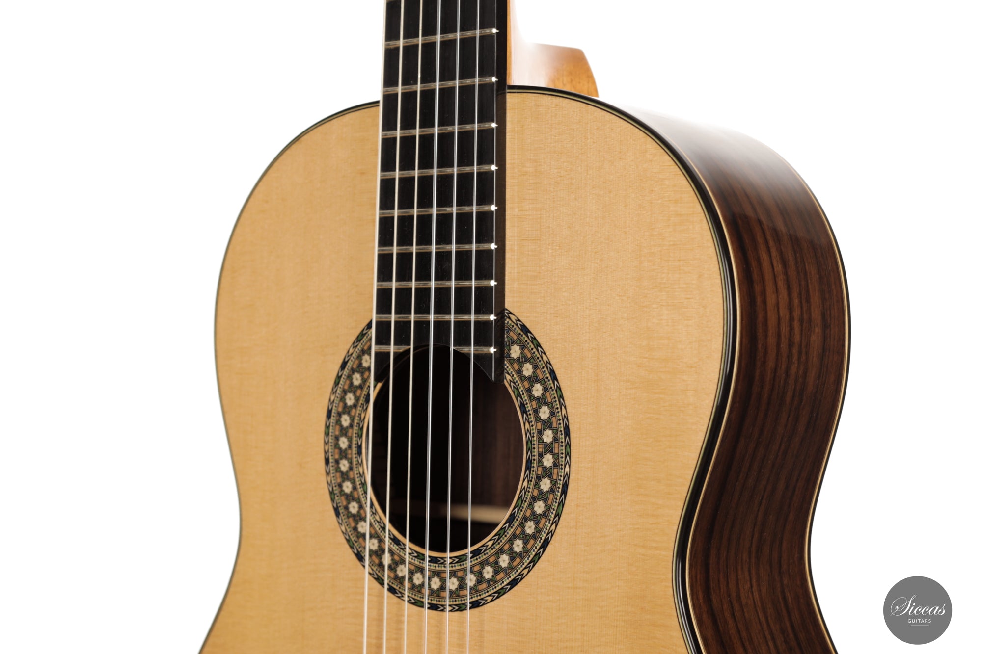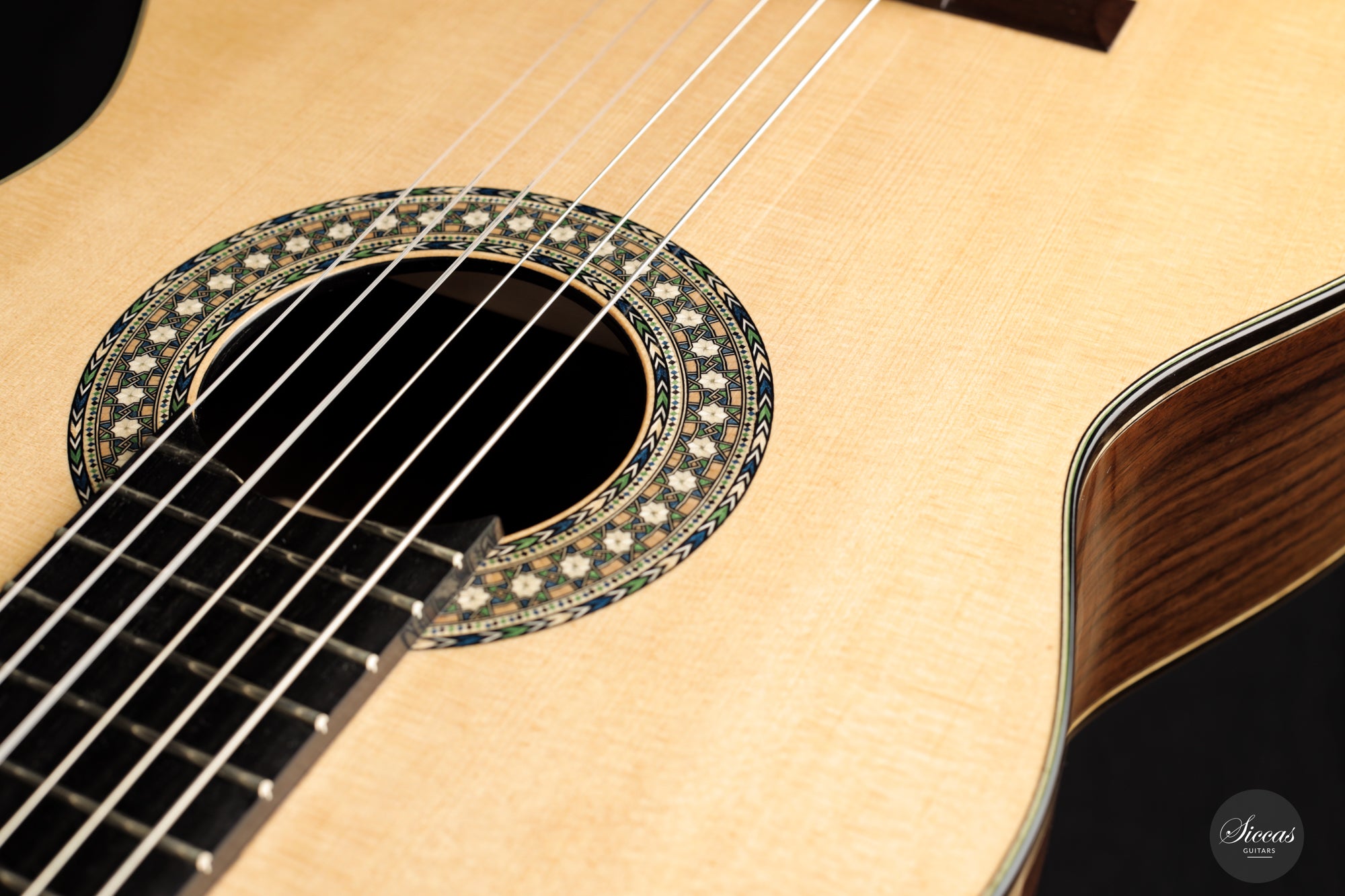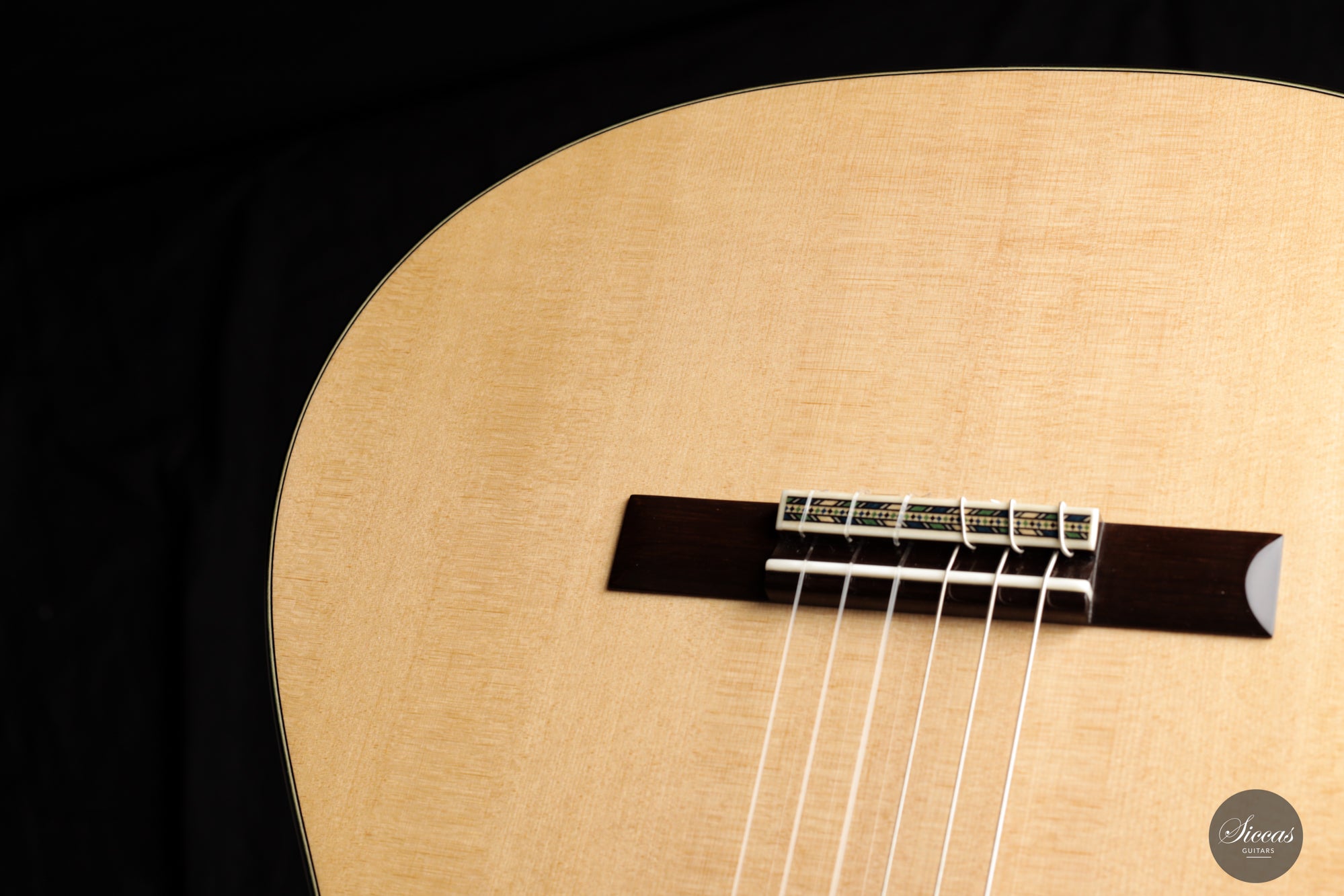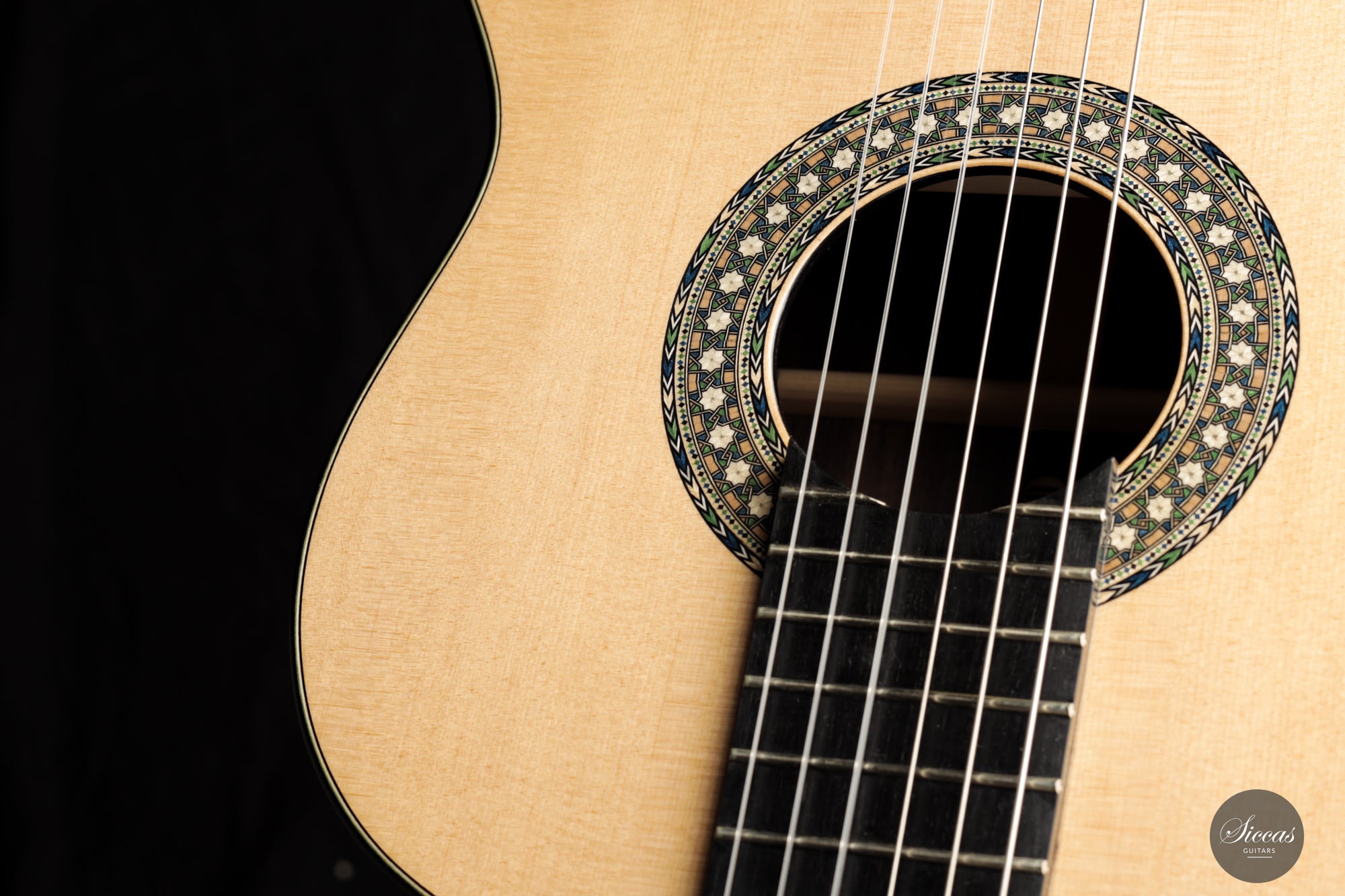 Dieses wunderbare Instrument aus dem Jahr 2022 wurde mit einer Fichtendecke mit Gitterverstrebungen (Lattice) gebaut. Ästhetisch ist sie stark von der maurischen Kunst inspiriert, wie sie in den Ornamenten der Alhambra in Granada, Spanien, dargestellt ist. Das prächtige und farbenreiche geometrische Mosaik der Rosette verleiht diesem Instrument ein einzigartiges Erscheinungsbild und lässt Miguel Angels meisterliche Kunstfertigkeit erkennen. Die Ansprache und das Klangvolumen dieses Modells sowie die 65 cm Mensur und der 52 mm Sattel machen es zu einer hervorragenden Konzertgitarre, welche für die meisten Gitarristen geeignet ist und einen fantastischen Spielkomfort sowie einen eleganten, tragenden Gesamtklang mit sich bringt.