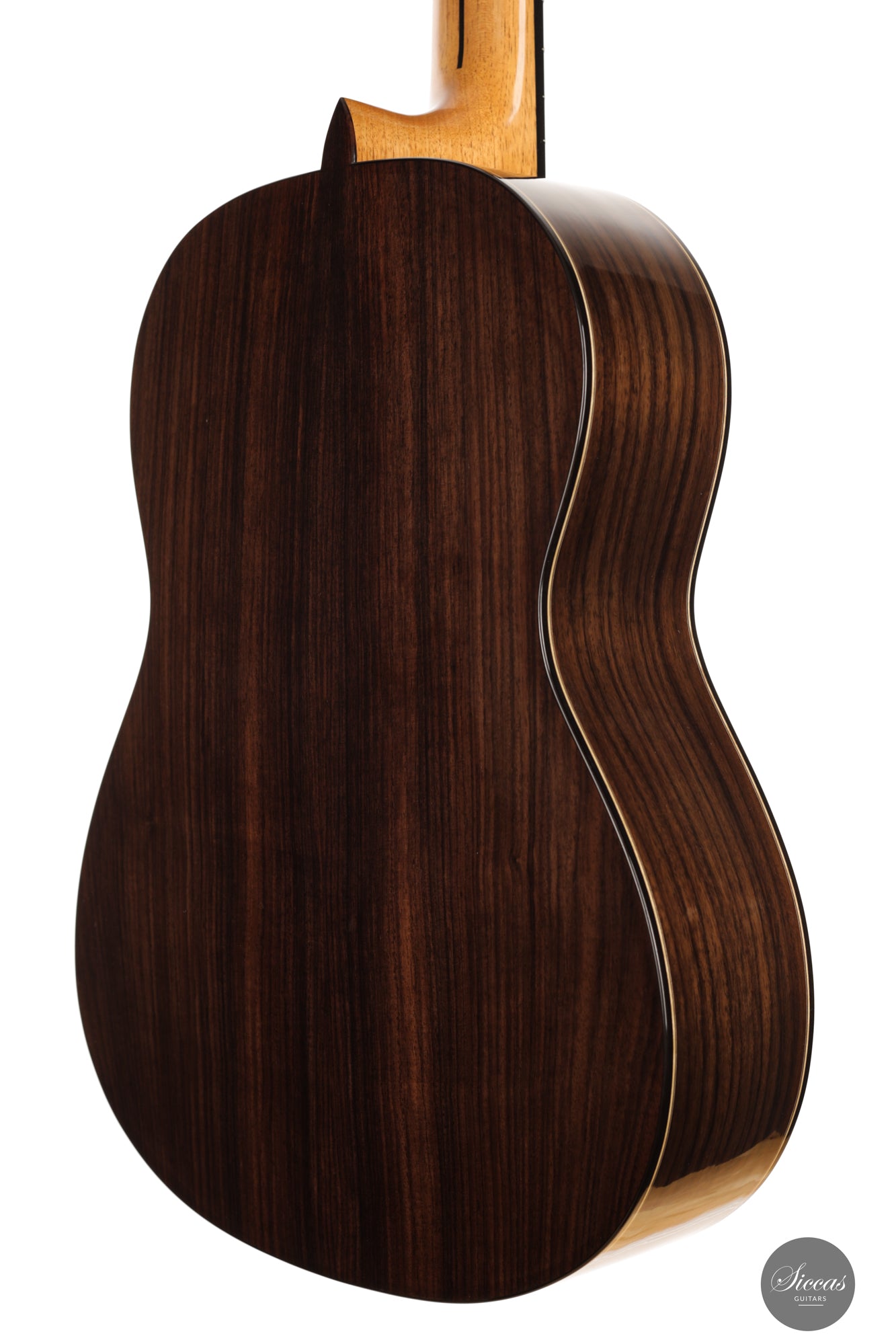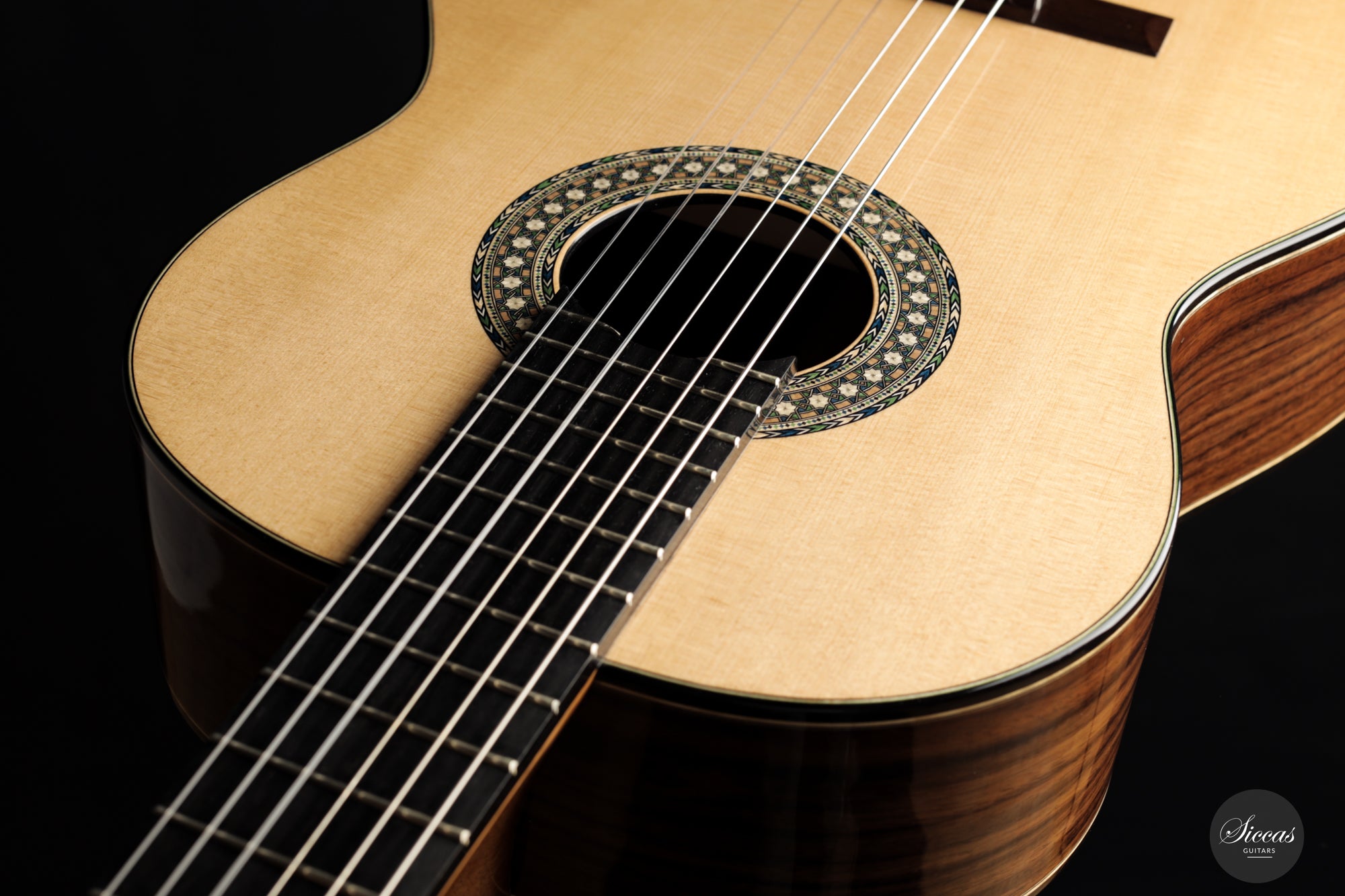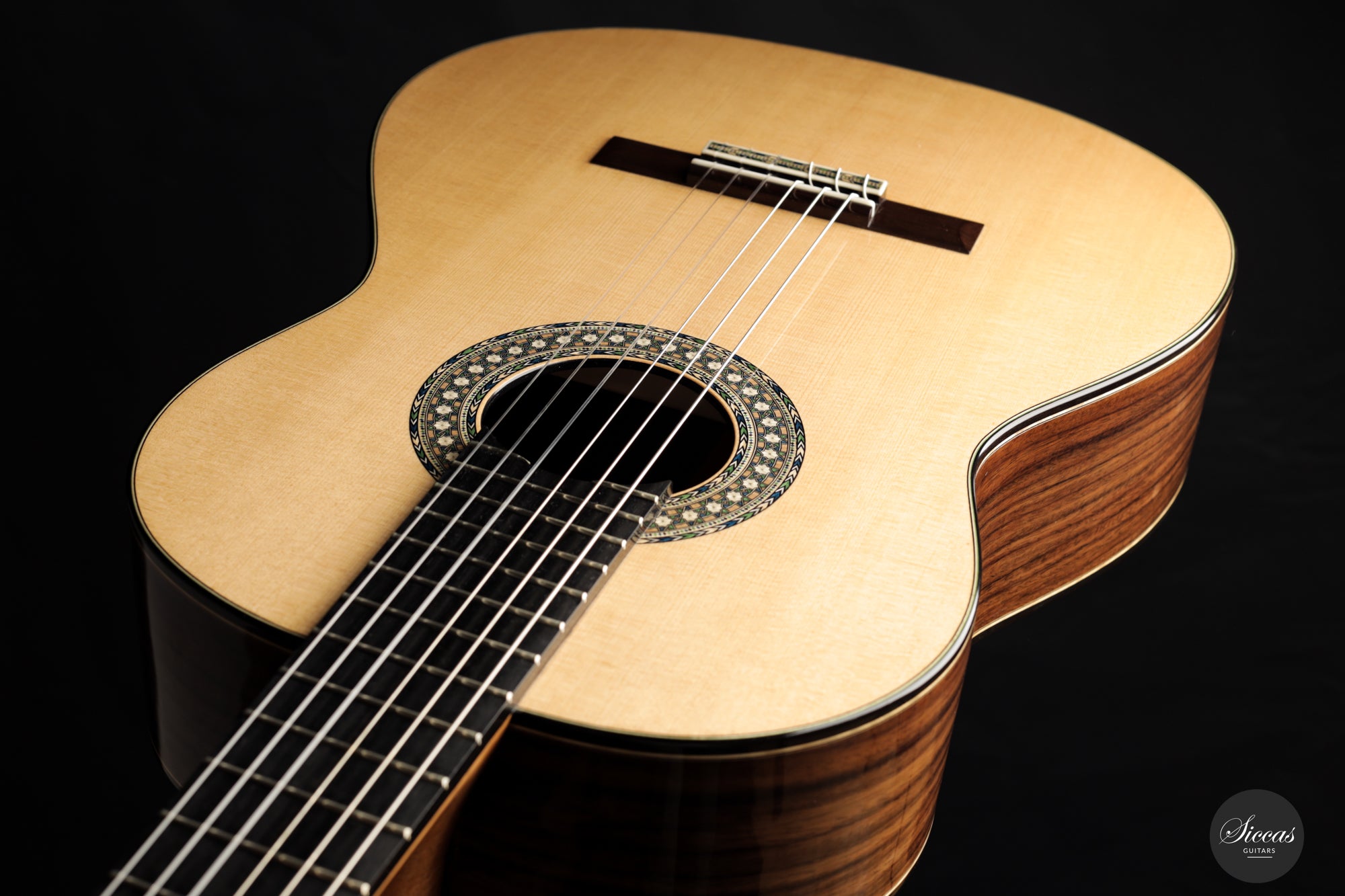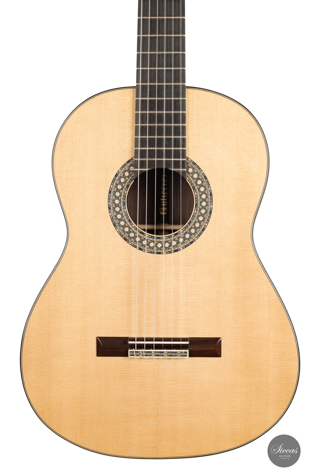 Dieses wunderbare Instrument aus dem Jahr 2022 wurde mit einer Fichtendecke mit Gitterverstrebungen (Lattice) gebaut. Ästhetisch ist sie stark von der maurischen Kunst inspiriert, wie sie in den Ornamenten der Alhambra in Granada, Spanien, dargestellt ist. Das prächtige und farbenreiche geometrische Mosaik der Rosette verleiht diesem Instrument ein einzigartiges Erscheinungsbild und lässt Miguel Angels meisterliche Kunstfertigkeit erkennen. Die Ansprache und das Klangvolumen dieses Modells sowie die 65 cm Mensur und der 52 mm Sattel machen es zu einer hervorragenden Konzertgitarre, welche für die meisten Gitarristen geeignet ist und einen fantastischen Spielkomfort sowie einen eleganten, tragenden Gesamtklang mit sich bringt.