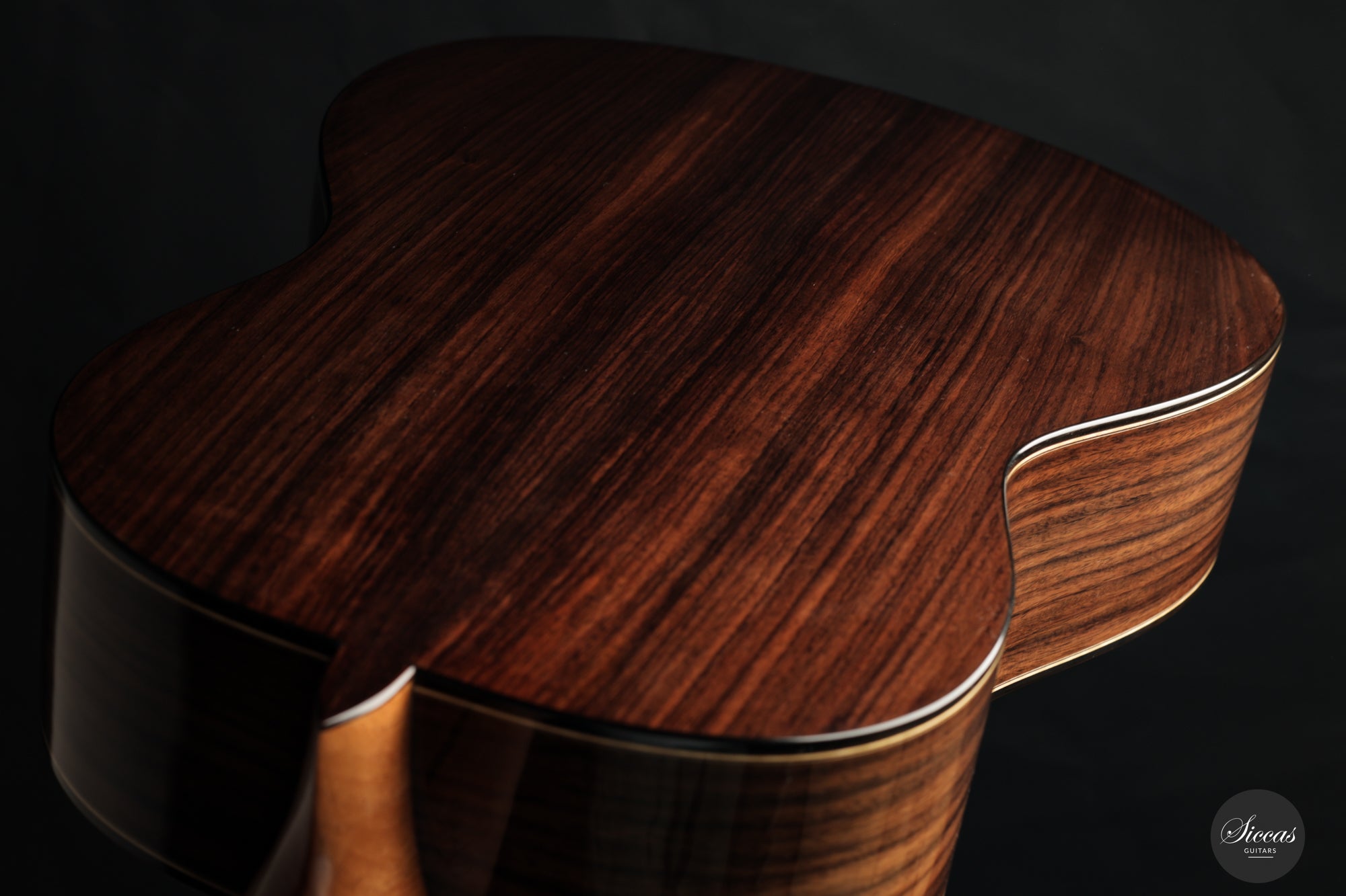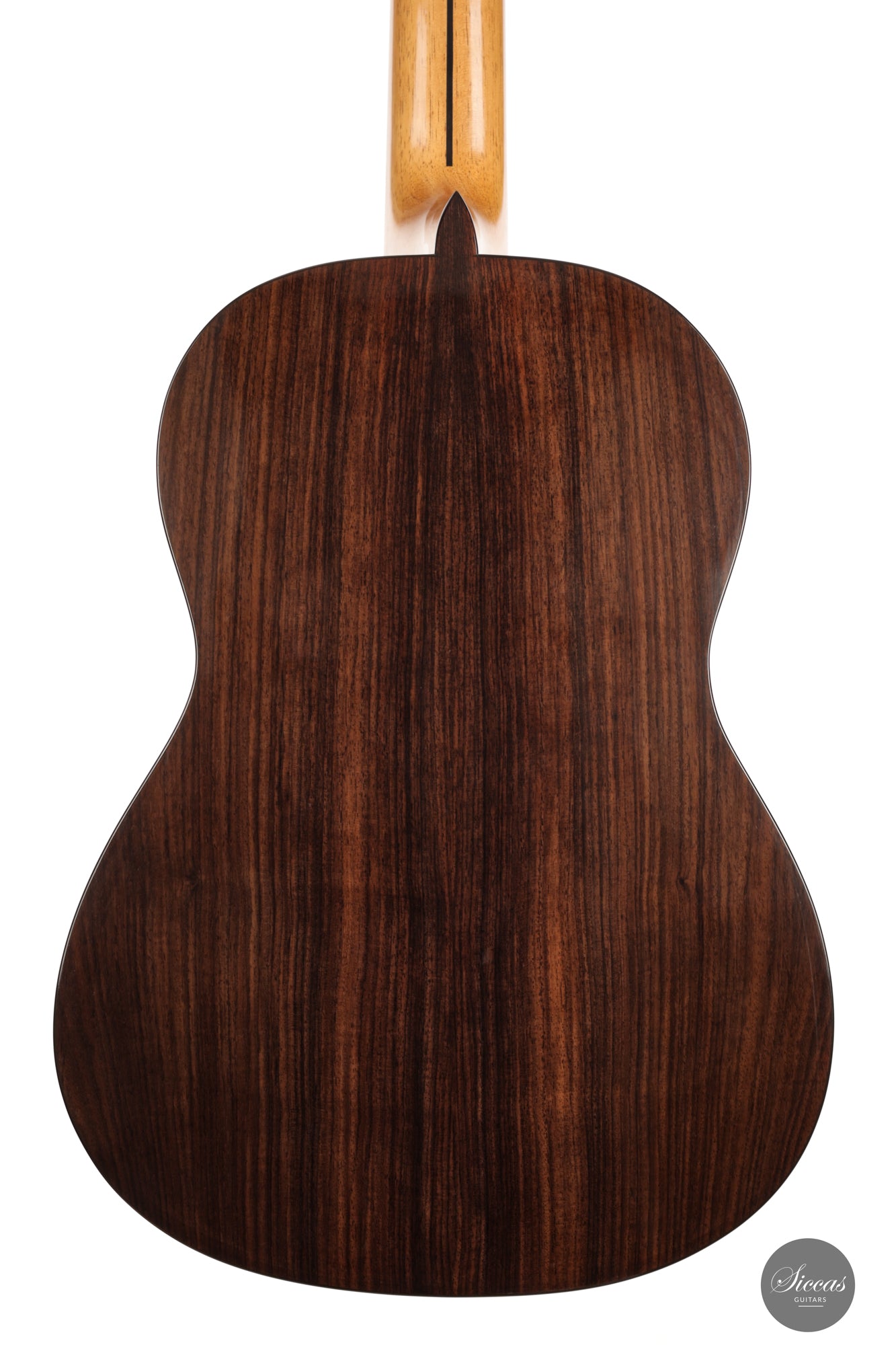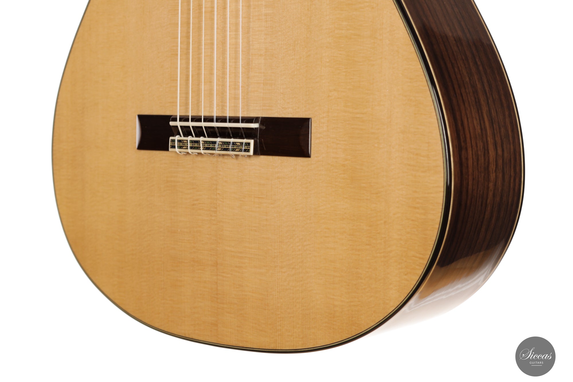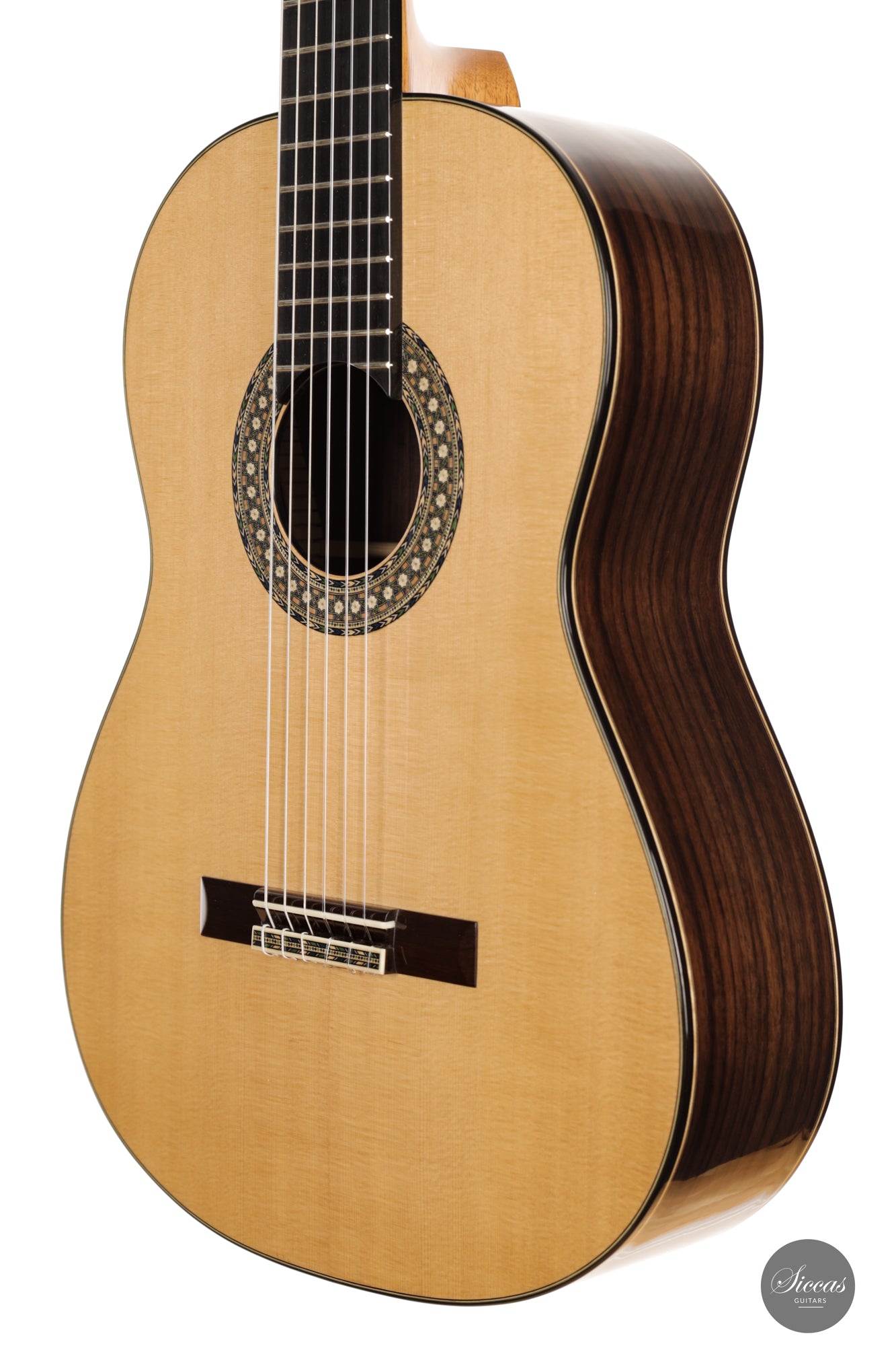 Dieses wunderbare Instrument aus dem Jahr 2022 wurde mit einer Fichtendecke mit Gitterverstrebungen (Lattice) gebaut. Ästhetisch ist sie stark von der maurischen Kunst inspiriert, wie sie in den Ornamenten der Alhambra in Granada, Spanien, dargestellt ist. Das prächtige und farbenreiche geometrische Mosaik der Rosette verleiht diesem Instrument ein einzigartiges Erscheinungsbild und lässt Miguel Angels meisterliche Kunstfertigkeit erkennen. Die Ansprache und das Klangvolumen dieses Modells sowie die 65 cm Mensur und der 52 mm Sattel machen es zu einer hervorragenden Konzertgitarre, welche für die meisten Gitarristen geeignet ist und einen fantastischen Spielkomfort sowie einen eleganten, tragenden Gesamtklang mit sich bringt.