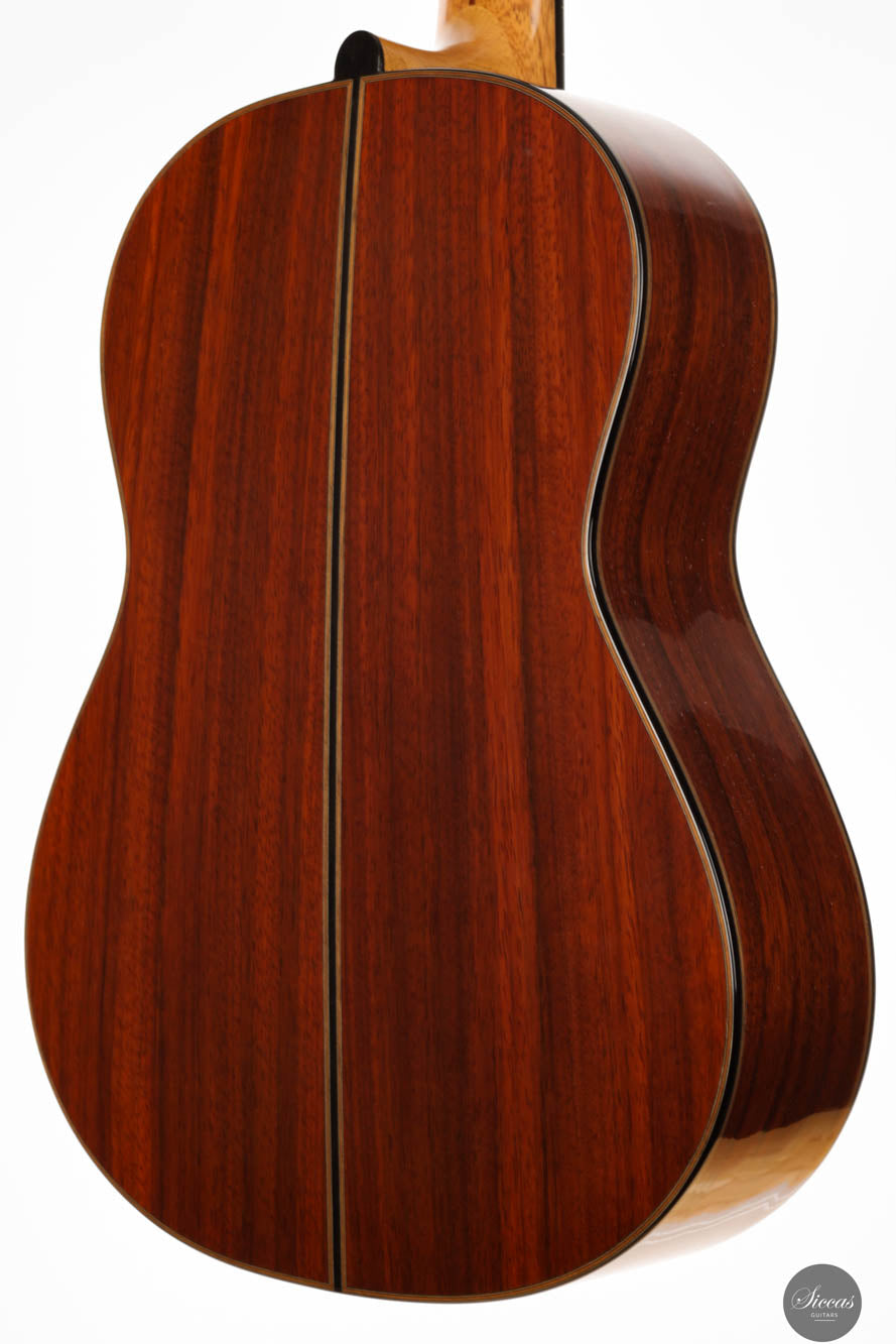 The 2024 Limited Edition crafted by Miguel is an exquisite manifestation of luthiery, merging traditional materials with a nuanced artistic sensibility. The guitar features a resonant cedar soundboard paired harmoniously with padouk for the back, sides, and bridge, enriching the instrument’s sonic depth with its striking visual presence. The ebony fingerboard and cedar neck refine the tactile experience, enhancing the fluid playability. The intricate marquetry on the headstock veneer, rosette, profiles, and bridge captivates the eye, featuring an elegant interplay of natural hues that form interlocking diamonds and a central mosaic of nasrid stars, a homage to historical artistry.