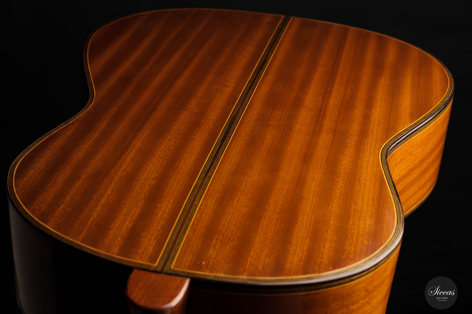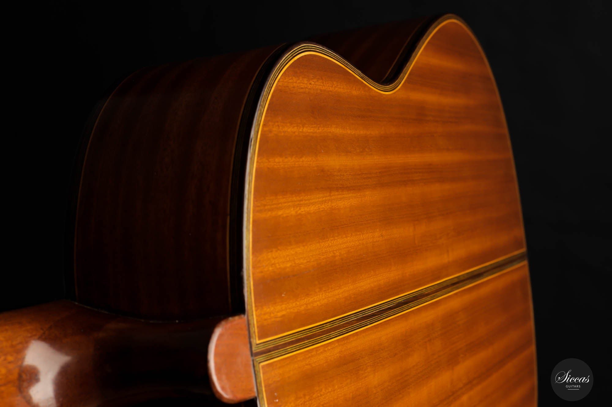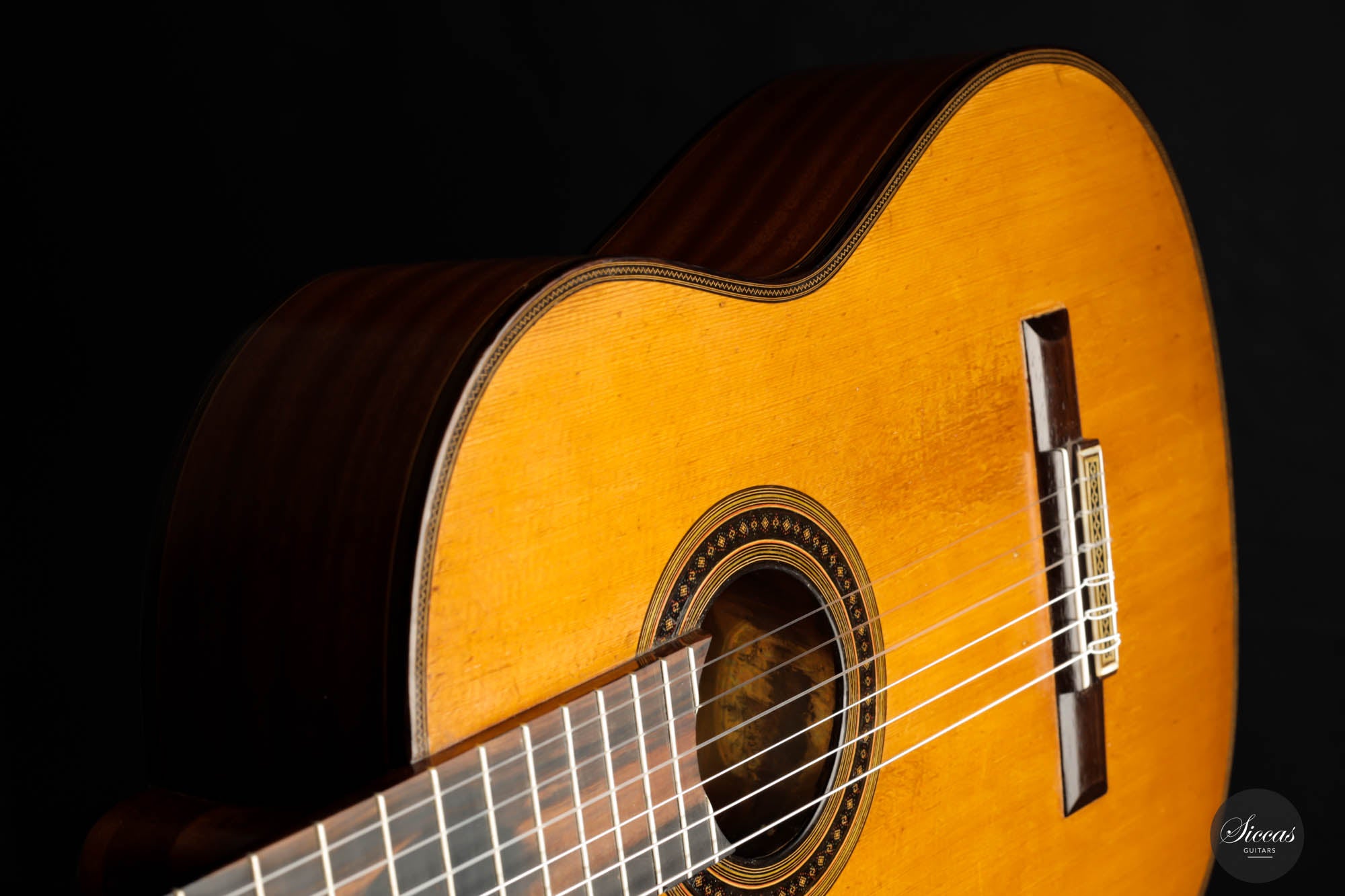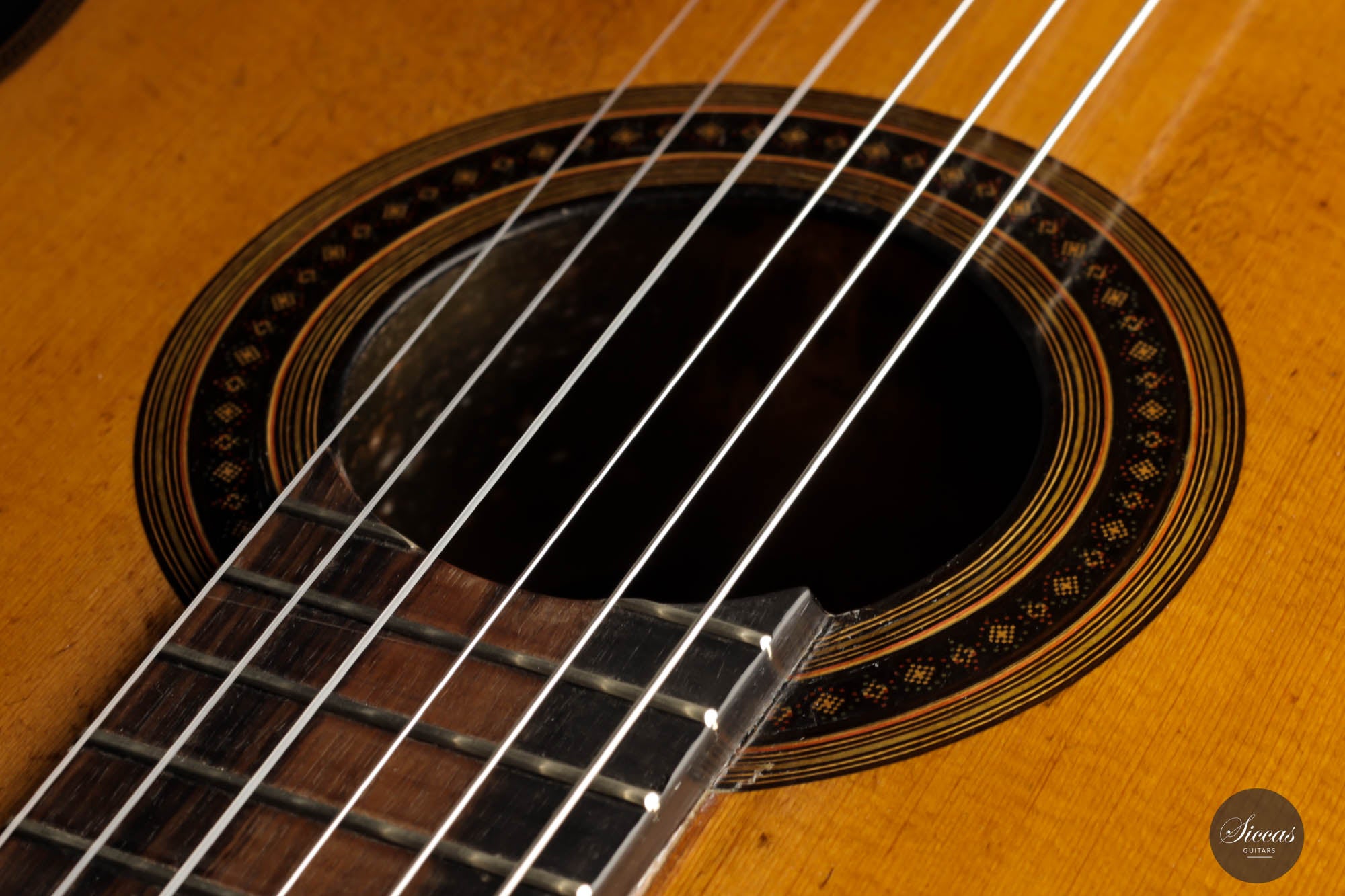 Die wunderschöne Fichtendecke mit ihrer schönen Patina strahlt äußerste Eleganz aus und ist in ausgezeichnetem Zustand, mit nur einem vollständig reparierten Haarriss entlang des Griffbretts. Der Steg wurde originalgetreu wiederhergestellt und der herrlich verzierte Mahagoniboden und die Zargen unterstreichen die besondere Anmut dieses Instruments. Es ist einfach ein traumhaftes Gefühl, diese Gitarre zu spielen, da sie sich nicht nur sehr gut spielen lässt, sondern die Fähigkeit besitz, den Gitaristen zu inspirieren und seine Muisik emotionsvoll zu interpretieren.