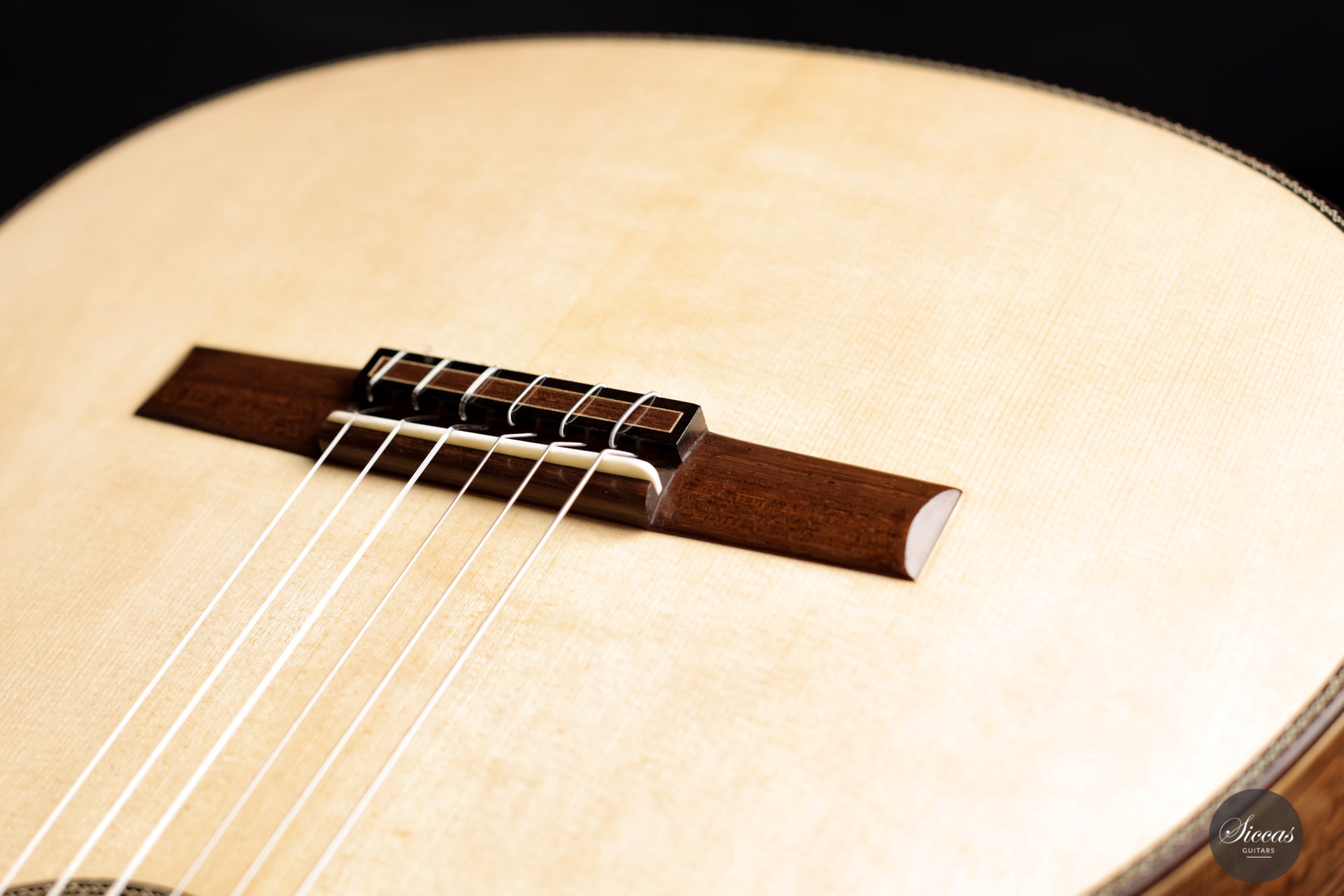 This high-quality Spanish guitar has a beautiful spruce top and a back and sides made of precious Madagascar rosewood. It has a very airy and responsive sound. The tone is fast, with a warm soft colour and a playful character. One can truly appreciate the singing qualities and harmonic capacities of the classical guitar with this mature and remarkable instrument.