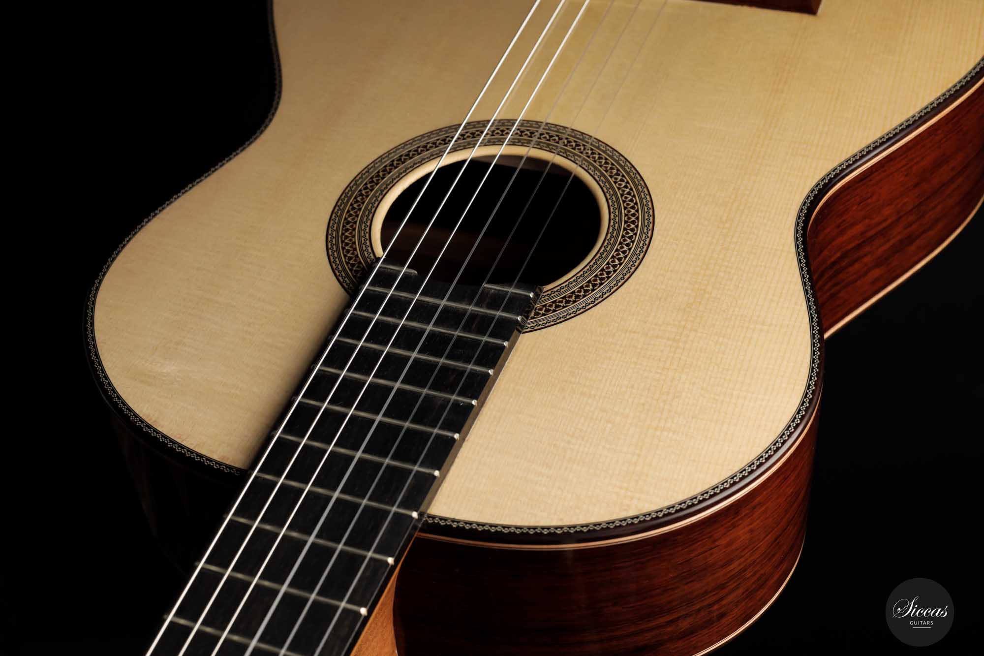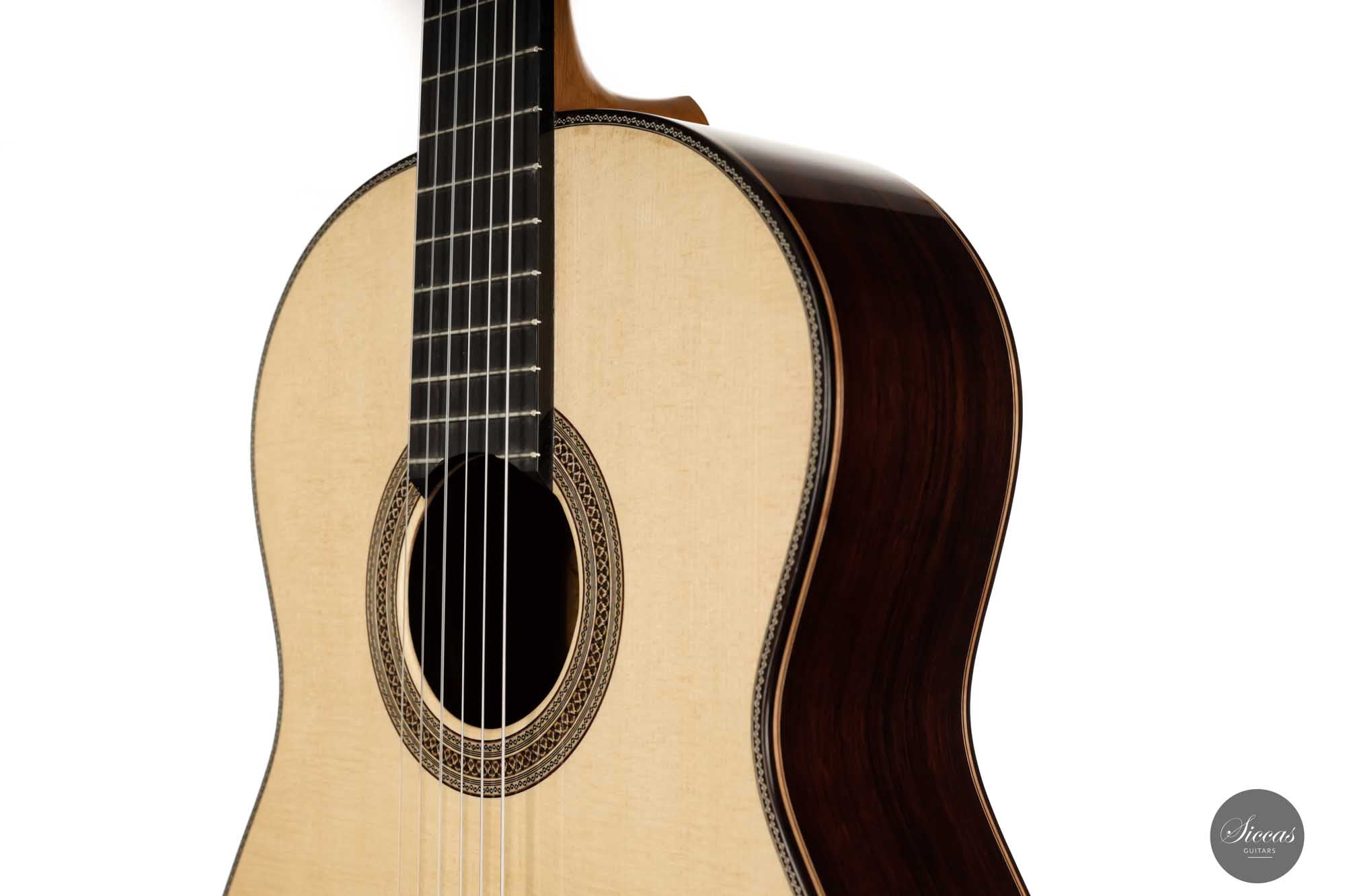 Diese schöne Linkshänder-Gitarre aus dem Jahr 2022 hat eine Fichtendecke und gerade gemaserten Boden und Zargen aus indischem Palisander. Die Verzierungen auf dieser Gitarre sind gut durchdacht und wurden geschmackvoll gebaut. Diese Gitarre steht in der renommierten spanischen Gitarrenbautradition, insbesondere der Gitarrenbauschule von Granada. Ihr schöner Ton funkelt über das gesamte Spektrum der Gitarre. Diese Gitarre ist eine schöne Gelegenheit für Linkshänder, die eine Gitarre im Granada-Stil auf hohem Niveau und zu einem sehr attraktiven Preis suchen.