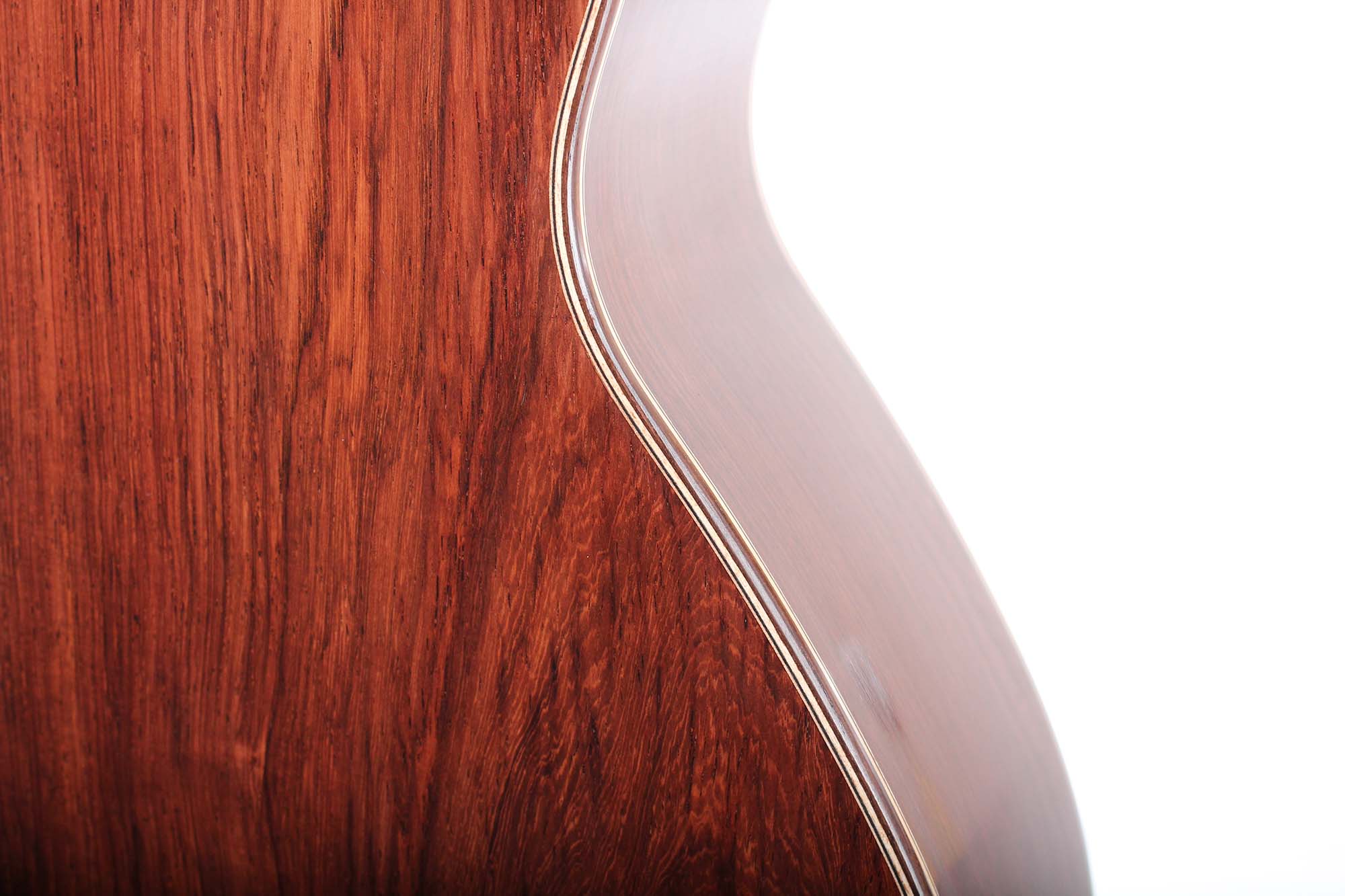 Diese Gitarre orientiert sich an den Gitarren des wohl bedeutendsten Double-Top Gitarrenbauers, Matthias Dammann. Dieser Nachbau überzeugt durch seinen voluminöse und kräftigen Klang, sowie die facettenreichen Höhen. Die Decke besteht aus Zeder und ist im Sandwichverfahren (Zeder/Nomex) hergestellt welches der Decke eine große Steifigkeit verleiht. Veredelt ist die Gitarre mit einer sehr schönen und feinen Schellackpolitur. Die Decke ist aus Zeder, Boden und Zargen sind aus Madagaskar Palisander. Diese Gitarre überzeugt nicht nur aufgrund seiner Verarbeitung und seines Preis- Leistungsverhältnisses sondern auch klanglich. Eines der wohl besten Double-Top Instrumente, die für diesen Preis erhältlich sind. Die Mechaniken sind ebenso hochwertig und kugelgelagert, was ein sauberes und flüssiges Stimmen garantiert. Hier die Vorzüge dieser Gitarre zusammengefasst: - prächtige Optik - voluminöser und ausgeglichener Klang - Flache Saitenlage - Schellackfinish - leicht zu spielen