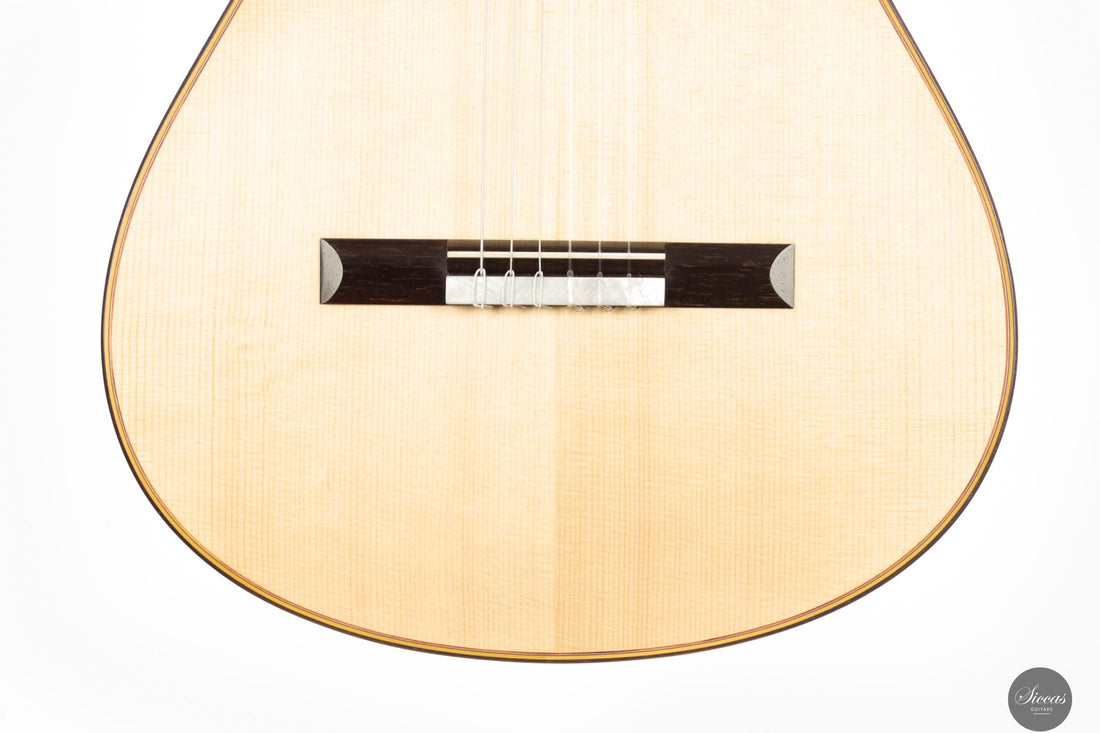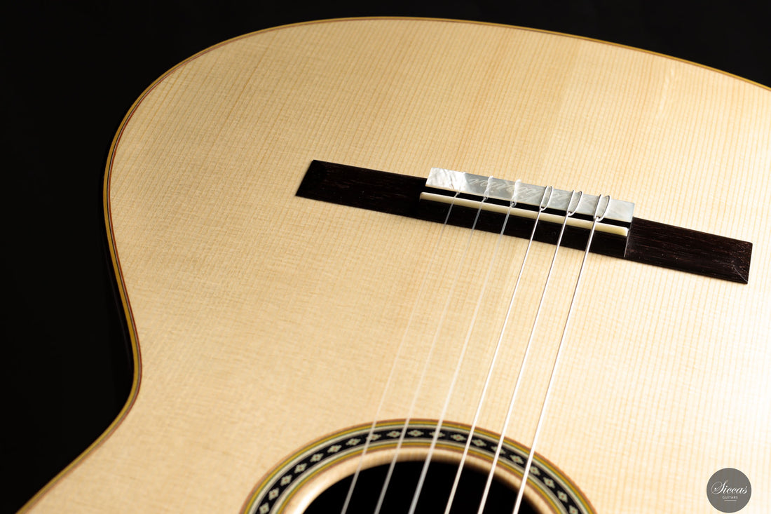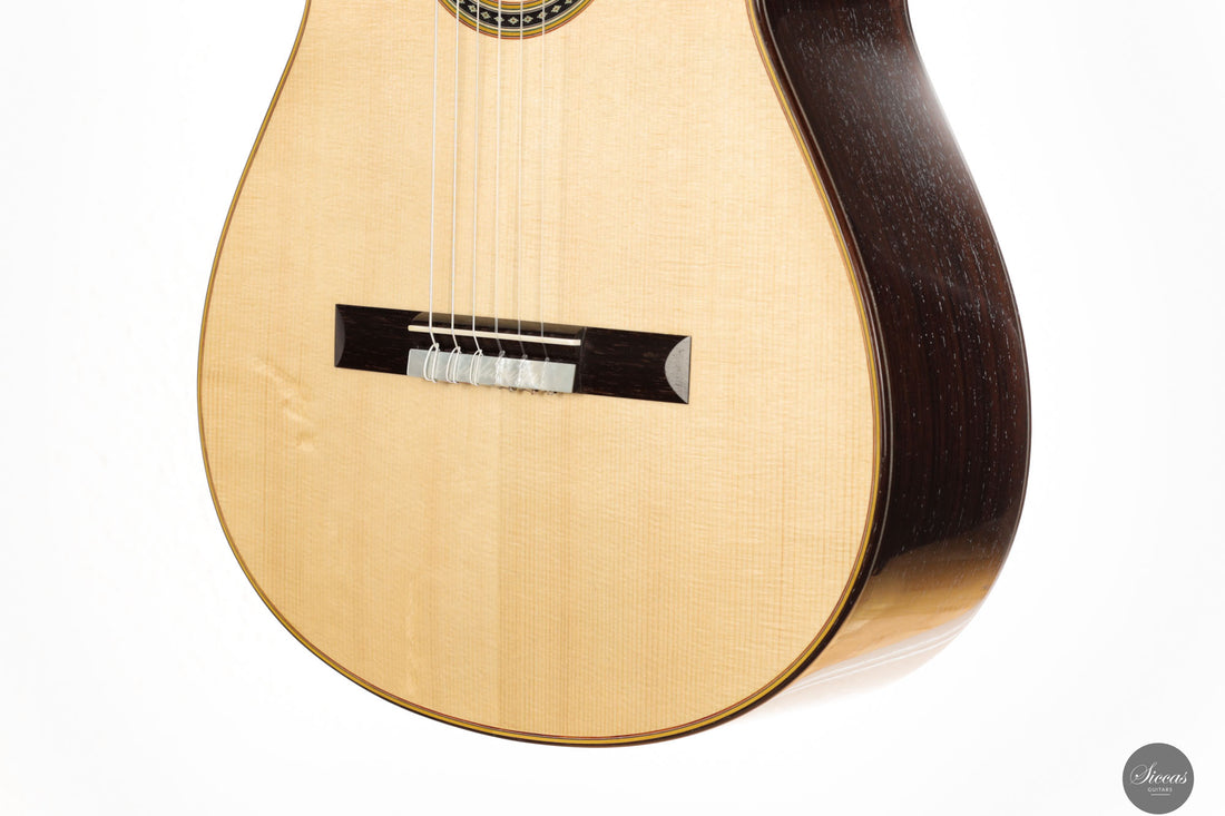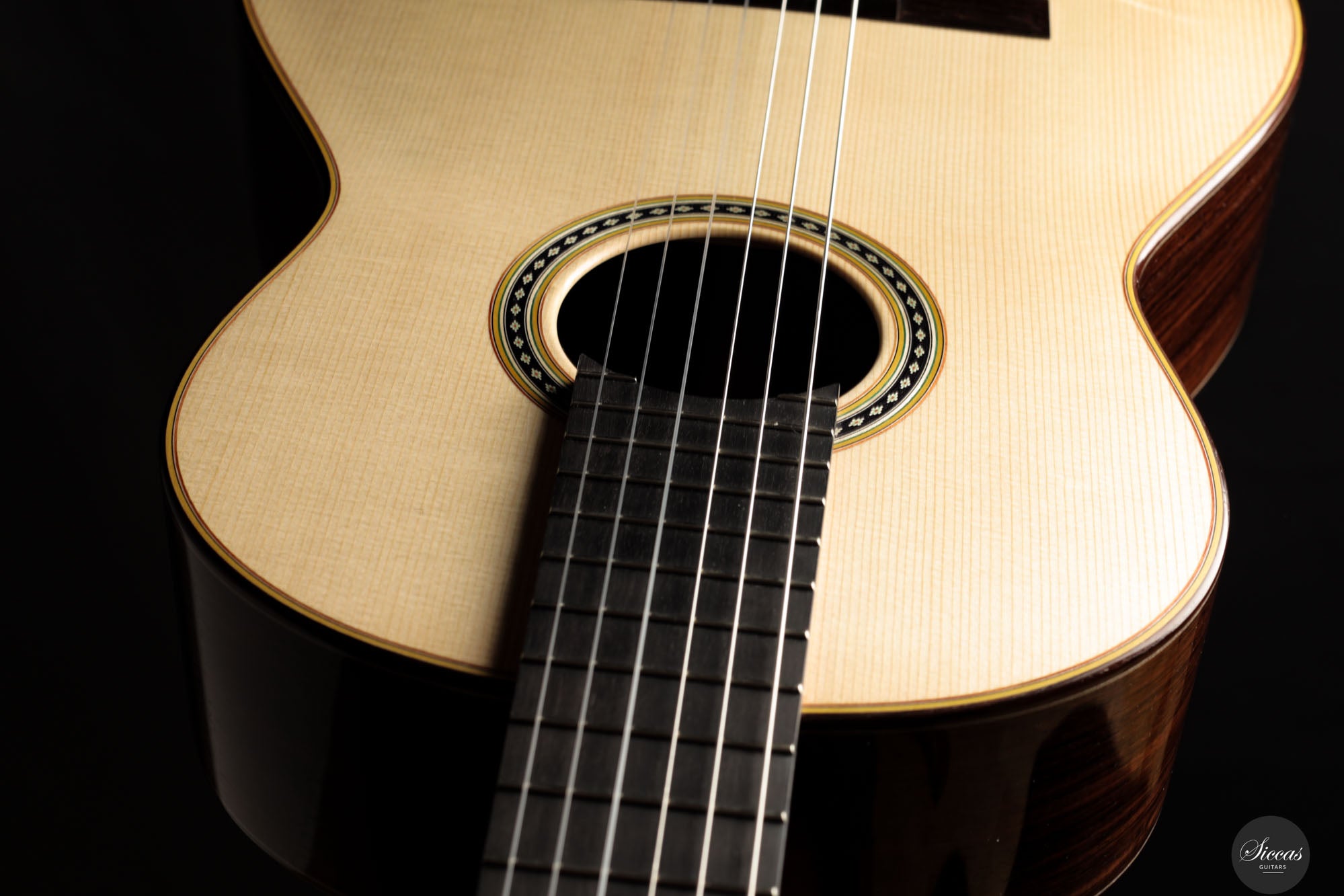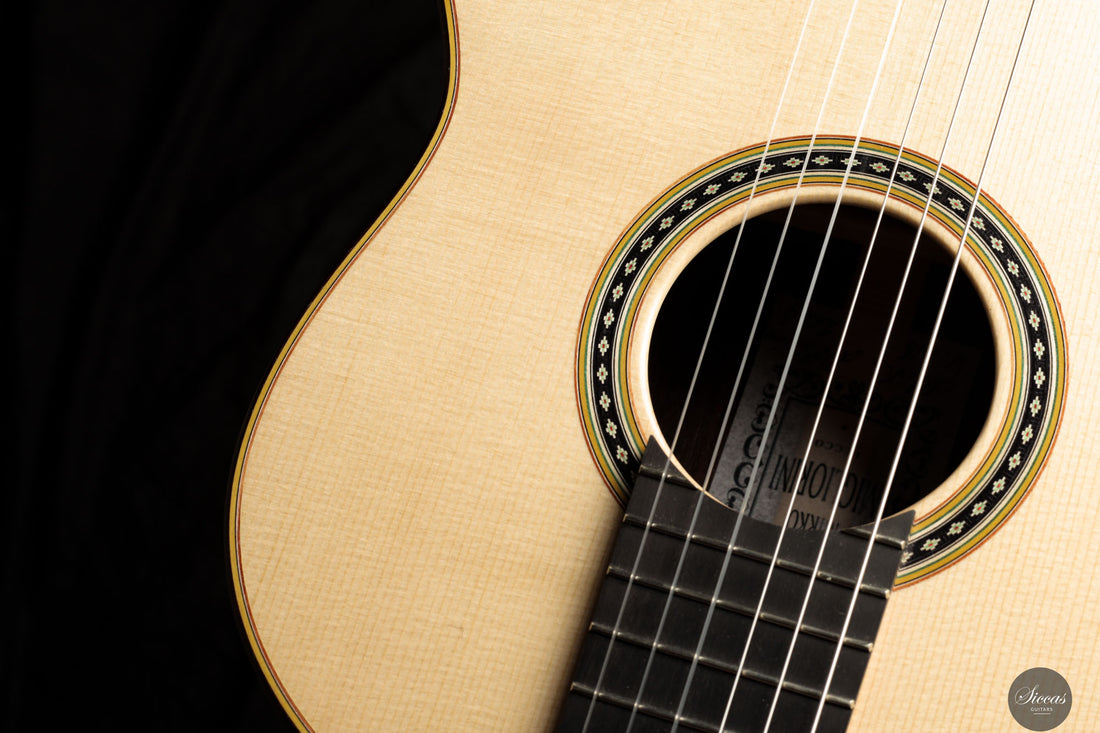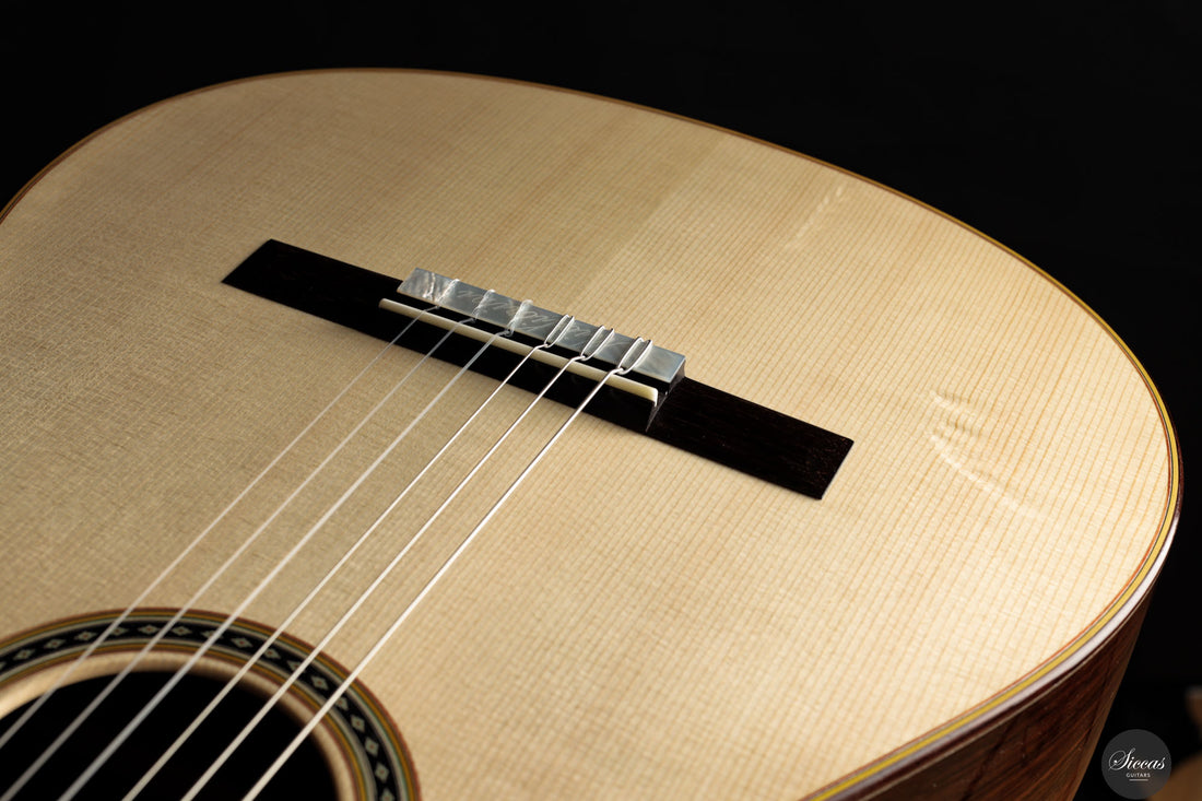 Diese Doubletop-Gitarre aus dem Jahr 2024 ist ein herausragendes Instrument, das modernes Design mit traditioneller Handwerkskunst verbindet. Die Gitarre ist sorgfältig mit einer Fichtendecke im Doubletop-Design gefertigt, die einen reichen und resonanten Klang erzeugt. Gleichzeitig sorgen der Boden und die Zargen aus indischem Palisander für einen warmen und ausgewogenen Toncharakter. Mirko hat großen Aufwand betrieben, um ein Instrument zu schaffen, das sowohl leicht spielbar ist als auch den Anforderungen moderner Gitarristen auf allen Niveaus gerecht wird. Die Gitarre zeichnet sich durch traditionelle Techniken und Designelemente wie eine klassische Rosette und Kopfplatte aus, die ihre zeitlose Anziehungskraft unterstreichen. Beim Finish hat Mirko eine persönliche Rezeptur aus Schellack entwickelt, die mit Nitrozellulose und anderen Harzen verstärkt wurde. Diese einzigartige Kombination sorgt für eine dünne, aber robuste Oberfläche, die die Klangqualität der Gitarre verbessert. Das Finish ist zudem äußerst langlebig und schützt die Gitarre über viele Jahre hinweg.