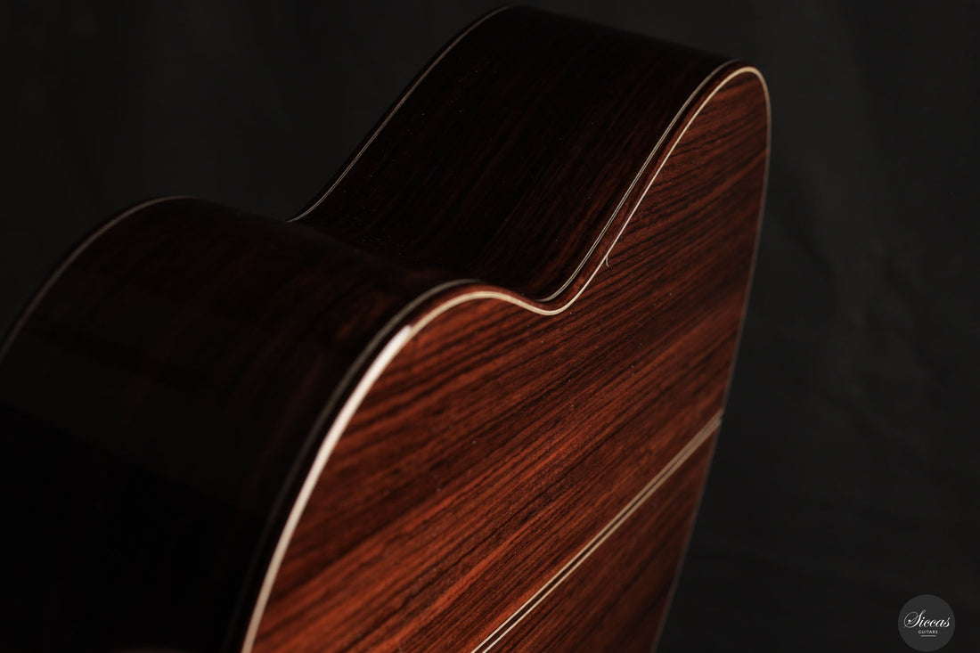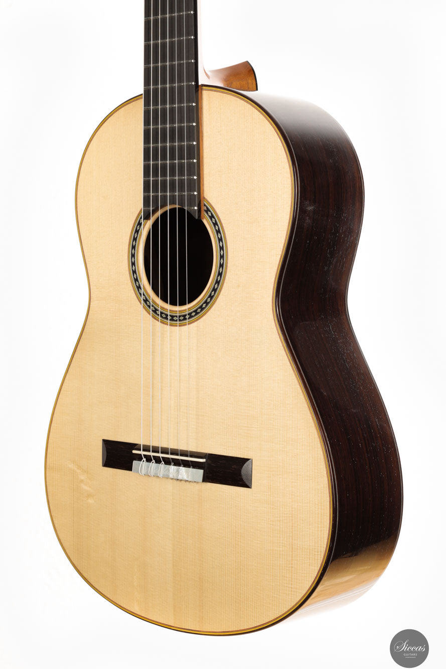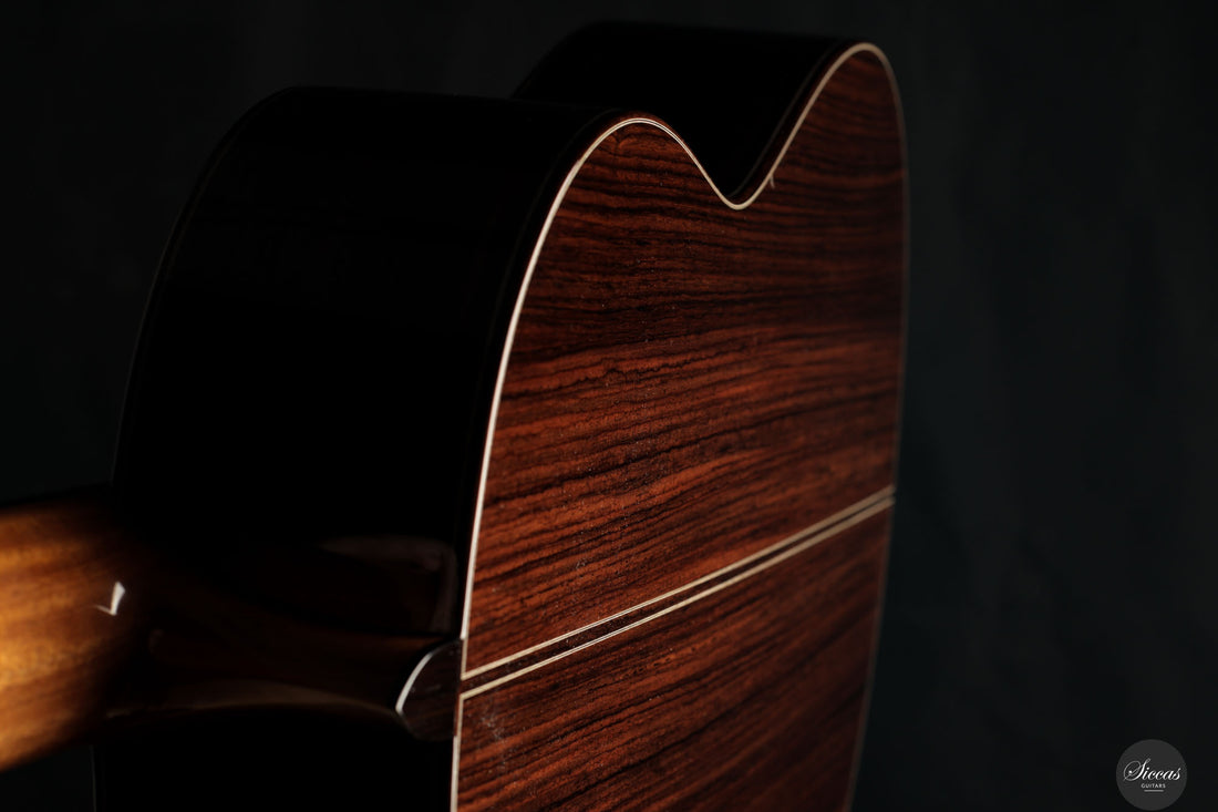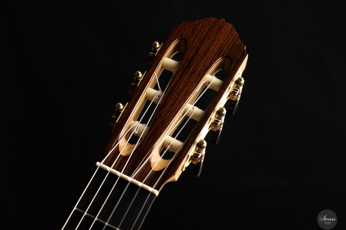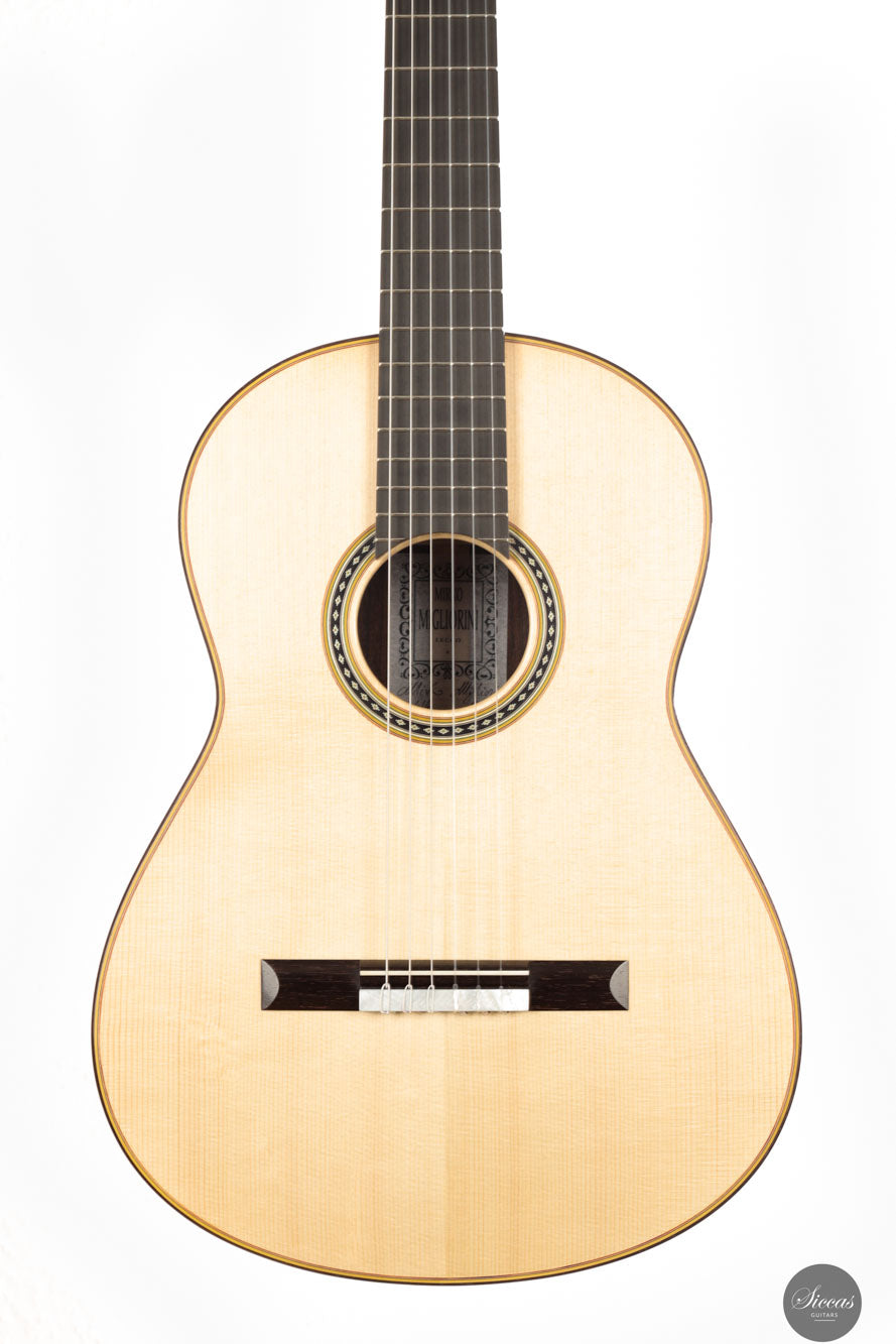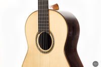 Diese Doubletop-Gitarre aus dem Jahr 2024 ist ein herausragendes Instrument, das modernes Design mit traditioneller Handwerkskunst verbindet. Die Gitarre ist sorgfältig mit einer Fichtendecke im Doubletop-Design gefertigt, die einen reichen und resonanten Klang erzeugt. Gleichzeitig sorgen der Boden und die Zargen aus indischem Palisander für einen warmen und ausgewogenen Toncharakter. Mirko hat großen Aufwand betrieben, um ein Instrument zu schaffen, das sowohl leicht spielbar ist als auch den Anforderungen moderner Gitarristen auf allen Niveaus gerecht wird. Die Gitarre zeichnet sich durch traditionelle Techniken und Designelemente wie eine klassische Rosette und Kopfplatte aus, die ihre zeitlose Anziehungskraft unterstreichen. Beim Finish hat Mirko eine persönliche Rezeptur aus Schellack entwickelt, die mit Nitrozellulose und anderen Harzen verstärkt wurde. Diese einzigartige Kombination sorgt für eine dünne, aber robuste Oberfläche, die die Klangqualität der Gitarre verbessert. Das Finish ist zudem äußerst langlebig und schützt die Gitarre über viele Jahre hinweg.