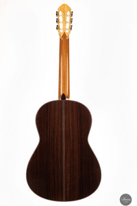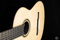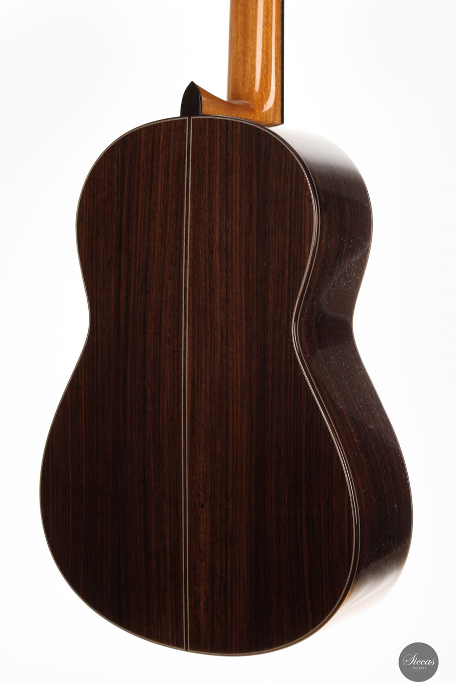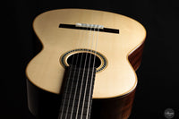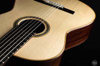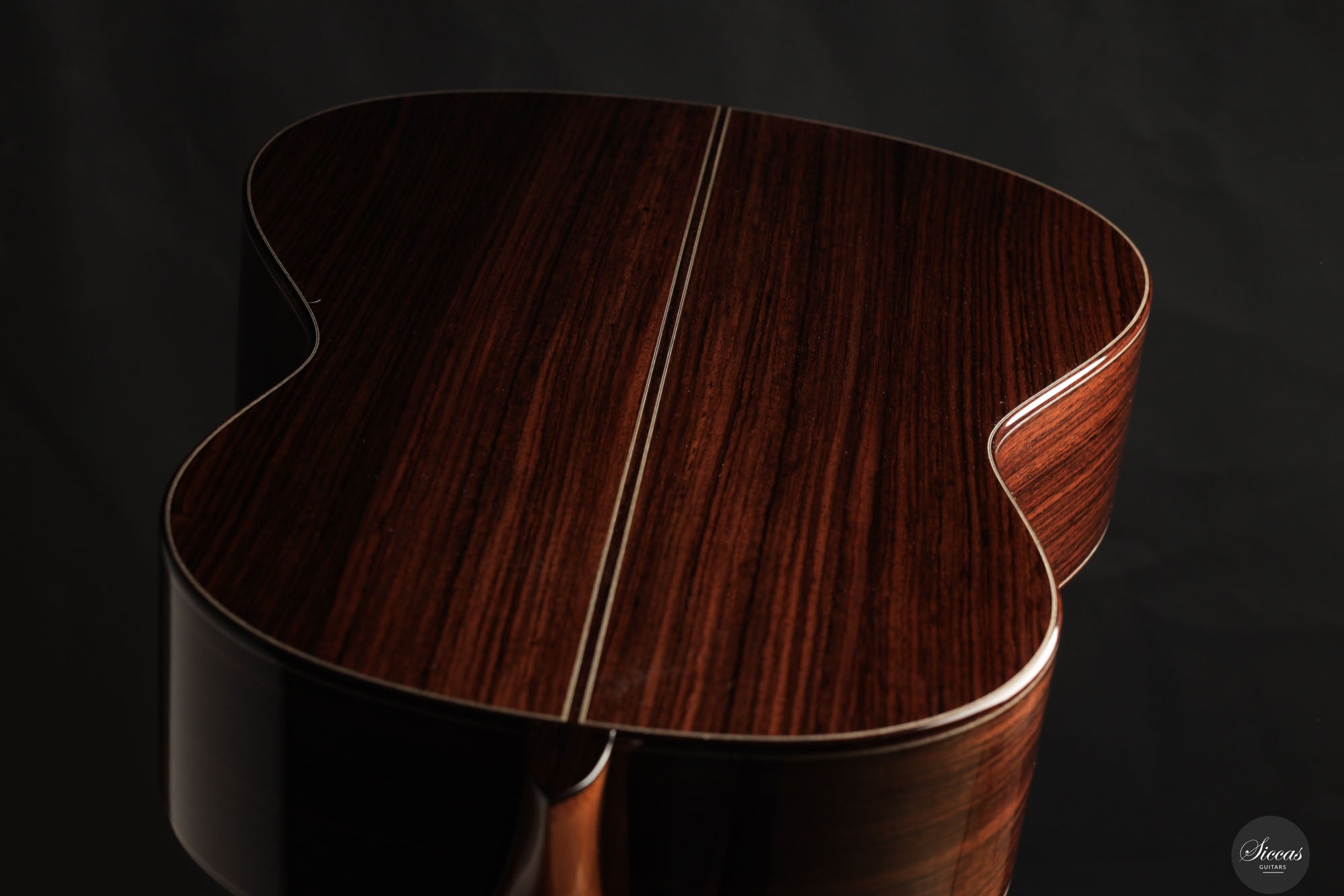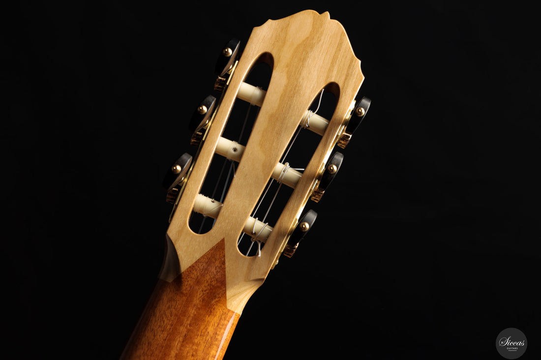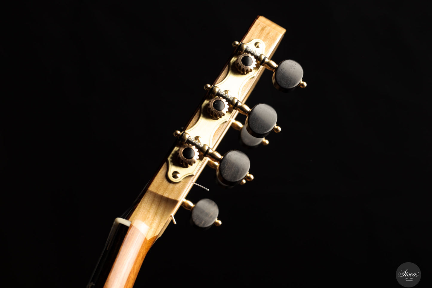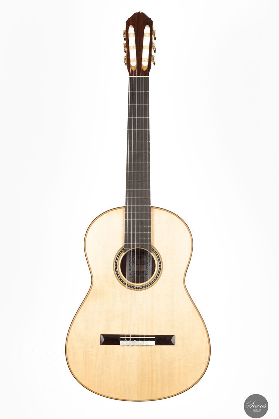 Diese Doubletop-Gitarre aus dem Jahr 2024 ist ein herausragendes Instrument, das modernes Design mit traditioneller Handwerkskunst verbindet. Die Gitarre ist sorgfältig mit einer Fichtendecke im Doubletop-Design gefertigt, die einen reichen und resonanten Klang erzeugt. Gleichzeitig sorgen der Boden und die Zargen aus indischem Palisander für einen warmen und ausgewogenen Toncharakter. Mirko hat großen Aufwand betrieben, um ein Instrument zu schaffen, das sowohl leicht spielbar ist als auch den Anforderungen moderner Gitarristen auf allen Niveaus gerecht wird. Die Gitarre zeichnet sich durch traditionelle Techniken und Designelemente wie eine klassische Rosette und Kopfplatte aus, die ihre zeitlose Anziehungskraft unterstreichen. Beim Finish hat Mirko eine persönliche Rezeptur aus Schellack entwickelt, die mit Nitrozellulose und anderen Harzen verstärkt wurde. Diese einzigartige Kombination sorgt für eine dünne, aber robuste Oberfläche, die die Klangqualität der Gitarre verbessert. Das Finish ist zudem äußerst langlebig und schützt die Gitarre über viele Jahre hinweg.
