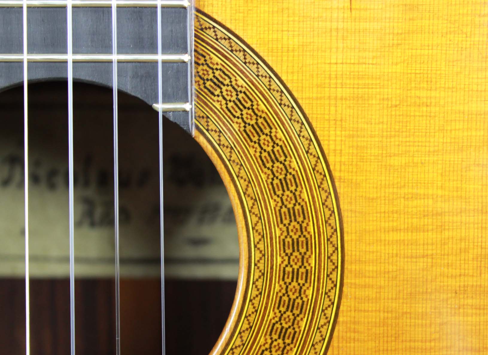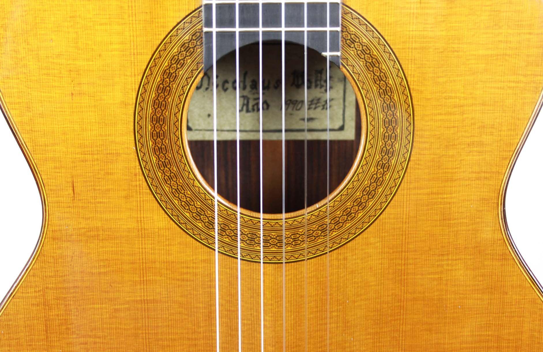 Diese Nicolaus Wollf Gitarre wurde im Jahr 1990 gebaut. Sie ist sehr leicht und kräftig im Klang aber auch gleichzeitig ausgeglichen. Es ist ein sehr gelungenes Instrument und die Bespielbarkeit ist sehr komfortabel. Die Decke ist aus Zeder gefertigt - Boden/Zargen sind aus indischem Palisander. Es sind nur wenige Spielspuren sichtbar und insgesamt befindet sich das Instrument in einem sehr guten Zustand. Die Mechaniken sind von Gotoh und ein Hartschalenkoffer ist inklusive.
